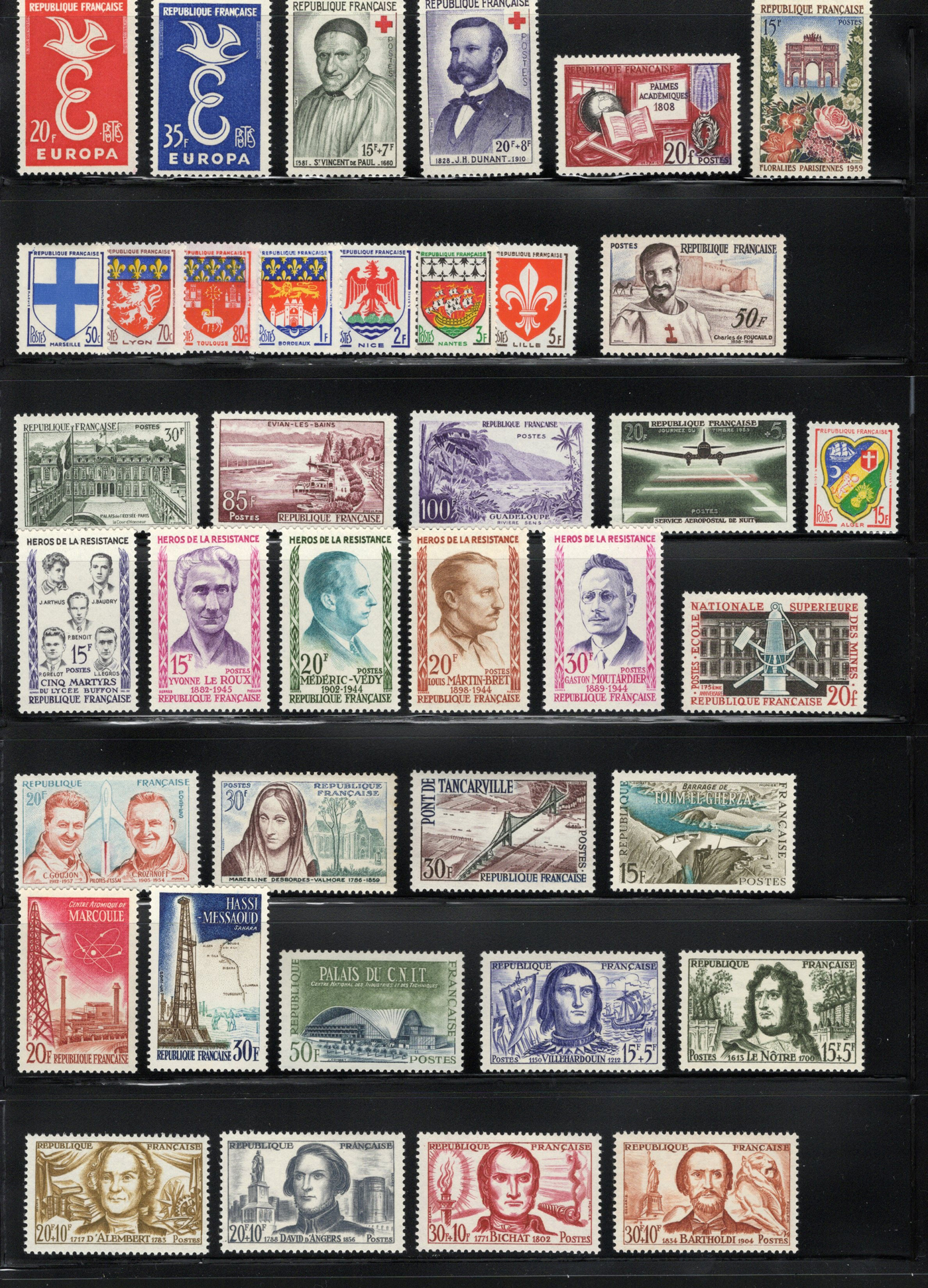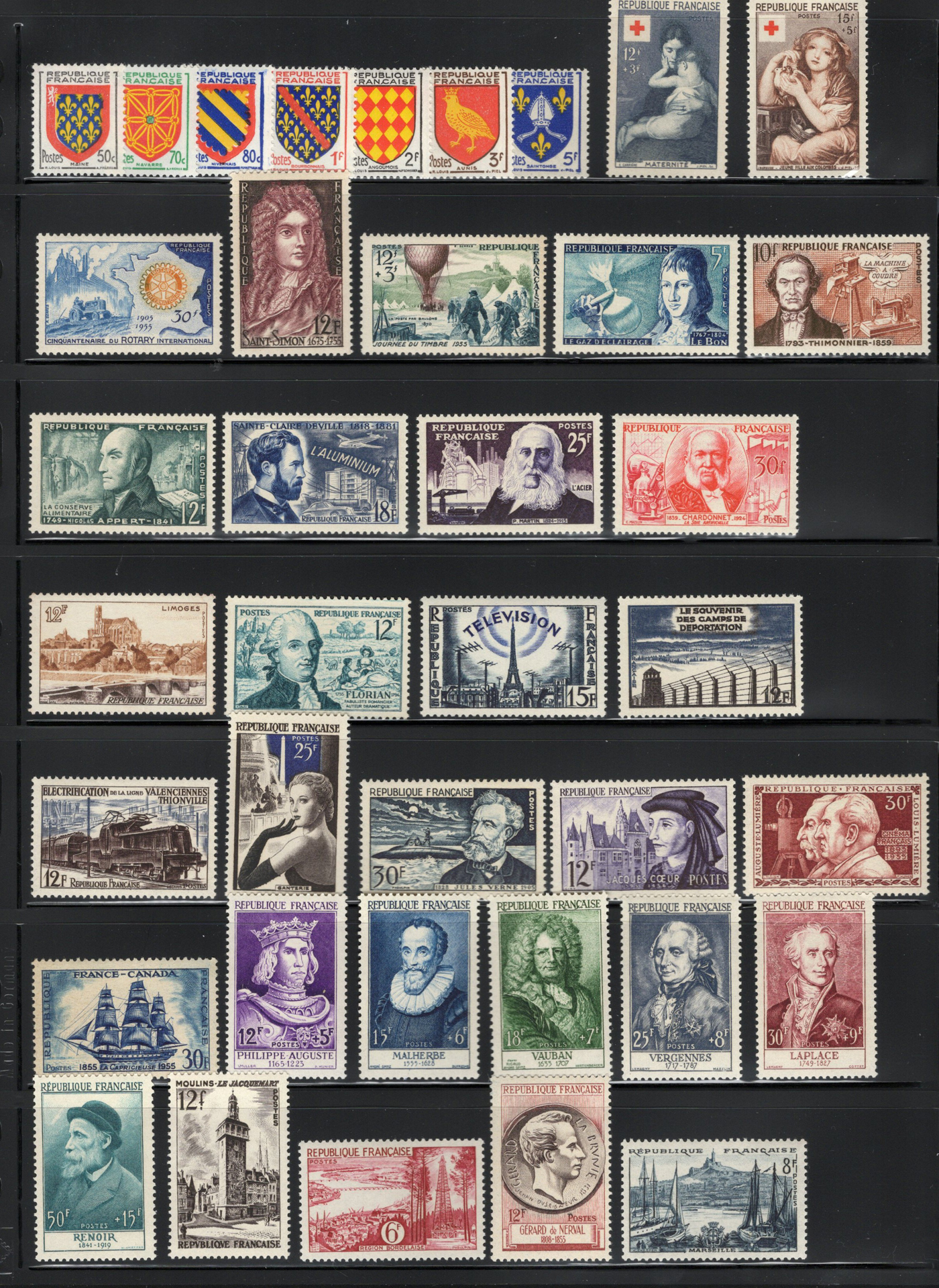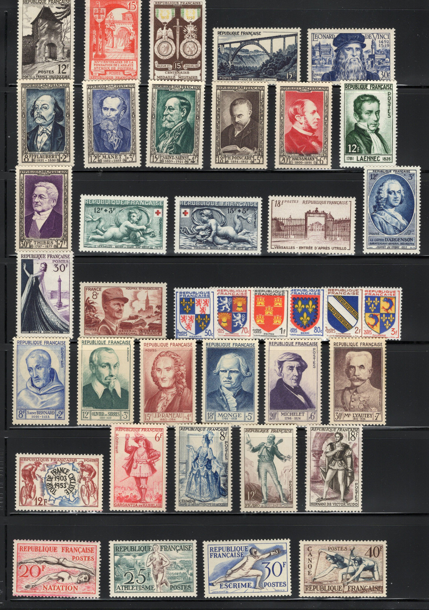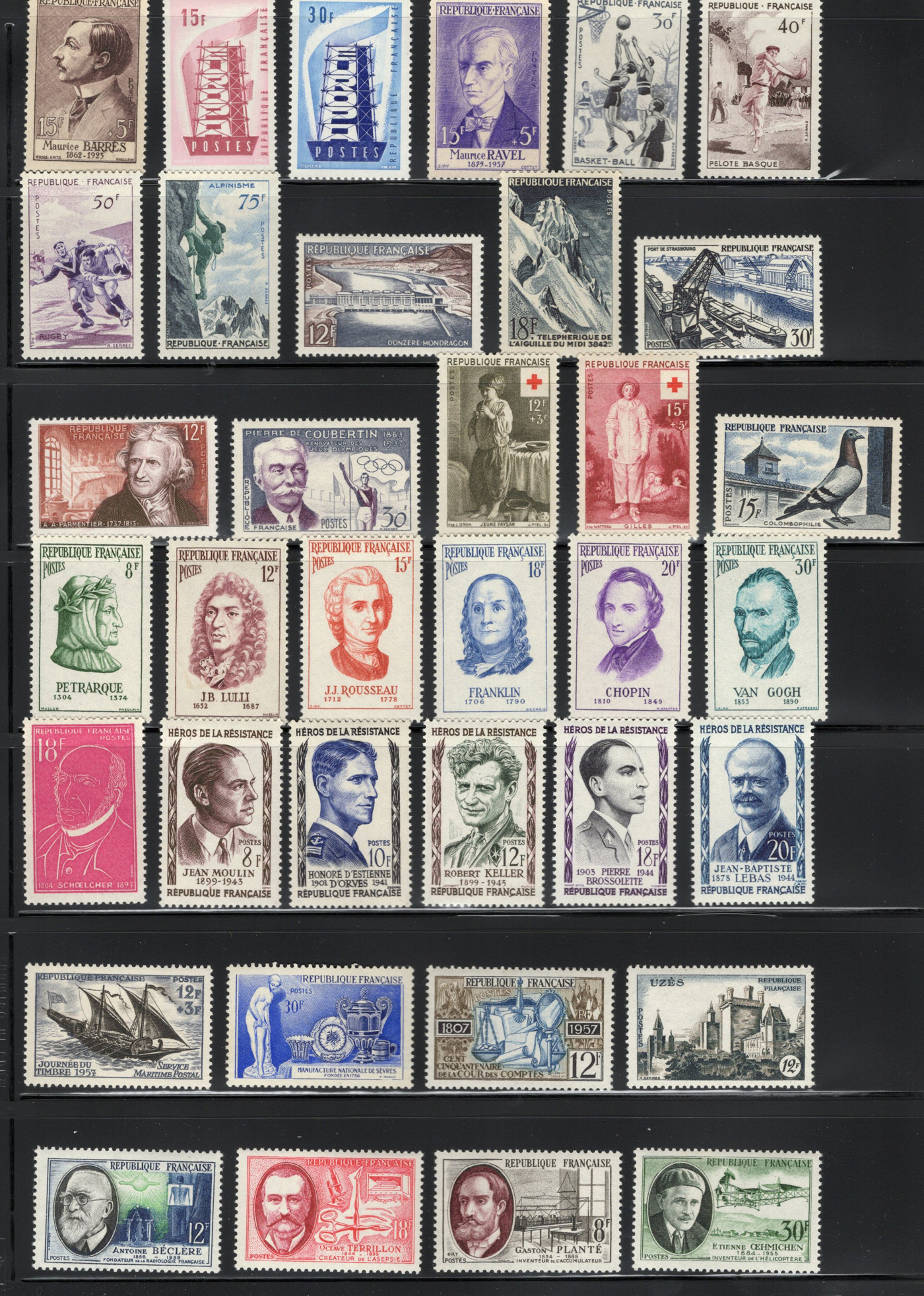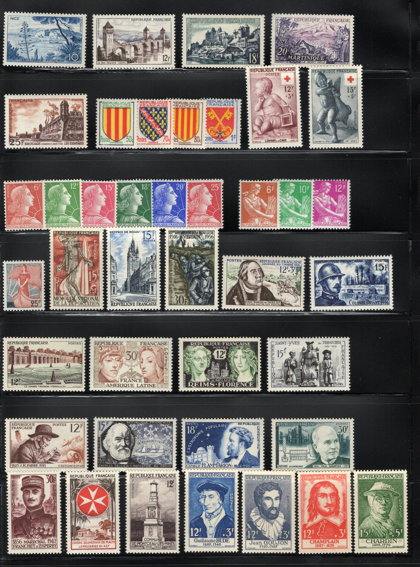 1556 nh   imageMint Never Hinged France Collection, 1900 to 1959, all neatly displayed on 25 black Vario sheets, with just under 1,000 different stamps. Some runs are strong and complete, such as the 1930s to 1959, and we note many better sets and singles, for example Scott #s 185-196 ($150), 198-201 ($125), 227-240 ($275), 258-262 ($125), 299 ($70), 300-300a ($174), 315-320 ($102), 342-347 ($122), 348 ($150), 700-705 ($61), B43 ($125), B48-53 ($75), B54-59 ($71), B66-67 ($350), B86-89A ($72), B157a ($100), B249-254 ($72), B285-290 ($137), B294-299 ($111), and many more, especially in the $10 to $50 range. An impressive collection not only for its catalogue value, but for its freshness and the fact that all the stamps are never hinged. Overall very fine. All pages scanned online for your perusal. (Scan 1) (Scan 2) (Scan 3) (Scan 4) (Scan 5) (Scan 6) (Scan 7) (Scan 8) (Scan 9) (Scan 10) (Scan 11) (Scan 12) (Scan 13) (Scan 14) (Scan 15) (Scan 16) (Scan 17) (Scan 18) (Scan 19) (Scan 20) (Scan 21) (Scan 22) (Scan 23) (Scan 24) (Scan 25) (All Scans)
