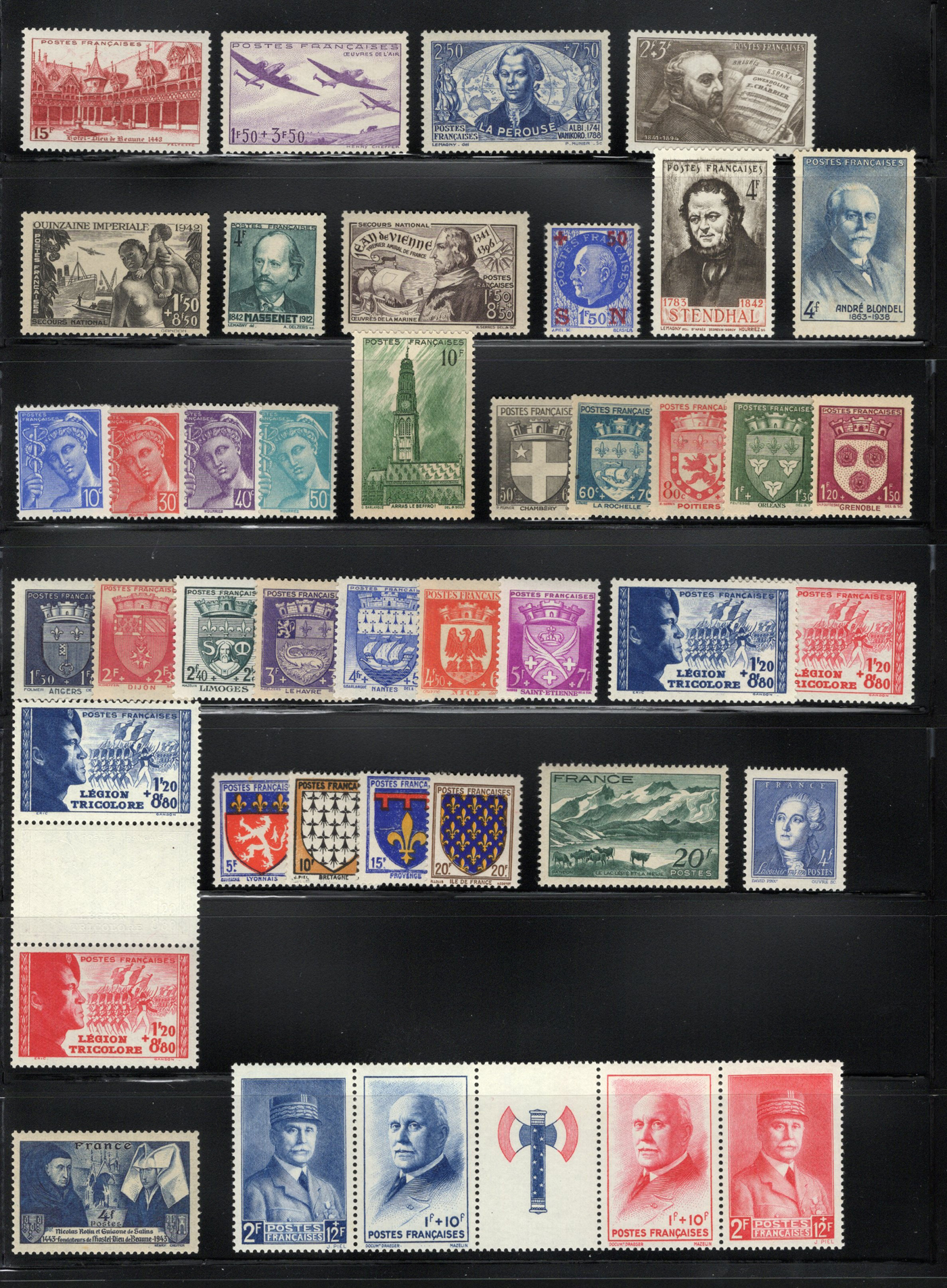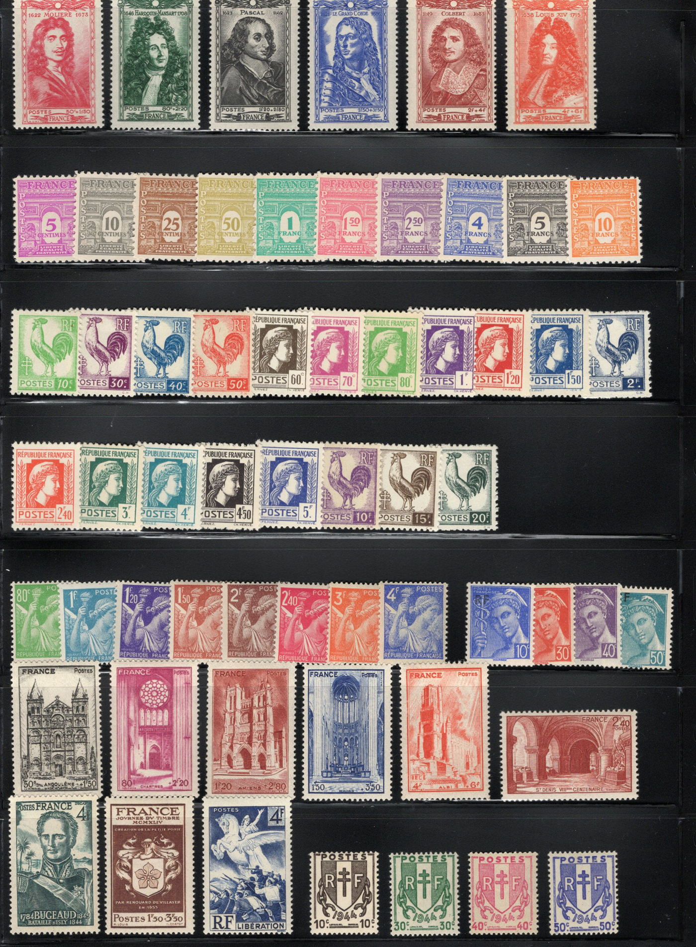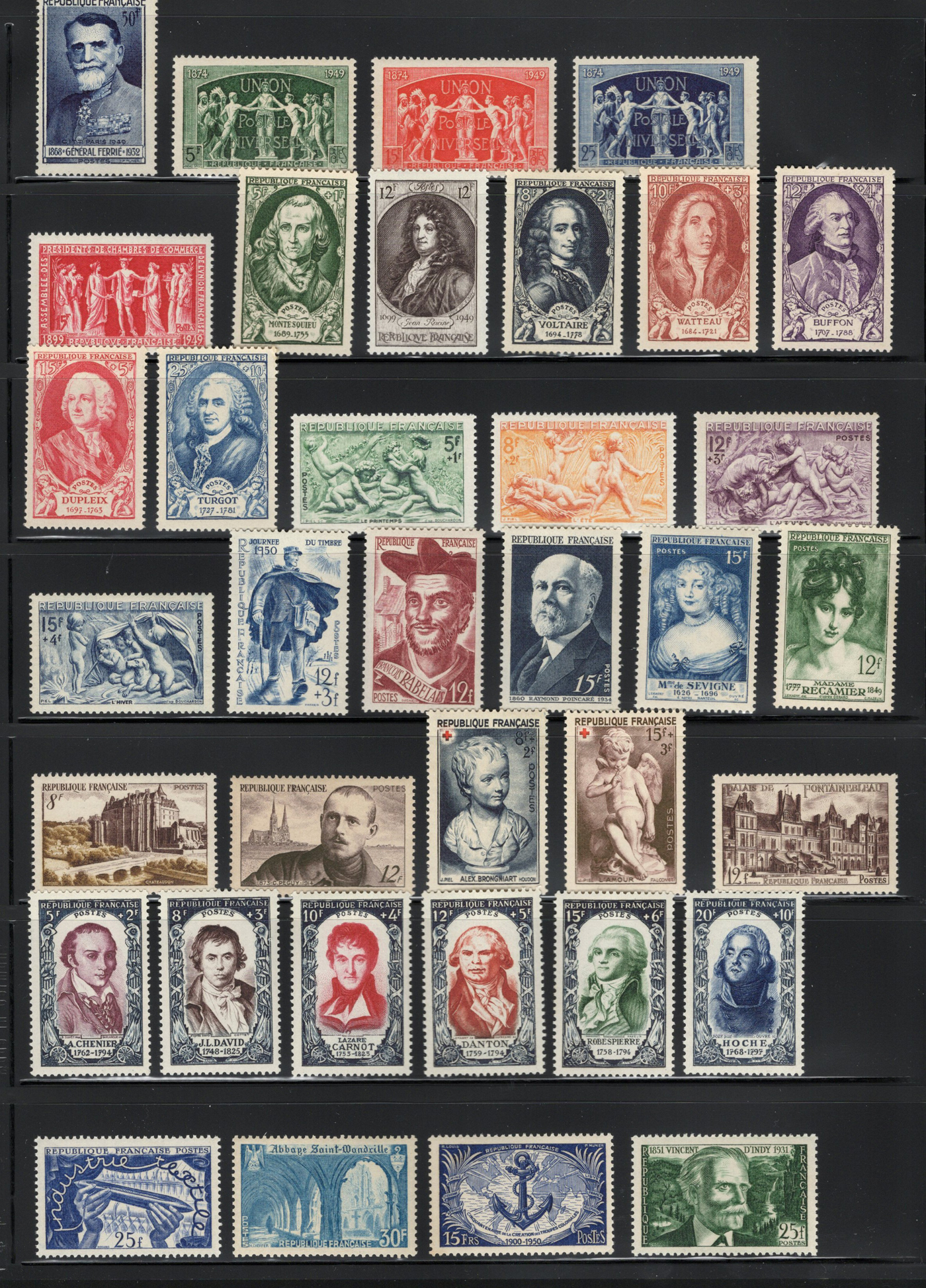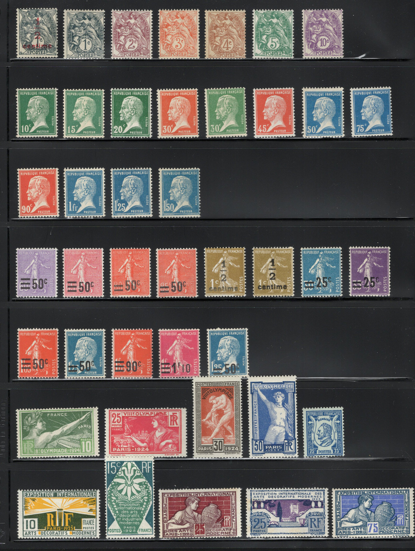 1556 nh   imageMint Never Hinged France Collection, 1900 to 1959, all neatly displayed on 25 black Vario sheets, with just under 1,000 different stamps. Some runs are strong and complete, such as the 1930s to 1959, and we note many better sets and singles, for example Scott #s 185-196 ($150), 198-201 ($125), 227-240 ($275), 258-262 ($125), 299 ($70), 300-300a ($174), 315-320 ($102), 342-347 ($122), 348 ($150), 700-705 ($61), B43 ($125), B48-53 ($75), B54-59 ($71), B66-67 ($350), B86-89A ($72), B157a ($100), B249-254 ($72), B285-290 ($137), B294-299 ($111), and many more, especially in the $10 to $50 range. An impressive collection not only for its catalogue value, but for its freshness and the fact that all the stamps are never hinged. Overall very fine. All pages scanned online for your perusal. (Scan 1) (Scan 2) (Scan 3) (Scan 4) (Scan 5) (Scan 6) (Scan 7) (Scan 8) (Scan 9) (Scan 10) (Scan 11) (Scan 12) (Scan 13) (Scan 14) (Scan 15) (Scan 16) (Scan 17) (Scan 18) (Scan 19) (Scan 20) (Scan 21) (Scan 22) (Scan 23) (Scan 24) (Scan 25) (All Scans)