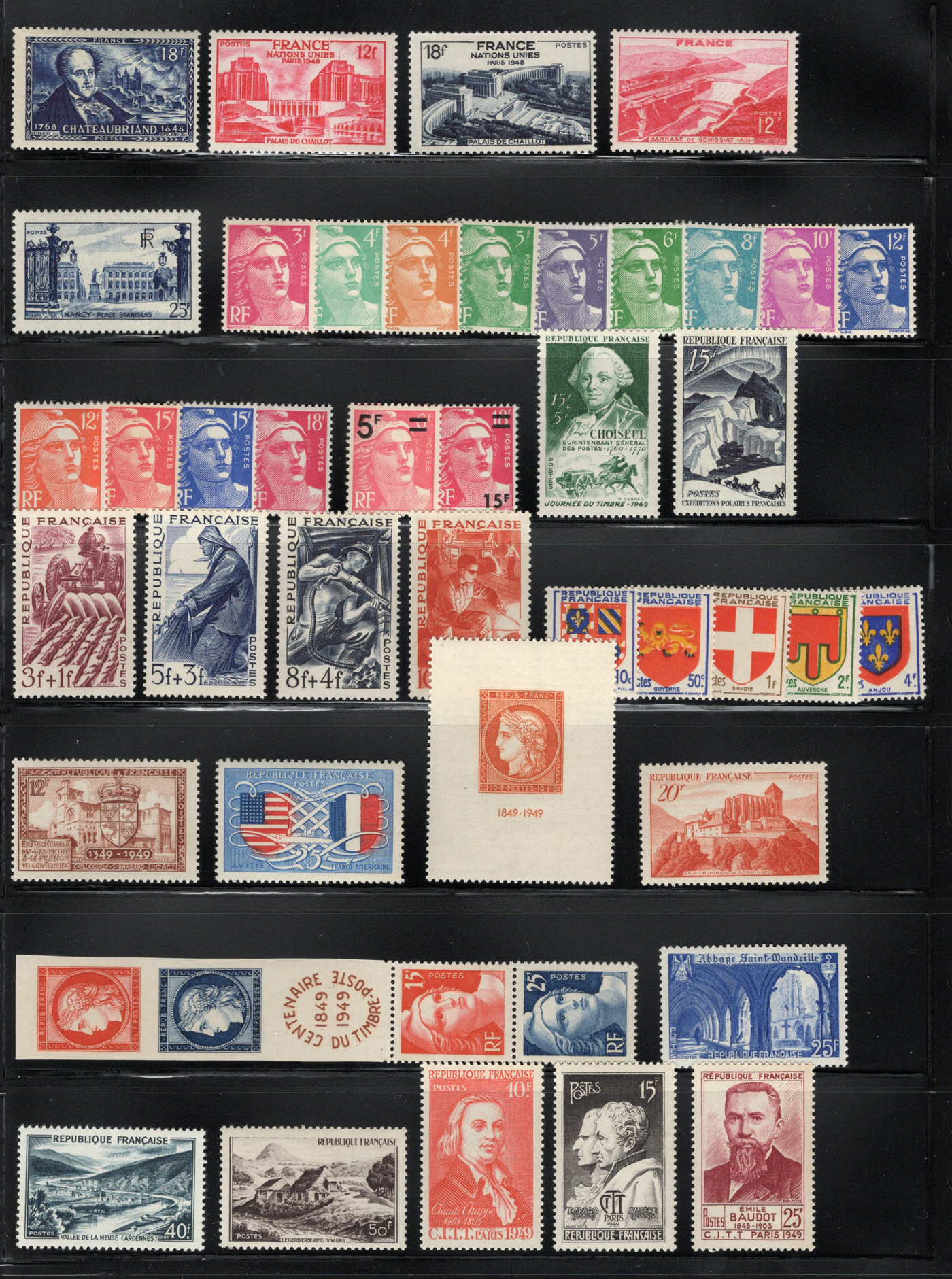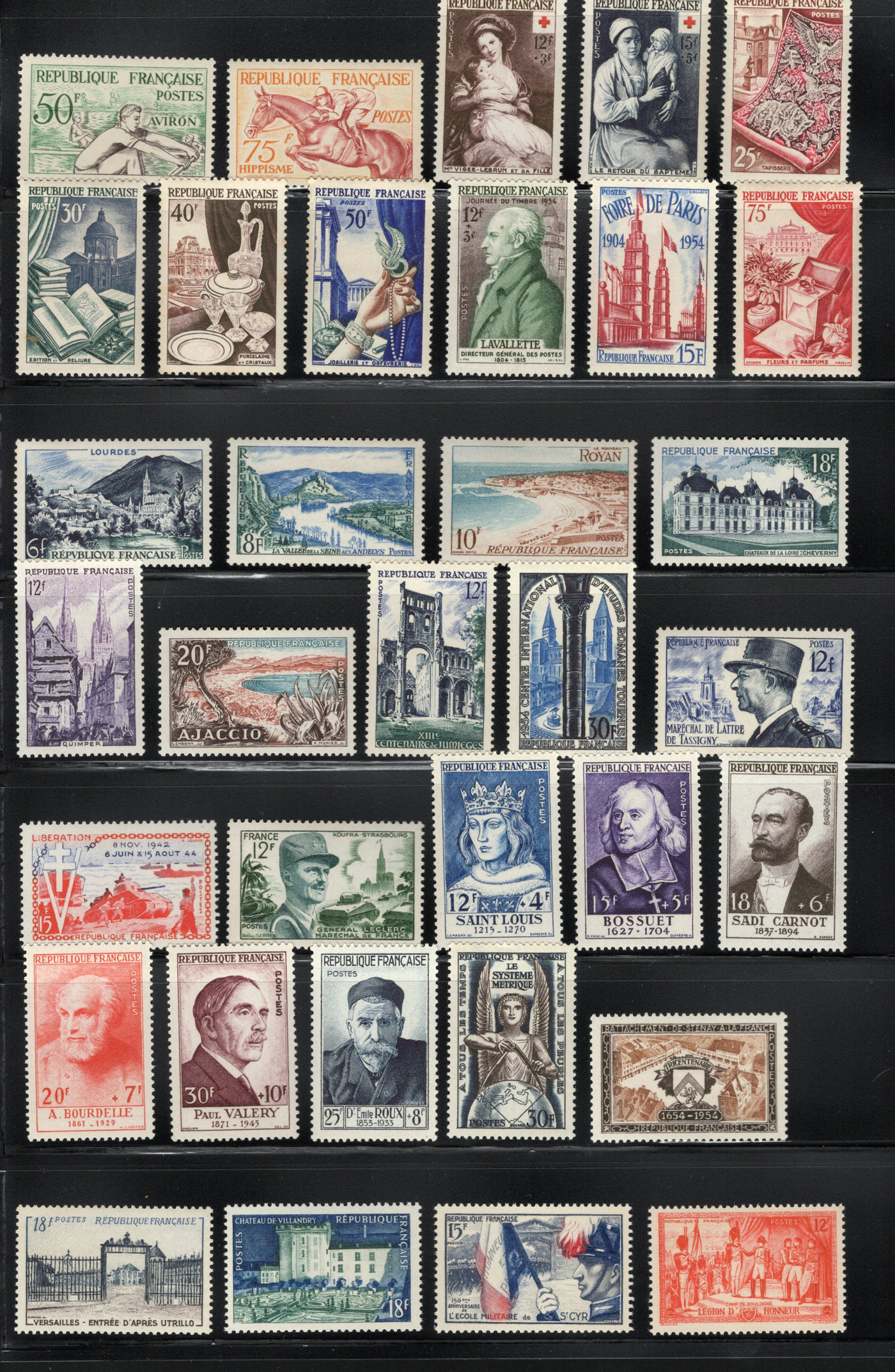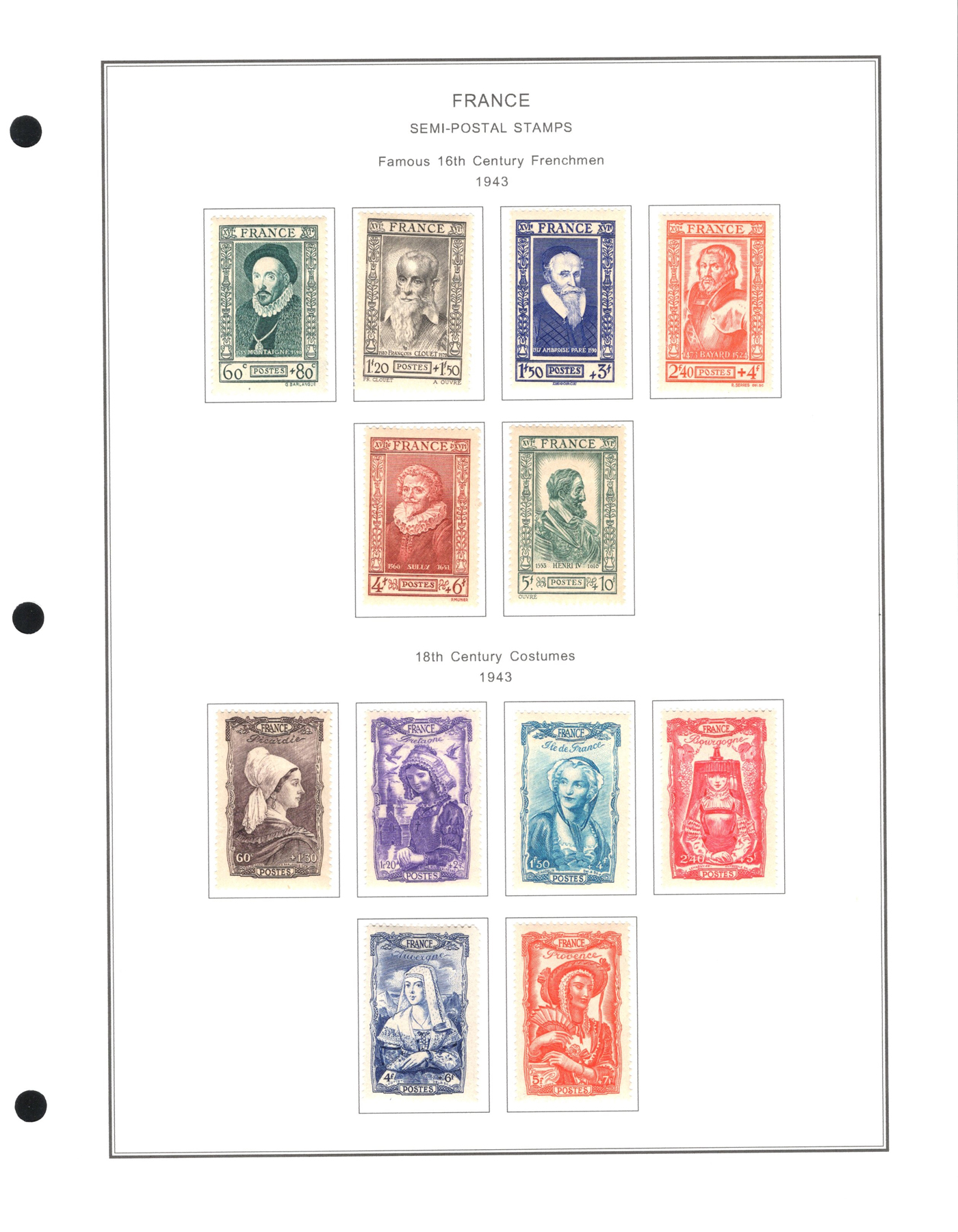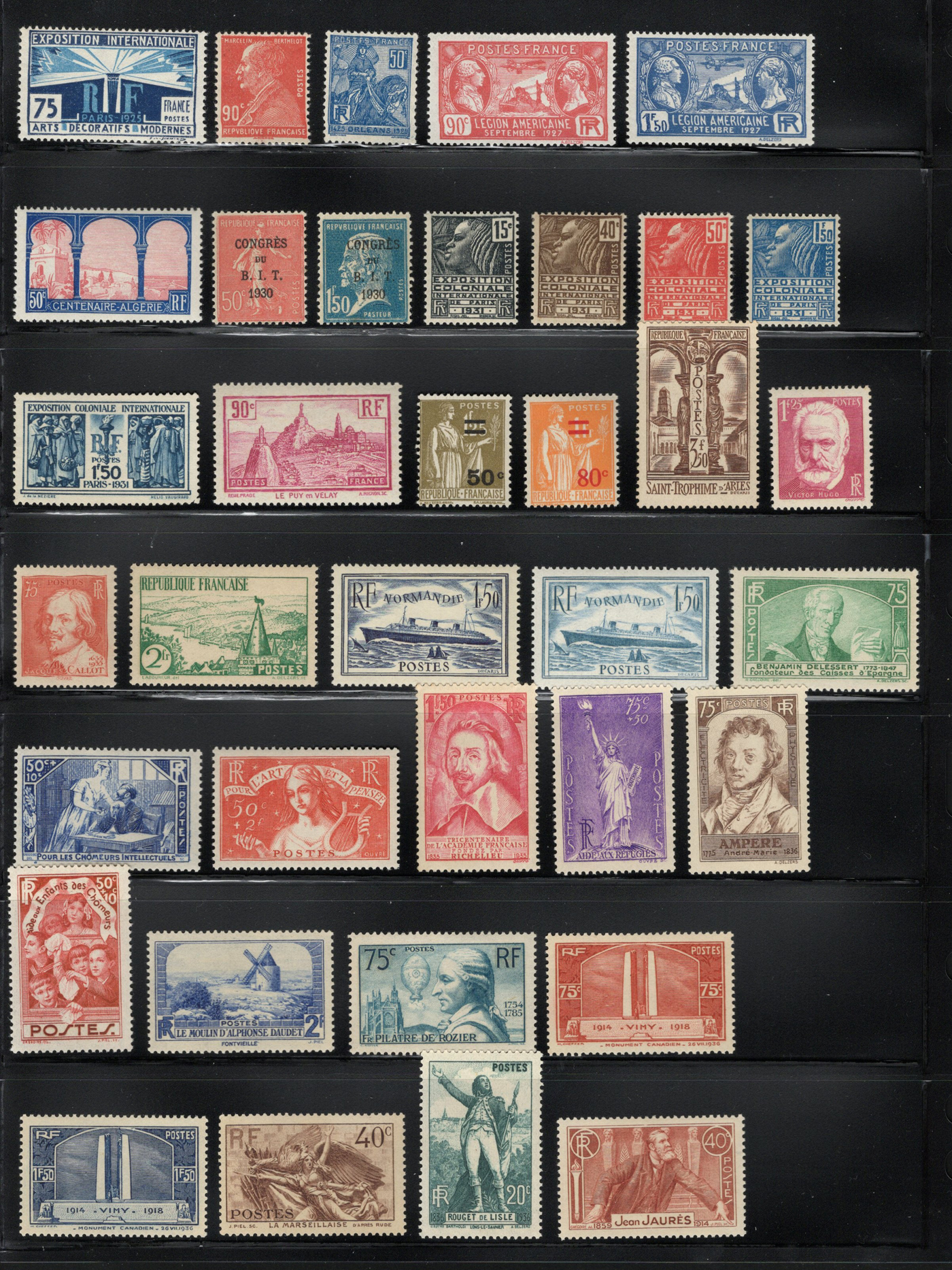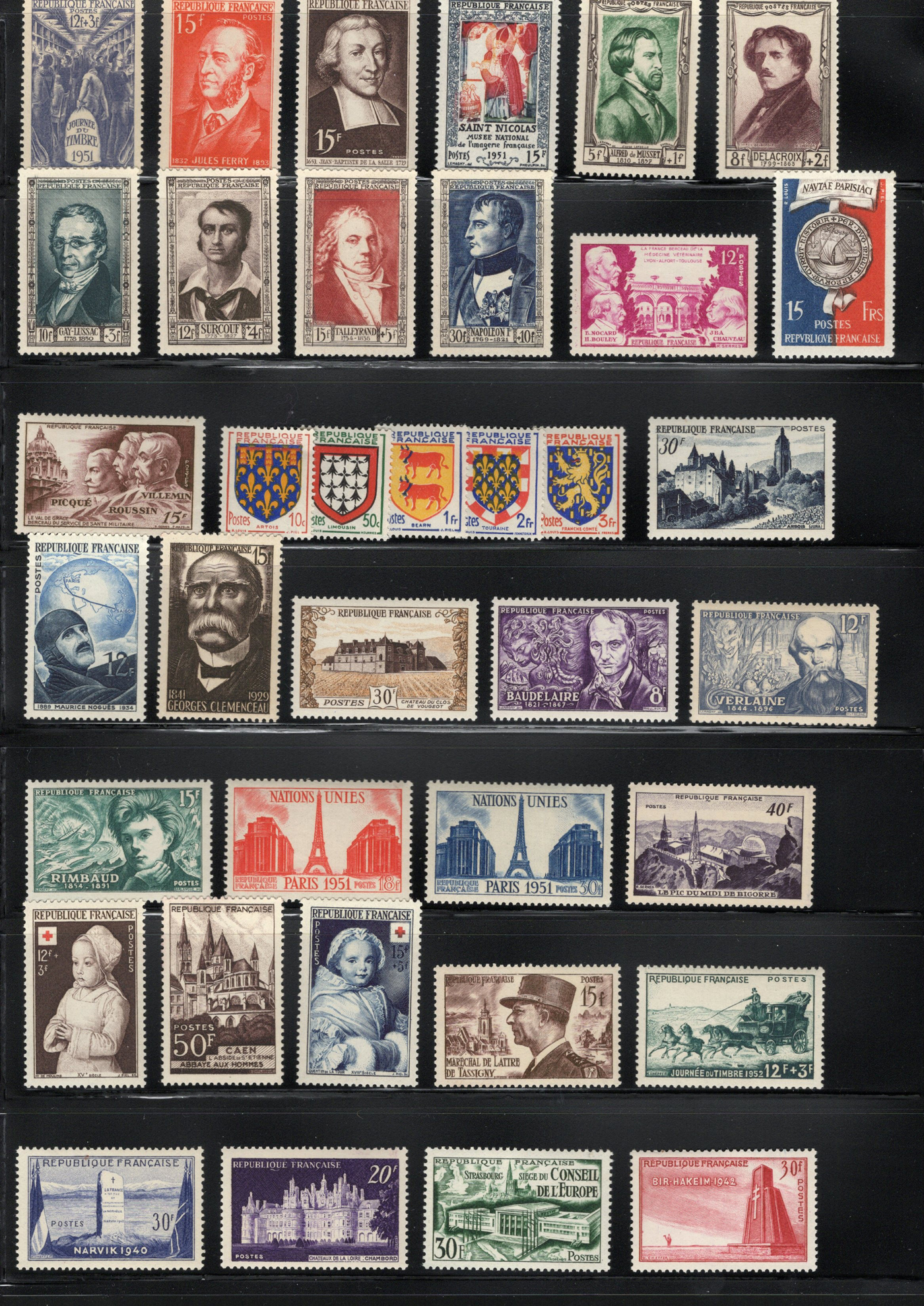 1556 nh   imageMint Never Hinged France Collection, 1900 to 1959, all neatly displayed on 25 black Vario sheets, with just under 1,000 different stamps. Some runs are strong and complete, such as the 1930s to 1959, and we note many better sets and singles, for example Scott #s 185-196 ($150), 198-201 ($125), 227-240 ($275), 258-262 ($125), 299 ($70), 300-300a ($174), 315-320 ($102), 342-347 ($122), 348 ($150), 700-705 ($61), B43 ($125), B48-53 ($75), B54-59 ($71), B66-67 ($350), B86-89A ($72), B157a ($100), B249-254 ($72), B285-290 ($137), B294-299 ($111), and many more, especially in the $10 to $50 range. An impressive collection not only for its catalogue value, but for its freshness and the fact that all the stamps are never hinged. Overall very fine. All pages scanned online for your perusal. (Scan 1) (Scan 2) (Scan 3) (Scan 4) (Scan 5) (Scan 6) (Scan 7) (Scan 8) (Scan 9) (Scan 10) (Scan 11) (Scan 12) (Scan 13) (Scan 14) (Scan 15) (Scan 16) (Scan 17) (Scan 18) (Scan 19) (Scan 20) (Scan 21) (Scan 22) (Scan 23) (Scan 24) (Scan 25) (All Scans)