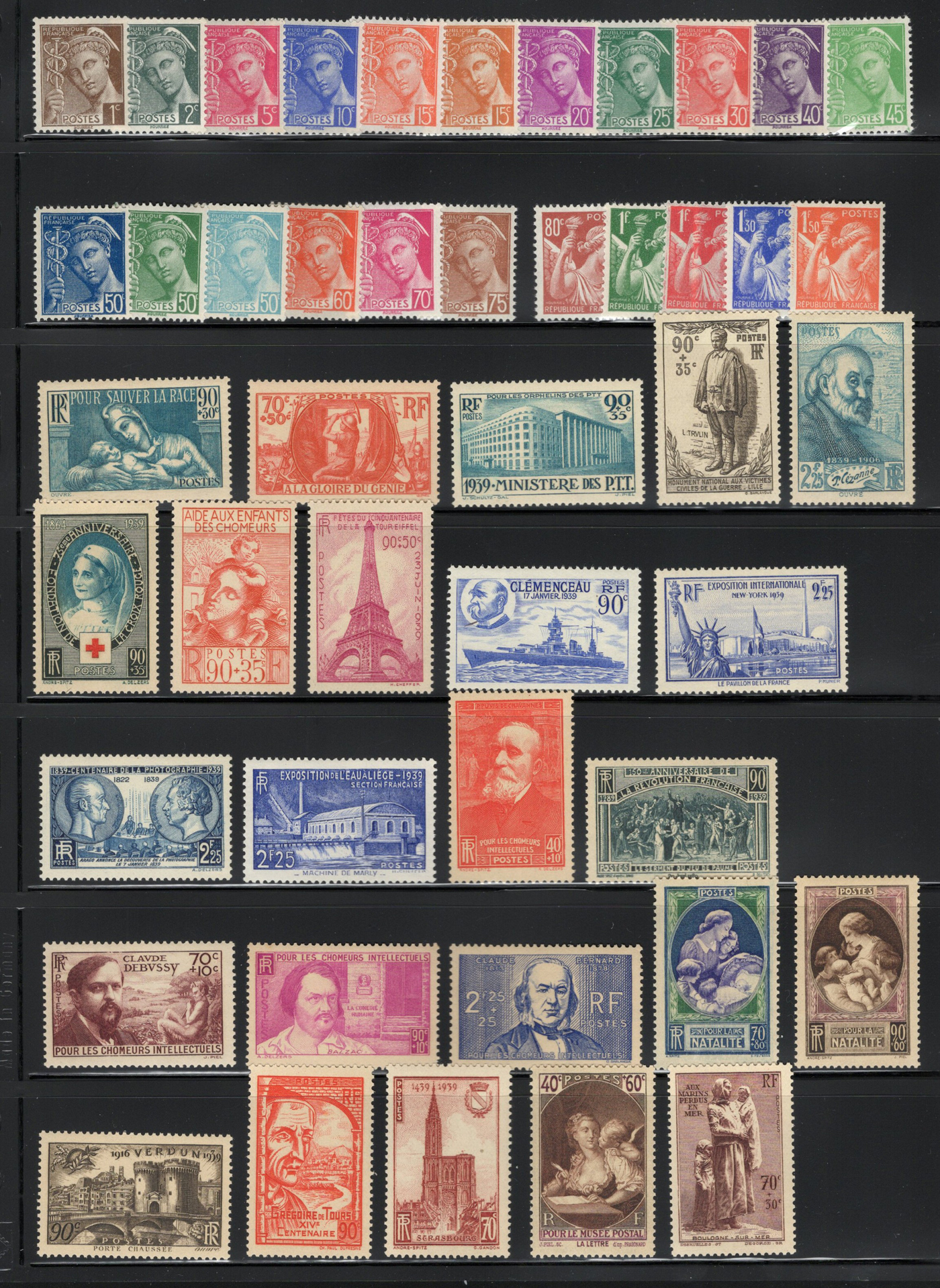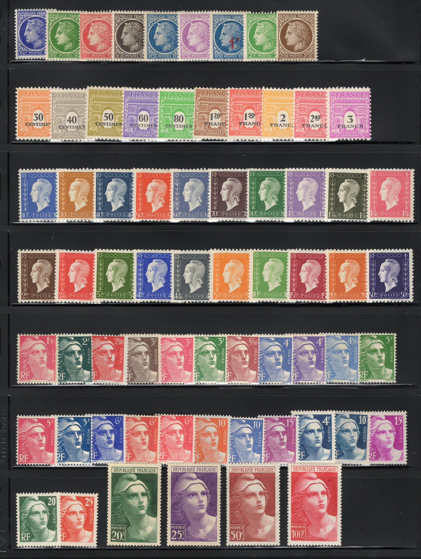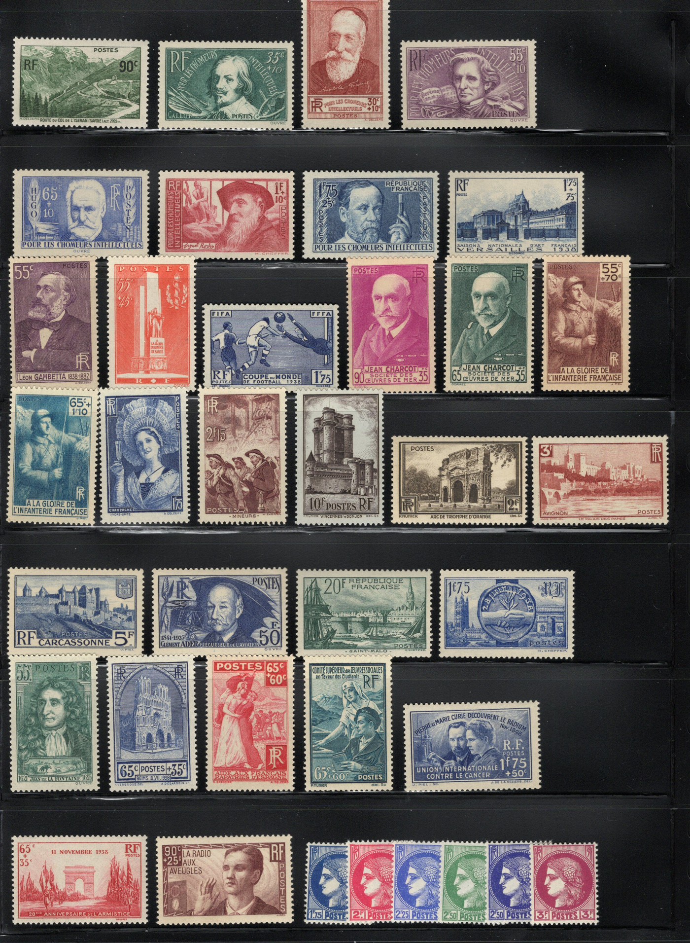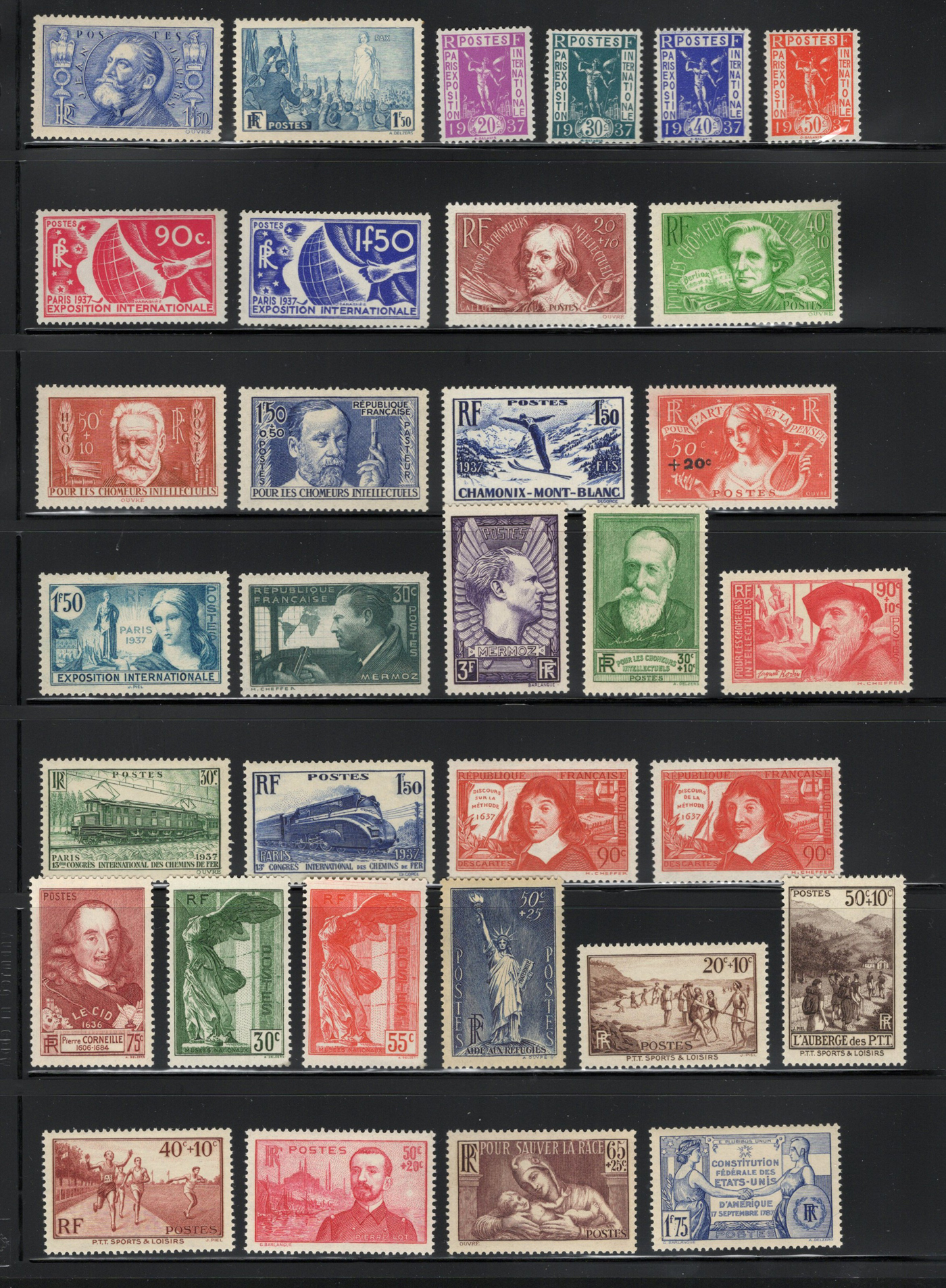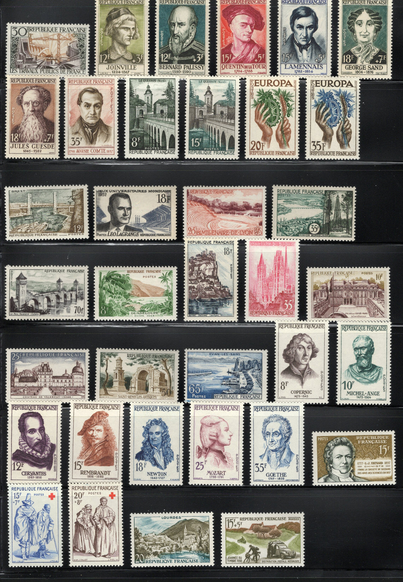 1556 nh   imageMint Never Hinged France Collection, 1900 to 1959, all neatly displayed on 25 black Vario sheets, with just under 1,000 different stamps. Some runs are strong and complete, such as the 1930s to 1959, and we note many better sets and singles, for example Scott #s 185-196 ($150), 198-201 ($125), 227-240 ($275), 258-262 ($125), 299 ($70), 300-300a ($174), 315-320 ($102), 342-347 ($122), 348 ($150), 700-705 ($61), B43 ($125), B48-53 ($75), B54-59 ($71), B66-67 ($350), B86-89A ($72), B157a ($100), B249-254 ($72), B285-290 ($137), B294-299 ($111), and many more, especially in the $10 to $50 range. An impressive collection not only for its catalogue value, but for its freshness and the fact that all the stamps are never hinged. Overall very fine. All pages scanned online for your perusal. (Scan 1) (Scan 2) (Scan 3) (Scan 4) (Scan 5) (Scan 6) (Scan 7) (Scan 8) (Scan 9) (Scan 10) (Scan 11) (Scan 12) (Scan 13) (Scan 14) (Scan 15) (Scan 16) (Scan 17) (Scan 18) (Scan 19) (Scan 20) (Scan 21) (Scan 22) (Scan 23) (Scan 24) (Scan 25) (All Scans)