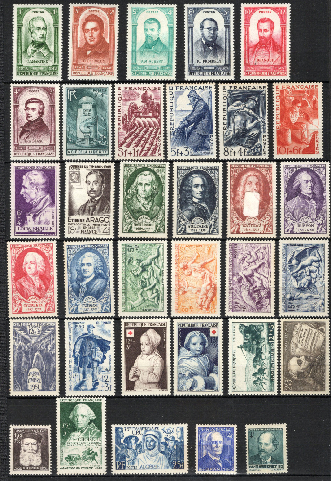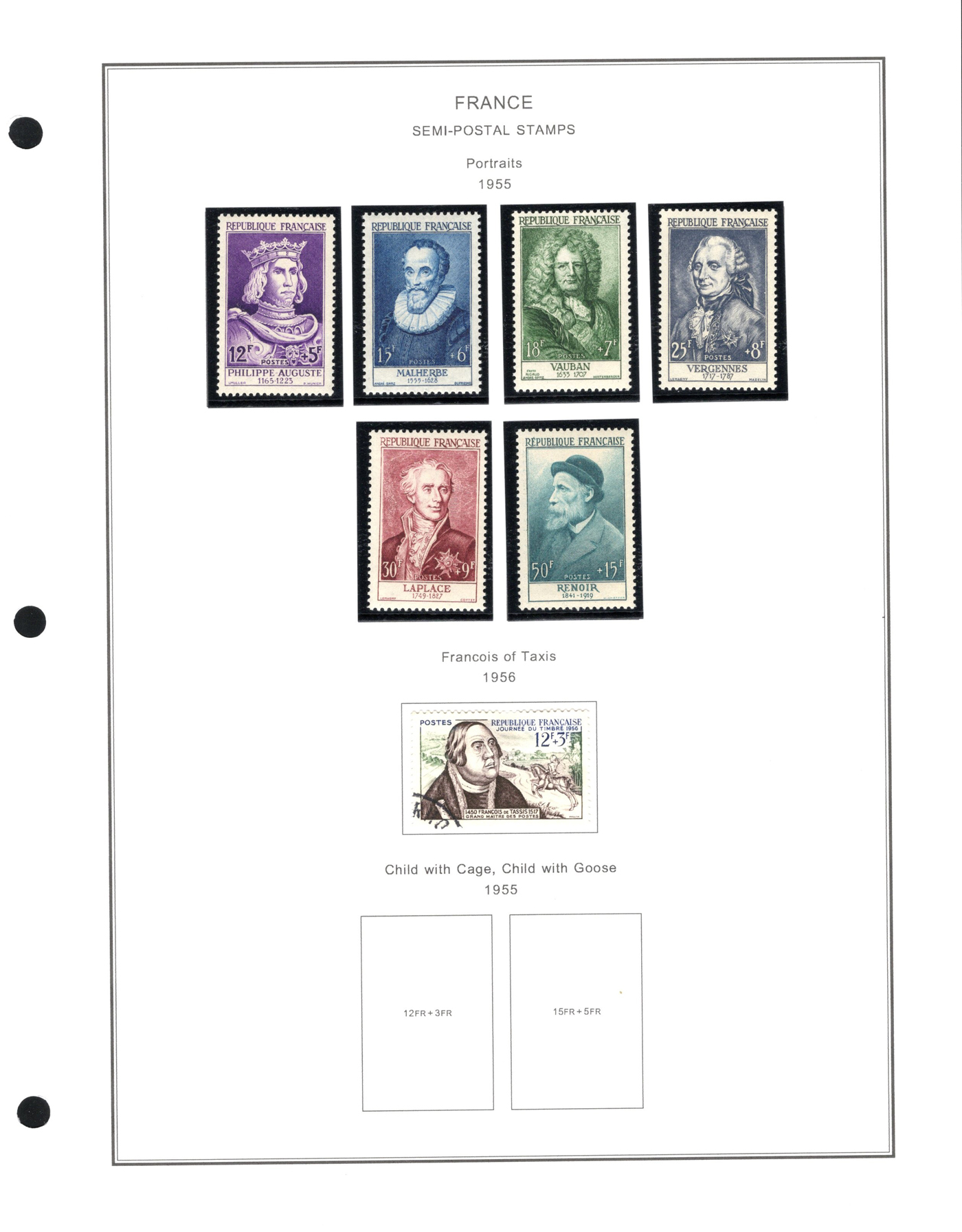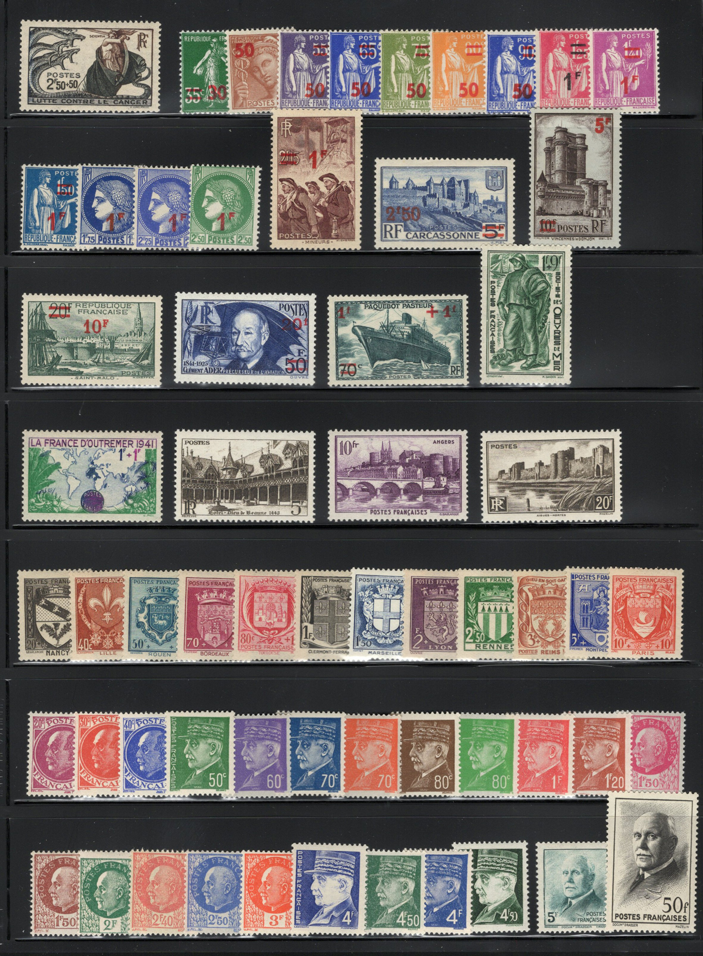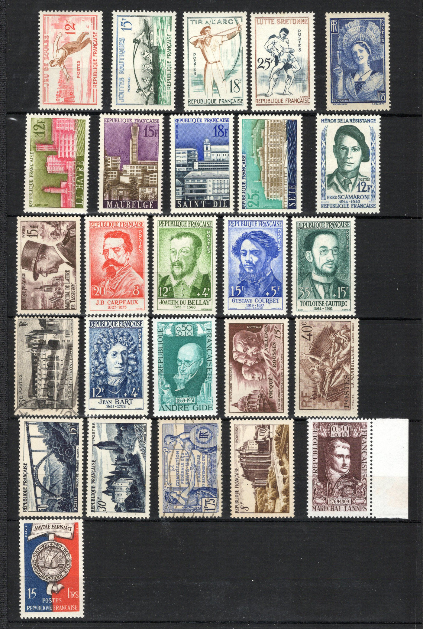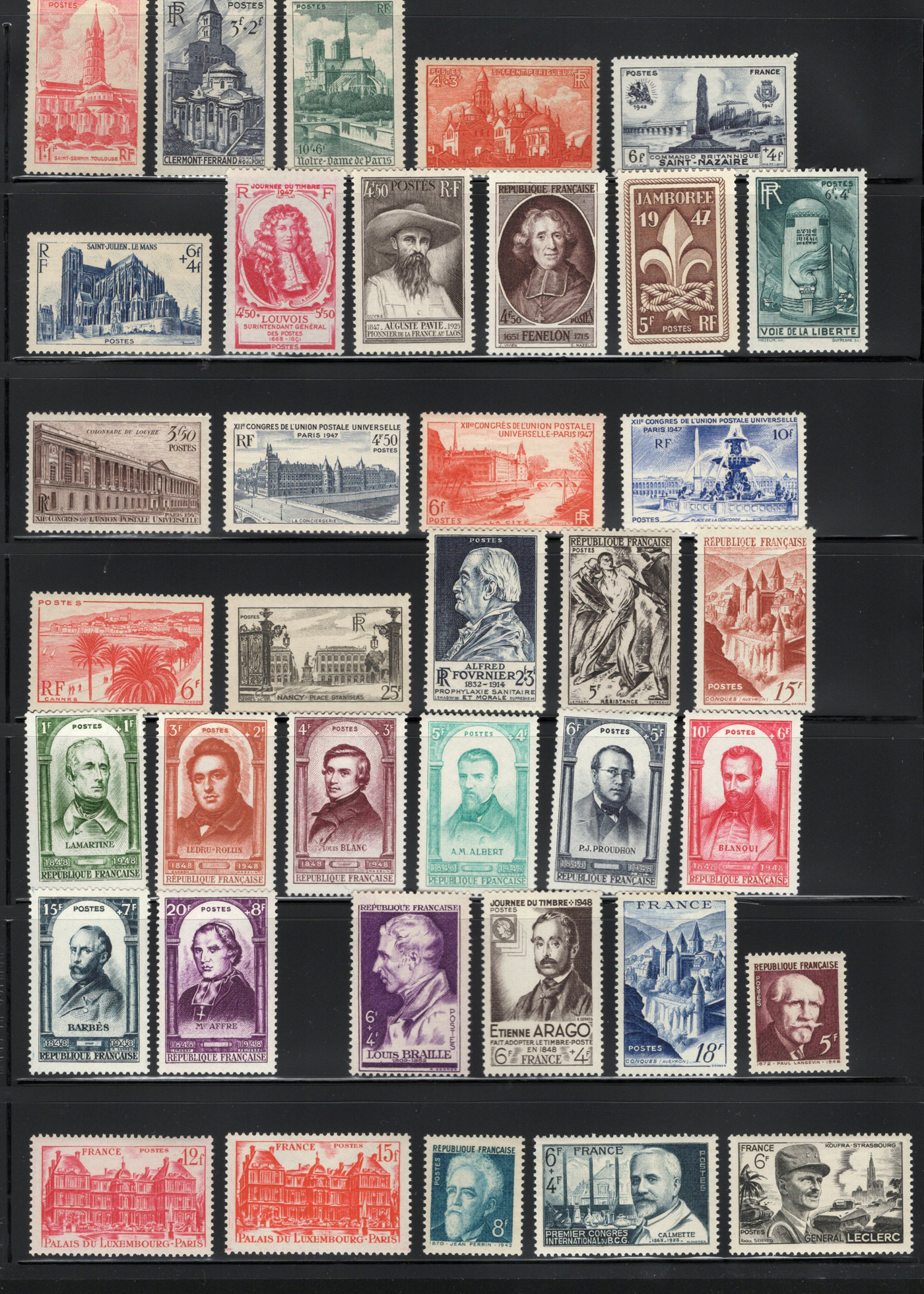 1556 nh   imageMint Never Hinged France Collection, 1900 to 1959, all neatly displayed on 25 black Vario sheets, with just under 1,000 different stamps. Some runs are strong and complete, such as the 1930s to 1959, and we note many better sets and singles, for example Scott #s 185-196 ($150), 198-201 ($125), 227-240 ($275), 258-262 ($125), 299 ($70), 300-300a ($174), 315-320 ($102), 342-347 ($122), 348 ($150), 700-705 ($61), B43 ($125), B48-53 ($75), B54-59 ($71), B66-67 ($350), B86-89A ($72), B157a ($100), B249-254 ($72), B285-290 ($137), B294-299 ($111), and many more, especially in the $10 to $50 range. An impressive collection not only for its catalogue value, but for its freshness and the fact that all the stamps are never hinged. Overall very fine. All pages scanned online for your perusal. (Scan 1) (Scan 2) (Scan 3) (Scan 4) (Scan 5) (Scan 6) (Scan 7) (Scan 8) (Scan 9) (Scan 10) (Scan 11) (Scan 12) (Scan 13) (Scan 14) (Scan 15) (Scan 16) (Scan 17) (Scan 18) (Scan 19) (Scan 20) (Scan 21) (Scan 22) (Scan 23) (Scan 24) (Scan 25) (All Scans)