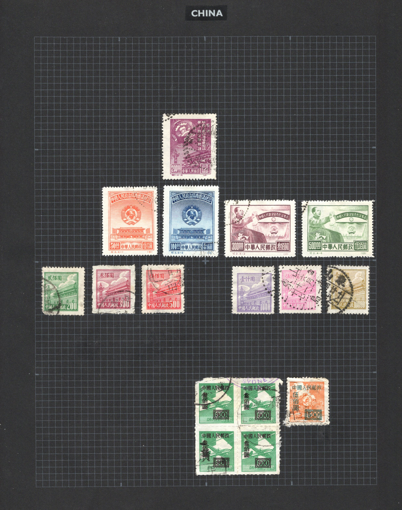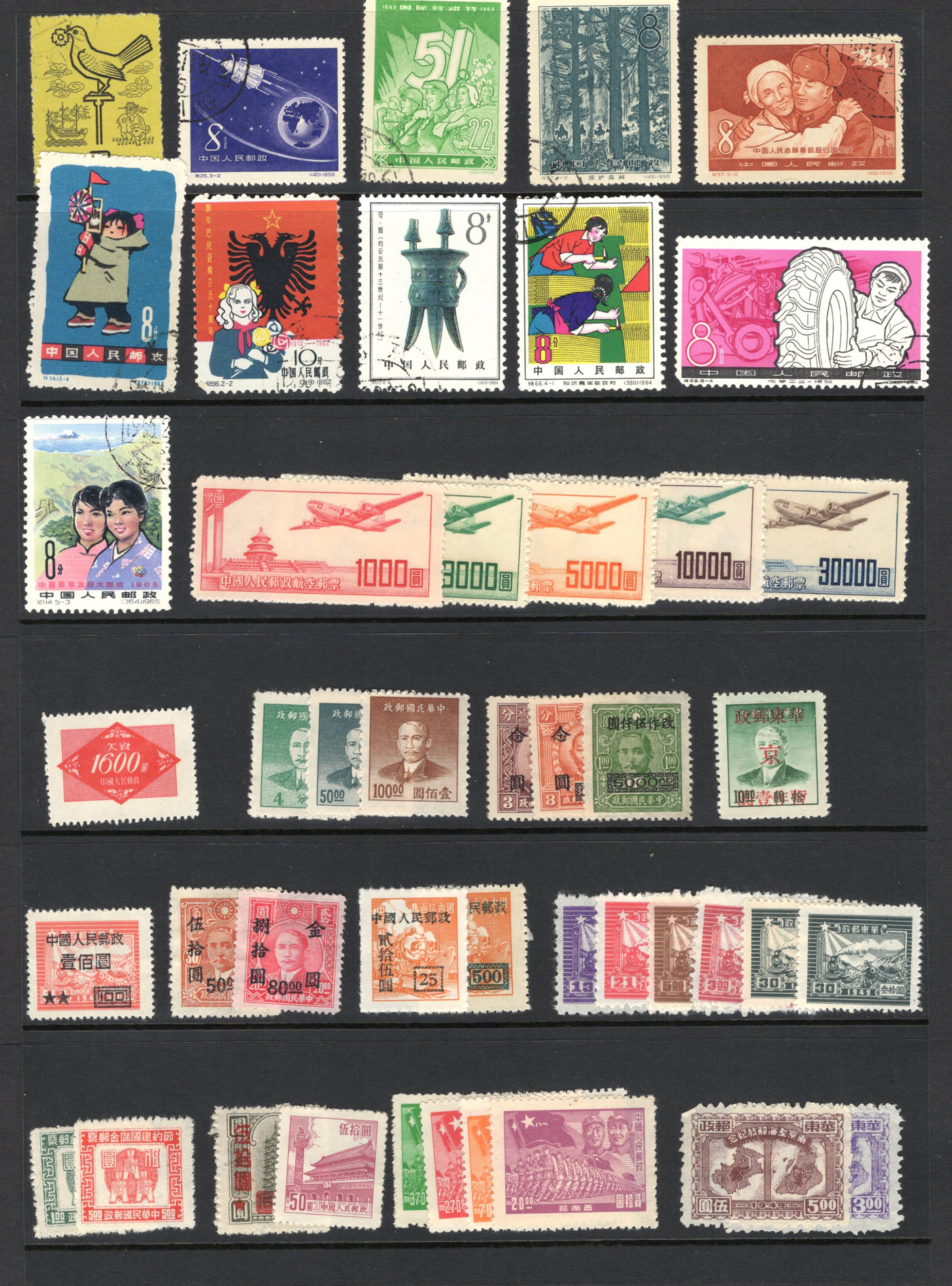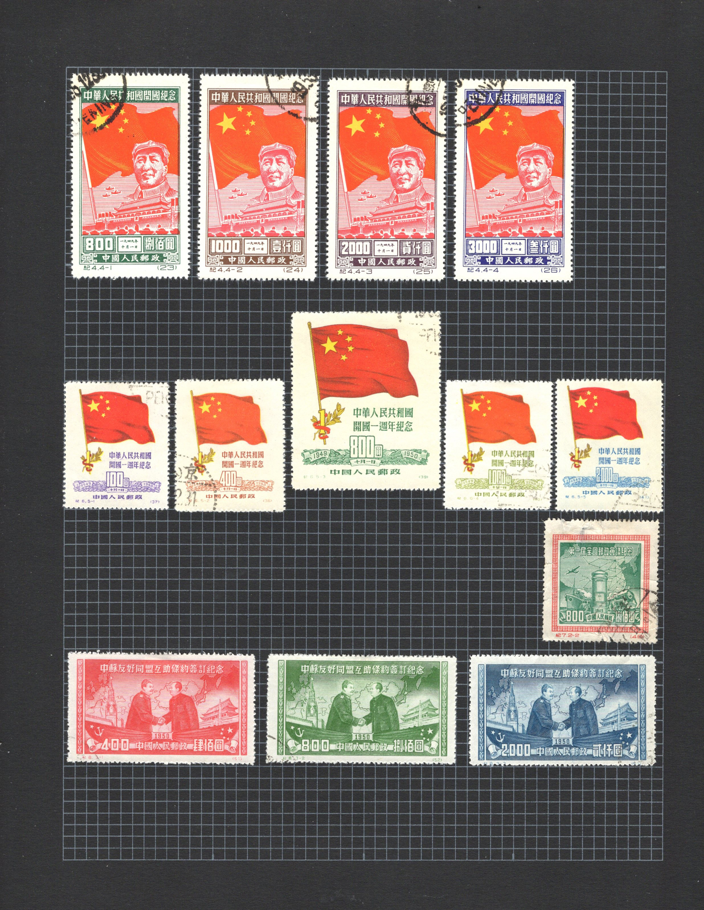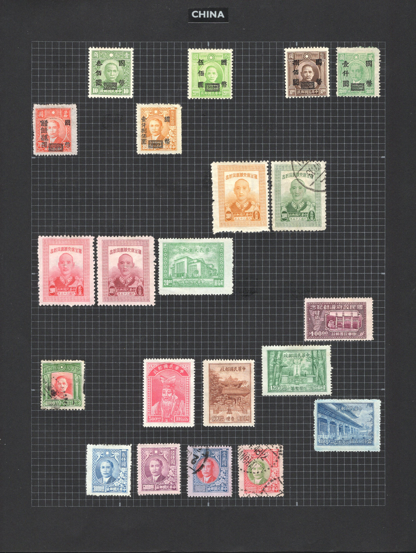 1543 O/og   imageOld Time Collection of Mint and Used China, People's Republic of China and More, 1888 to 1956, mounted on 28 black quadrille pages, starting with China (10 pages), People's Republic of China (8 pages) and the rest is a variety of material from Manchuria, Formosa, provinces, Shanghai, and others. Good variety of material, mostly used or cancelled to order, some items are reprints, many useful singles and sets. Overall fine or better, with some faults here and there, see our sample photos for an idea. (Scan 1) (Scan 2) (Scan 3) (Scan 4) (Scan 5) (Scan 6) (Scan 7) (Scan 8) (Scan 9) (Scan 10) (Scan 11) (Scan 12) (Scan 13) (Scan 14) (Scan 15) (All Scans)