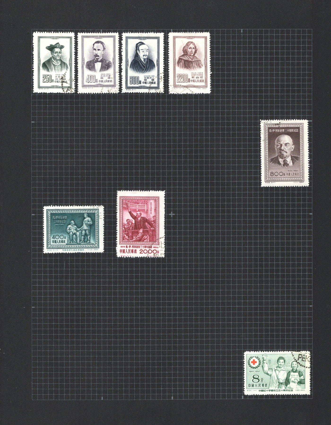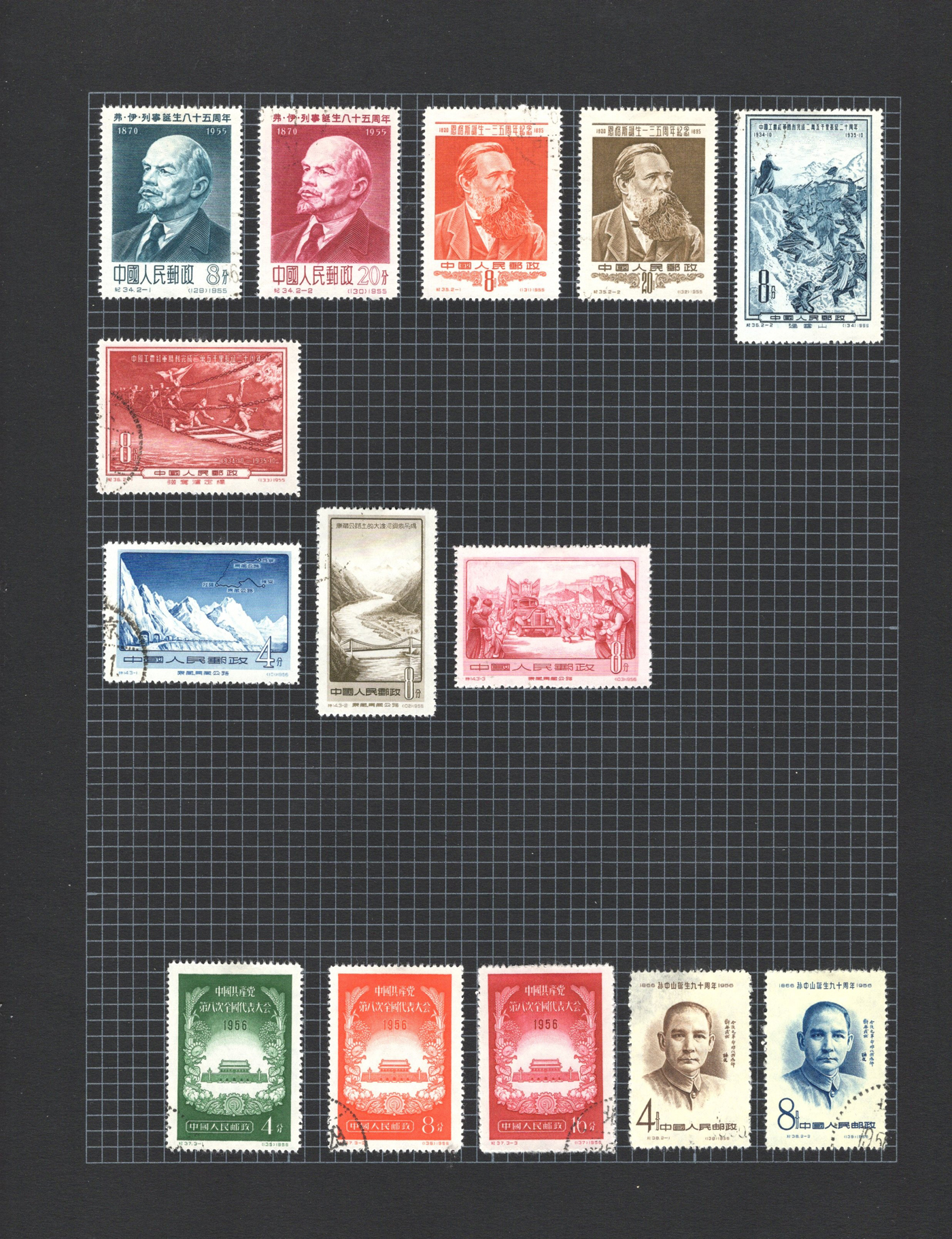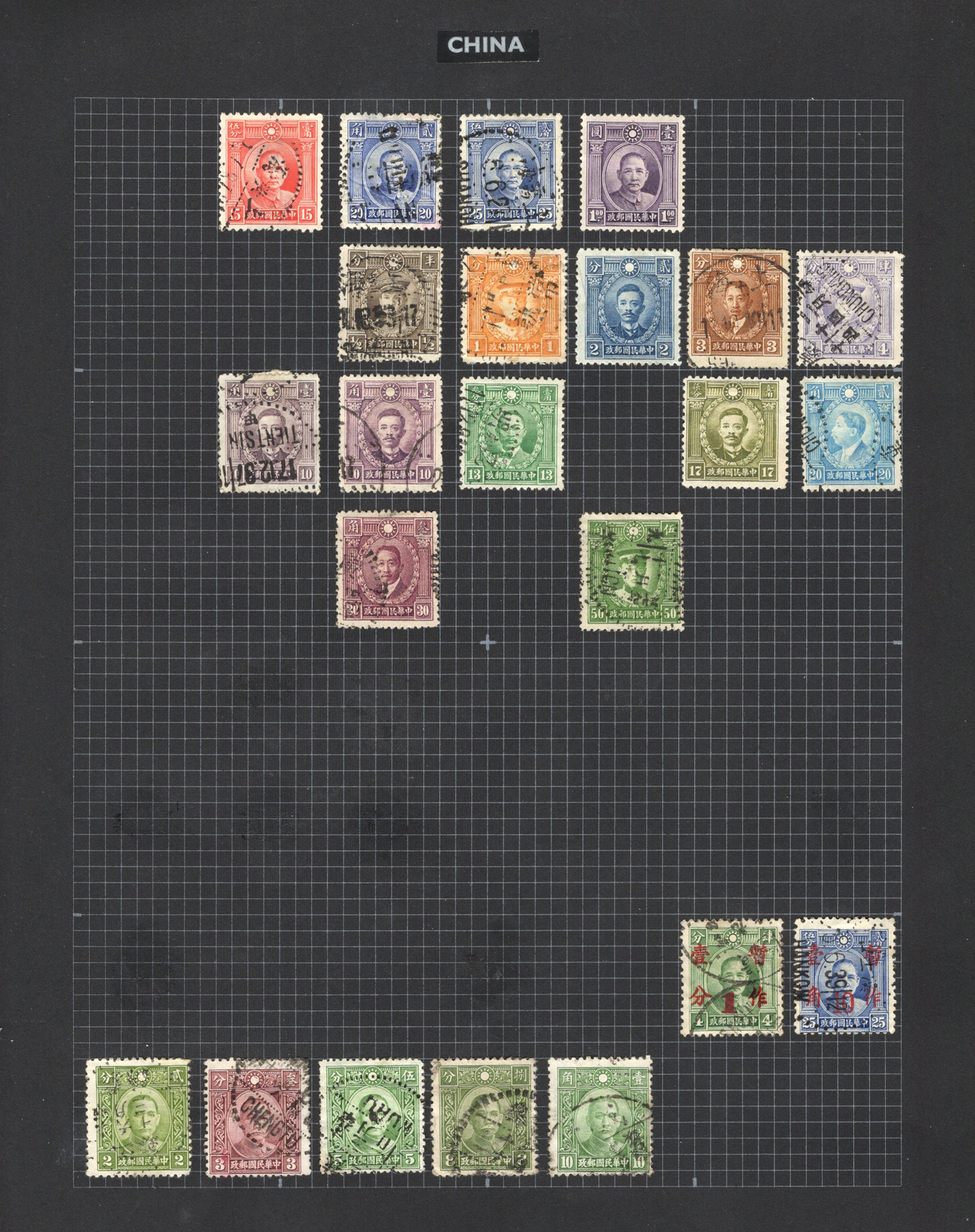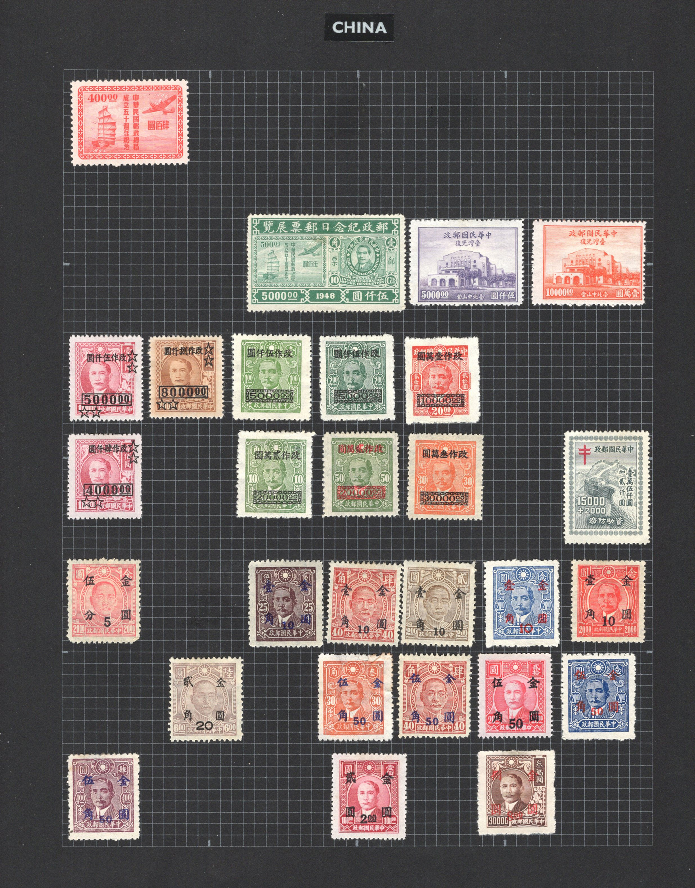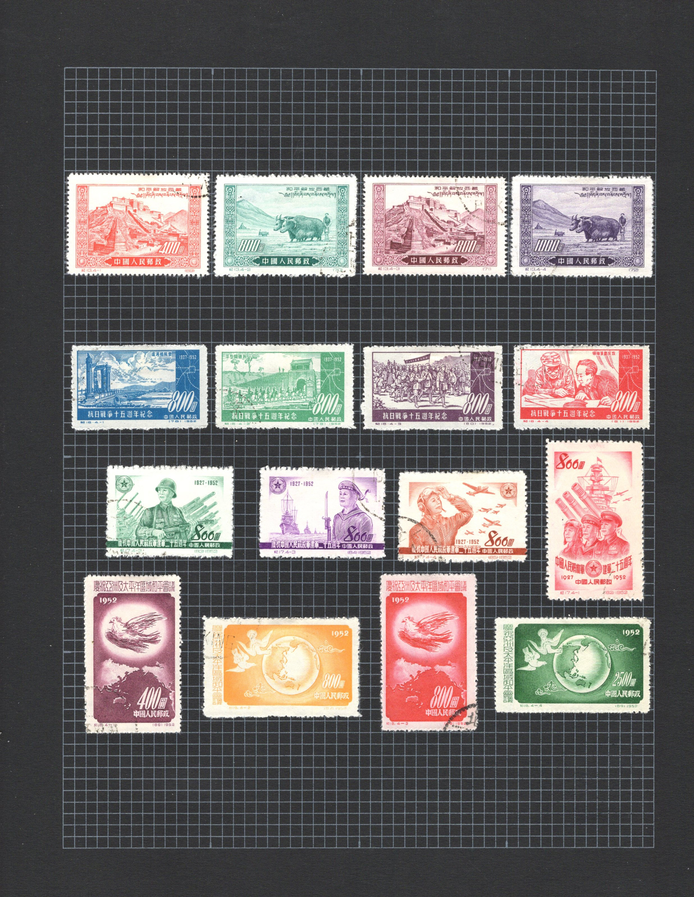 1543 O/og   imageOld Time Collection of Mint and Used China, People's Republic of China and More, 1888 to 1956, mounted on 28 black quadrille pages, starting with China (10 pages), People's Republic of China (8 pages) and the rest is a variety of material from Manchuria, Formosa, provinces, Shanghai, and others. Good variety of material, mostly used or cancelled to order, some items are reprints, many useful singles and sets. Overall fine or better, with some faults here and there, see our sample photos for an idea. (Scan 1) (Scan 2) (Scan 3) (Scan 4) (Scan 5) (Scan 6) (Scan 7) (Scan 8) (Scan 9) (Scan 10) (Scan 11) (Scan 12) (Scan 13) (Scan 14) (Scan 15) (All Scans)