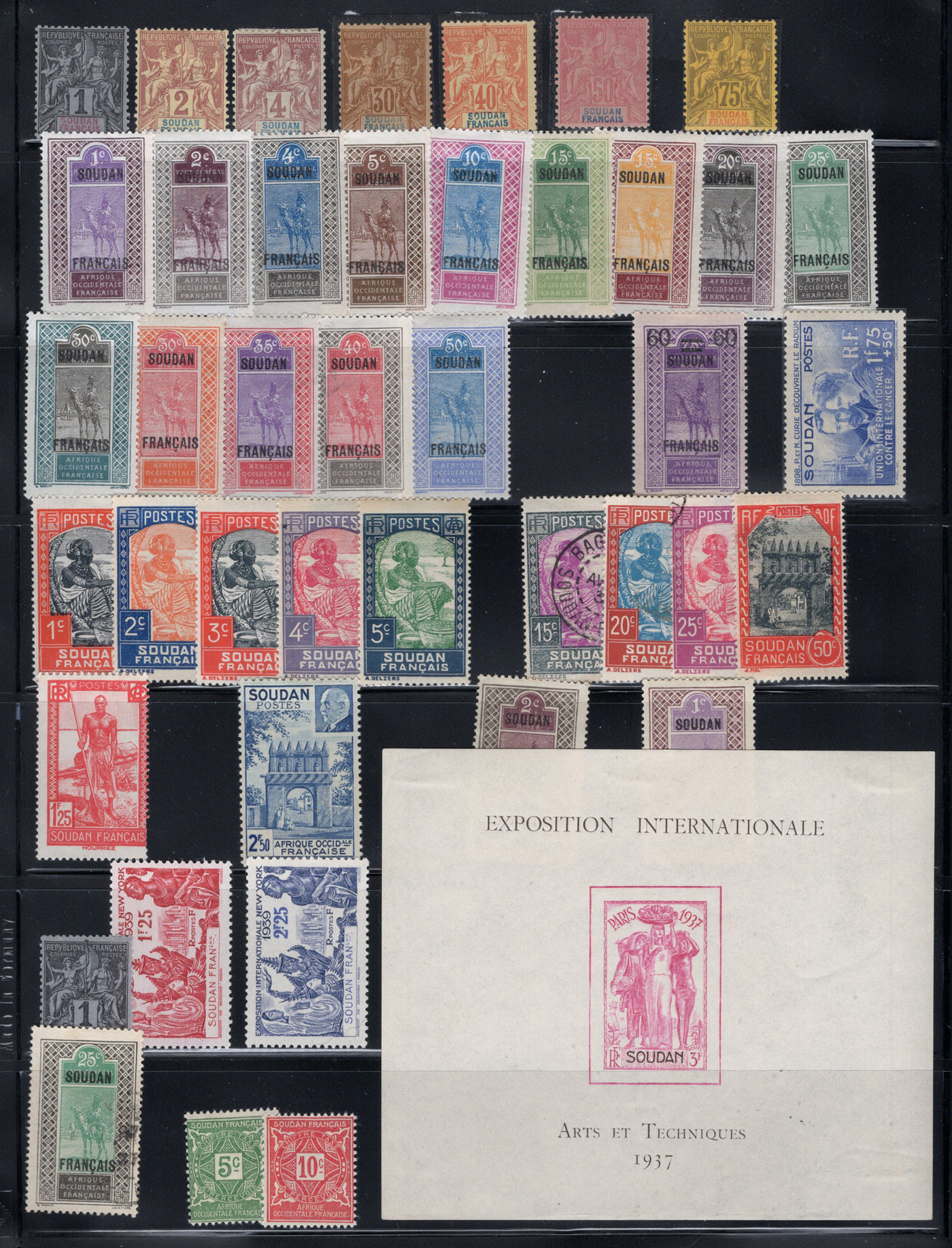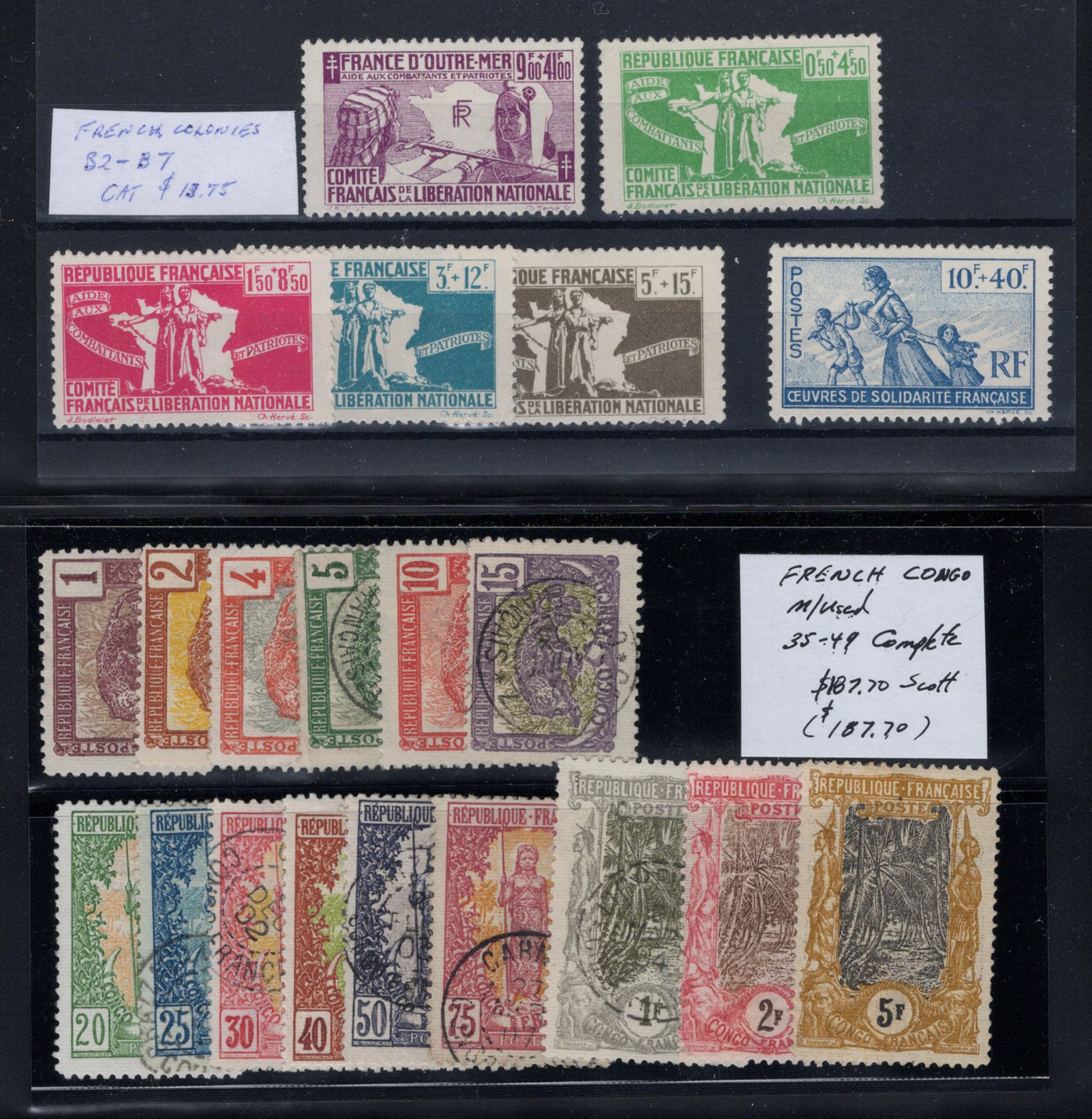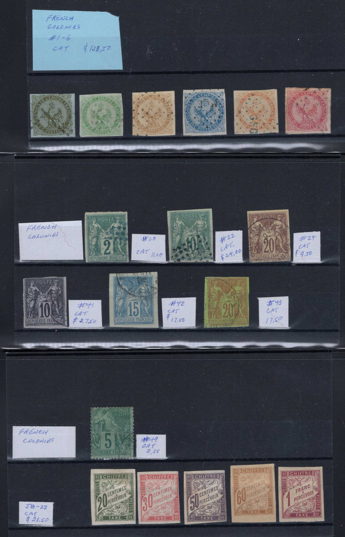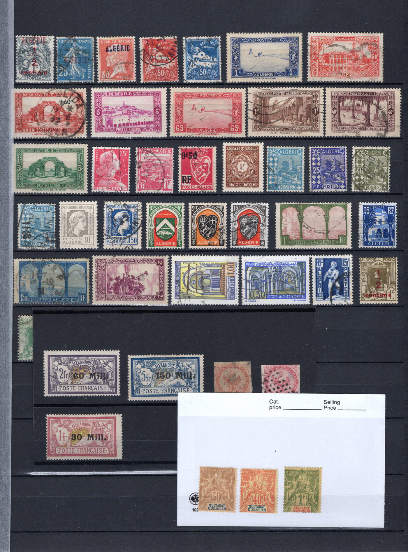 1560 O/og/nh   imageAssortment of French Colonies Singles and Sets, with a mix of mint and used on album pages, in stock sheets and in stock cards, with French Colonies general issues (#1-6 used, $138, plus others cataloguing $142), Alexandria (x5, $53), Algeria (x102), Andorra (x29), Anjouan (12, 14, 19 mint, $162), Cameroun (x256), Dahomey (x55), French Oceania / Polynesia (x12 mint, including C29, $21 and C77A, $200), French Sudan (x43, incl. #s 14-16, 18, 112, B1, $214 total), Inini (x5 mint, including #83) and French Congo (#35-49, $187). Overall fine to very fine, pictures show a sampling. (Scan 1) (Scan 2) (Scan 3) (Scan 4) (Scan 5) (Scan 6) (Scan 7) (All Scans)