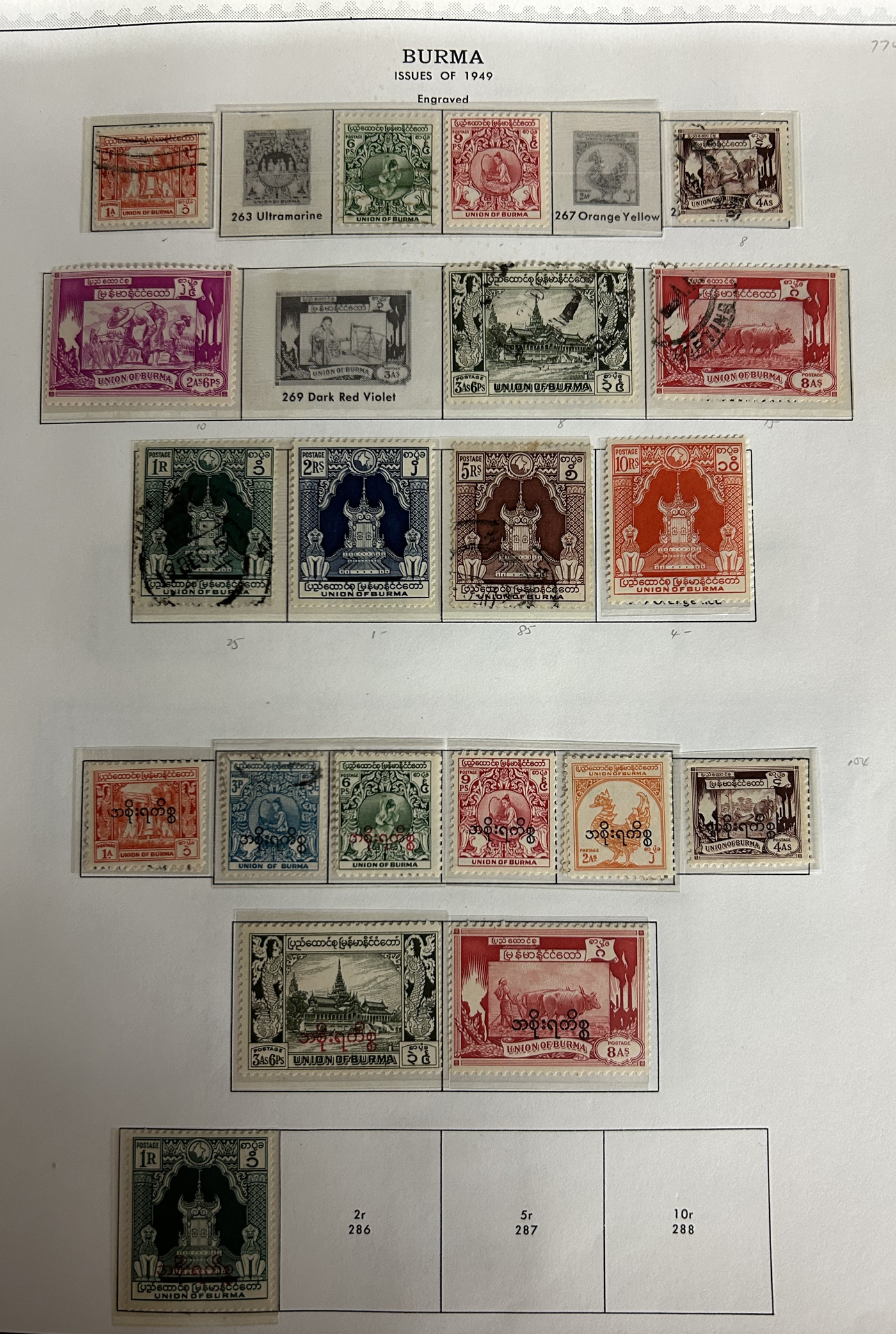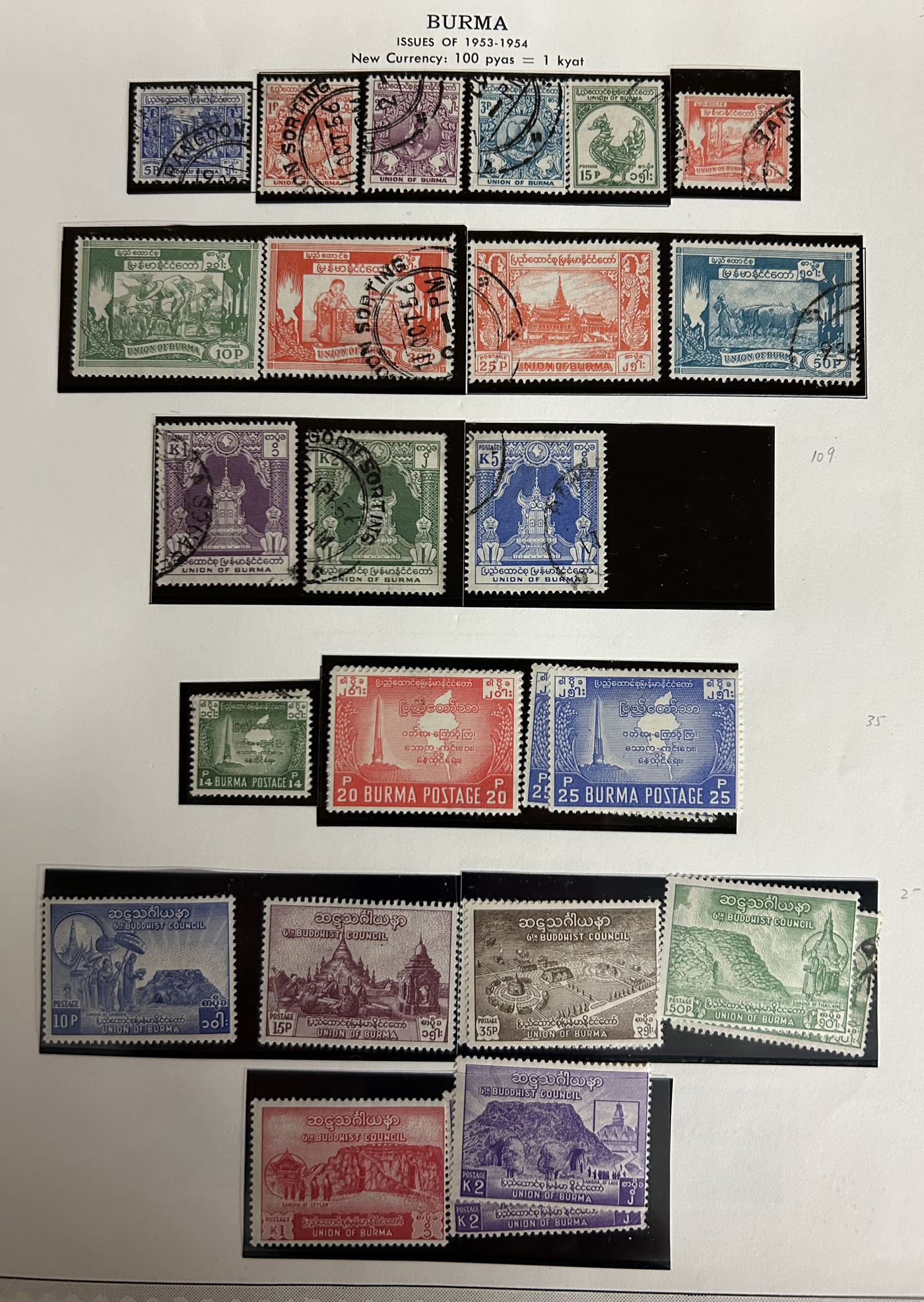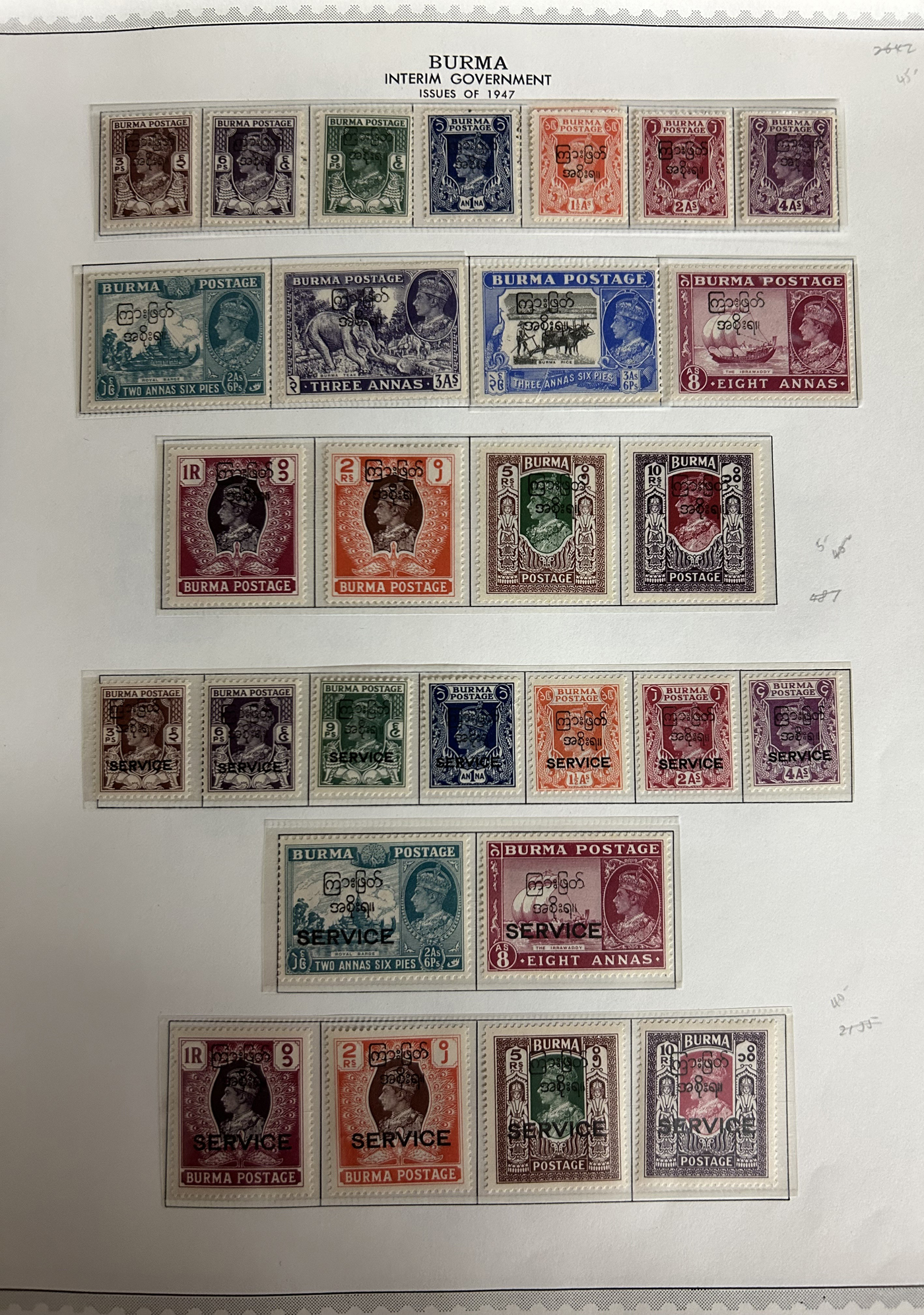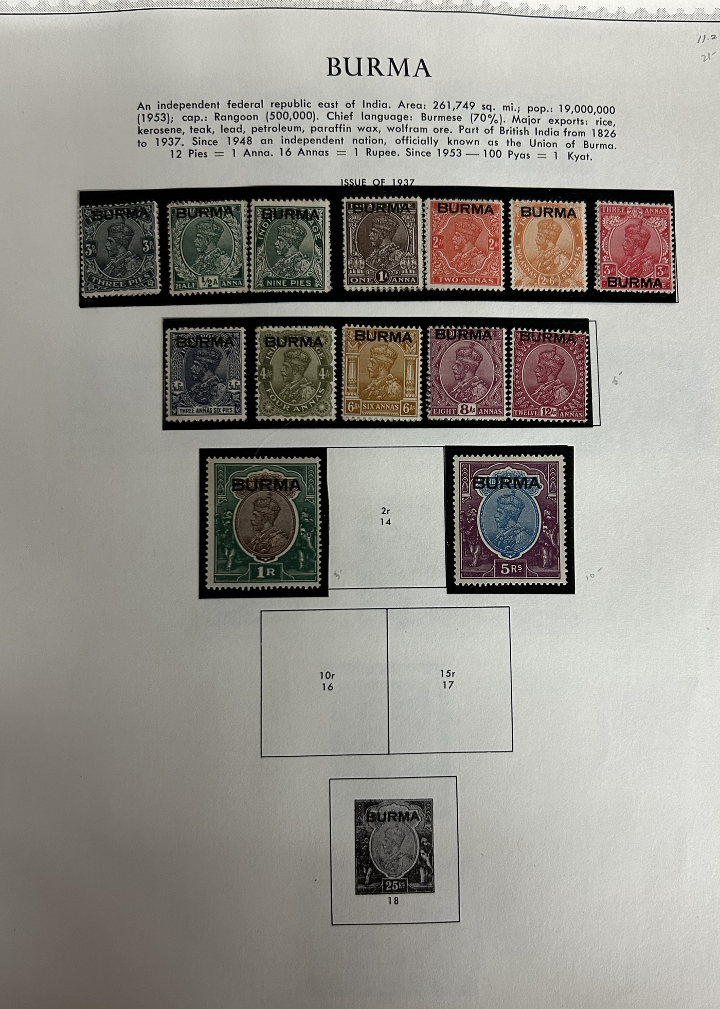 1541 O/og/nh   imageCollection of Mint and Used Burma, 1937 to 1968, with a mix of mint and used, and often with both (one under the other), with light duplication of either or both. We note the following runs, with #s 1-13, 14 (these all mint, with some additional used), 18A-34 (mix of mint and used), 35-50 (mint, with some add'l used), 70-101 (mint), 116-135 (mint), 1N46 (mint, $120), O28/O42 (mint, missing O39), O43-O55 (mint, $200), and many more. A clean and overall fine or better collection, see pictures for a sampling, bearing in mid that there are many hidden stamps underneath others. (Scan 1) (Scan 2) (Scan 3) (Scan 4) (Scan 5) (Scan 6) (Scan 7) (Scan 8) (Scan 9) (Scan 10) (Scan 11) (Scan 12) (All Scans)
