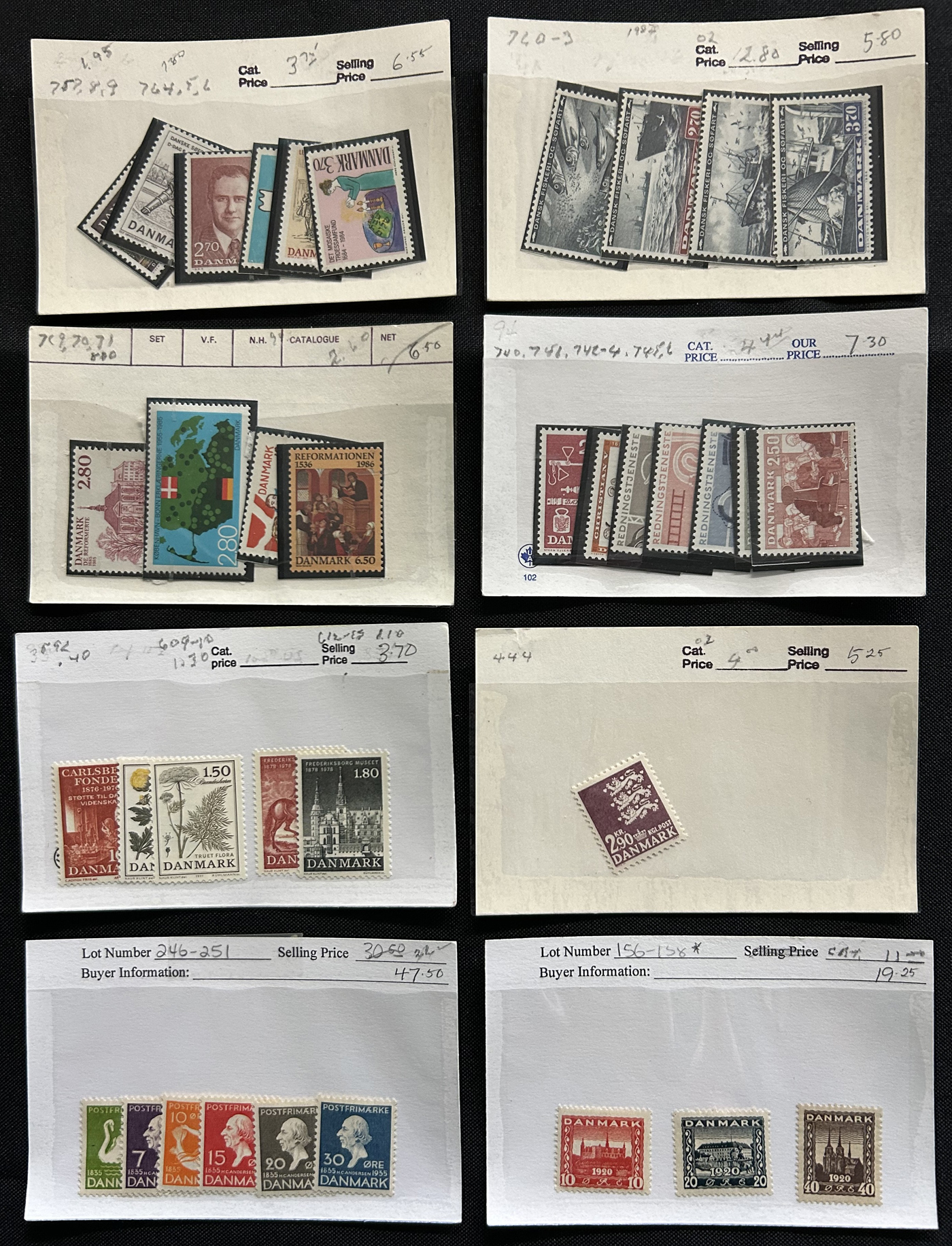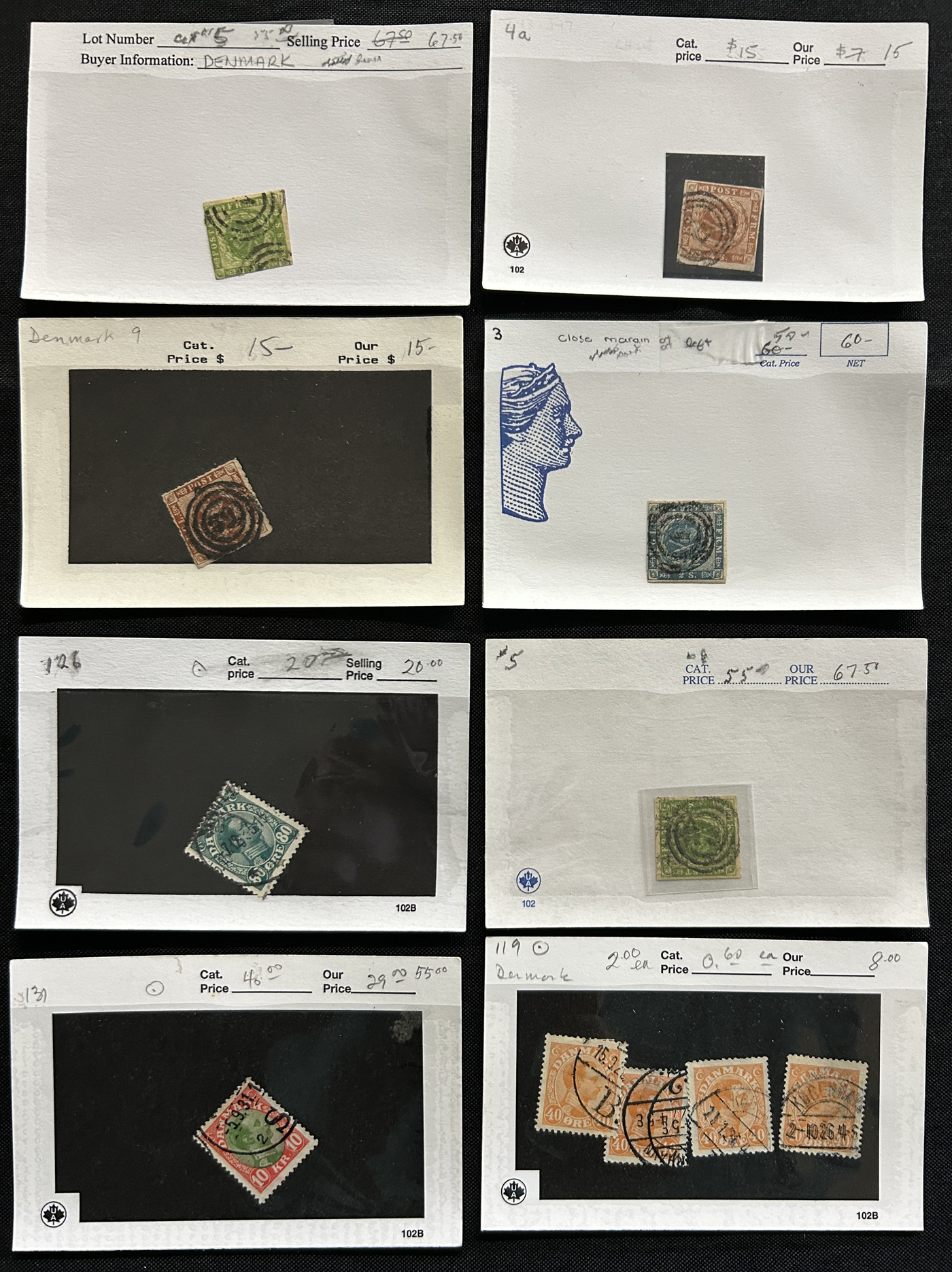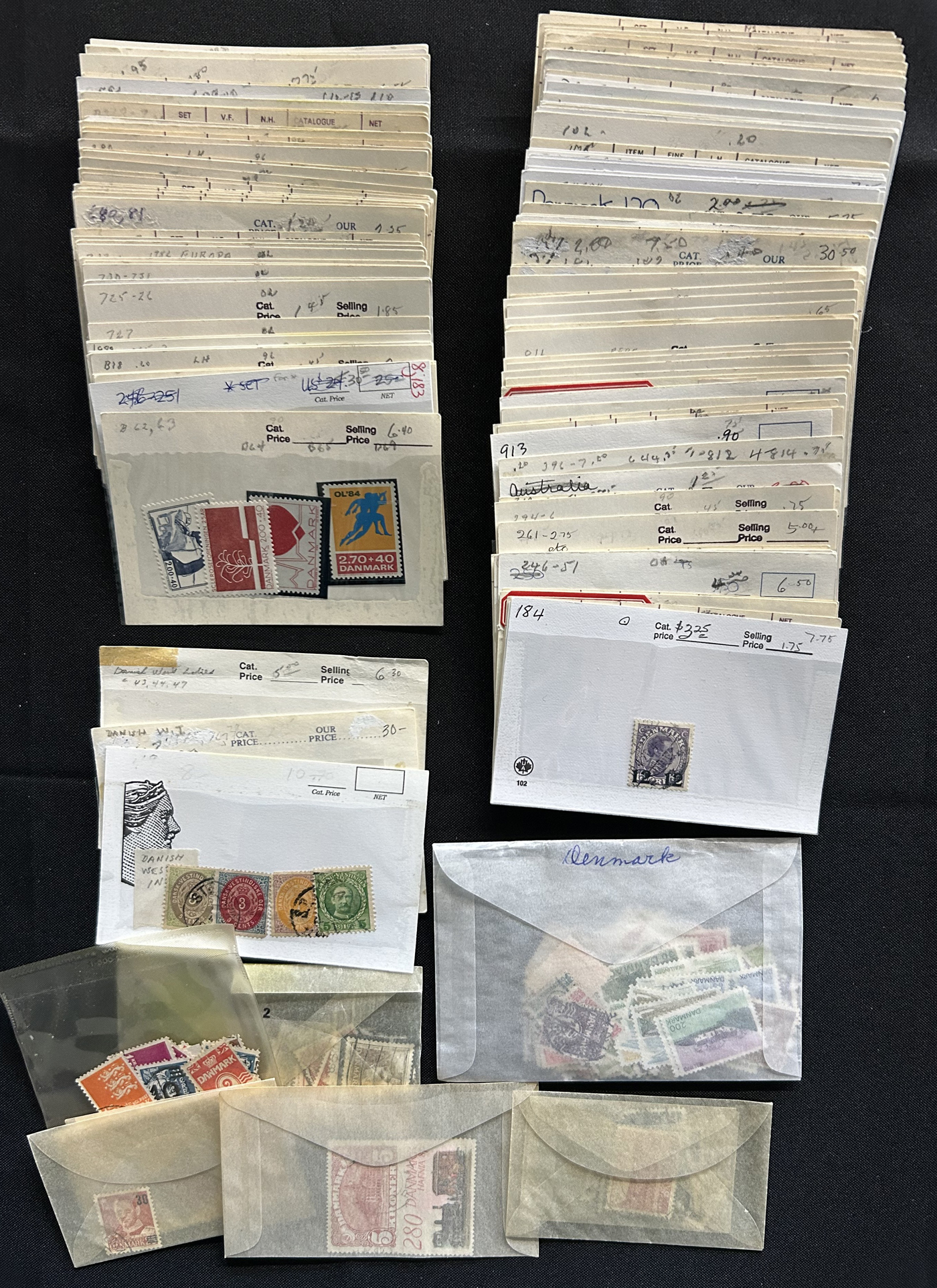 1549 O/og   imageSmall Dealer Stock of Mint and Used Denmark, in over 102 cards, each with a Scott #, asking price and older price. The owner calculated the older value to be $750 for the used, $225 for the mint, plus about $100 for Danish West Indies. Looks line good quality material (a few faults only), with singles and sets cataloguing (at the time) between $1 and $50, on average. We checked current values for a few items which revealed higher values, such as #s 3 (used, was $50, now $60), 5 (used, was $55, now $67), 9 (used, was $55, now $67), 126 (used, was $20, now $22), 131 (used, was $40, now $65). See photos for an idea. (Scan 1) (Scan 2) (Scan 3) (All Scans)