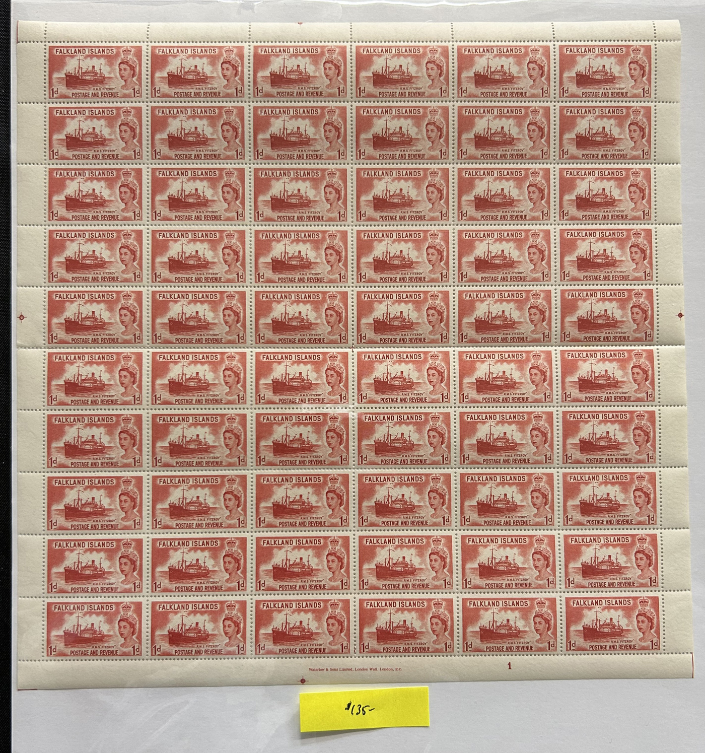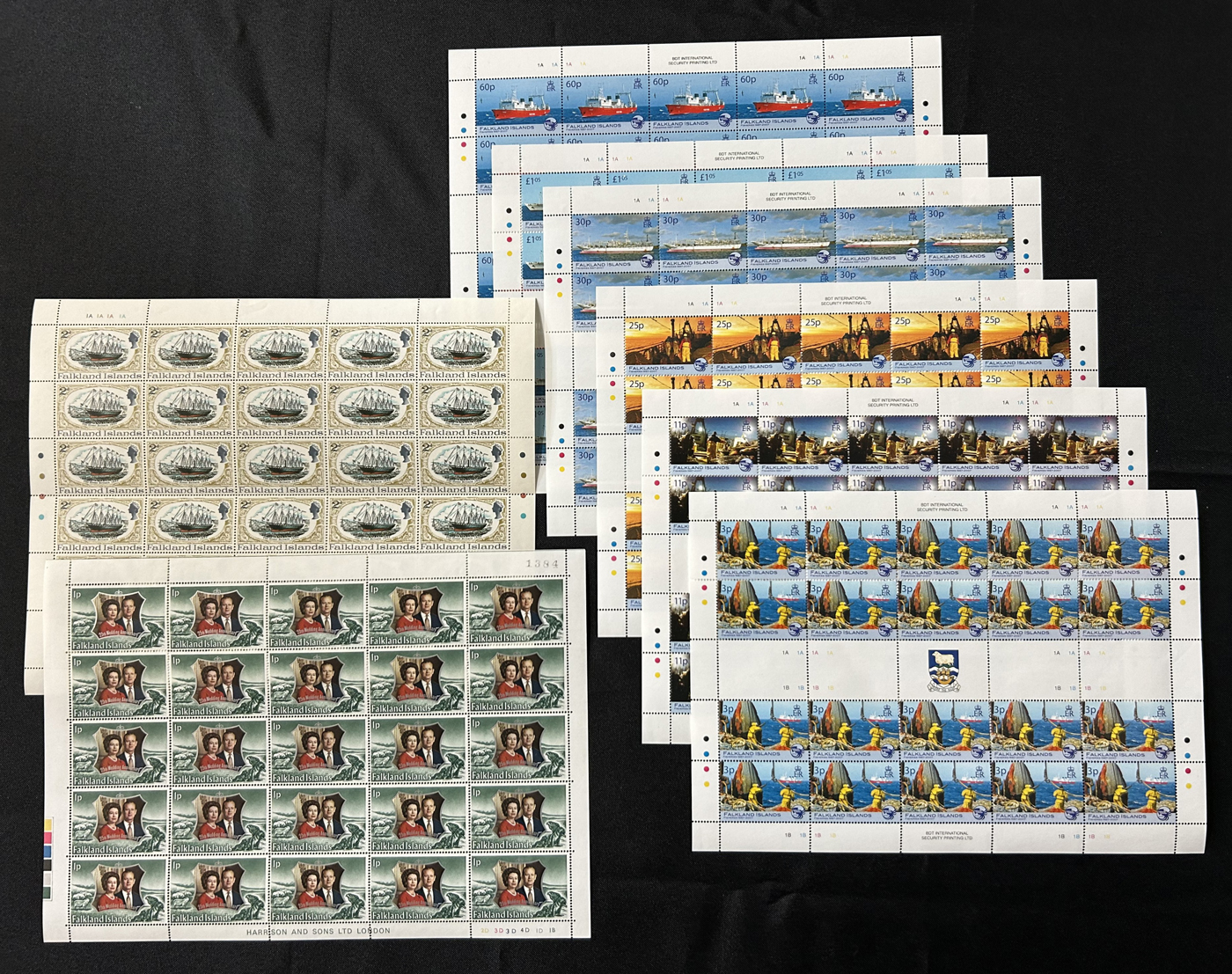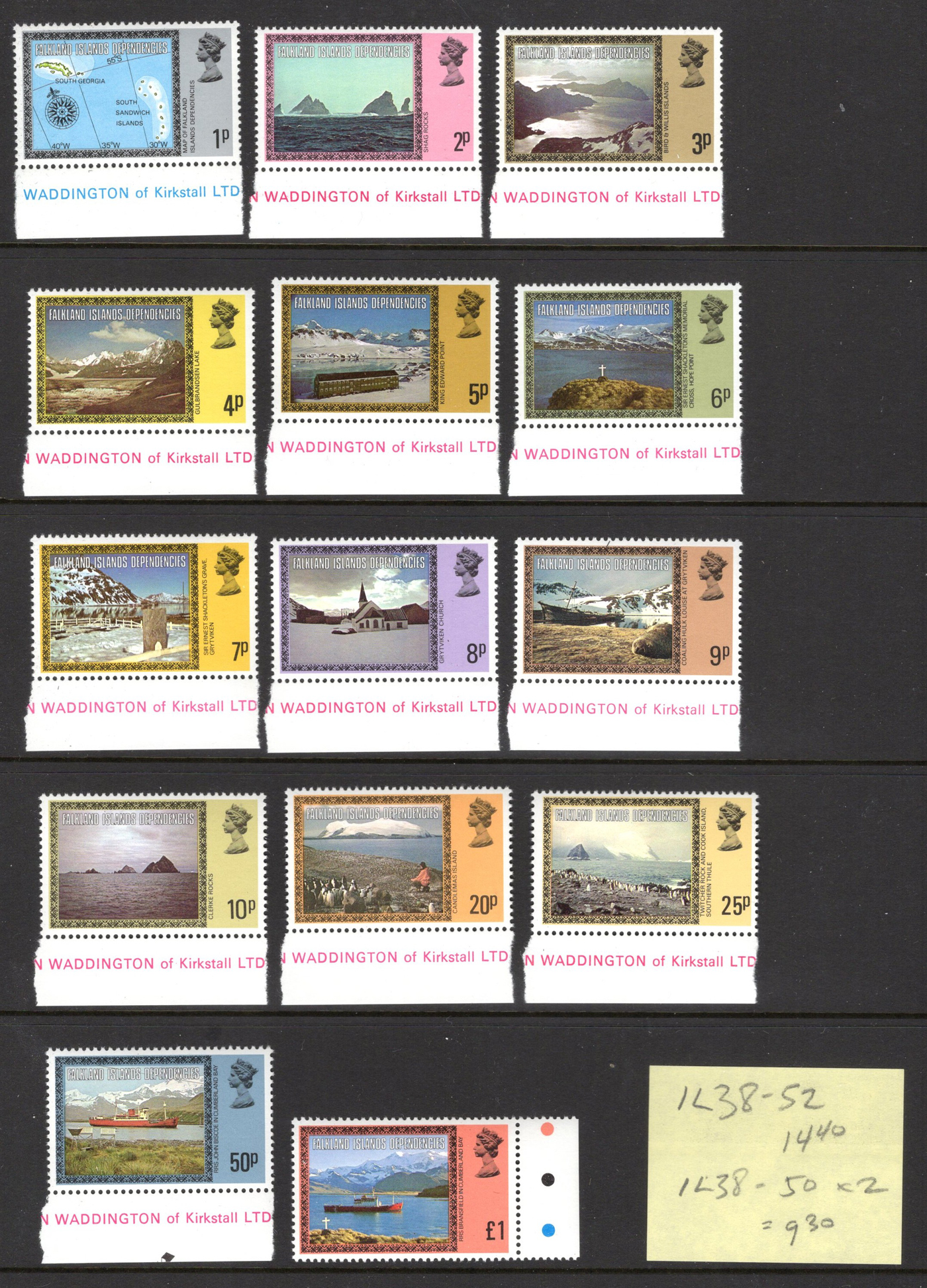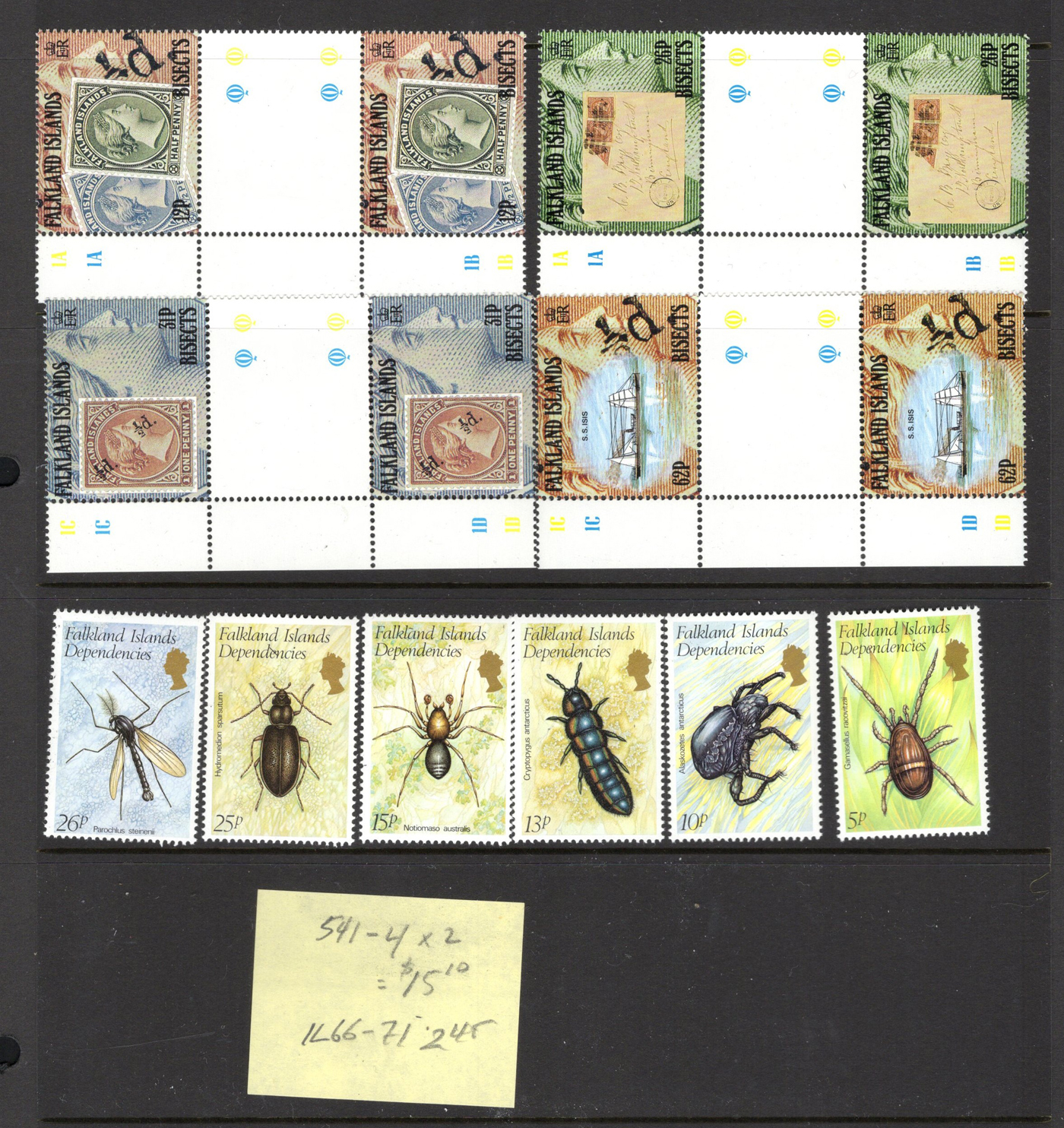 1552 og/nh   imageGroup of Mint Falkland Islands and Falkland Islands Dependencies Sets, Sheets, etc. with a mix of hinged and never hinged, Falkland Islands includes #s 107-120 (missing #114), 122-123 (each in a sheet of 60). 128-142, 150-53, 180-80, 188-91, 192 (sheet of 60), 197-209, 223 (sheet of 25), 275 (pane with 8 strips), 378a, 695, 698, 701 (all three in sheets of 50 with gutter pairs, etc.), 924-929 (each value in a gutter pane of 20), total up to here is $1,139. Falkland Islands Dependencies # 1L1-1L8 (in blocks of four) followed by 15 stock pages of FI and FID with a good run of issues (singles, gutter pairs from #1L38-1L75) and 260a to 544 plus B1 (x3) and 1LB1 (x3). Also South Georgia 1-15, and the "Separate Islands" (all in complete sets of corner blocks of four). Very fine throughout. (Scan 1) (Scan 2) (Scan 3) (Scan 4) (Scan 5) (Scan 6) (Scan 7) (Scan 8) (Scan 9) (Scan 10) (Scan 11) (Scan 12) (All Scans)