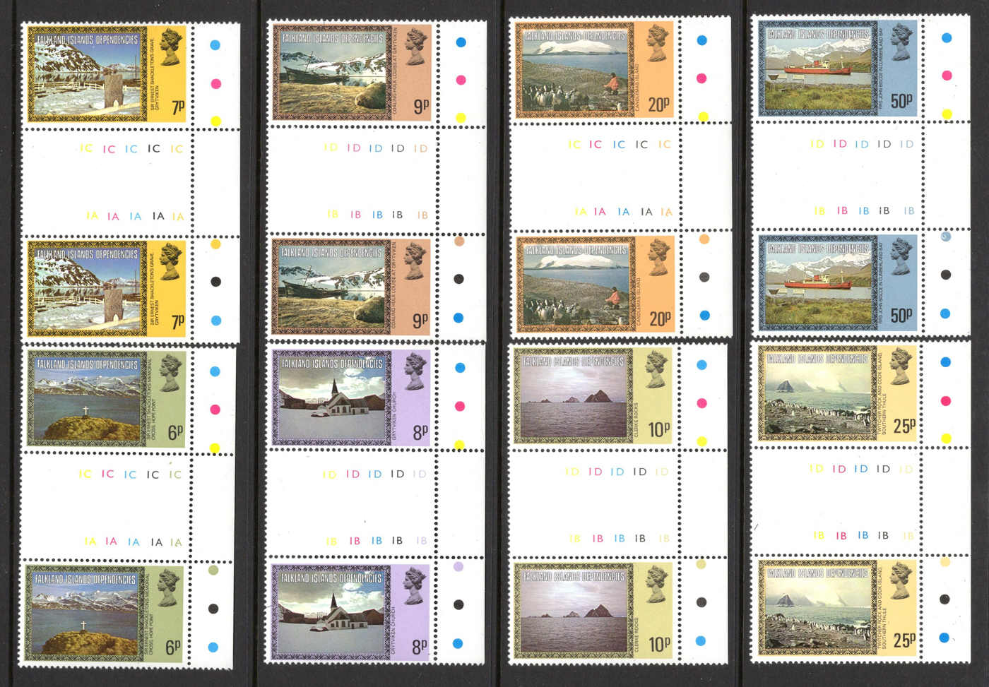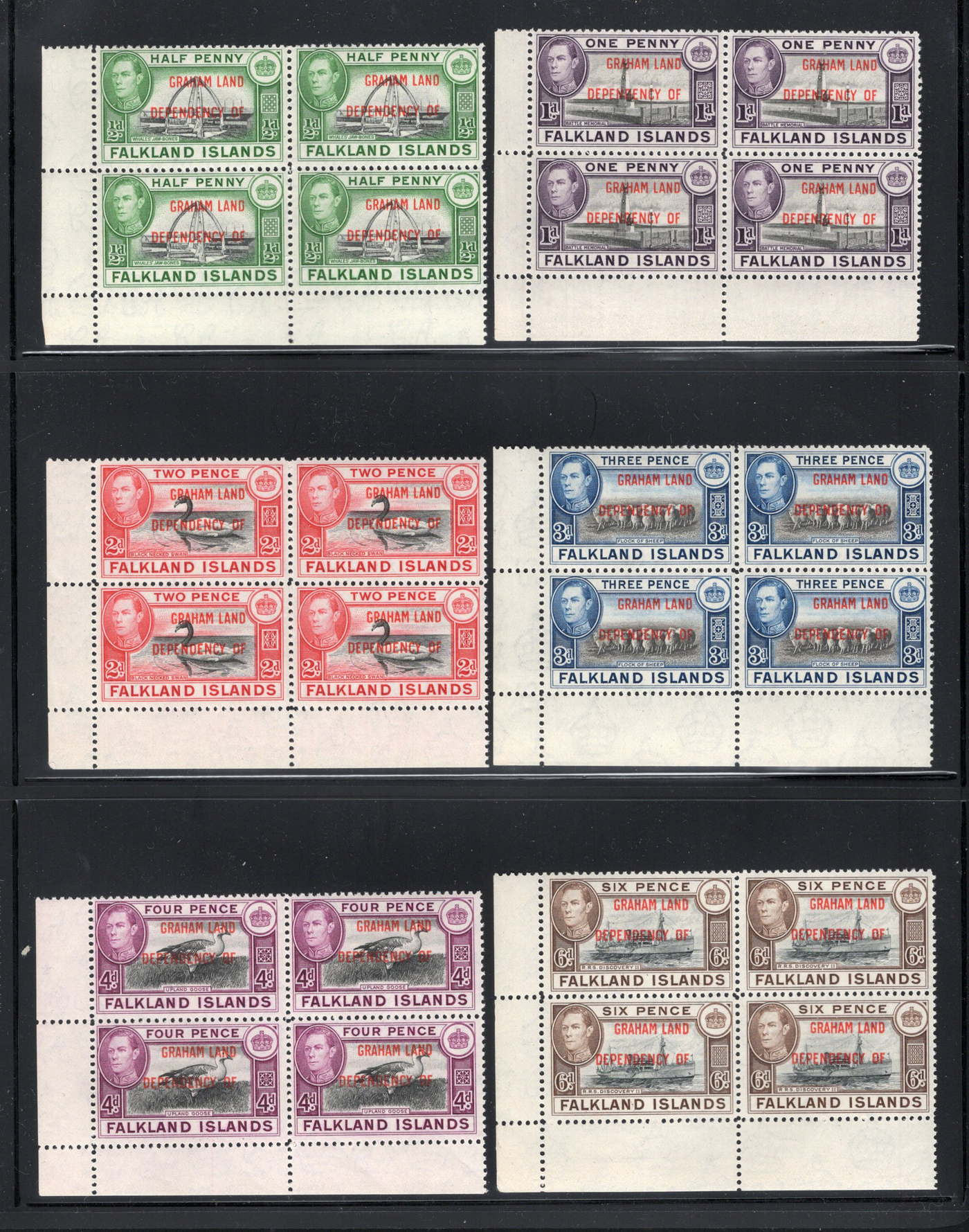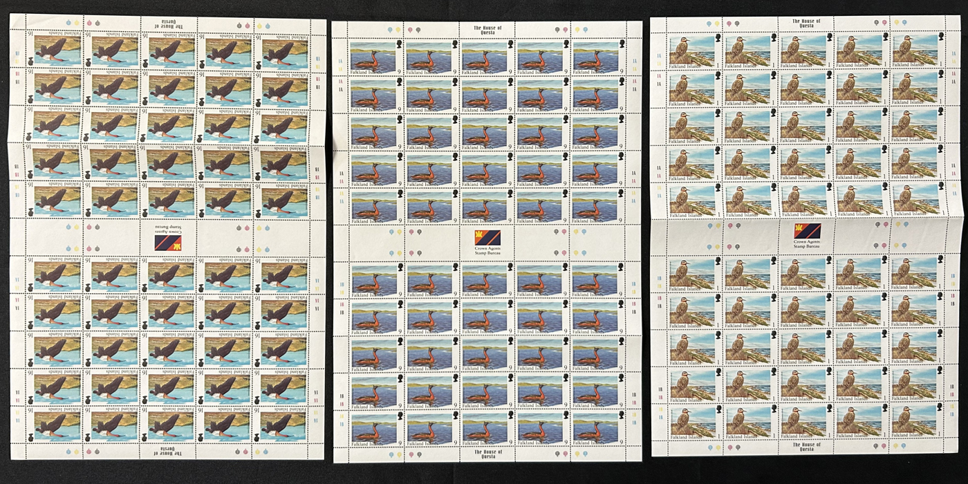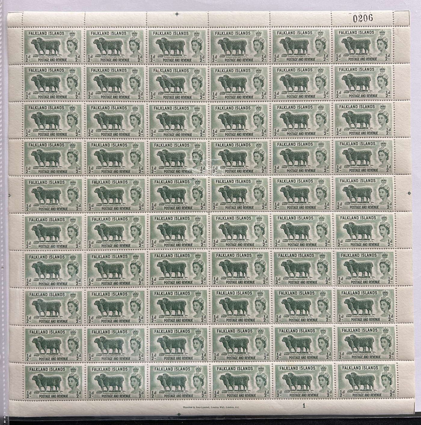 1552 og/nh   imageGroup of Mint Falkland Islands and Falkland Islands Dependencies Sets, Sheets, etc. with a mix of hinged and never hinged, Falkland Islands includes #s 107-120 (missing #114), 122-123 (each in a sheet of 60). 128-142, 150-53, 180-80, 188-91, 192 (sheet of 60), 197-209, 223 (sheet of 25), 275 (pane with 8 strips), 378a, 695, 698, 701 (all three in sheets of 50 with gutter pairs, etc.), 924-929 (each value in a gutter pane of 20), total up to here is $1,139. Falkland Islands Dependencies # 1L1-1L8 (in blocks of four) followed by 15 stock pages of FI and FID with a good run of issues (singles, gutter pairs from #1L38-1L75) and 260a to 544 plus B1 (x3) and 1LB1 (x3). Also South Georgia 1-15, and the "Separate Islands" (all in complete sets of corner blocks of four). Very fine throughout. (Scan 1) (Scan 2) (Scan 3) (Scan 4) (Scan 5) (Scan 6) (Scan 7) (Scan 8) (Scan 9) (Scan 10) (Scan 11) (Scan 12) (All Scans)