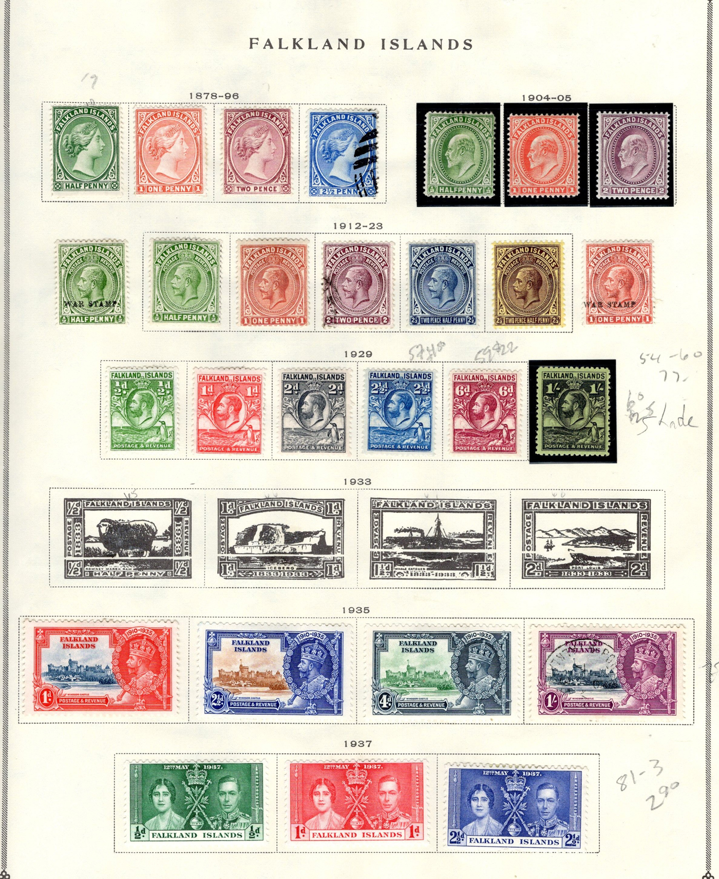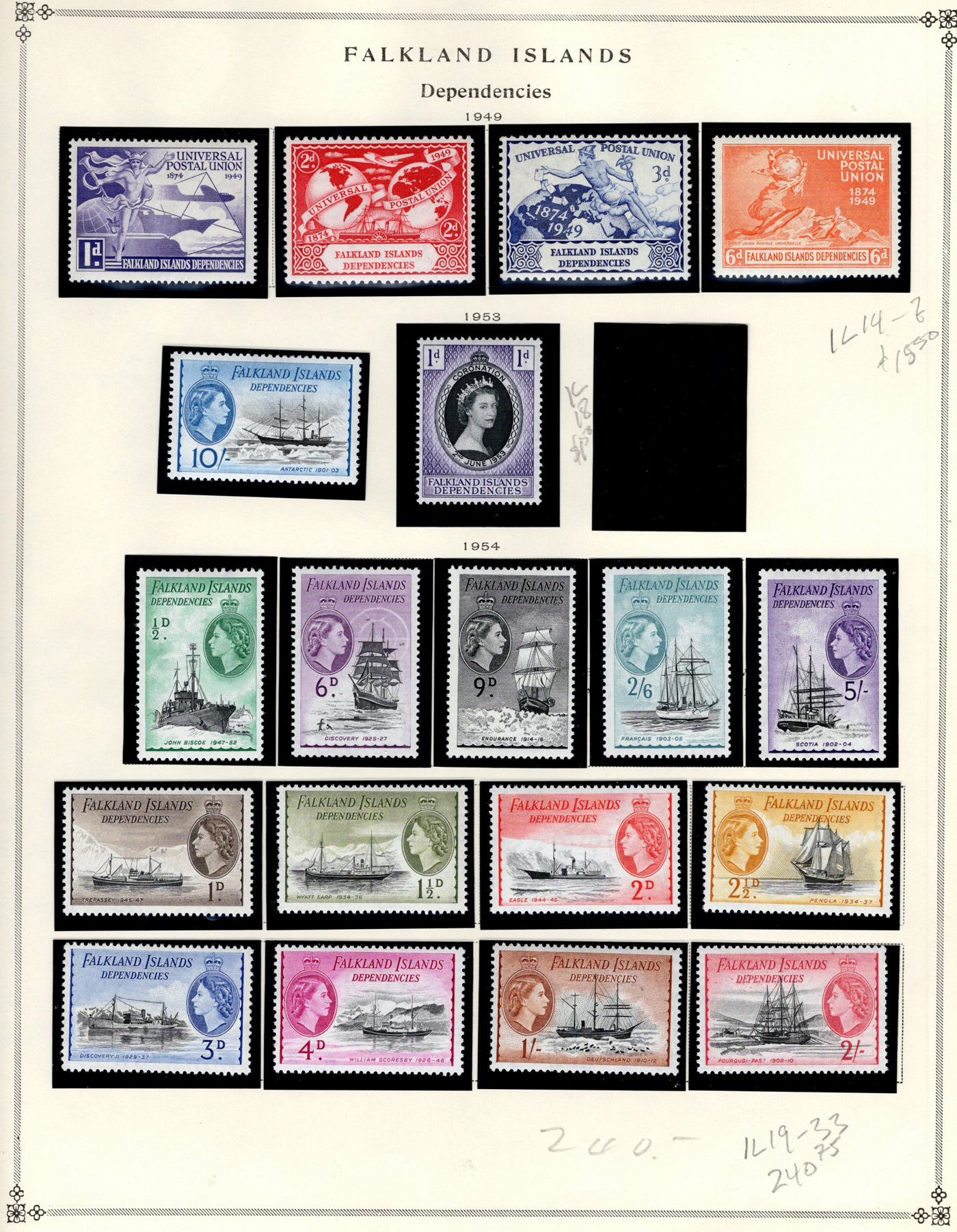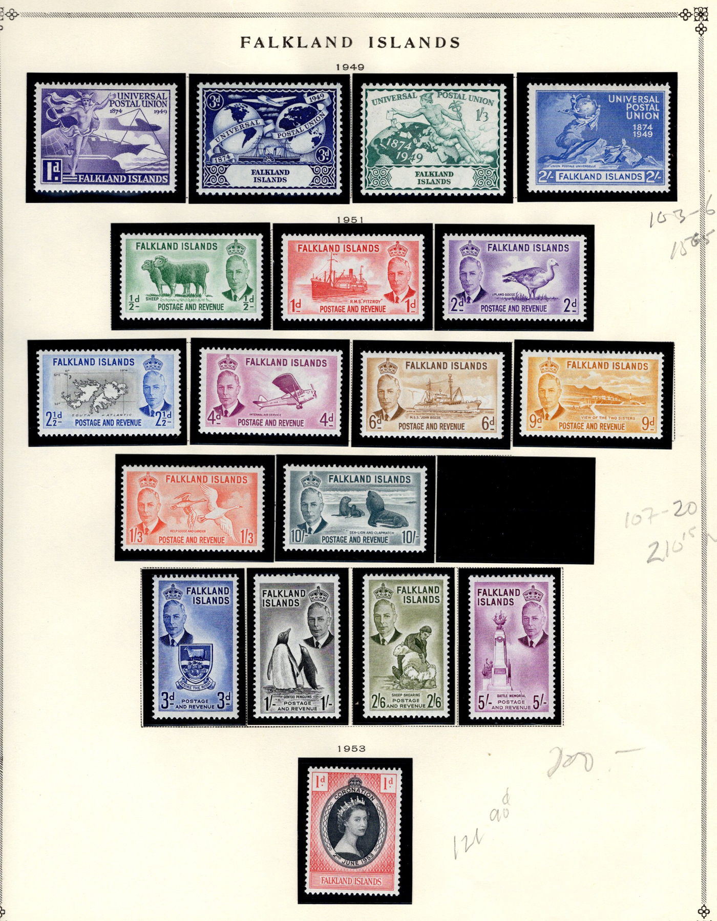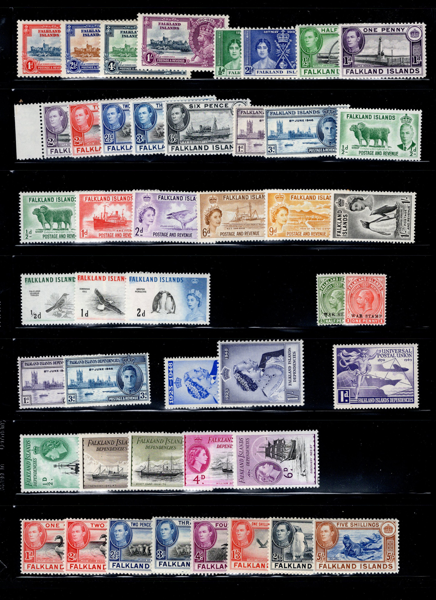 1553 og/nh   imageGroup of Mint Falkland Islands Collections, the first is a mostly mint collection of FI and FID from 1878 to 1965 with over 120 different stamps, mostly in NH sets and part sets (c.v. $935). Also a double-sided stock sheet containing FI and FID stamps (69 diff.) featuring all four sets of separate islands, FI #122-127, and other odds and ends (c.v. about $200) as well as a number of loose items such as a selection of KGV items such as FI #s 92-94, 120, 142, FID #1L33, etc. and some modern souvenir sheets. Overall very fine, with many NH items. (Scan 1) (Scan 2) (Scan 3) (Scan 4) (Scan 5) (Scan 6) (Scan 7) (Scan 8) (All Scans)