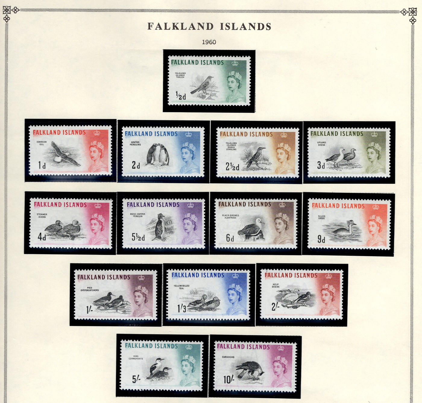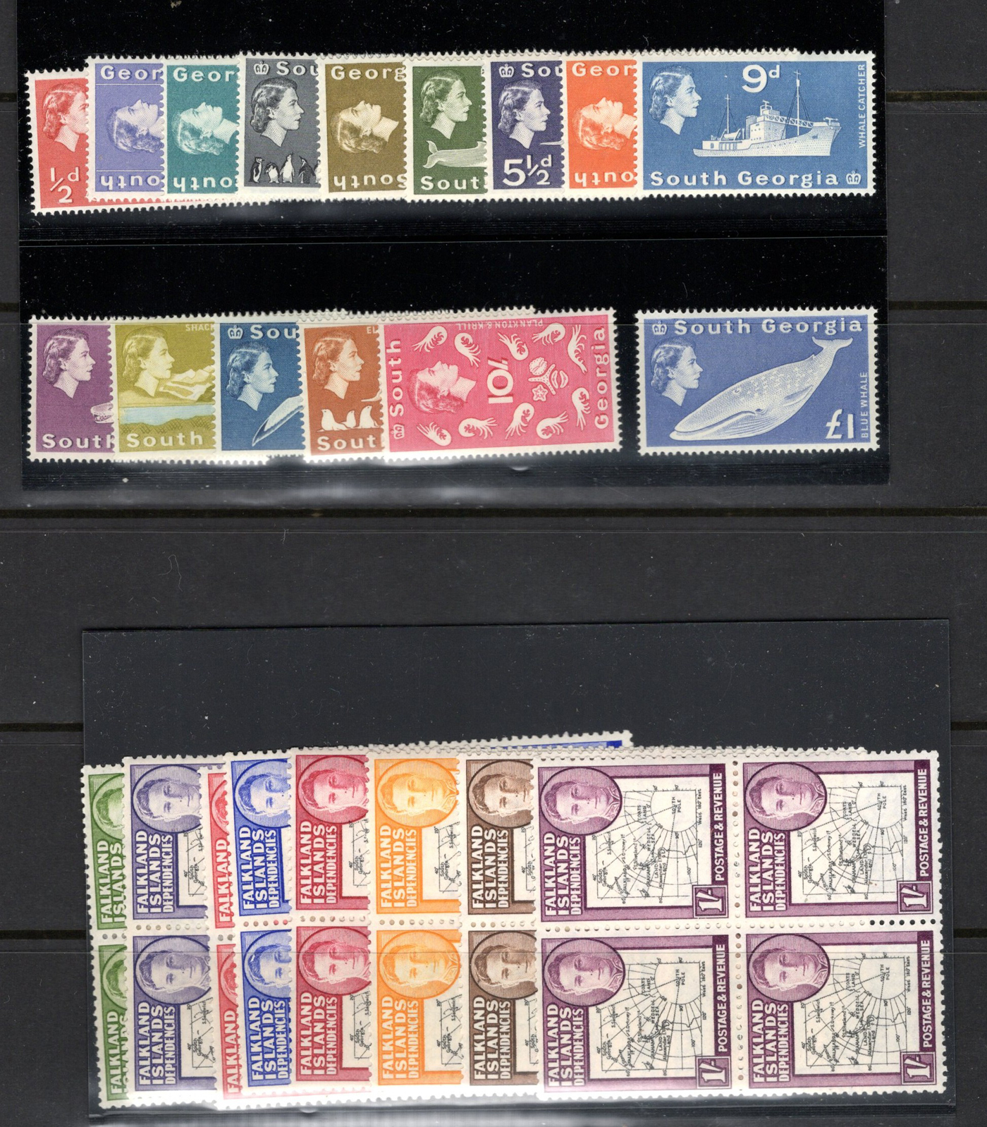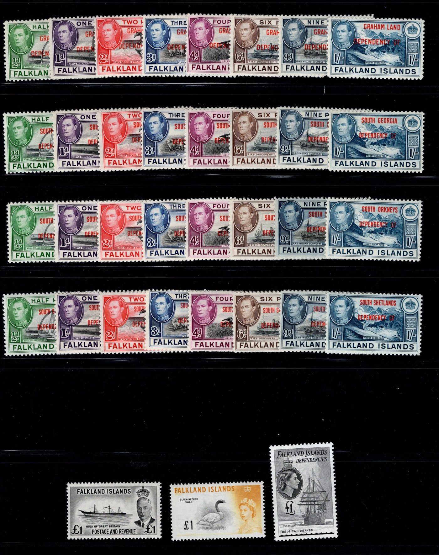 1553 og/nh   imageGroup of Mint Falkland Islands Collections, the first is a mostly mint collection of FI and FID from 1878 to 1965 with over 120 different stamps, mostly in NH sets and part sets (c.v. $935). Also a double-sided stock sheet containing FI and FID stamps (69 diff.) featuring all four sets of separate islands, FI #122-127, and other odds and ends (c.v. about $200) as well as a number of loose items such as a selection of KGV items such as FI #s 92-94, 120, 142, FID #1L33, etc. and some modern souvenir sheets. Overall very fine, with many NH items. (Scan 1) (Scan 2) (Scan 3) (Scan 4) (Scan 5) (Scan 6) (Scan 7) (Scan 8) (All Scans)