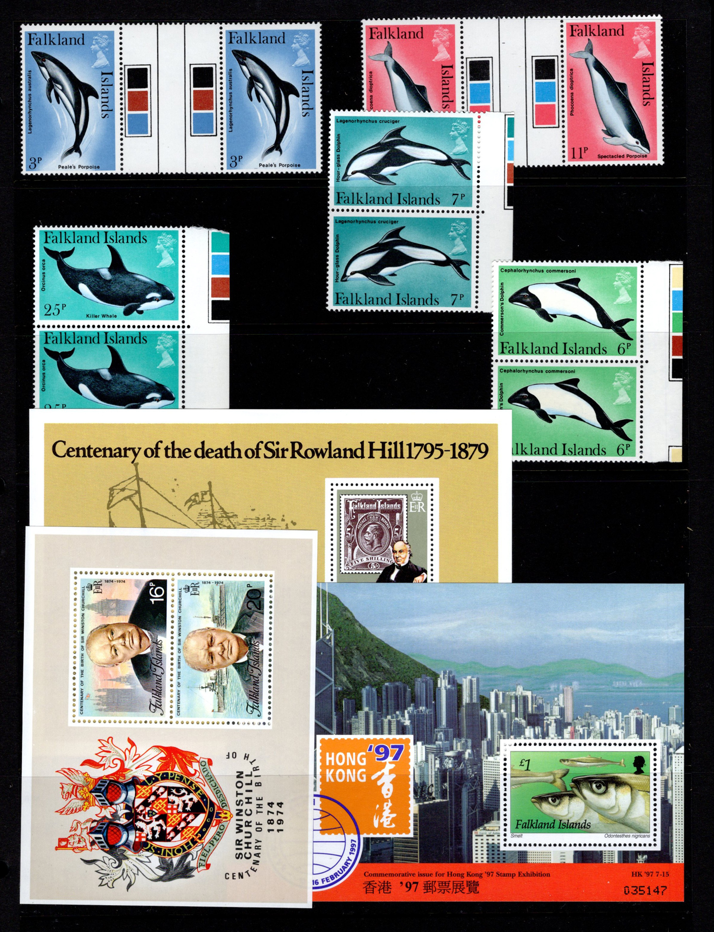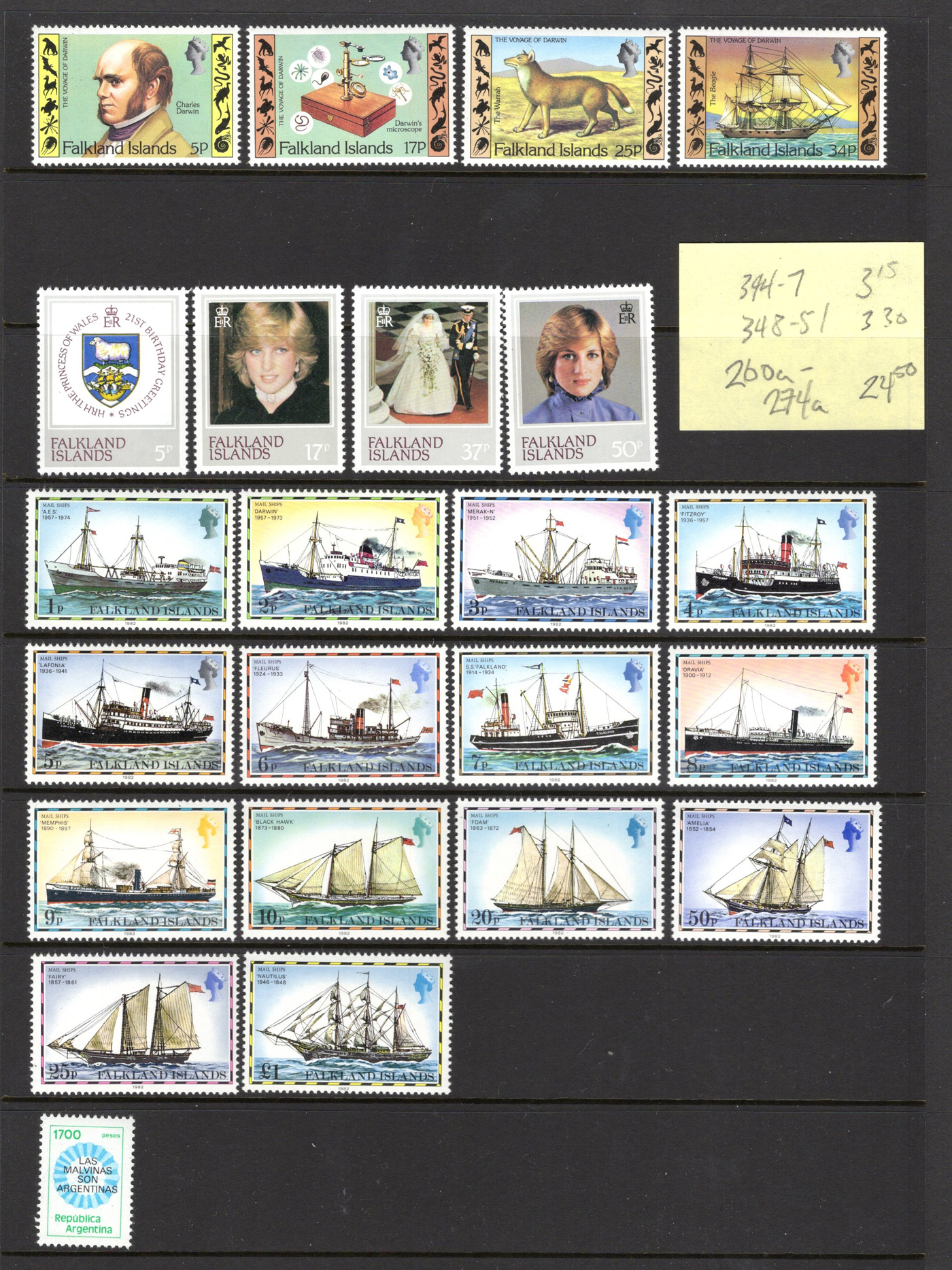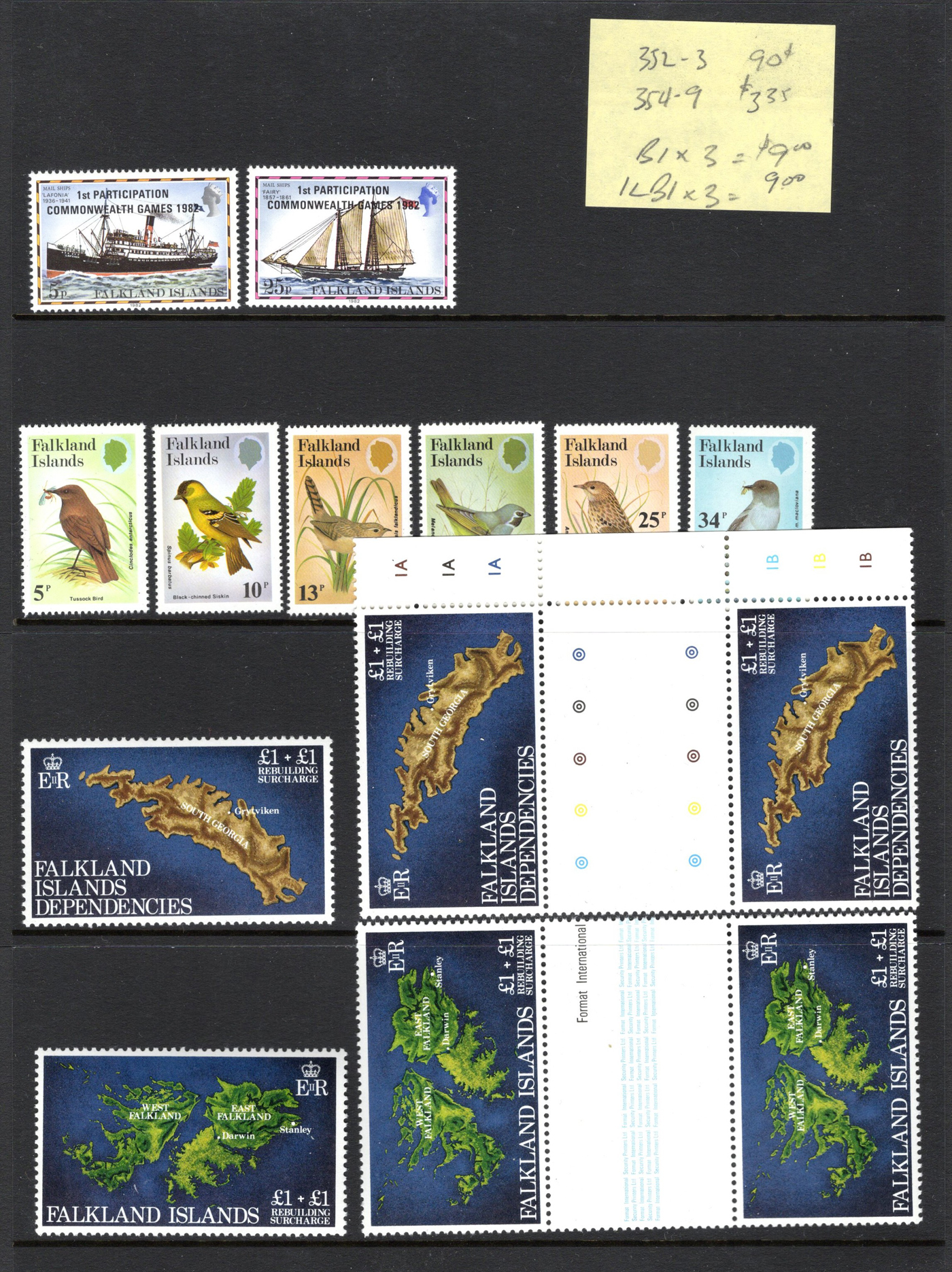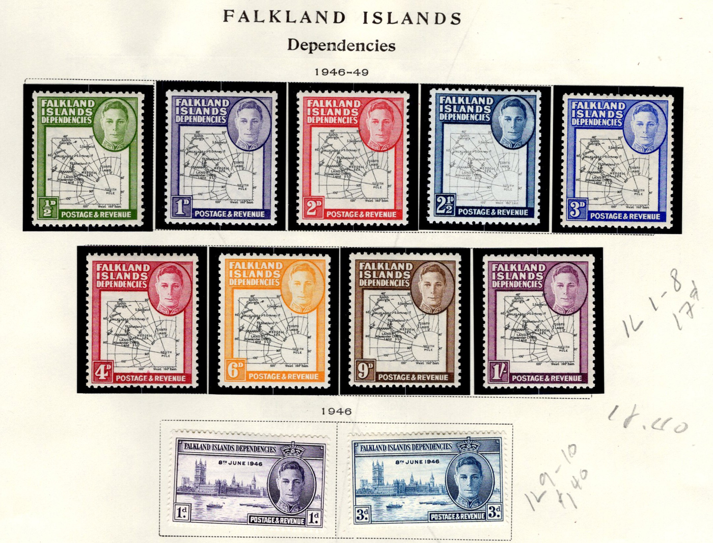 1553 og/nh   imageGroup of Mint Falkland Islands Collections, the first is a mostly mint collection of FI and FID from 1878 to 1965 with over 120 different stamps, mostly in NH sets and part sets (c.v. $935). Also a double-sided stock sheet containing FI and FID stamps (69 diff.) featuring all four sets of separate islands, FI #122-127, and other odds and ends (c.v. about $200) as well as a number of loose items such as a selection of KGV items such as FI #s 92-94, 120, 142, FID #1L33, etc. and some modern souvenir sheets. Overall very fine, with many NH items. (Scan 1) (Scan 2) (Scan 3) (Scan 4) (Scan 5) (Scan 6) (Scan 7) (Scan 8) (All Scans)