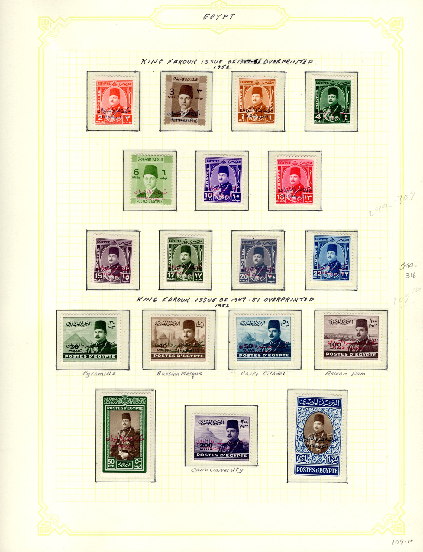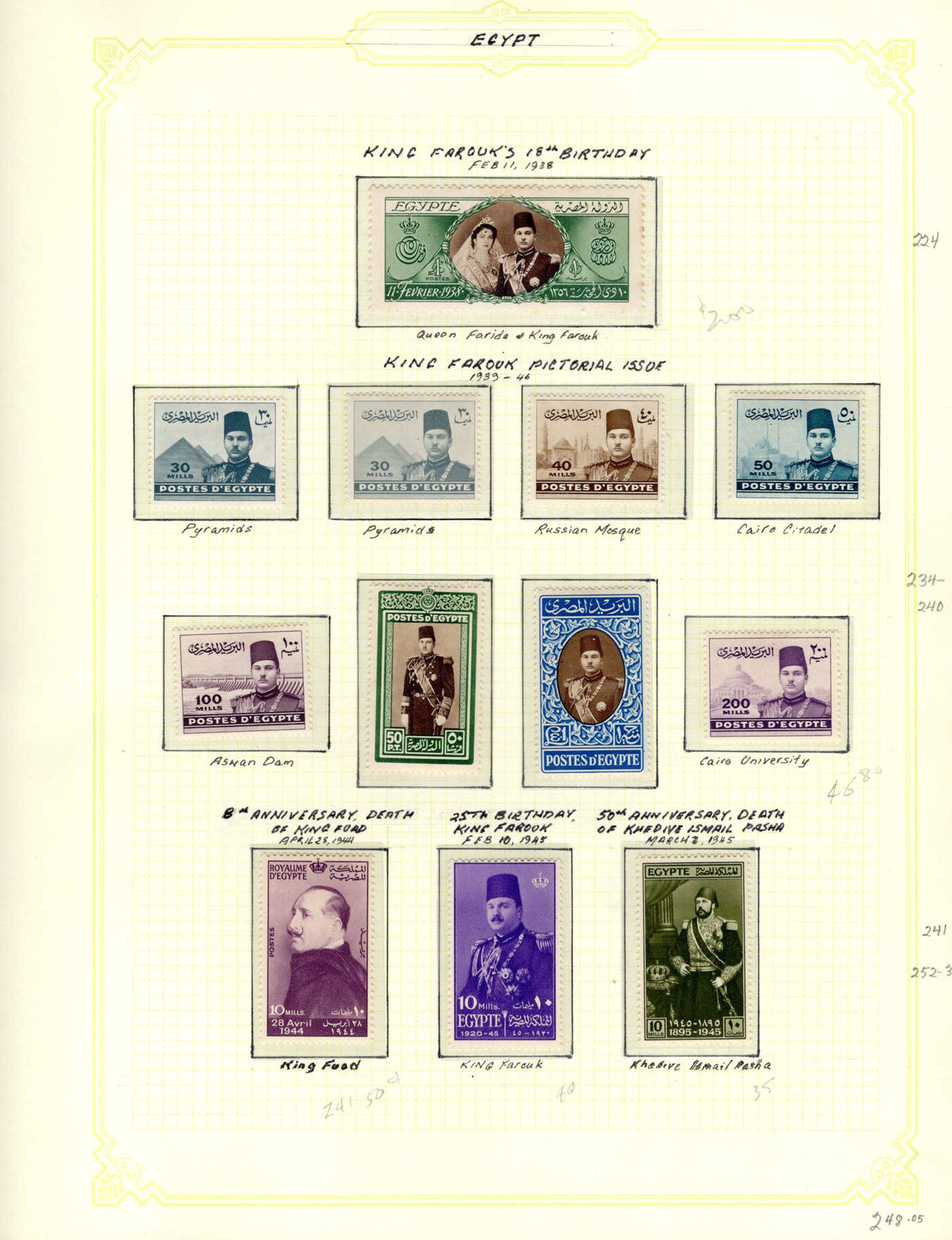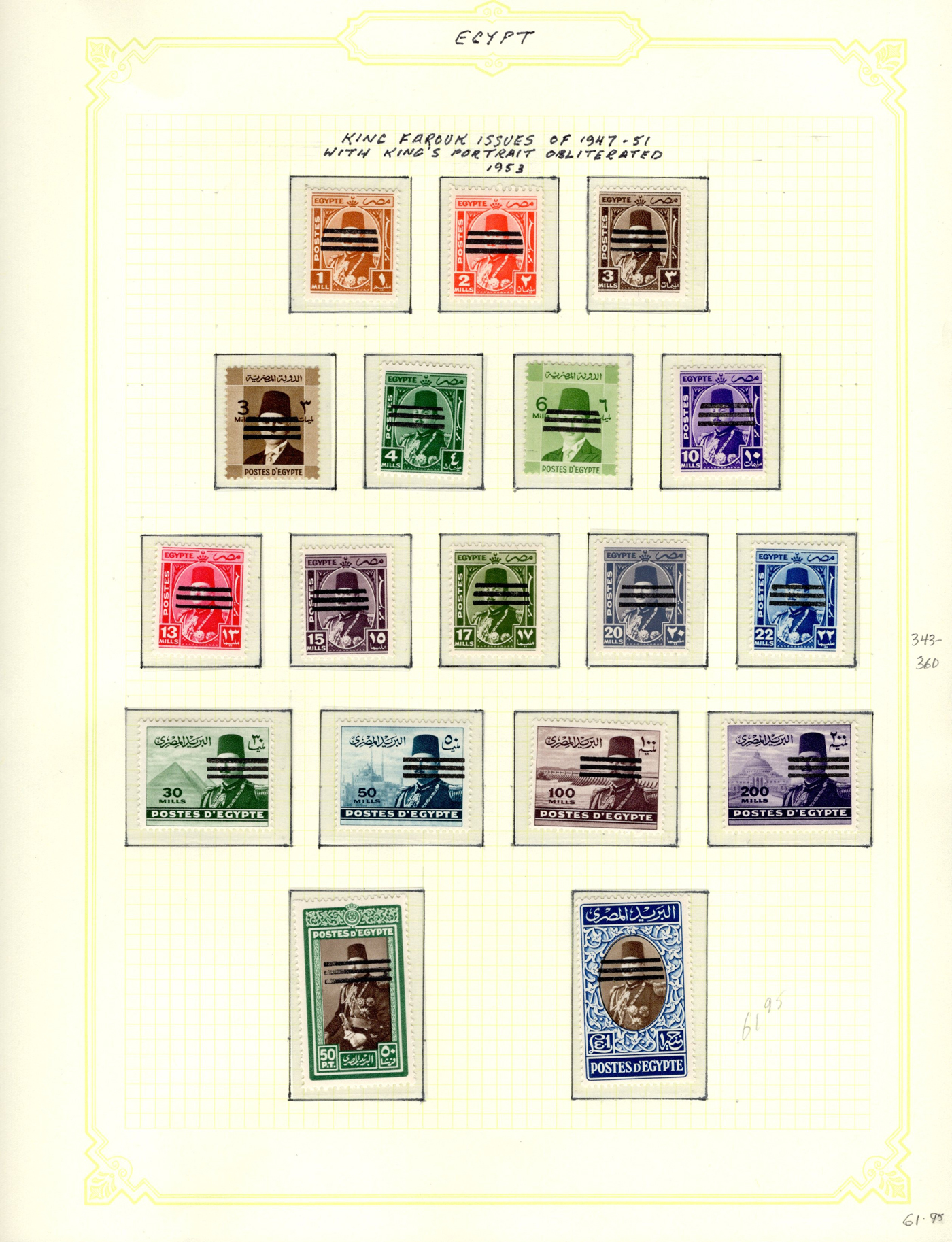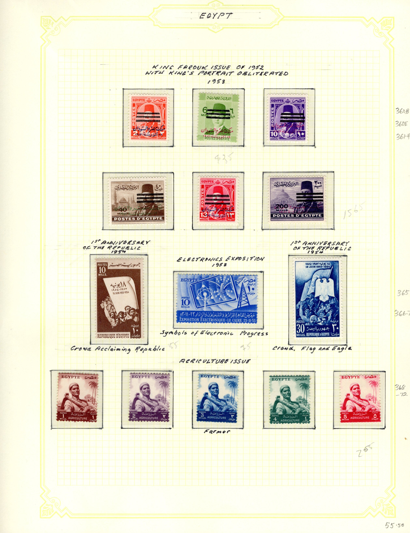 1551 og/nh 105/383, C5/C89 imageCollection of Mint Egypt, 1925-1955, neatly displayed on 28 S.G. quadrille pages, with the stamps in clear mounts. A quick look at the backs revealed a mix of hinged and never hinged throughout, and we note a high level of completion in range, including Semi-Postals and Airmails. Overall fine to very fine, the Scott catalogue given is from 2014. (Scan 1) (Scan 2) (Scan 3) (Scan 4) (Scan 5) (Scan 6) (Scan 7) (Scan 8) (Scan 9) (All Scans)