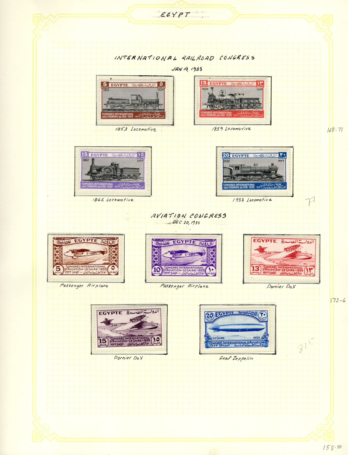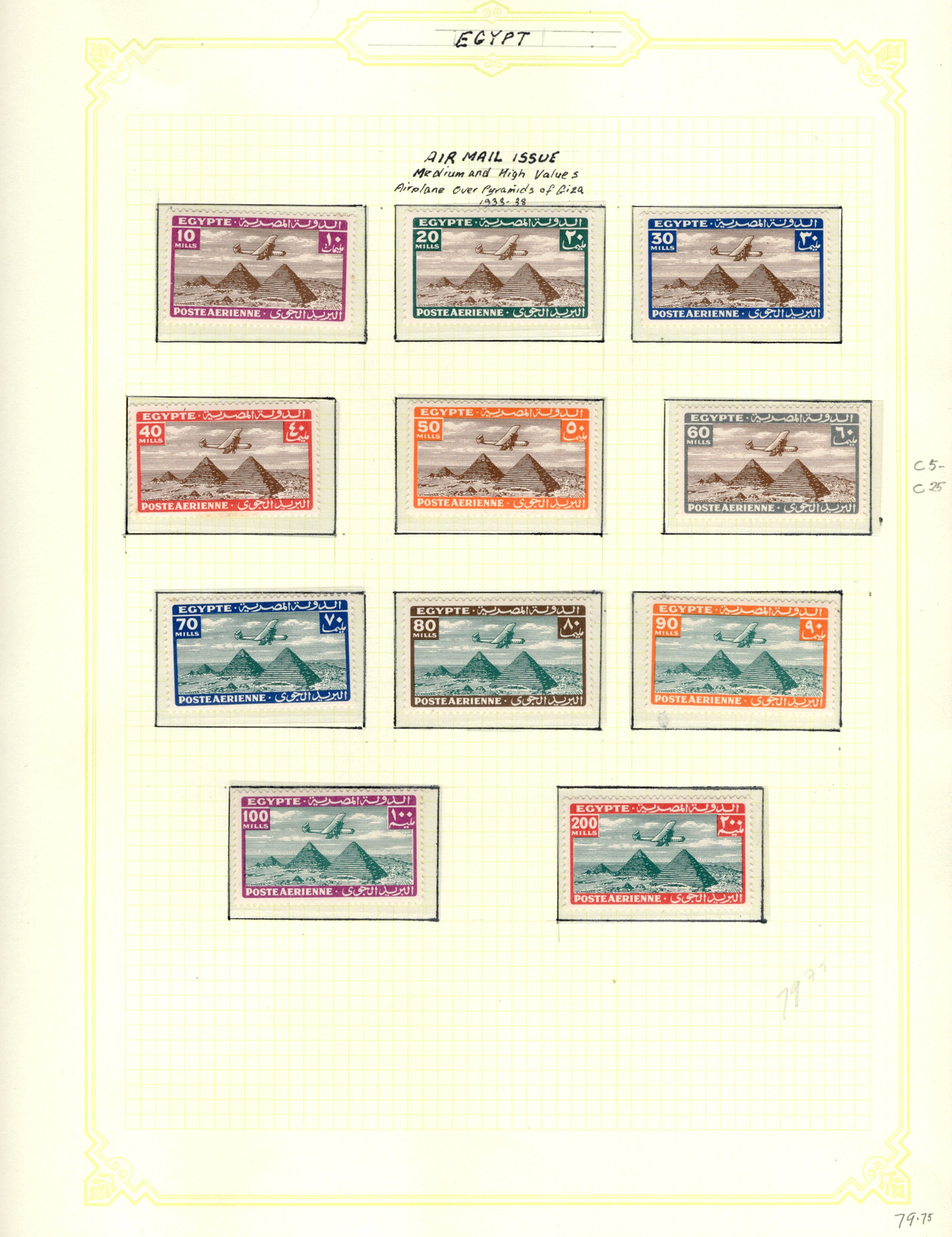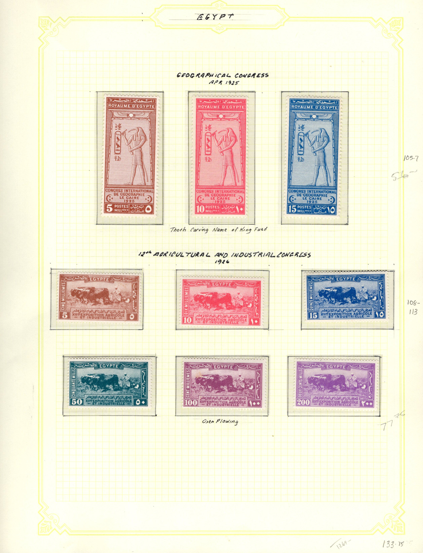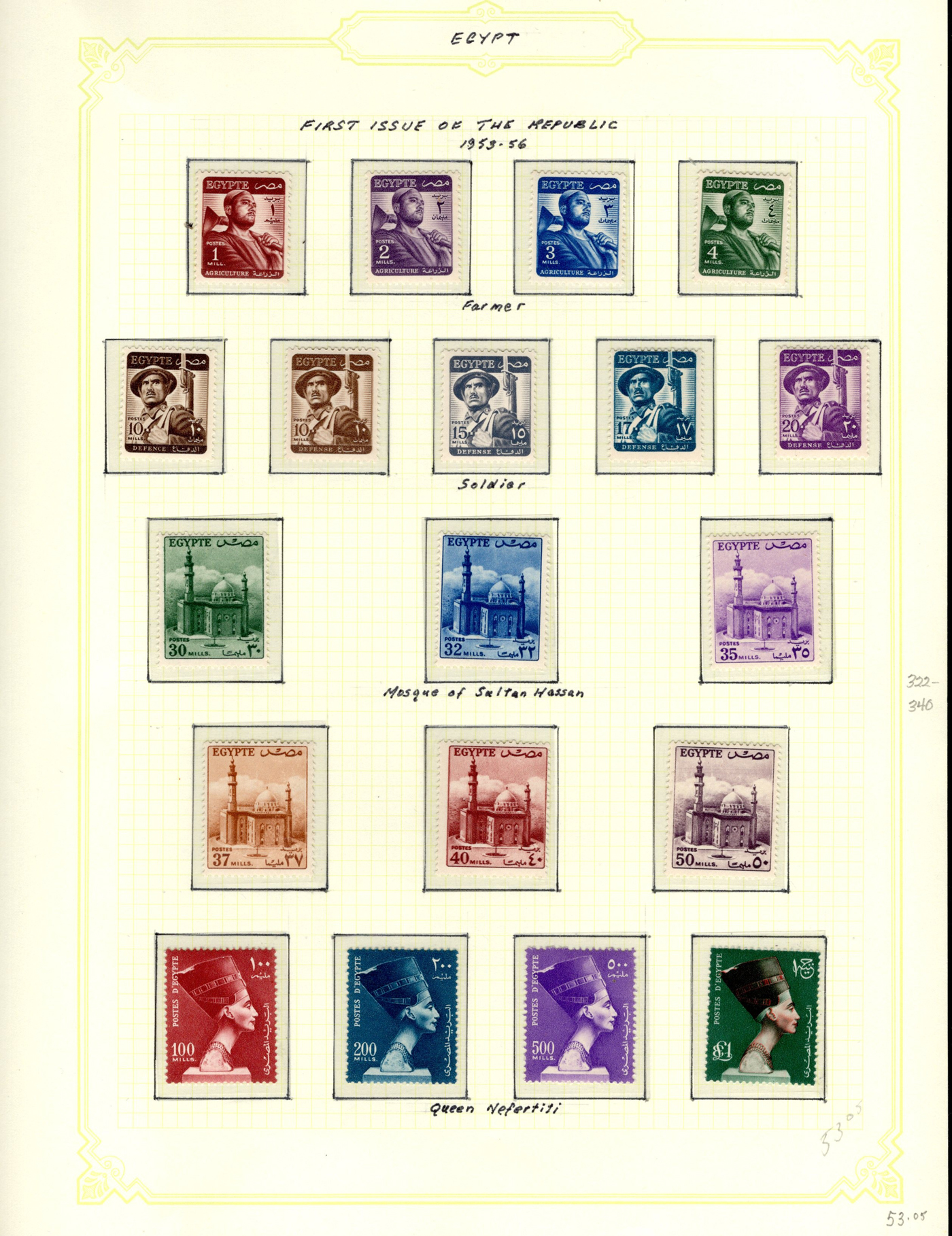 1551 og/nh 105/383, C5/C89 imageCollection of Mint Egypt, 1925-1955, neatly displayed on 28 S.G. quadrille pages, with the stamps in clear mounts. A quick look at the backs revealed a mix of hinged and never hinged throughout, and we note a high level of completion in range, including Semi-Postals and Airmails. Overall fine to very fine, the Scott catalogue given is from 2014. (Scan 1) (Scan 2) (Scan 3) (Scan 4) (Scan 5) (Scan 6) (Scan 7) (Scan 8) (Scan 9) (All Scans)