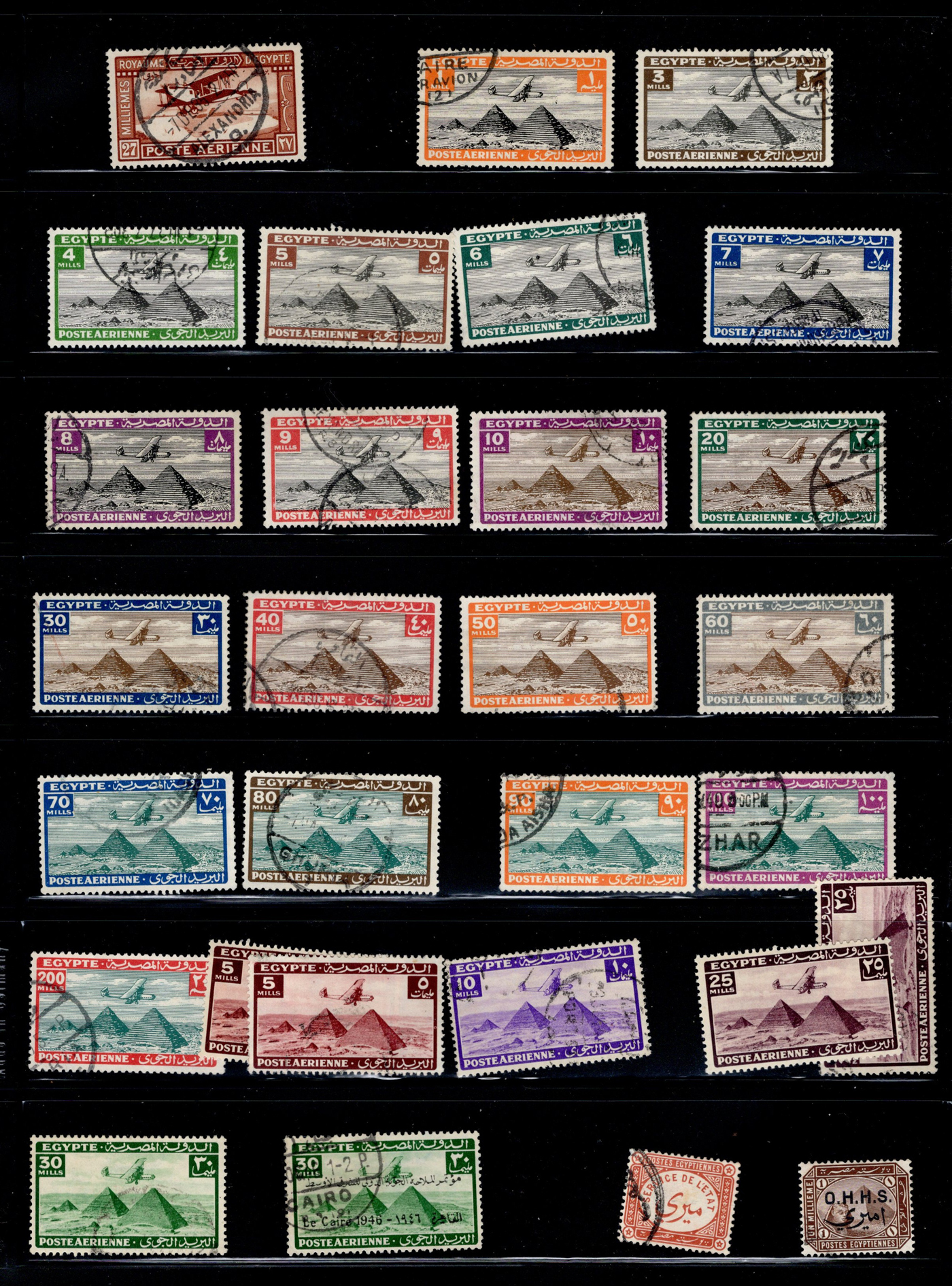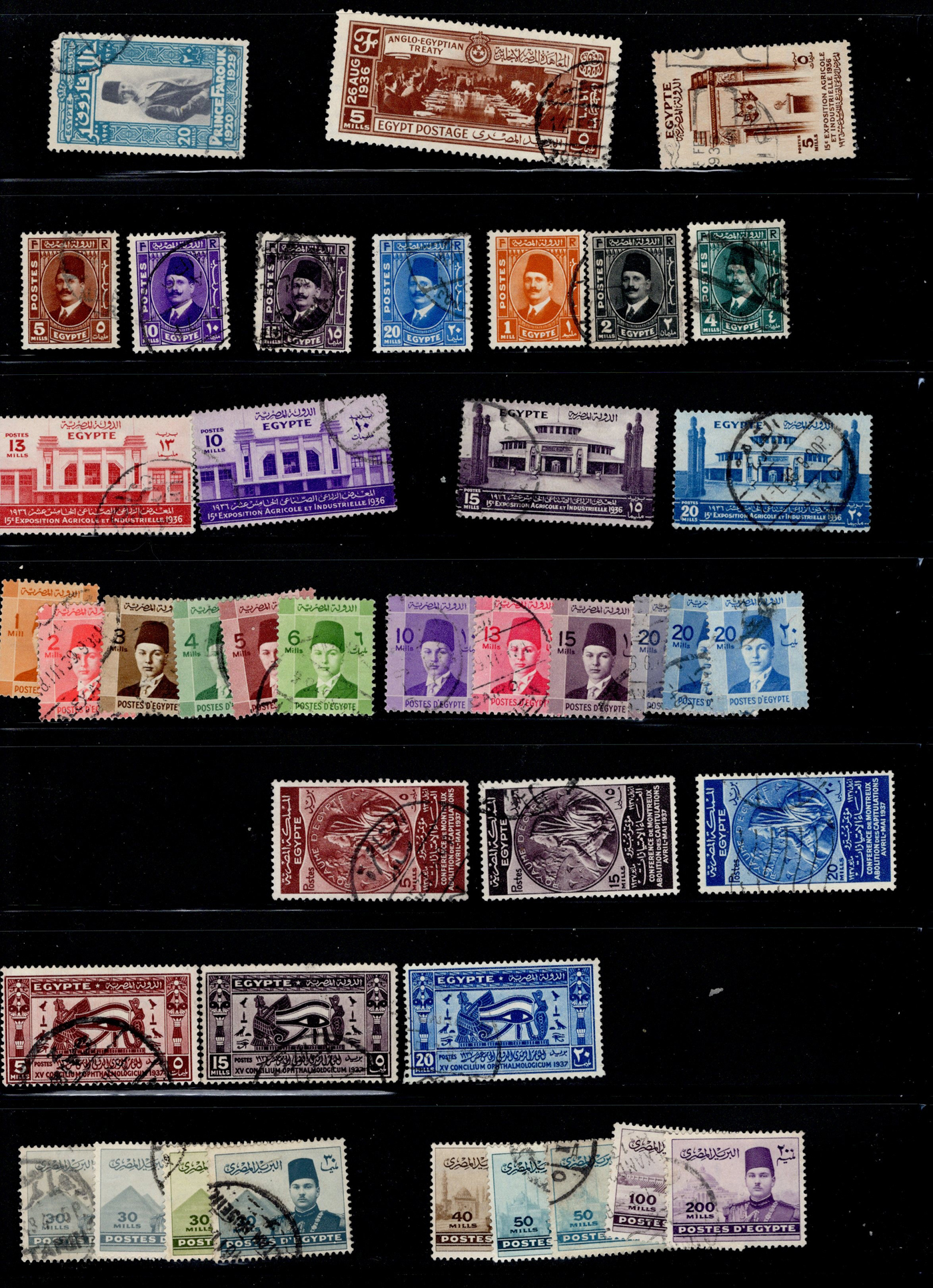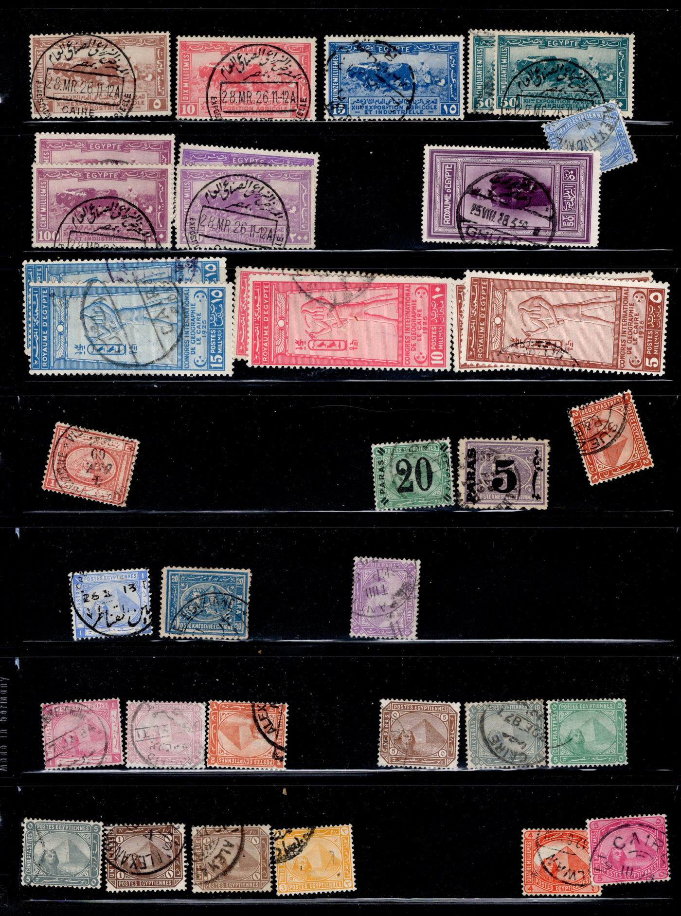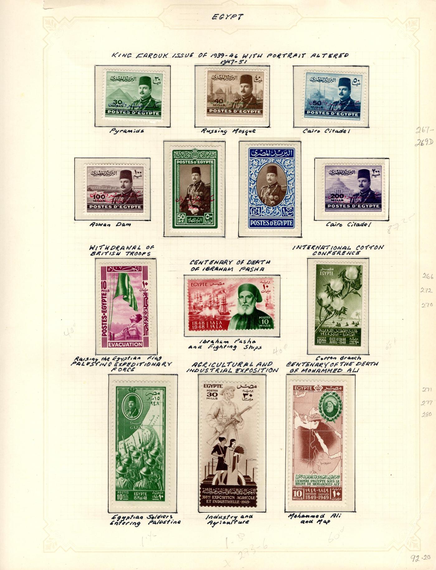 1550 O/og/nh   imageCollection / Accumulation of Mainly Used Egypt, to about 1960s, on one album page plus 16 stock pages, noting a wide assortment of issues (with duplication) including Dues, Airmail, British Forces in Egypt (13 stamps between #M1-M8), a few souvenir sheets, and more. Overall fine, see photos for a glimpse. (Scan 1) (Scan 2) (Scan 3) (Scan 4) (Scan 5) (Scan 6) (Scan 7) (All Scans)