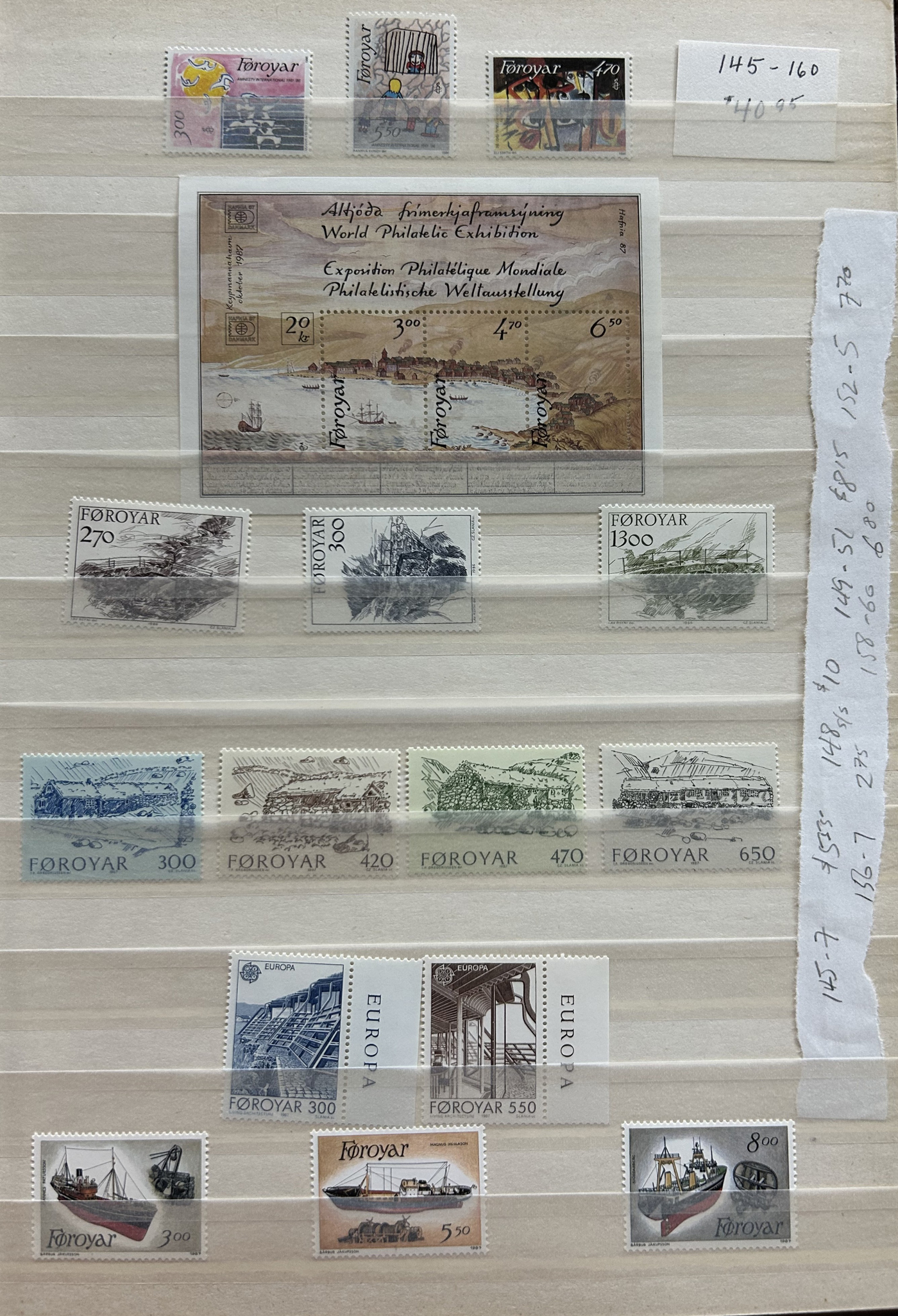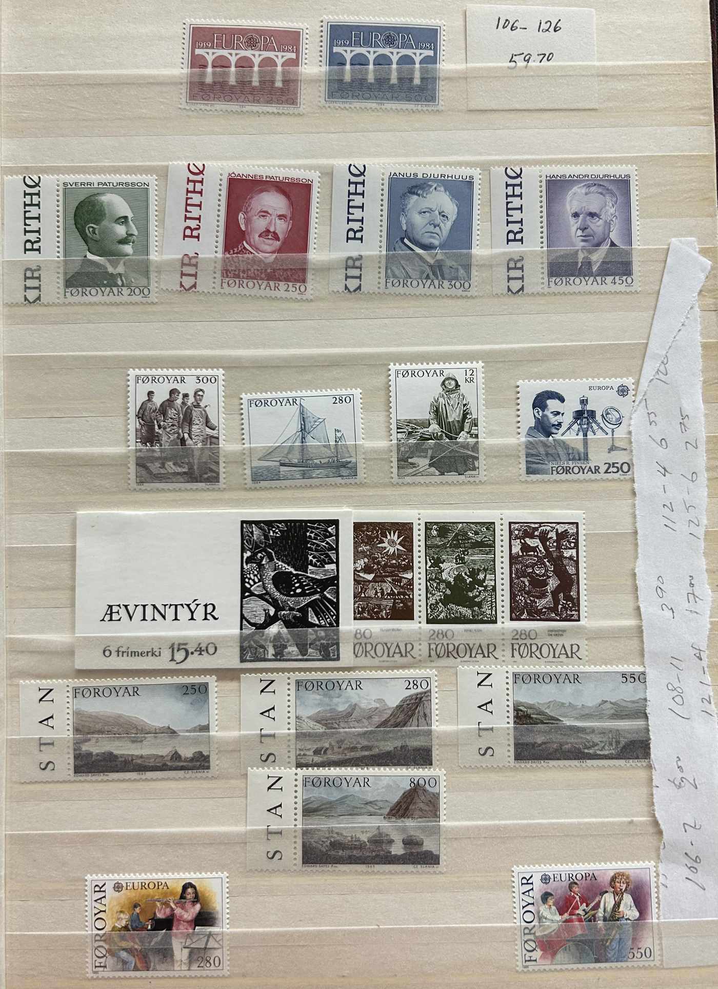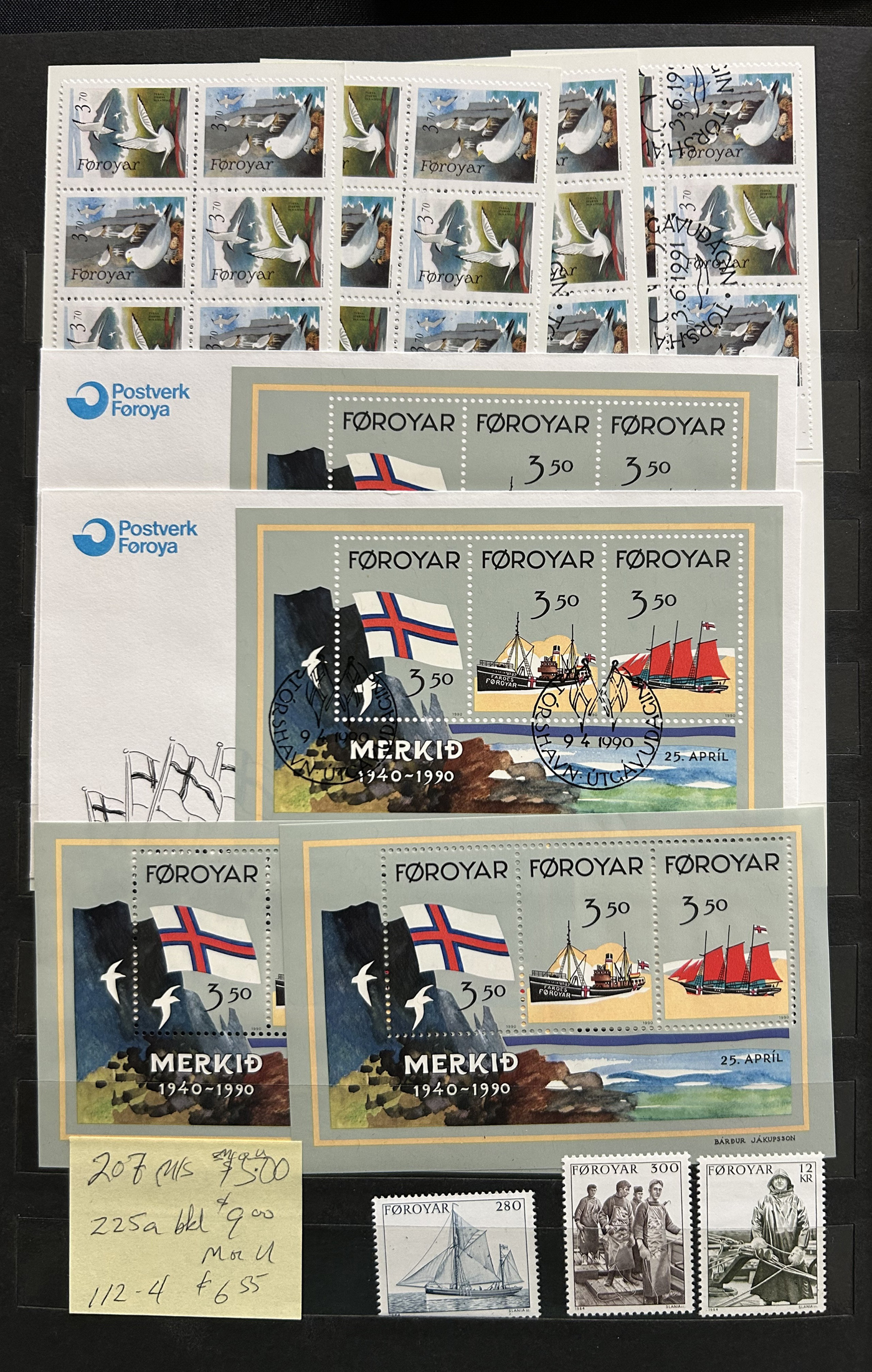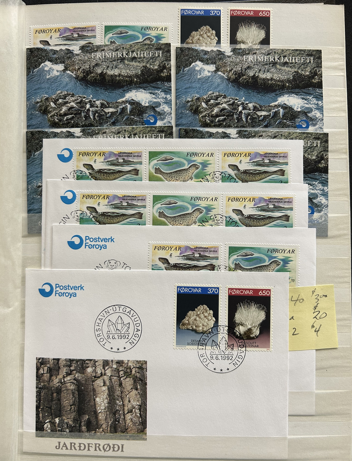 1554 nh   imageCollection of Faroe Island Covers and NH Stamps, 1970s to 1990s, filling a 15 page stockbook, plus 10 stock sheets with singles, sets, booklets, and covers, with duplication up to three in some cases (mostly of souvenir sheets and booklets). A second stockbook (24 pages) with 54 first day covers, many of which are alongside mint never hinged stamps, from 1975 to 1990 (this stockbook alone catalogued $1,350 in 2013). Mainly fresh mint never hinged and very fine. (Scan 1) (Scan 2) (Scan 3) (Scan 4) (Scan 5) (Scan 6) (Scan 7) (Scan 8) (Scan 9) (Scan 10) (All Scans)