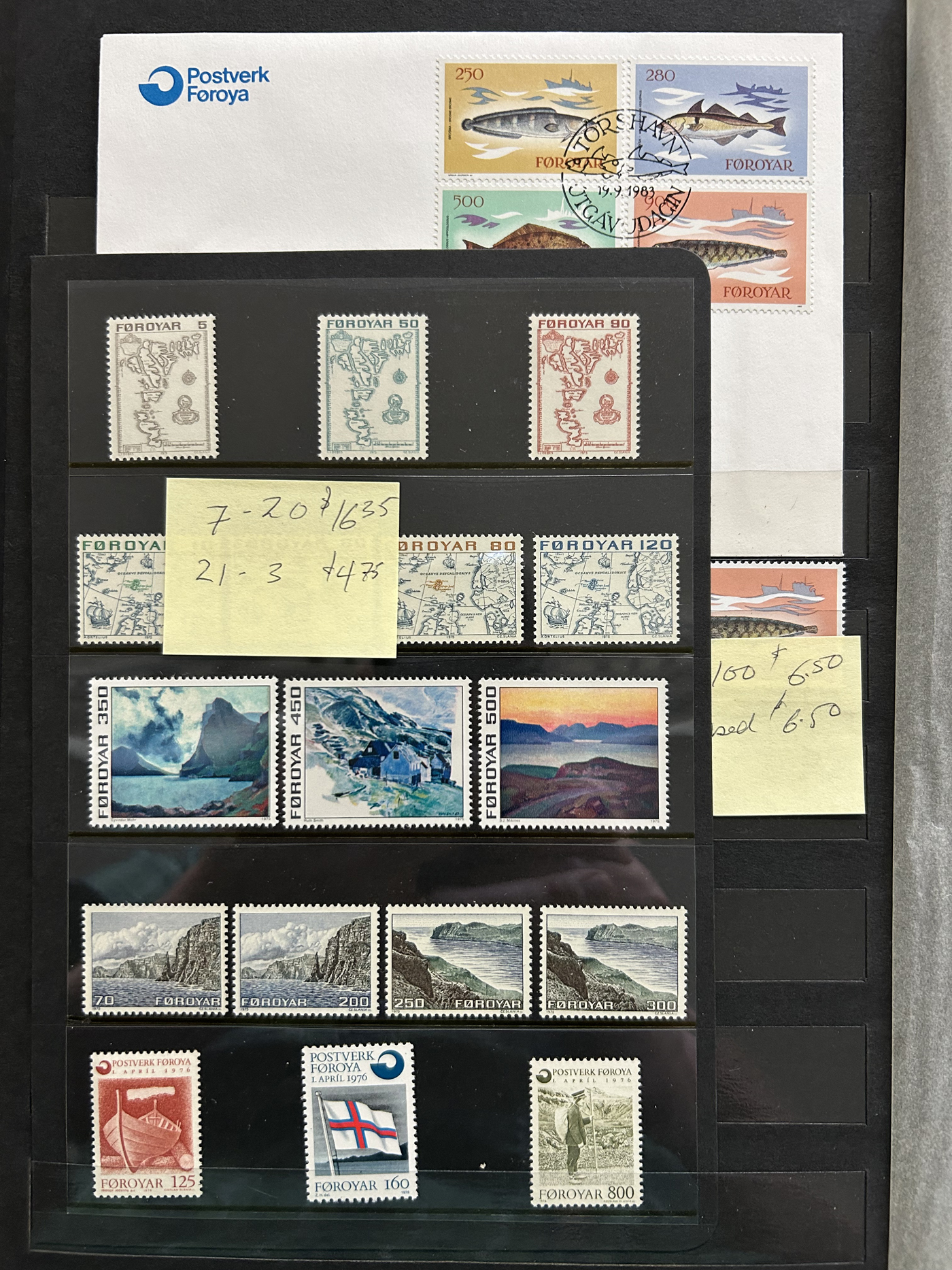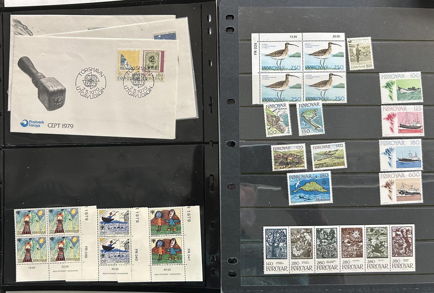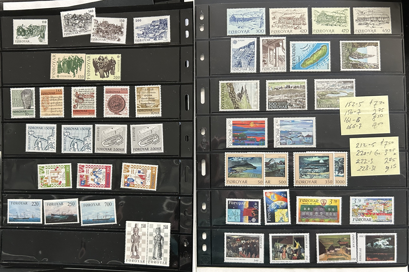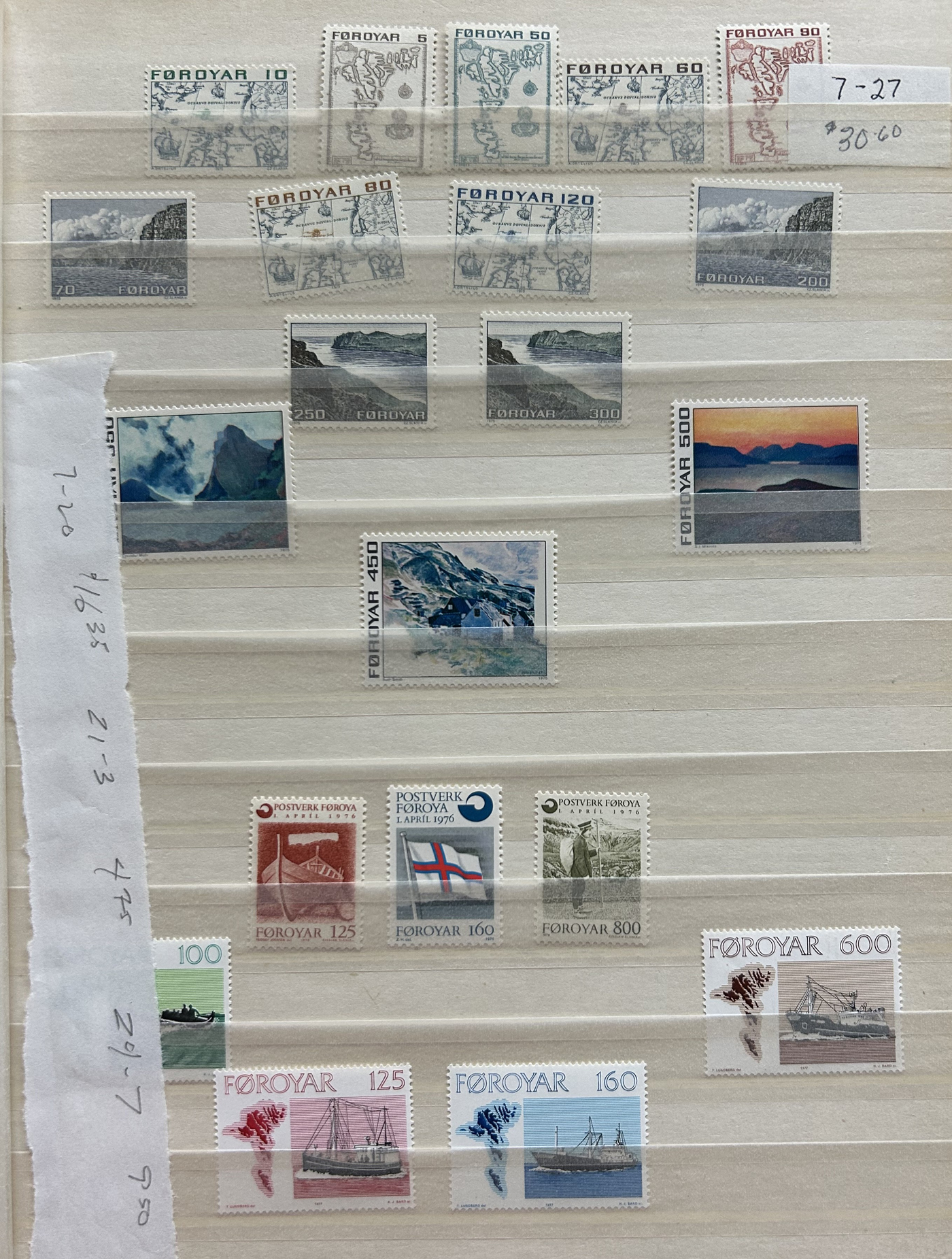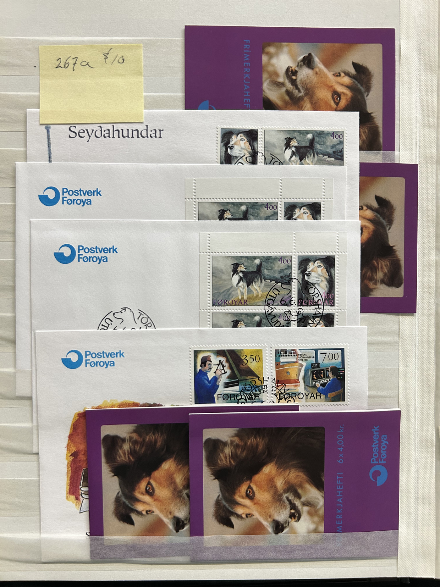 1554 nh   imageCollection of Faroe Island Covers and NH Stamps, 1970s to 1990s, filling a 15 page stockbook, plus 10 stock sheets with singles, sets, booklets, and covers, with duplication up to three in some cases (mostly of souvenir sheets and booklets). A second stockbook (24 pages) with 54 first day covers, many of which are alongside mint never hinged stamps, from 1975 to 1990 (this stockbook alone catalogued $1,350 in 2013). Mainly fresh mint never hinged and very fine. (Scan 1) (Scan 2) (Scan 3) (Scan 4) (Scan 5) (Scan 6) (Scan 7) (Scan 8) (Scan 9) (Scan 10) (All Scans)
