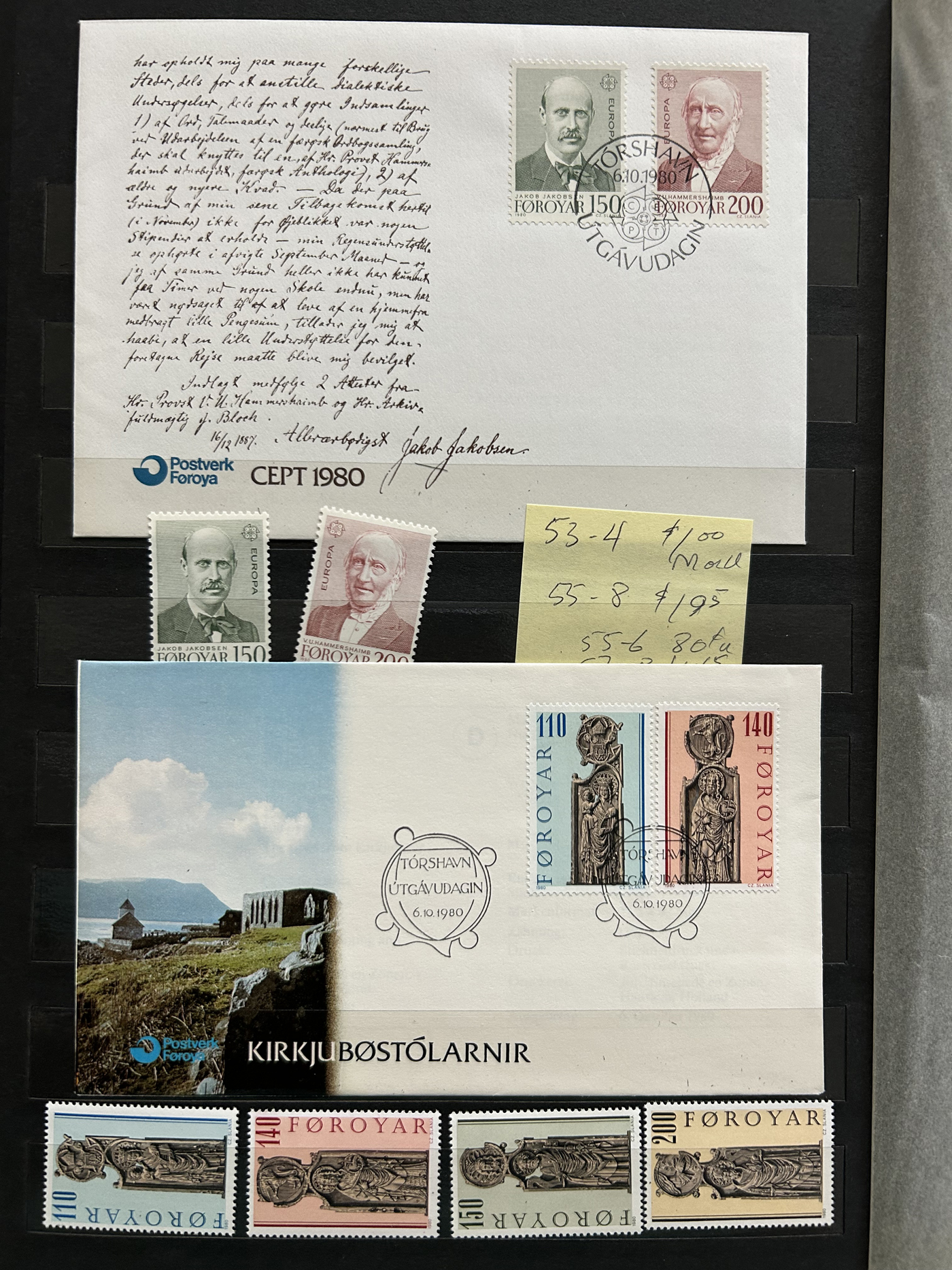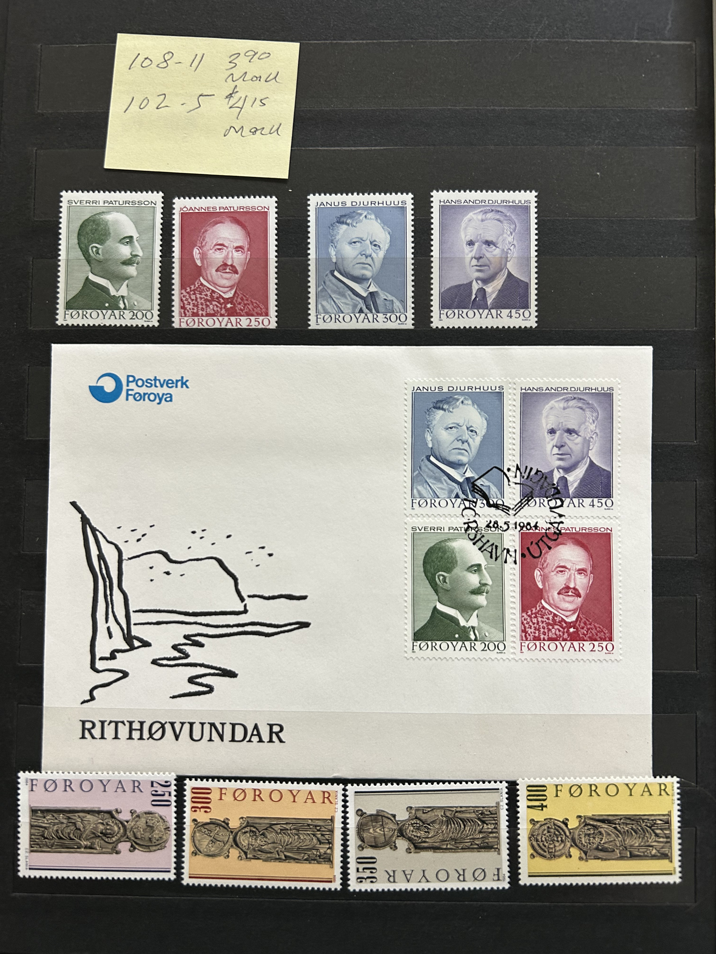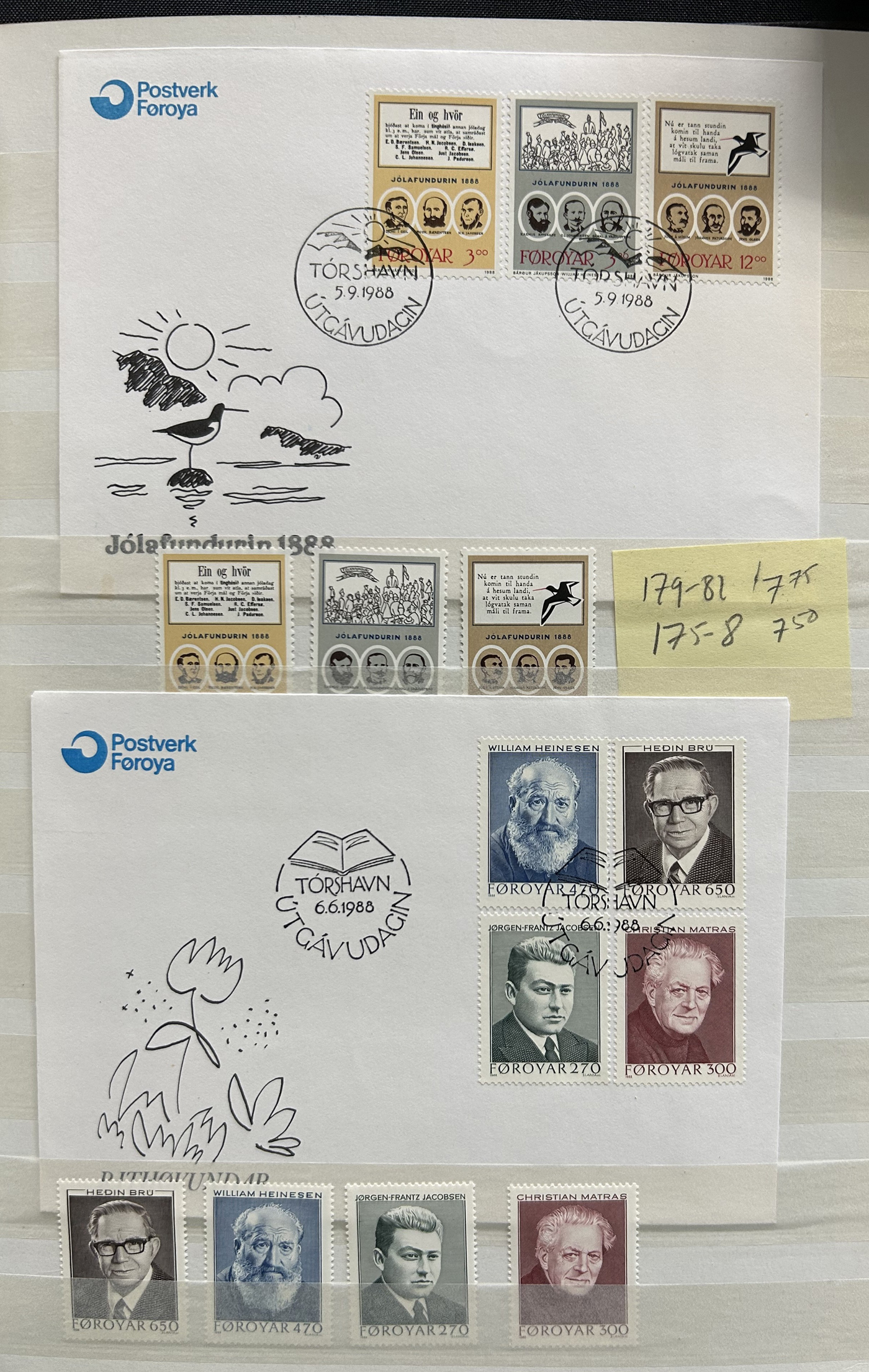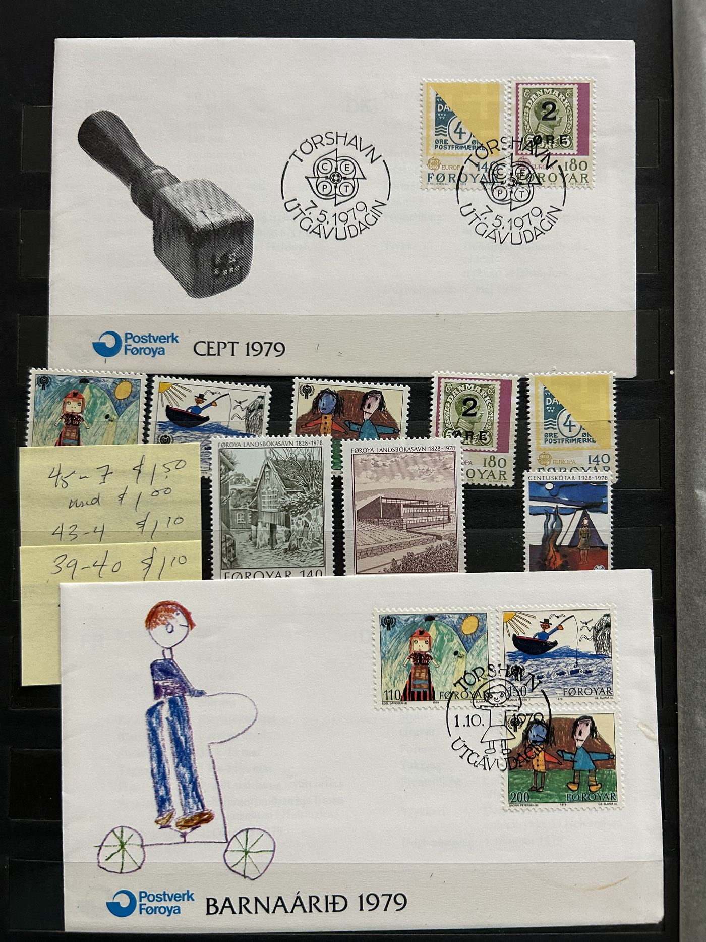 1554 nh   imageCollection of Faroe Island Covers and NH Stamps, 1970s to 1990s, filling a 15 page stockbook, plus 10 stock sheets with singles, sets, booklets, and covers, with duplication up to three in some cases (mostly of souvenir sheets and booklets). A second stockbook (24 pages) with 54 first day covers, many of which are alongside mint never hinged stamps, from 1975 to 1990 (this stockbook alone catalogued $1,350 in 2013). Mainly fresh mint never hinged and very fine. (Scan 1) (Scan 2) (Scan 3) (Scan 4) (Scan 5) (Scan 6) (Scan 7) (Scan 8) (Scan 9) (Scan 10) (All Scans)