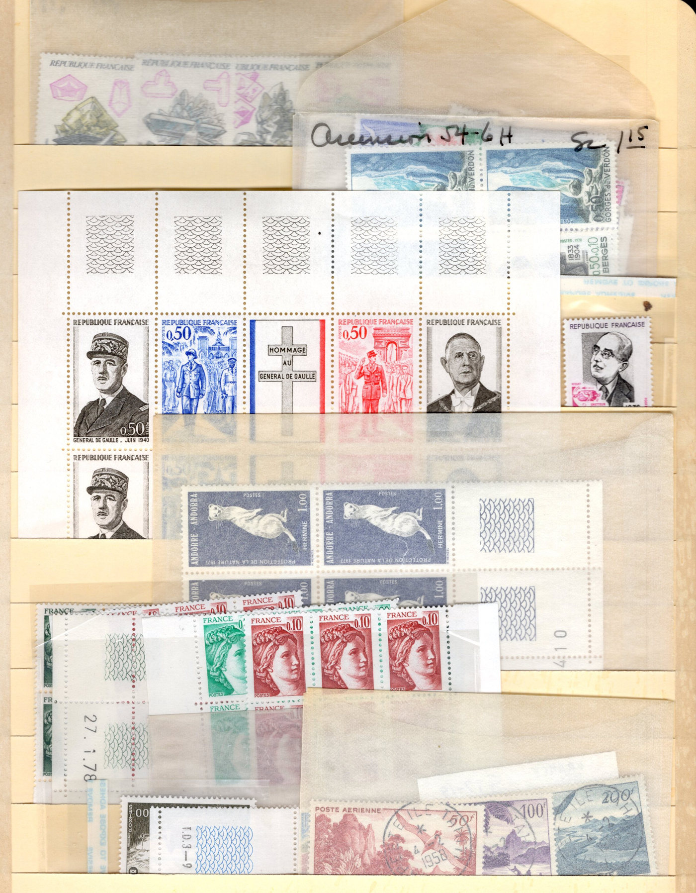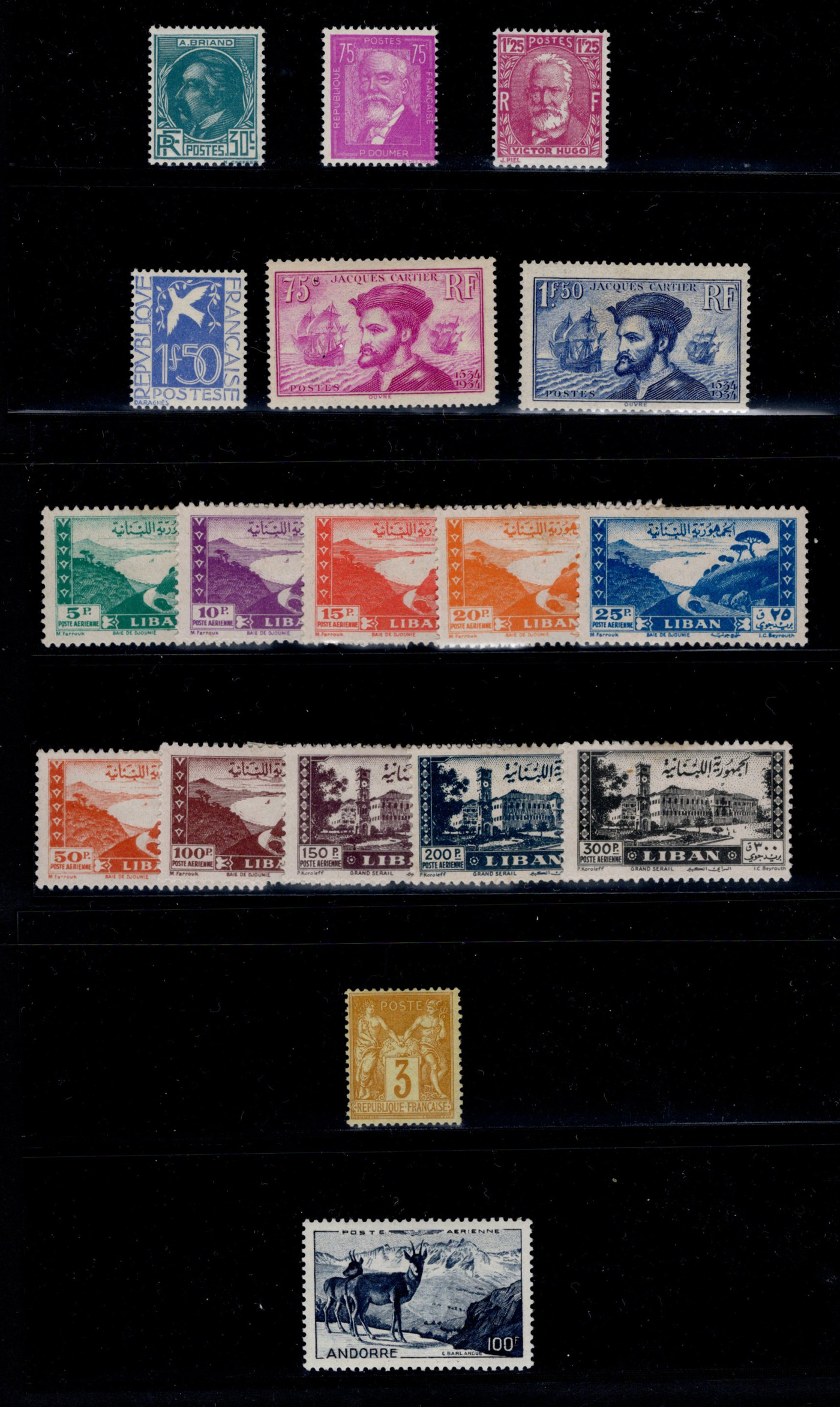 1558 O/og/nh   imageGroup of France and Colonies Singles, Sets and Collection, with a used France collection filling 17 black stock sheets (1930s to 1970s), France #291-94 (NH) and 296-97 (H) both cataloguing $285, France #89 (fresh, hinged $200), Lebanon #C119-28 ($91), Andorra #C1 (NH, $95) and New Caledonia #295-323 (NH, $112) along with a handful of other odds and ends in glassines. Overall fine or better. (Scan 1) (Scan 2) (Scan 3) (Scan 4) (Scan 5) (All Scans)