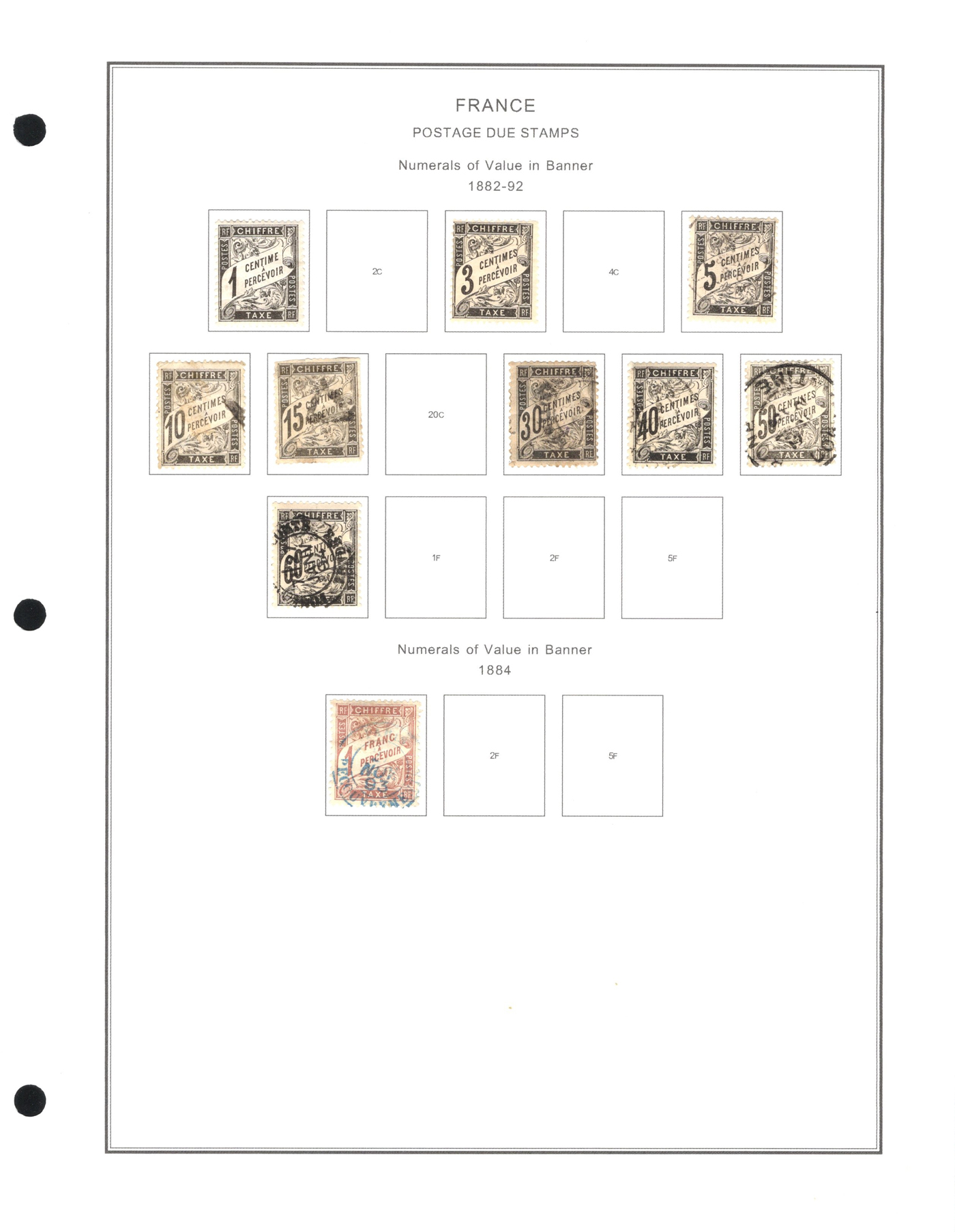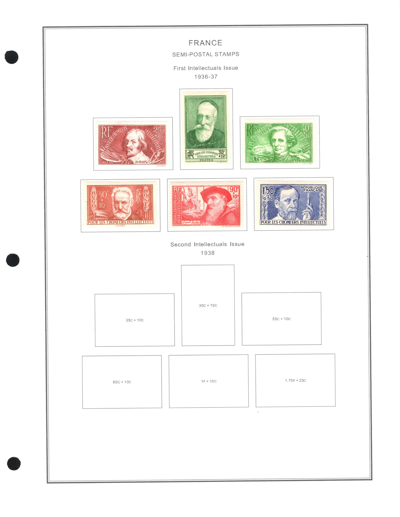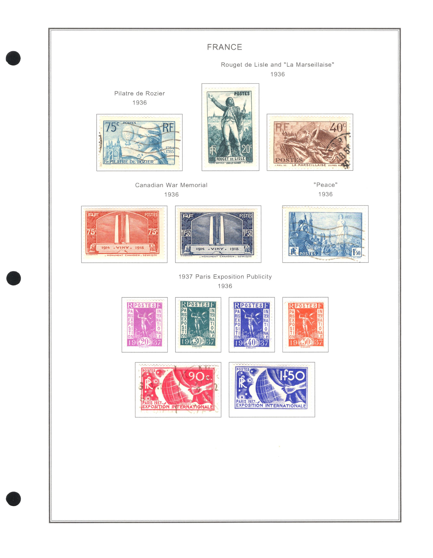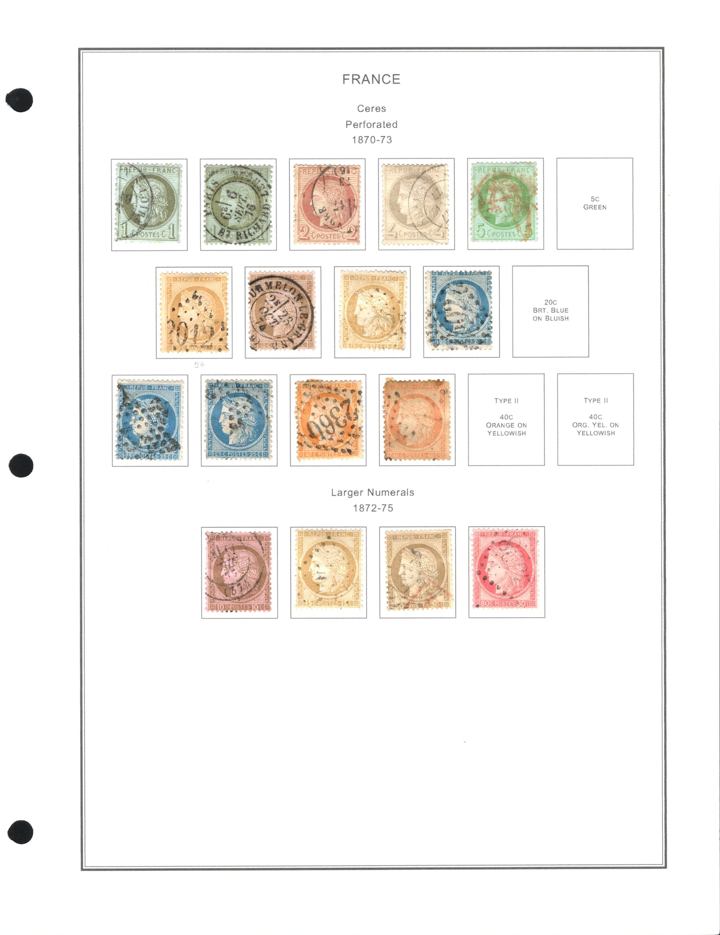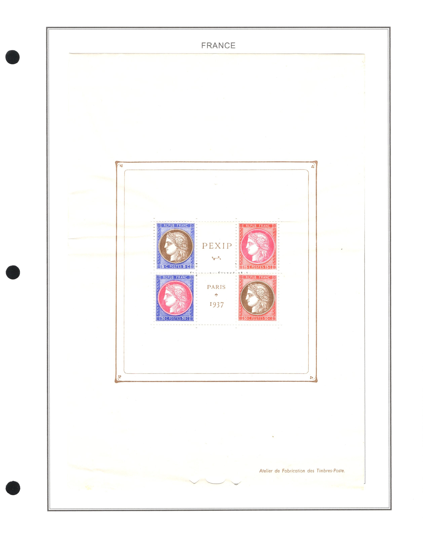 1559 O/og/nh   imageCollection of Mint and Used France, 1849-1971, in two Lighthouse binders with slipcases, neatly displayed on computer-generated pages following the Scott listings. A predominantly used collection with mint stamps sprinkled in here and there, including some never hinged (in black mounts), and many of the used have nice, clean c.d.s. cancels. About half of the collection is back of the book, with Semi-Postals, Airmails, Postage Dues, Military Franchise issues and more. We estimate the collection to be around 80% complete in period, and we note many better items throughout, such as early imperforates, the 1937 PEXIP souvenir sheet (mint, with wrinkles, $700), C15 (used, $310), C15 (used, $130), just to name a few, with most of the strength in the early issues and the semi-postals plus back of the book. See our many pictures for some of the highlight pages. A few small faults on the earliest issues, still overall fine to very fine. (Scan 1) (Scan 2) (Scan 3) (Scan 4) (Scan 5) (Scan 6) (Scan 7) (Scan 8) (Scan 9) (Scan 10) (Scan 11) (Scan 12) (Scan 13) (Scan 14) (Scan 15) (Scan 16) (Scan 17) (Scan 18) (Scan 19) (Scan 20) (Scan 21) (Scan 22) (Scan 23) (Scan 24) (All Scans)