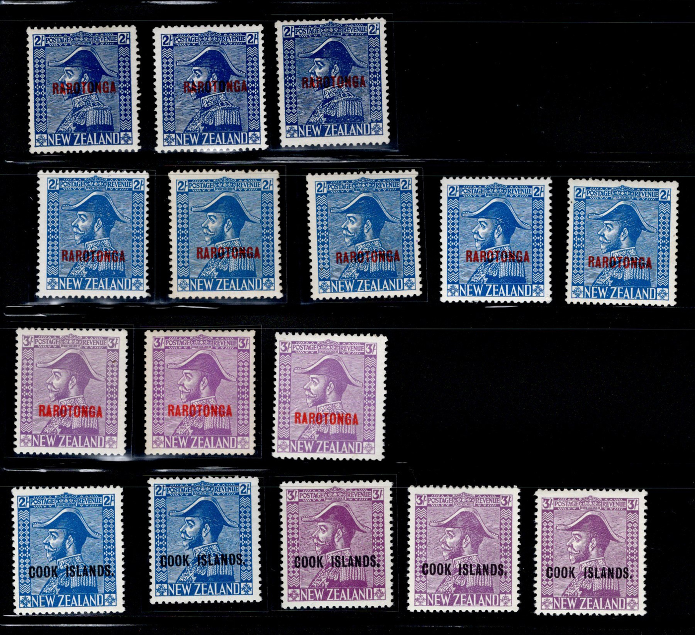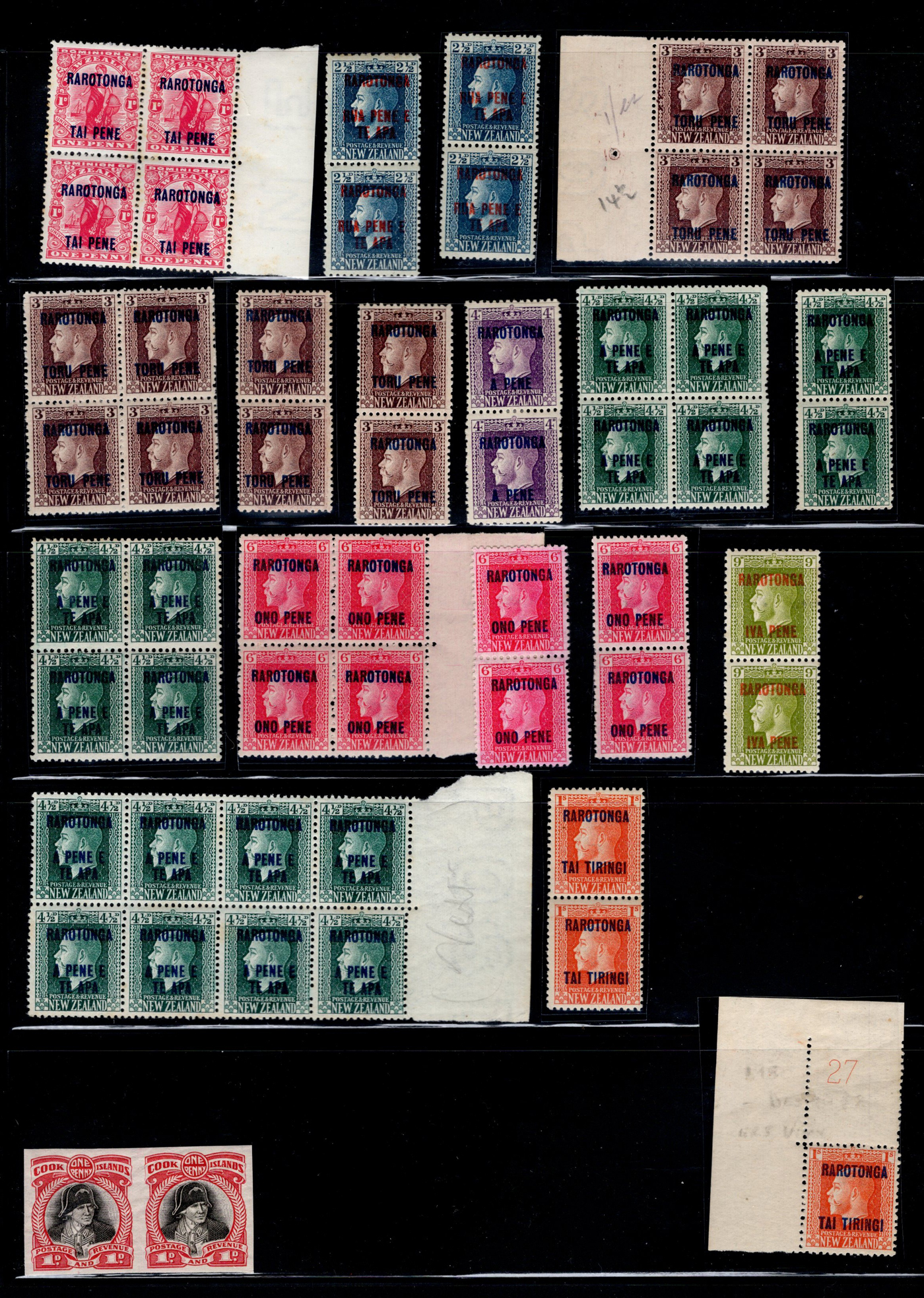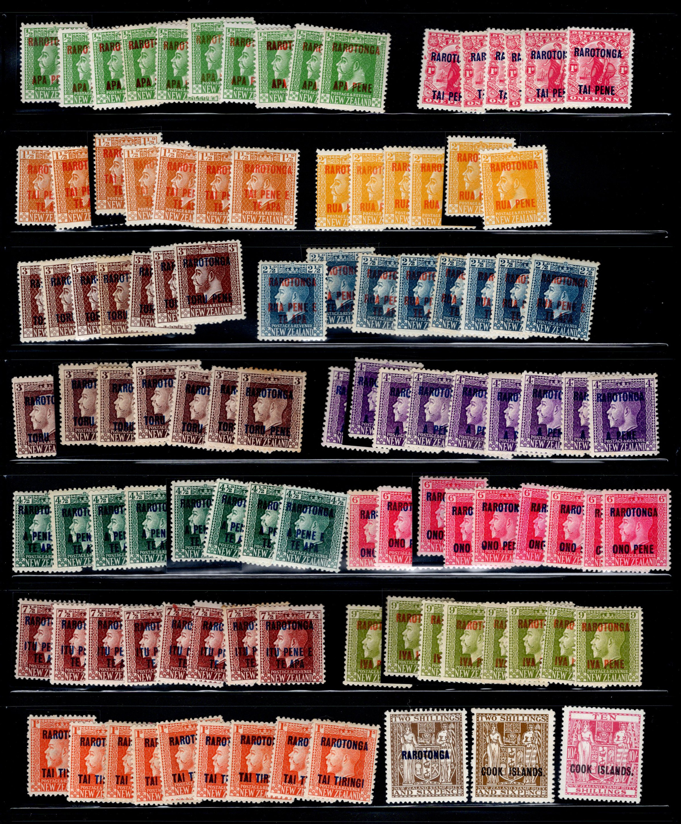 1546 og 48/105 imageAccumulation of Mint New Zealand Stamps Overprinted “Rarotonga” or “Cook Islands”, most are King George V issues, including a number of 2sh and 3sh “Admirals” plus a trio of postal-fiscal “Coat of Arms” (with better #104-105). Besides being up to 10 of a type, there are a number of multiples, with 2-perf pairs and/or blocks with regular or “mixed” perforations (all counted as basic Scott, but these are listed in Stanley Gibbons). Expect most to be hinged and fine to very fine. (Scan 1) (Scan 2) (Scan 3) (All Scans)