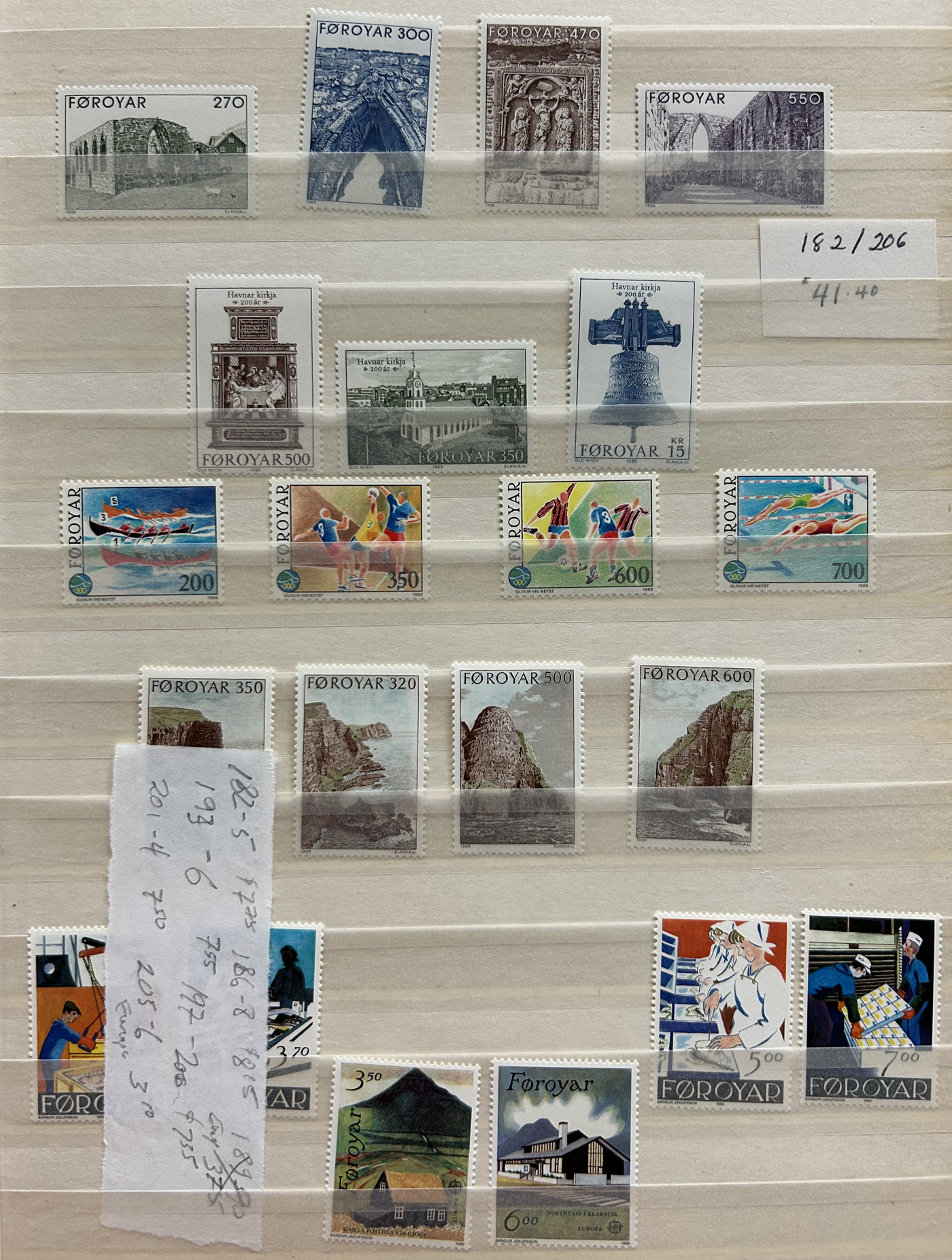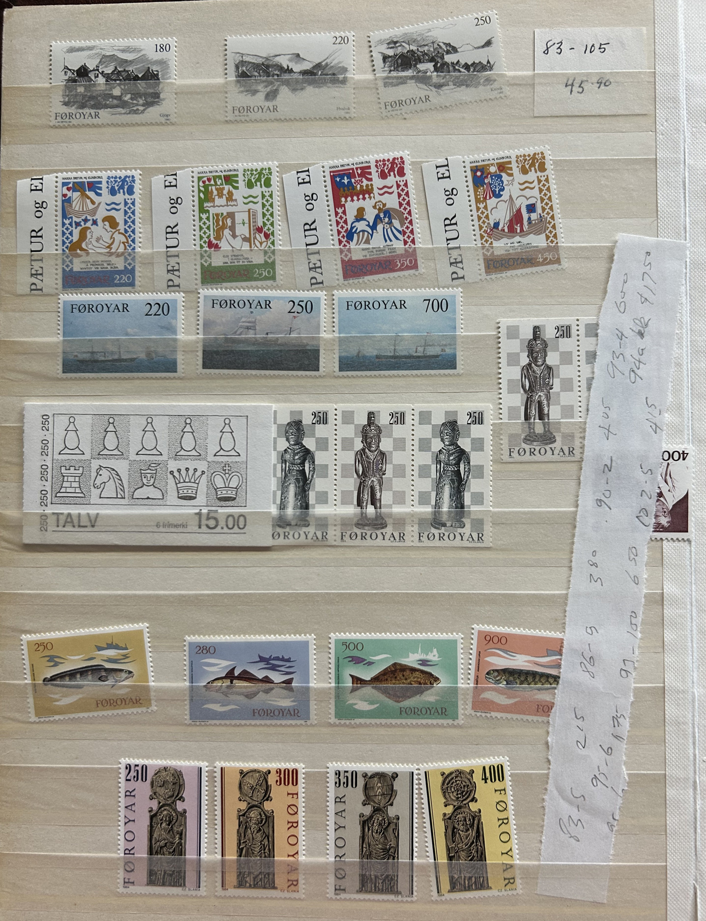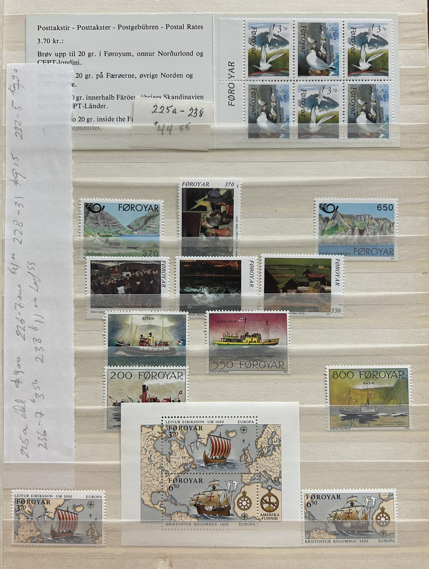1555 nh   imageCollection of Mint Never Hinged Faroe Islands in a Stockbook, 1975-1995, appears complete in period for singles, sets and souvenir sheets, missing only 2 sets, 1 booklet and one souvenir sheet, Very fine. Catalogue value is from Scott 2013, scans give a sampling only. (Scan 1) (Scan 2) (Scan 3) (Scan 4) (Scan 5) (Scan 6) (All Scans)