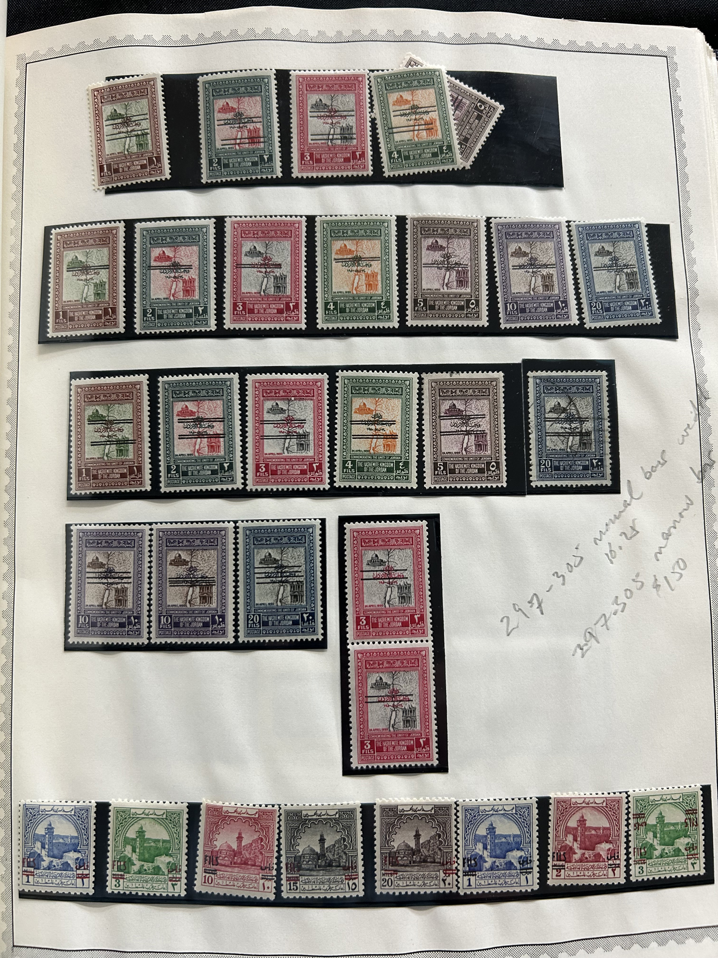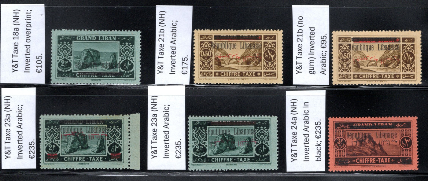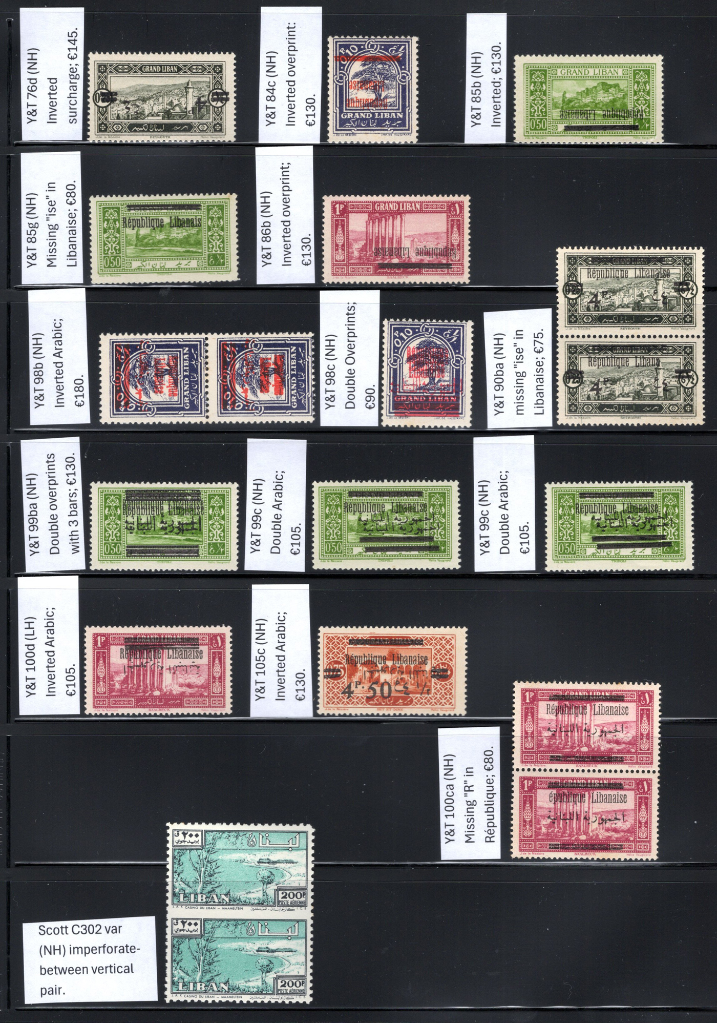 1632 og/nh   imageCollection of Lebanon Overprint and Surcharge Varieties, all mint never hinged except where noted otherwise. Includes Yvert & Tellier specialized colonies catalogue #s 76d, 84c, 85b, 85g, 86b, 90ba, 98b, 98c, 99ba, 99c (x2), 105c, 100ca and 100d (lightly hinged), as well as postage due #s 18a, 21b (x2), 23a (x2) and 24a. These either have inverted overprints, double overprints, missing letters, etc. Also includes (but not part of our total catalogue value) a rare unlisted Scott #C302 vertical pair, imperforate between (never hinged). A fresh and useful lot, very fine. (Scan 1) (Scan 2) (All Scans)