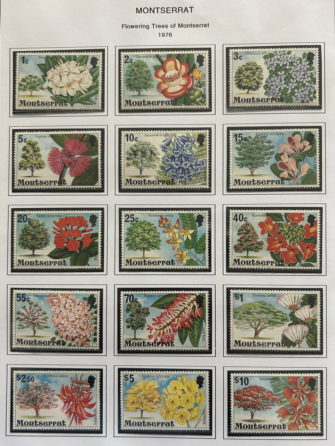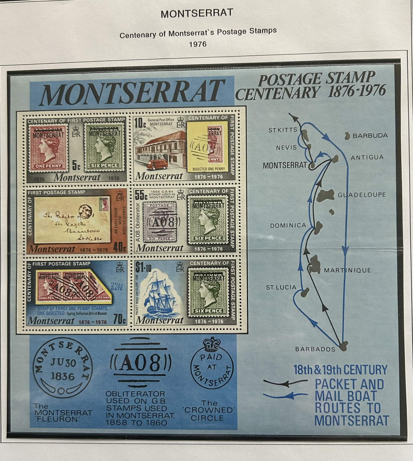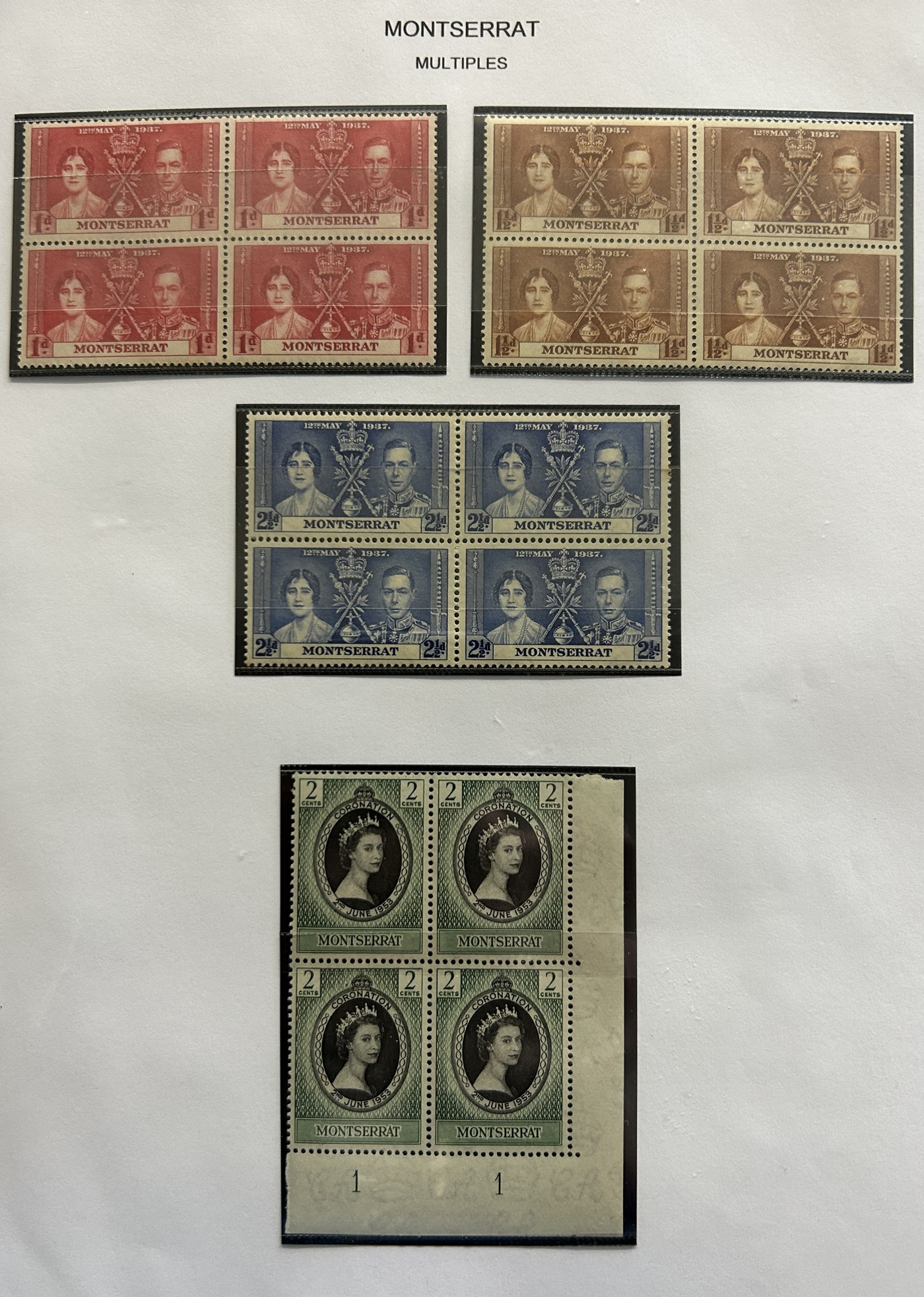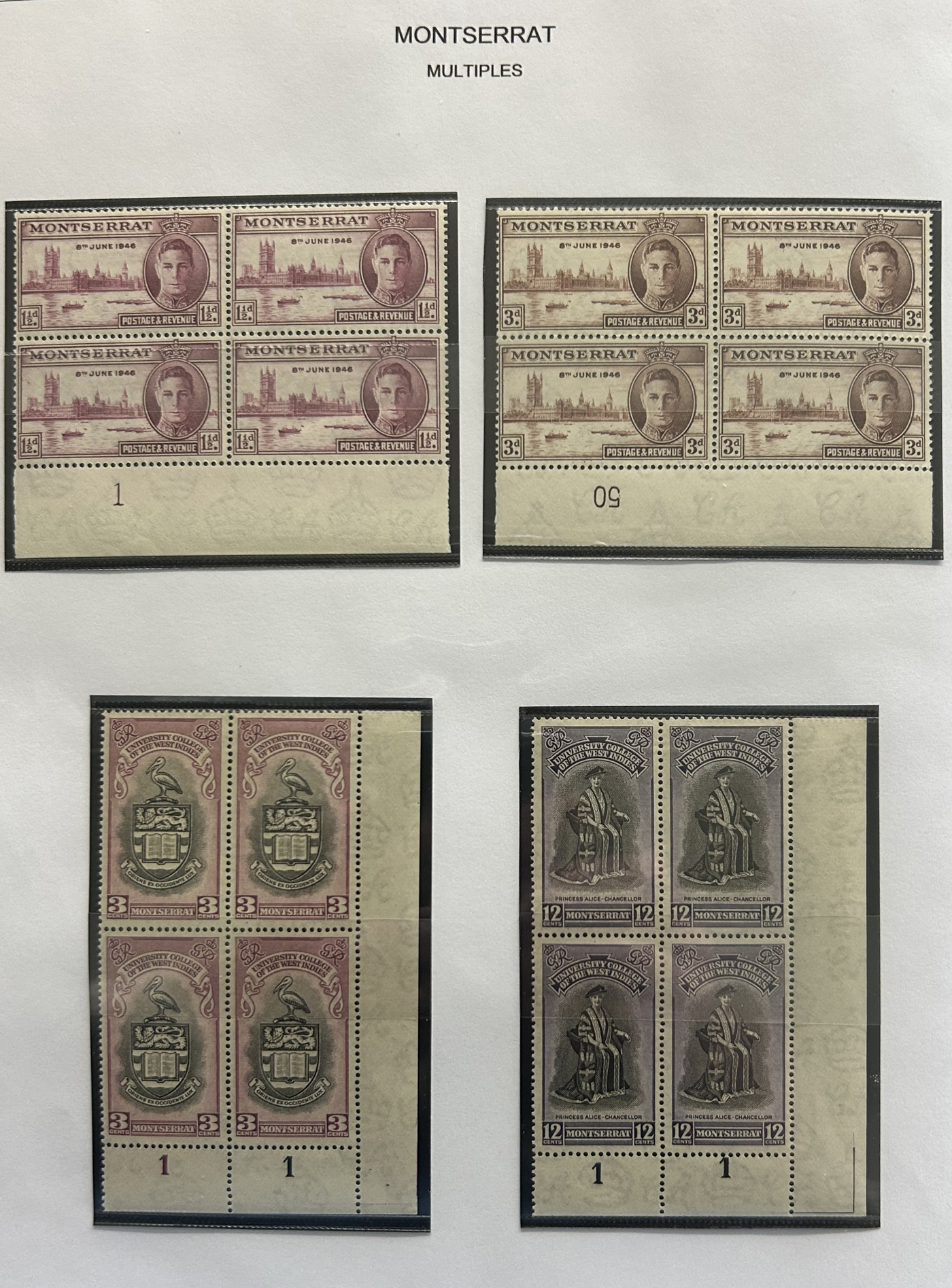 1636 O/og/nh   imageCollection of Primarily Mint Montserrat, 1930s to 1980s, with 381 stamps, souvenir sheets, booklets, blocks and sheet margin blocks, etc. on 46 album pages plus a few stock pages. Included among the earlier issues are complete mint sets such as #s 114-126, 159-176, This is followed by an extensive range of 1973-1988 issues, many also present with SPECIMEN overprints. Overall fine to very fine, pictures show a small sampling only. (Scan 1) (Scan 2) (Scan 3) (Scan 4) (Scan 5) (Scan 6) (Scan 7) (Scan 8) (Scan 9) (Scan 10) (All Scans)