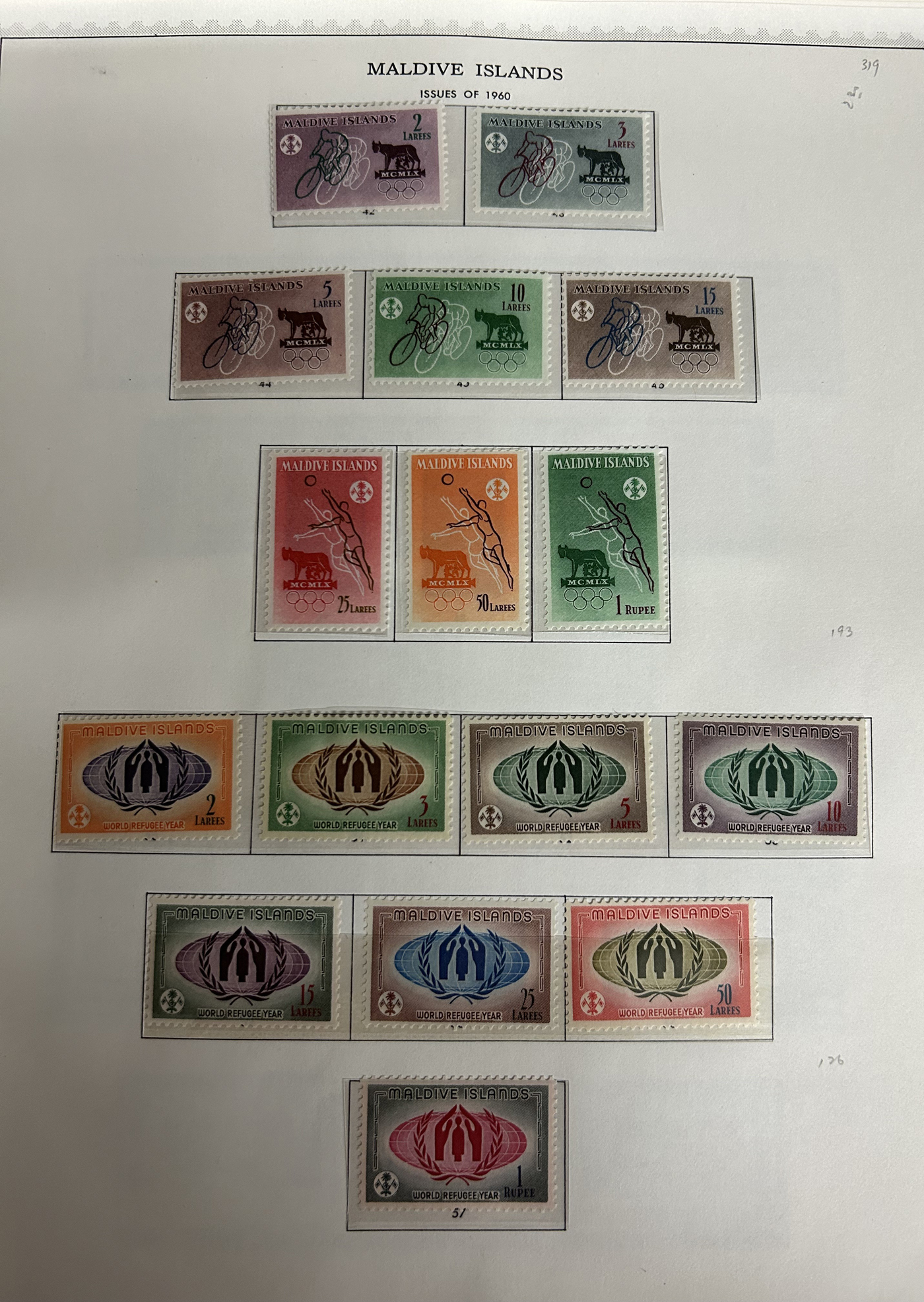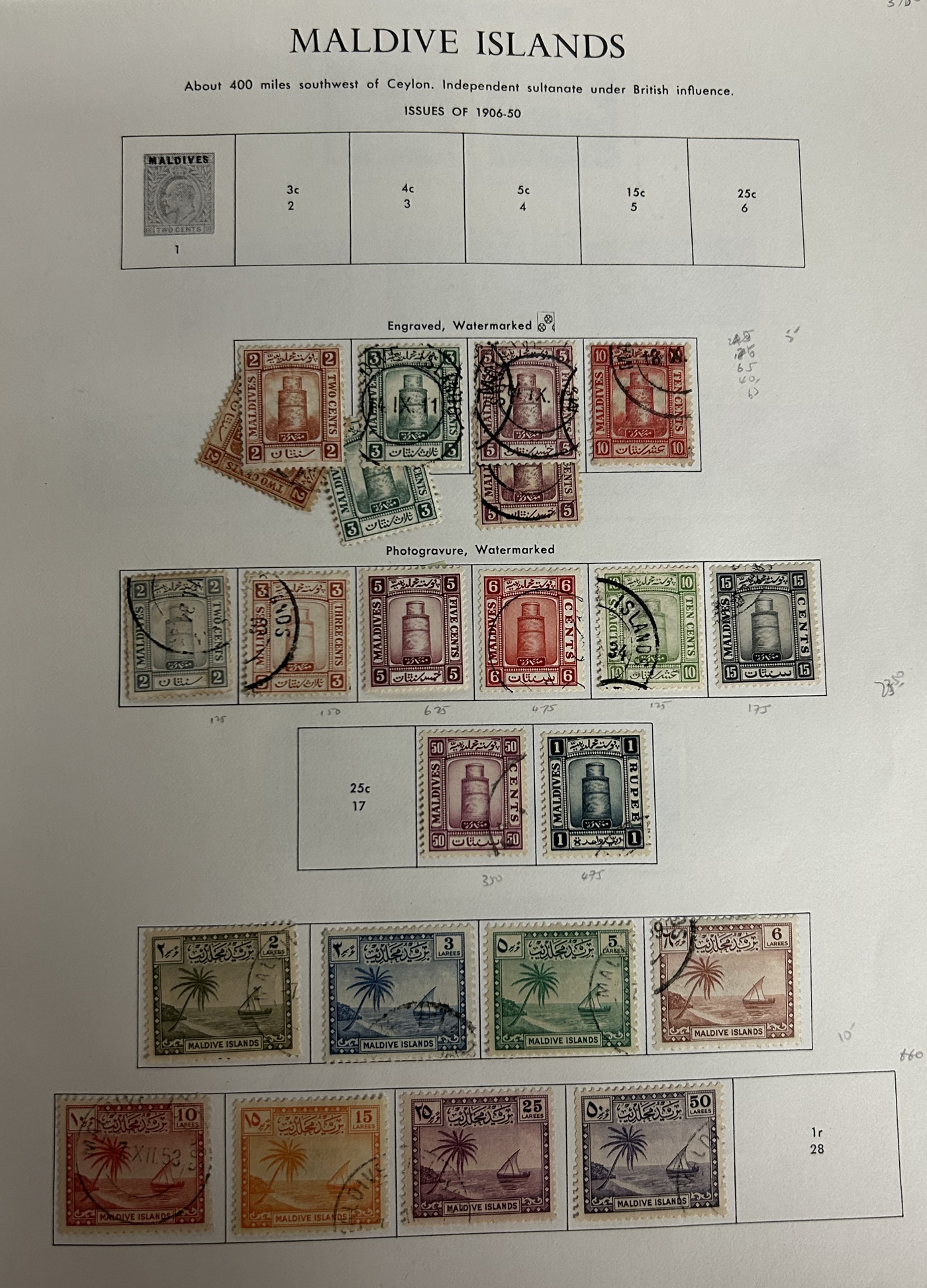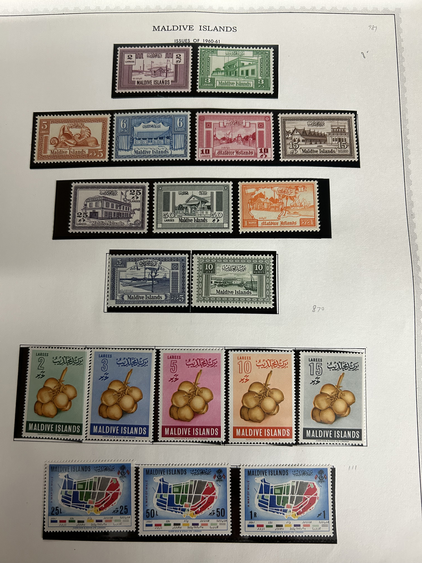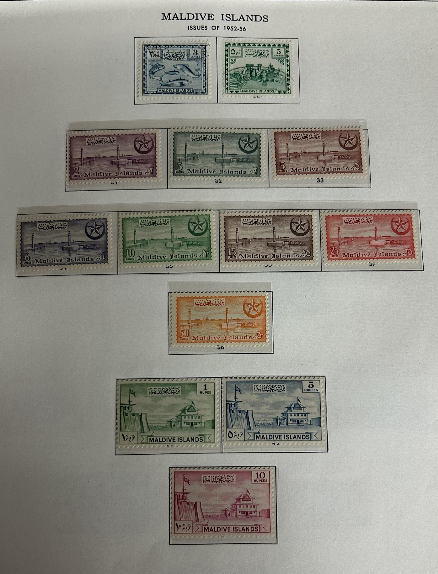 1633 O/og/nh   imageCollection of Mint and Used Maldive Islands, 1909 to 1980, mounted (hinged and in mounts) on Minkus album pages, with a mix of mint and used to 1950, then mint to the end. We estimate the collection to be about 90% complete to 1970, then dwindling down to the end, including many complete sets, souvenir sheets, etc. Overall very fine, see our photos for a sampling. (Scan 1) (Scan 2) (Scan 3) (Scan 4) (Scan 5) (Scan 6) (Scan 7) (Scan 8) (Scan 9) (Scan 10) (Scan 11) (All Scans)
