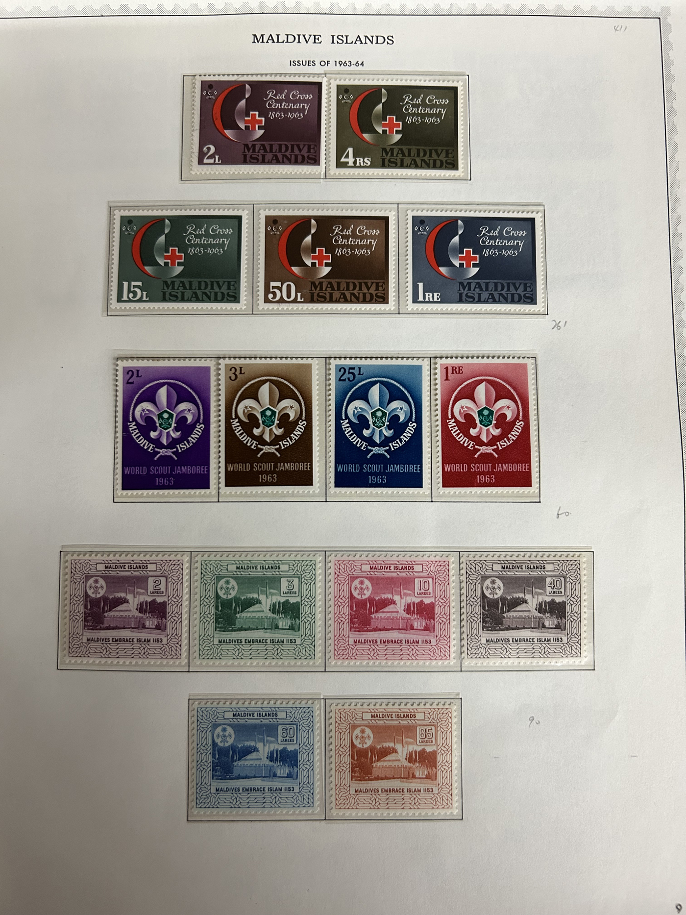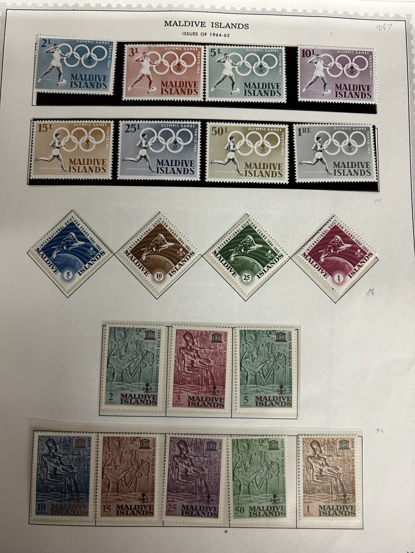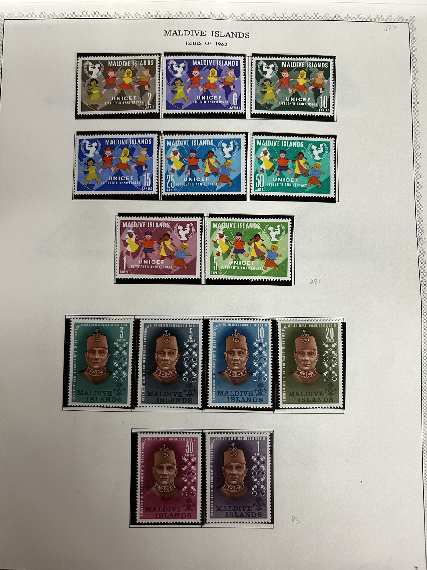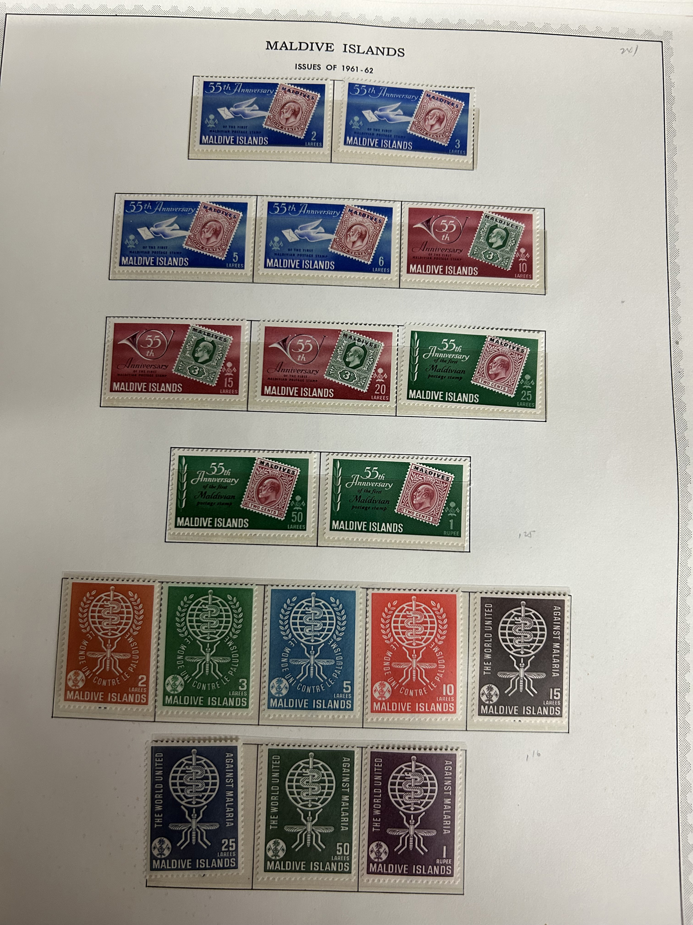 1633 O/og/nh   imageCollection of Mint and Used Maldive Islands, 1909 to 1980, mounted (hinged and in mounts) on Minkus album pages, with a mix of mint and used to 1950, then mint to the end. We estimate the collection to be about 90% complete to 1970, then dwindling down to the end, including many complete sets, souvenir sheets, etc. Overall very fine, see our photos for a sampling. (Scan 1) (Scan 2) (Scan 3) (Scan 4) (Scan 5) (Scan 6) (Scan 7) (Scan 8) (Scan 9) (Scan 10) (Scan 11) (All Scans)