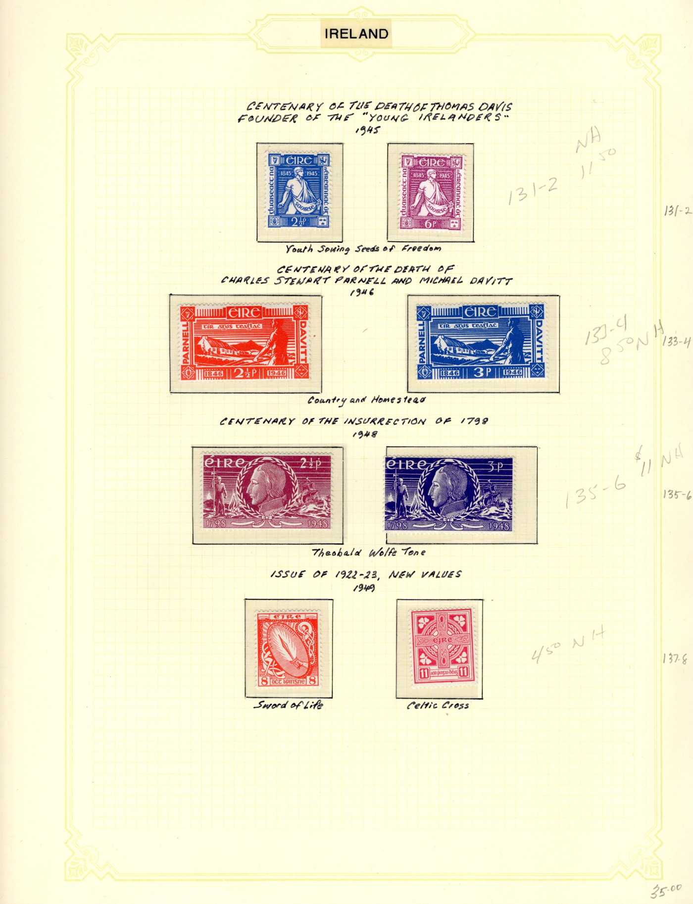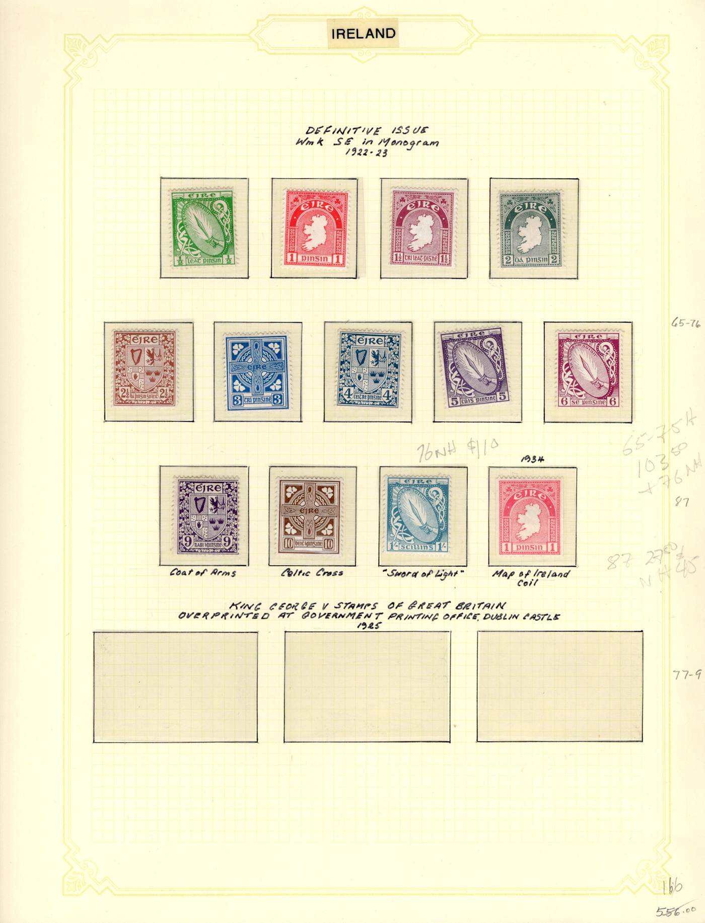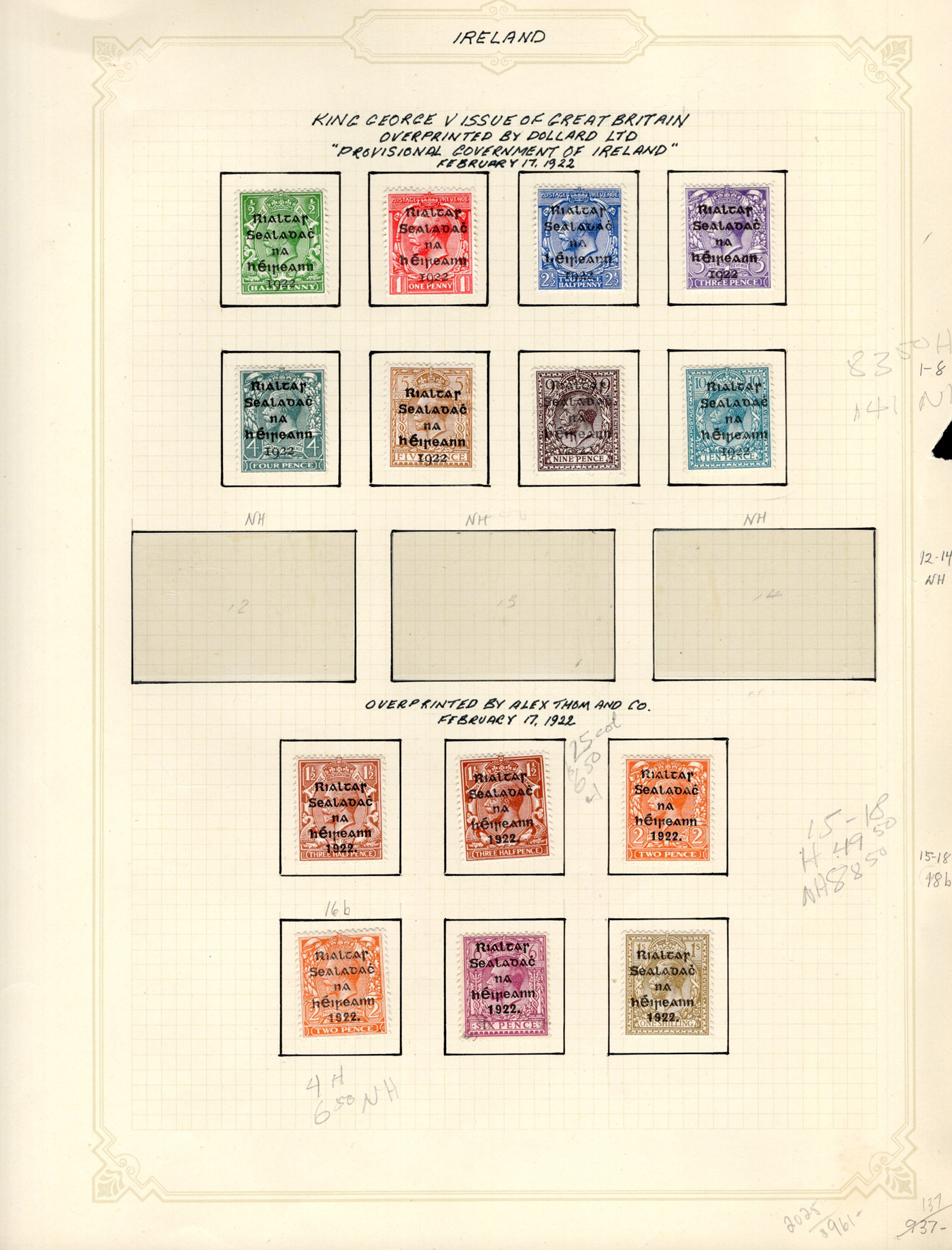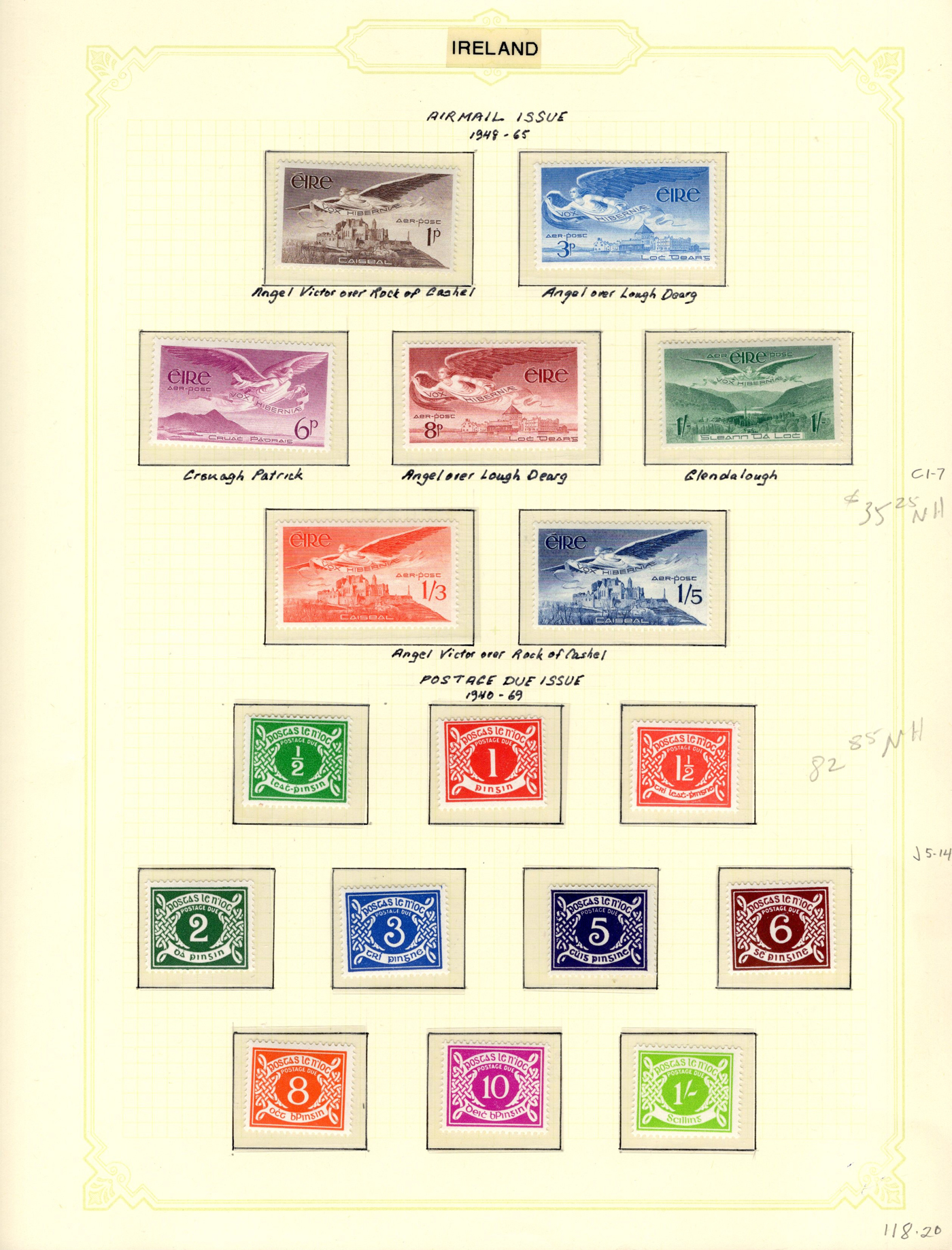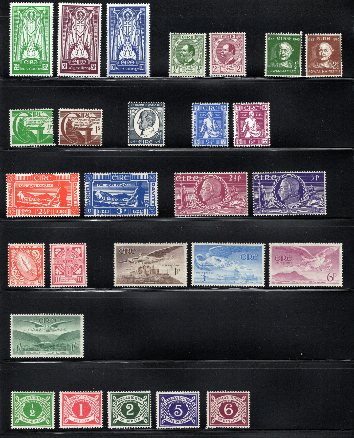 1624 og   imageCollection of Mint Ireland, 1922 to 1949, mounted on 11 album pages, with several complete sets and better issues, includes the Airmails and some Postage Dues, overall fine or better. All pages scanned online. (Scan 1) (Scan 2) (Scan 3) (Scan 4) (Scan 5) (Scan 6) (Scan 7) (Scan 8) (Scan 9) (Scan 10) (Scan 11) (All Scans)