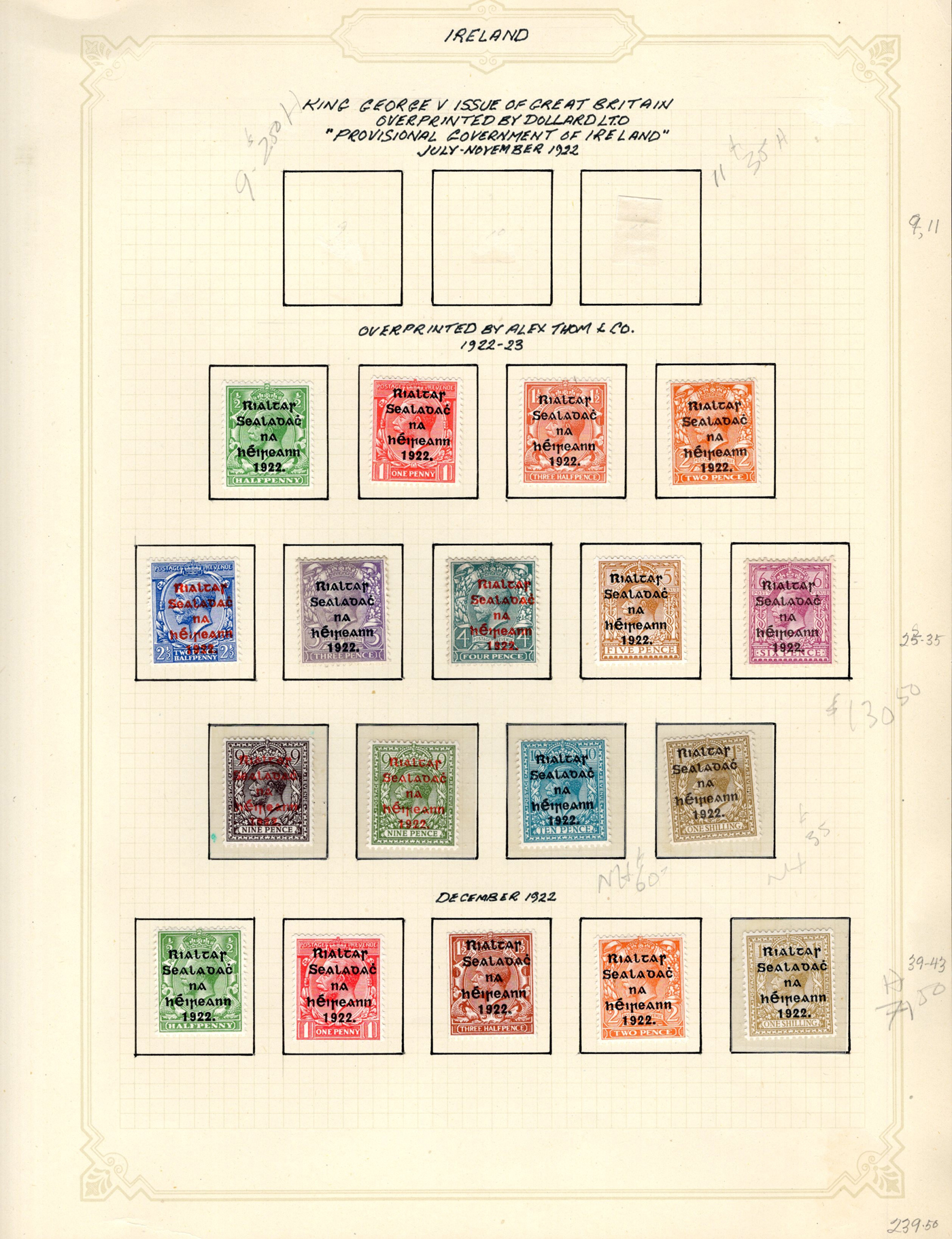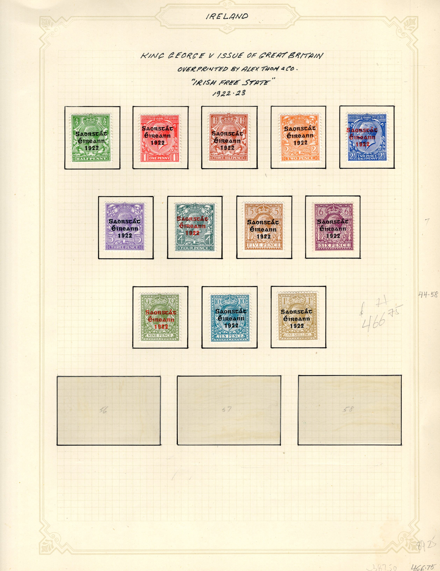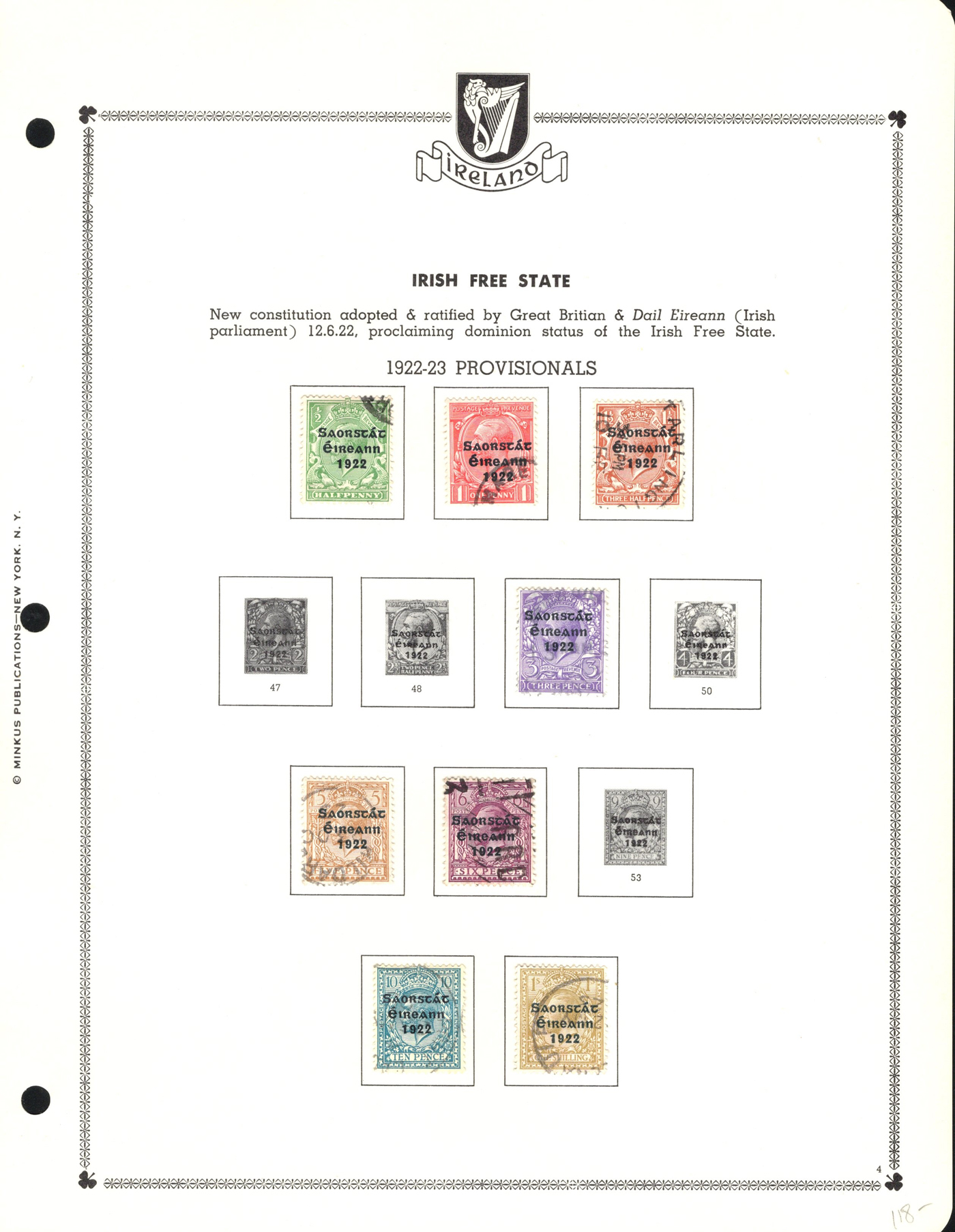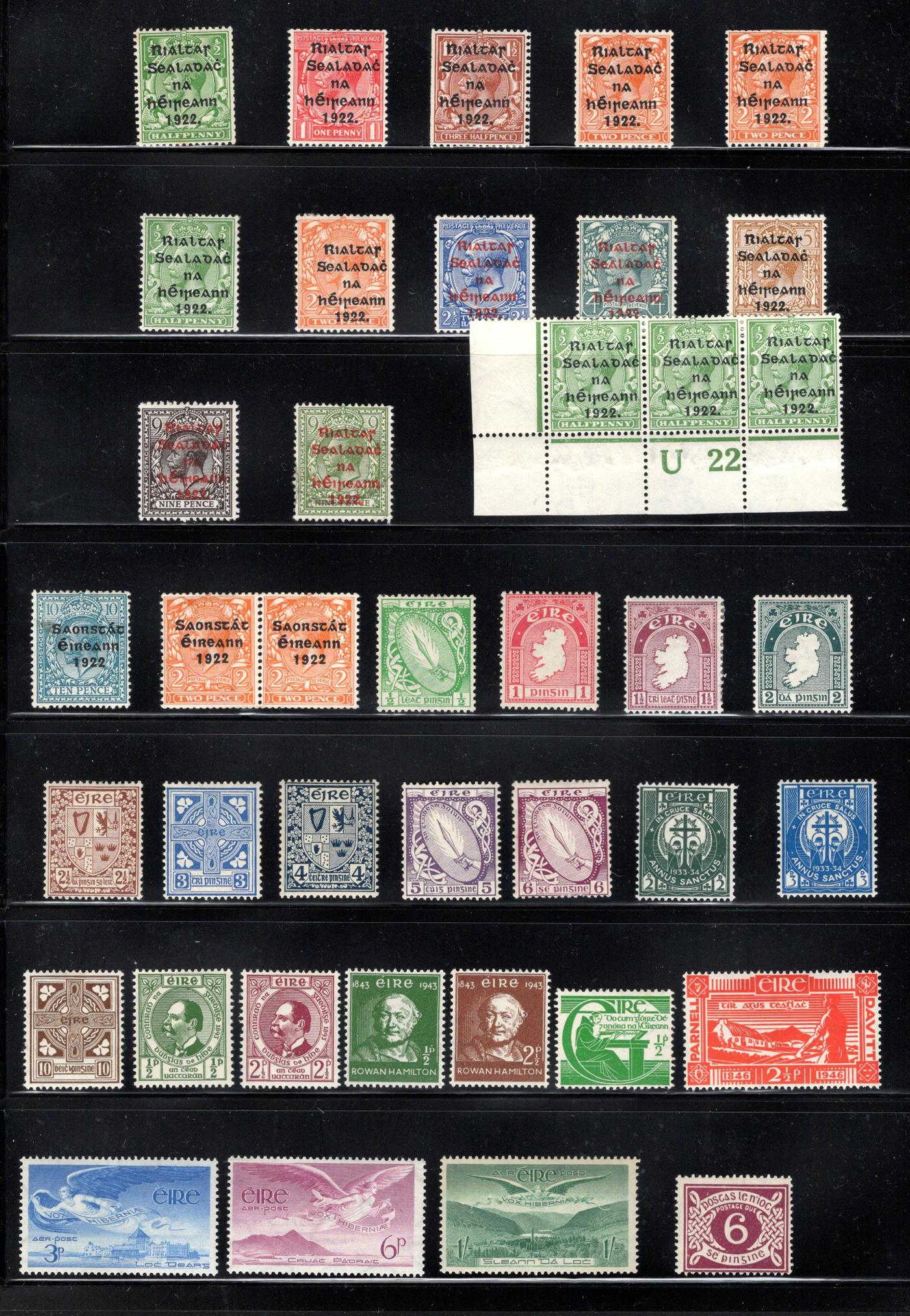 1624 og   imageCollection of Mint Ireland, 1922 to 1949, mounted on 11 album pages, with several complete sets and better issues, includes the Airmails and some Postage Dues, overall fine or better. All pages scanned online. (Scan 1) (Scan 2) (Scan 3) (Scan 4) (Scan 5) (Scan 6) (Scan 7) (Scan 8) (Scan 9) (Scan 10) (Scan 11) (All Scans)