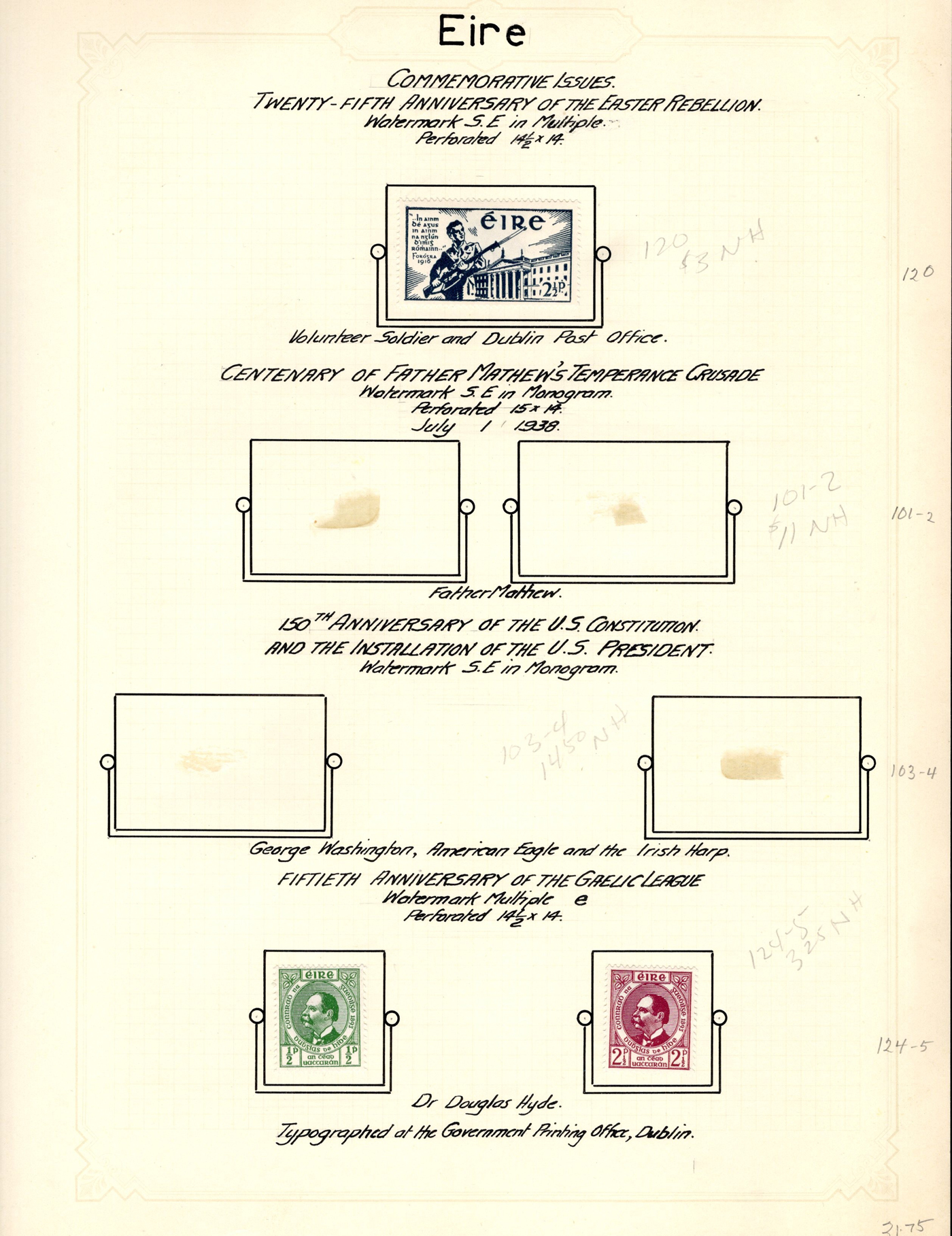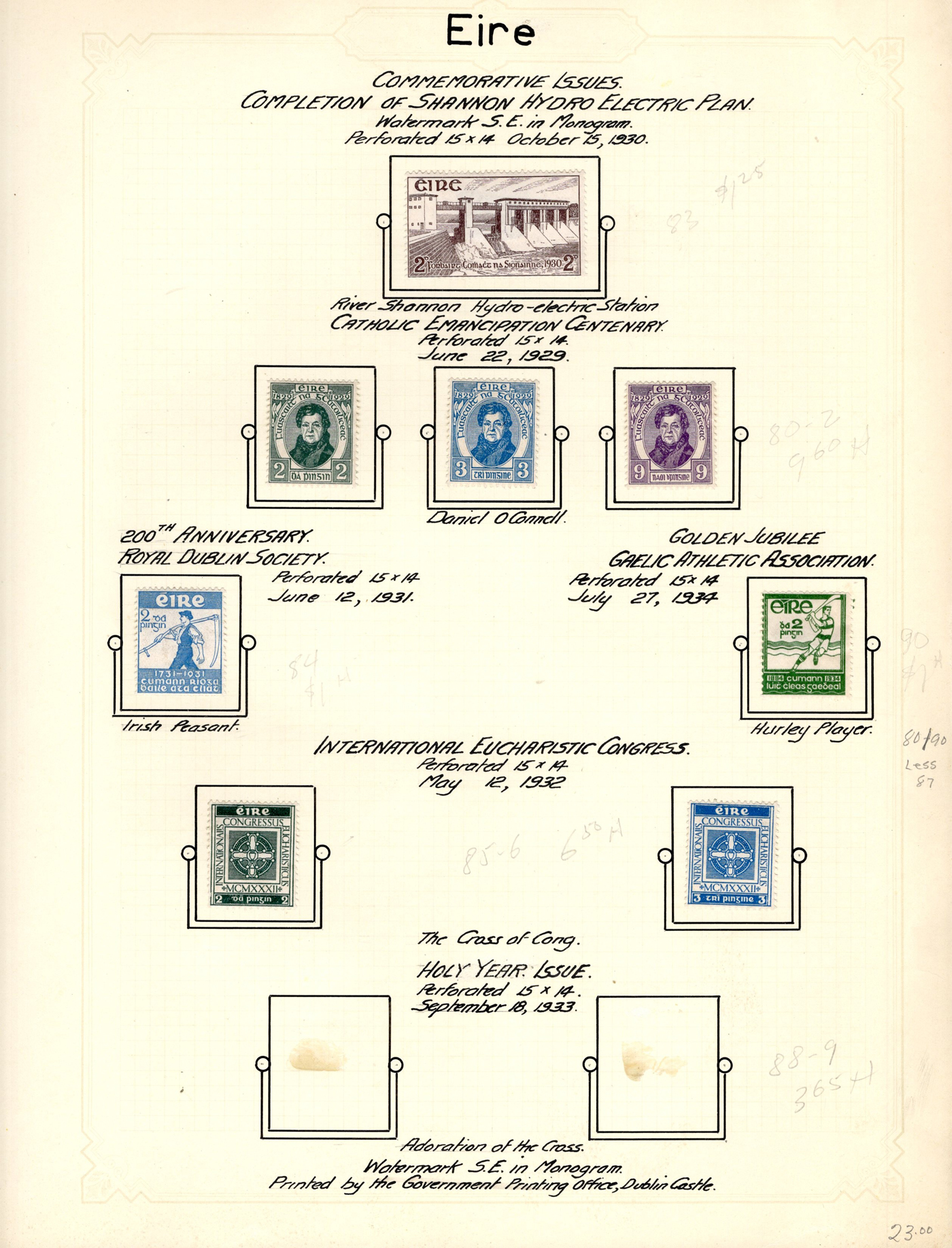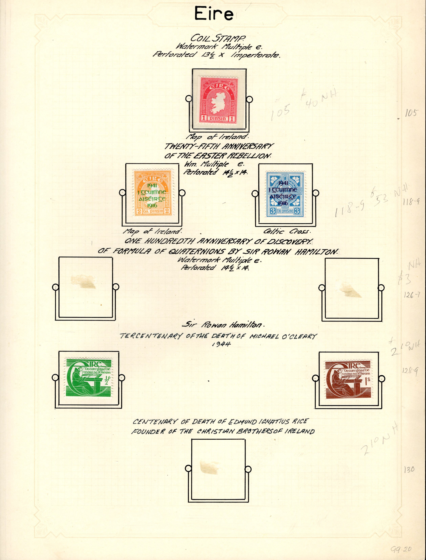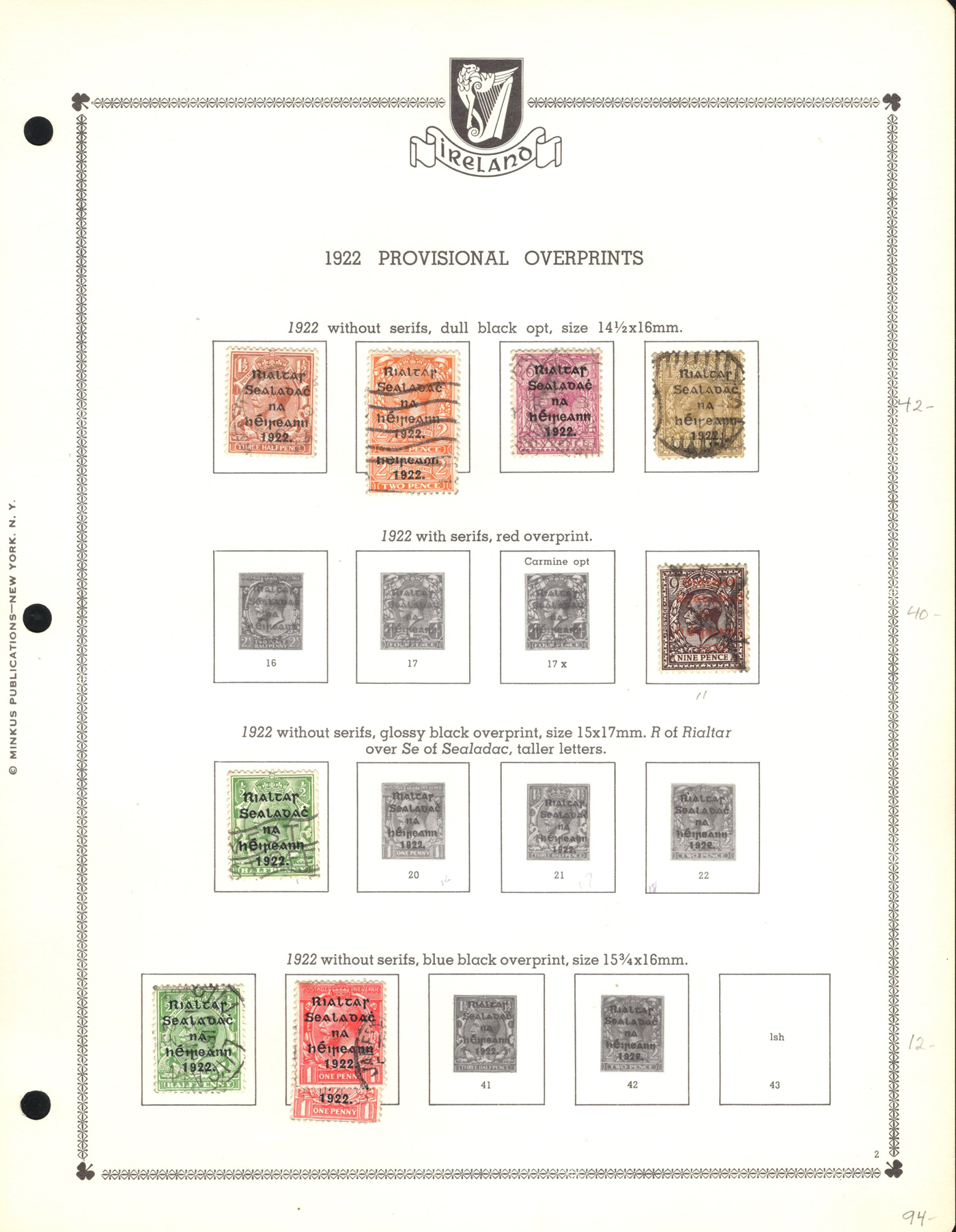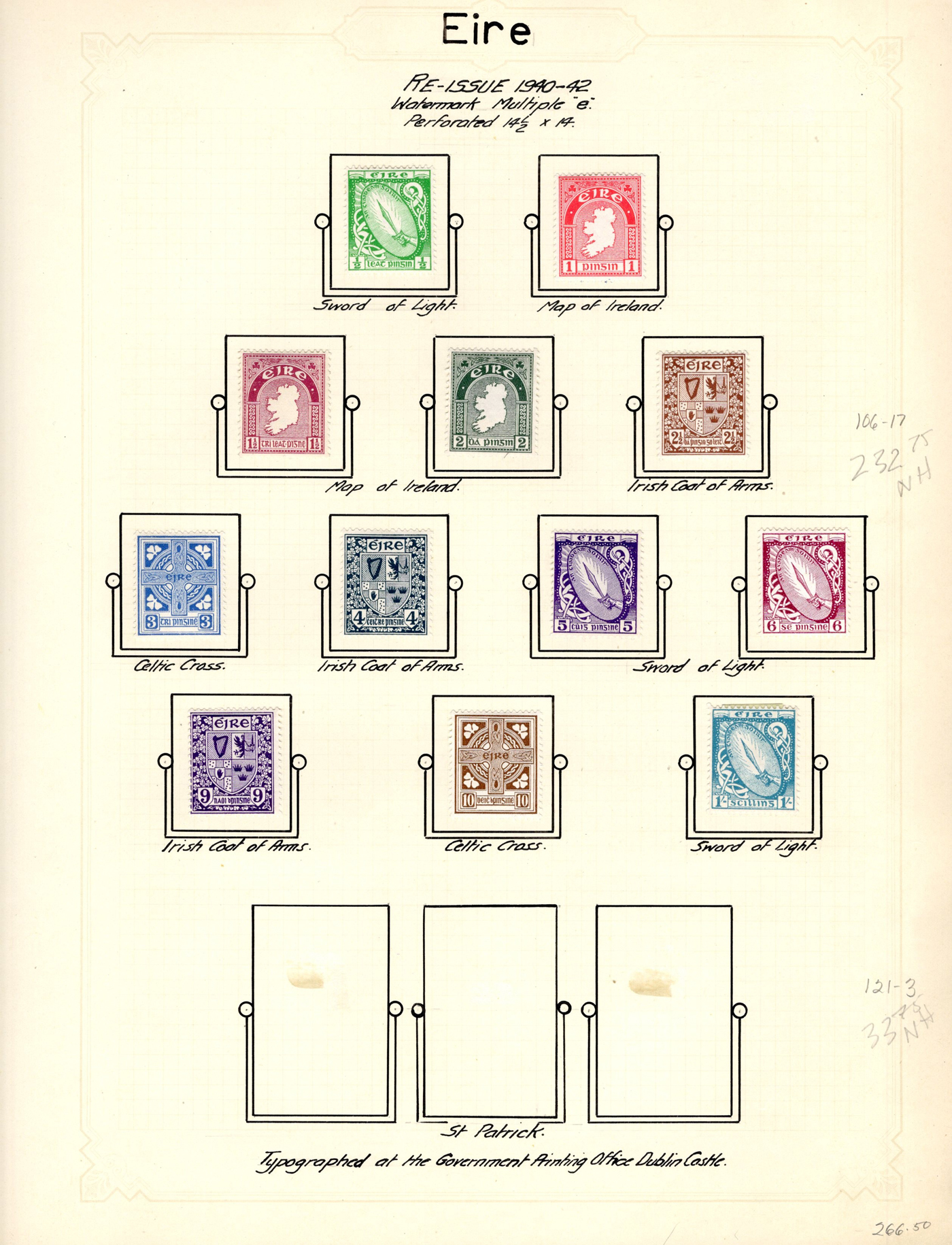 1624 og   imageCollection of Mint Ireland, 1922 to 1949, mounted on 11 album pages, with several complete sets and better issues, includes the Airmails and some Postage Dues, overall fine or better. All pages scanned online. (Scan 1) (Scan 2) (Scan 3) (Scan 4) (Scan 5) (Scan 6) (Scan 7) (Scan 8) (Scan 9) (Scan 10) (Scan 11) (All Scans)