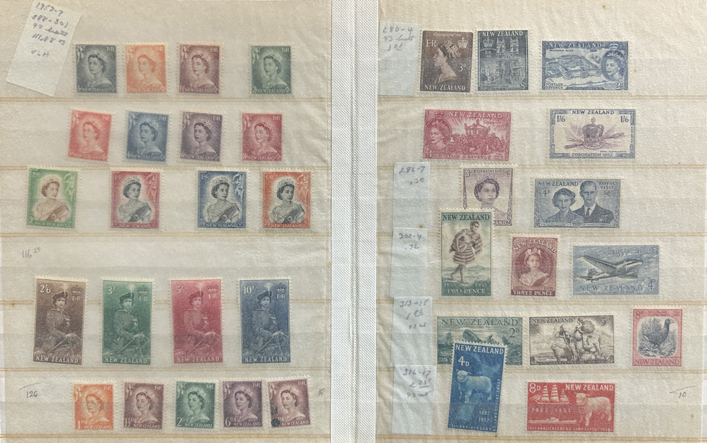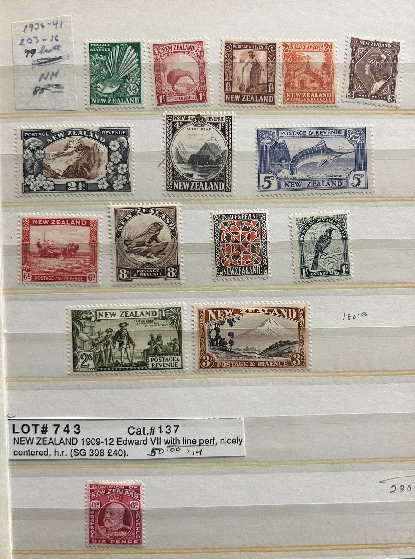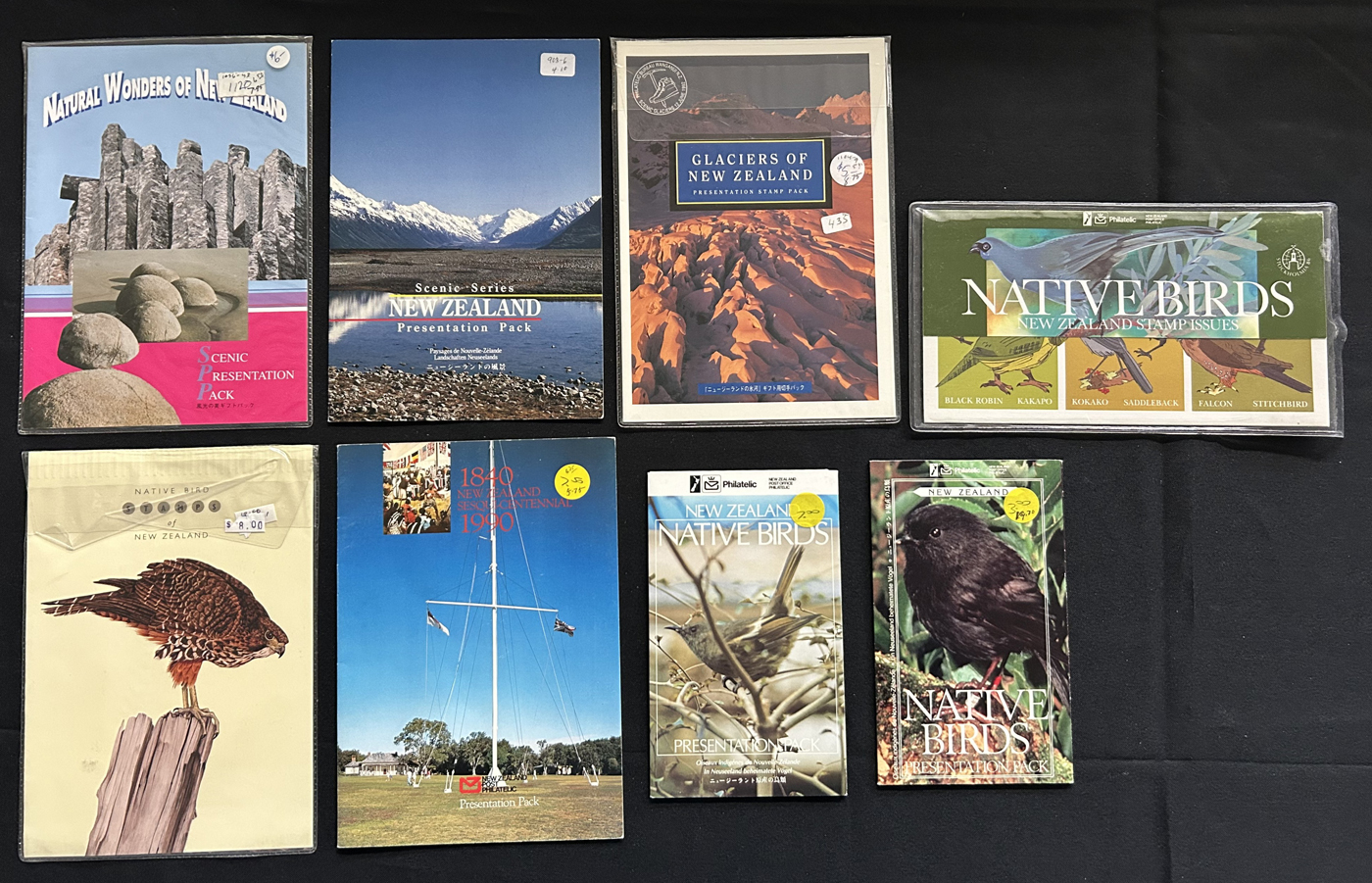 1639 og/nh   imageLot of Mostly Mint New Zealand Singles, Sets, Presentation Folders, starting with a group of 8 presentation folders (from 1986 to 1990, c.v. of about $80 in 2014), then a small stockbook filled with mostly mint (hinged or NH) singles and sets from #137 to 1198 (these were carefully catalogued in 2014 at $762, which includes a few covers where the stamps were counted as used). A fine to very fine group, with many useful items. All items pictured online. (Scan 1) (Scan 2) (Scan 3) (Scan 4) (Scan 5) (Scan 6) (Scan 7) (Scan 8) (Scan 9) (All Scans)