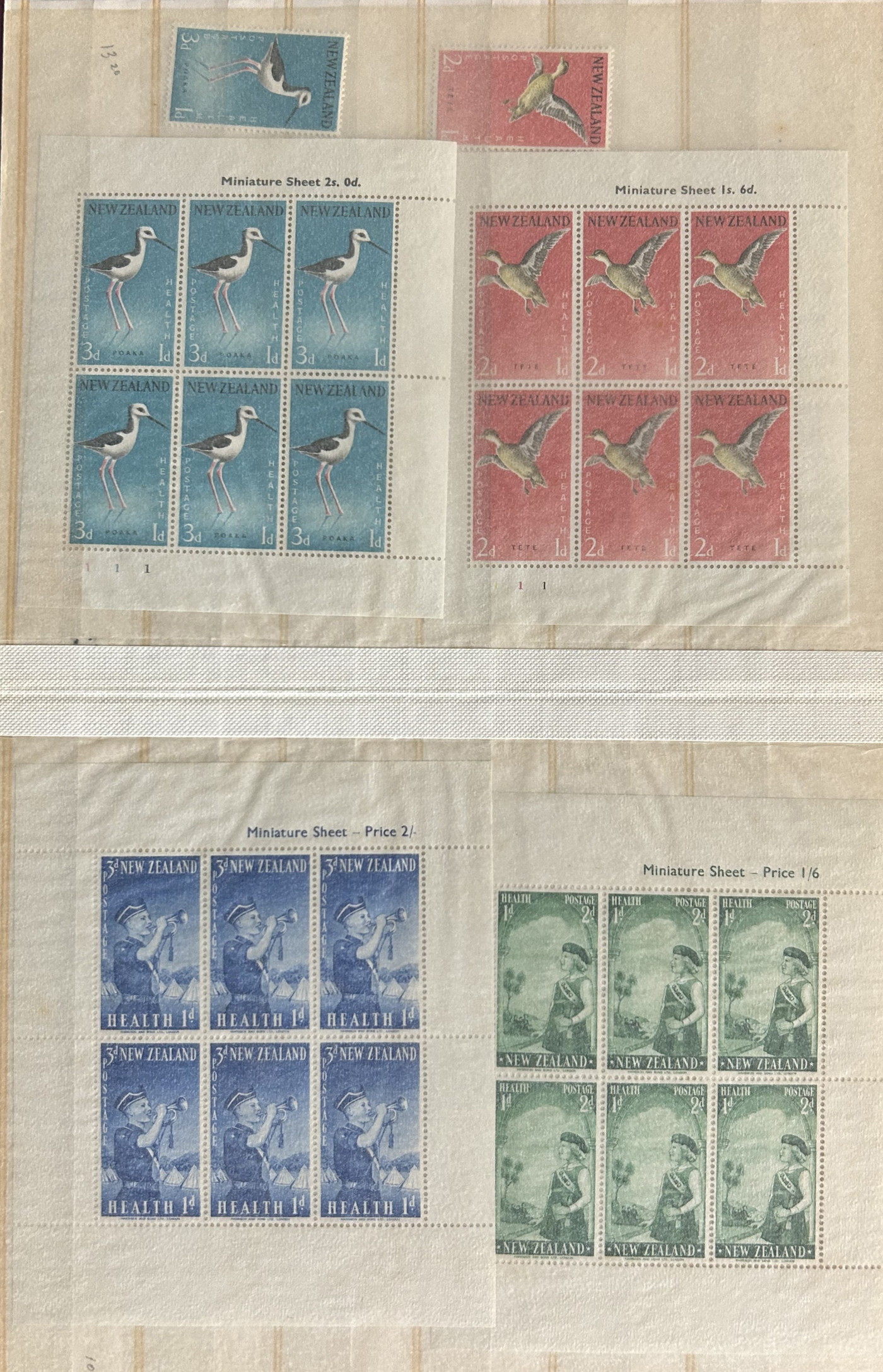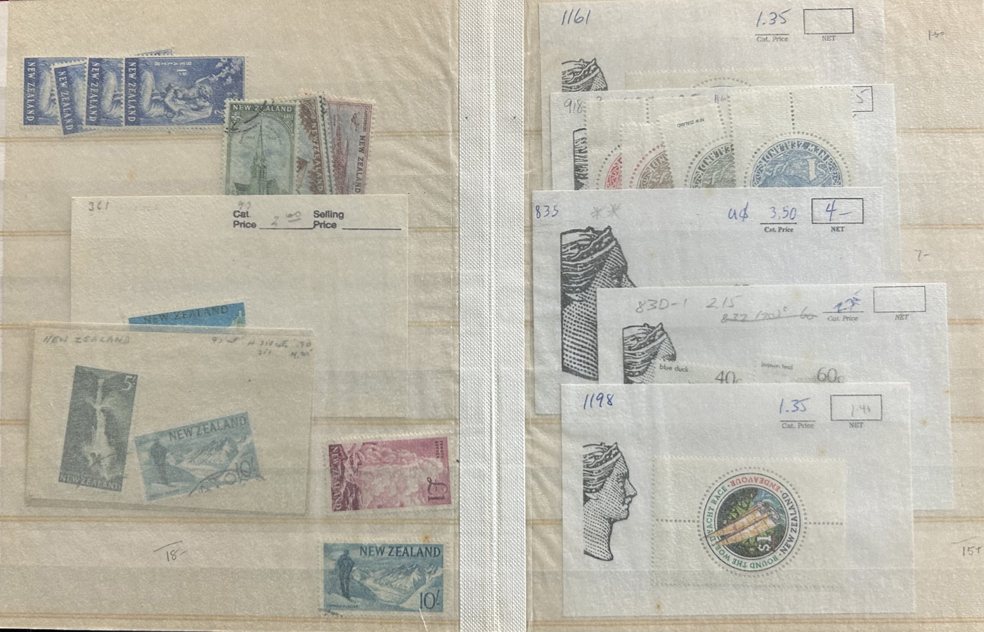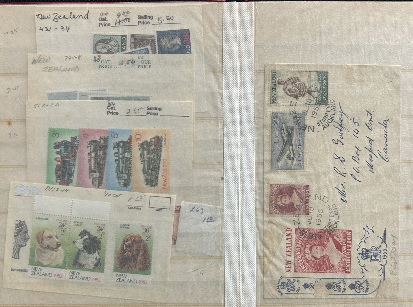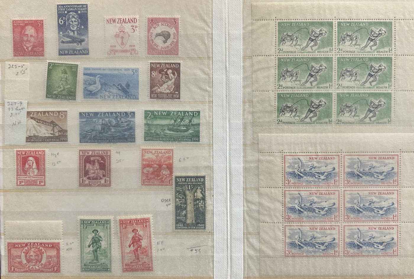 1639 og/nh   imageLot of Mostly Mint New Zealand Singles, Sets, Presentation Folders, starting with a group of 8 presentation folders (from 1986 to 1990, c.v. of about $80 in 2014), then a small stockbook filled with mostly mint (hinged or NH) singles and sets from #137 to 1198 (these were carefully catalogued in 2014 at $762, which includes a few covers where the stamps were counted as used). A fine to very fine group, with many useful items. All items pictured online. (Scan 1) (Scan 2) (Scan 3) (Scan 4) (Scan 5) (Scan 6) (Scan 7) (Scan 8) (Scan 9) (All Scans)