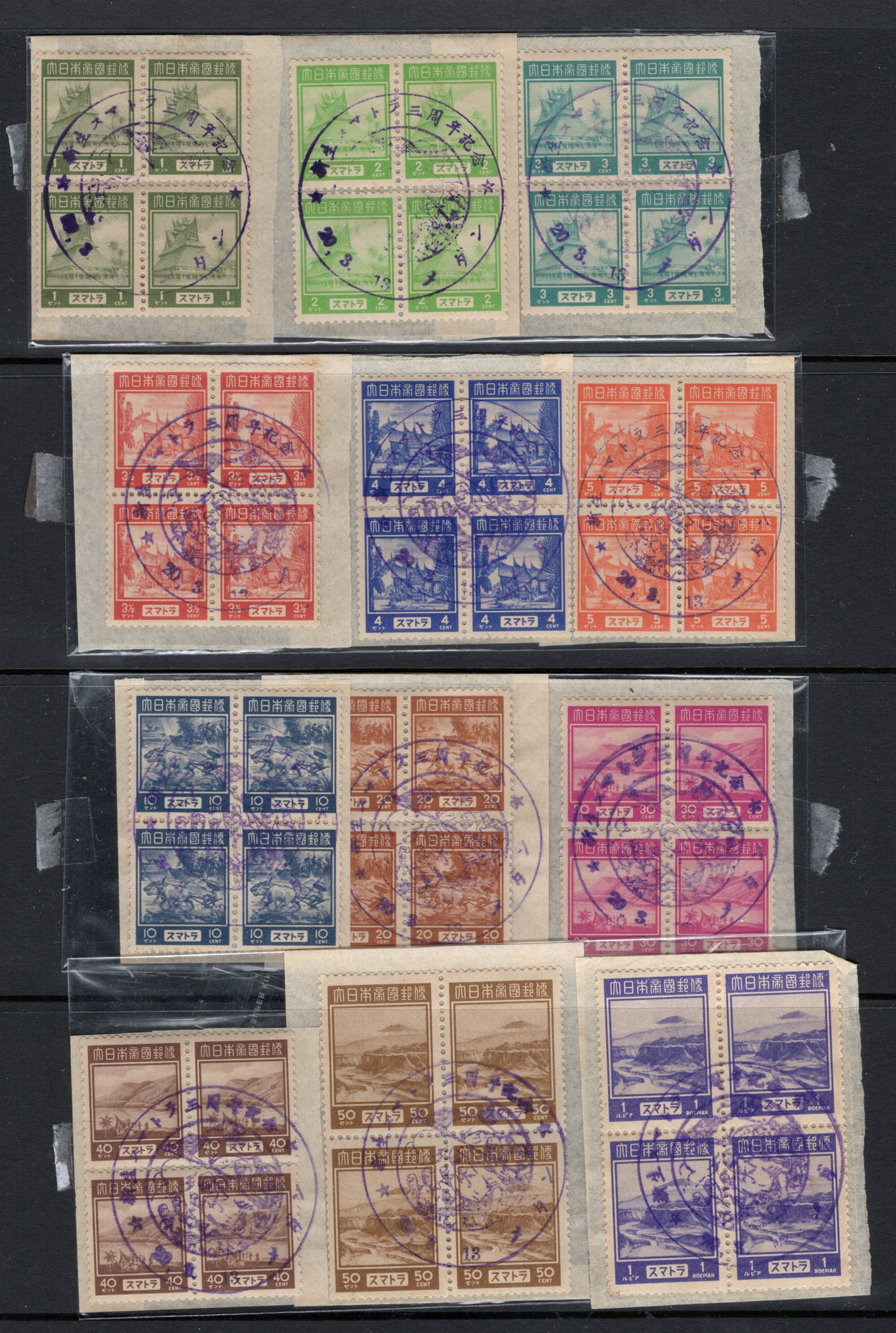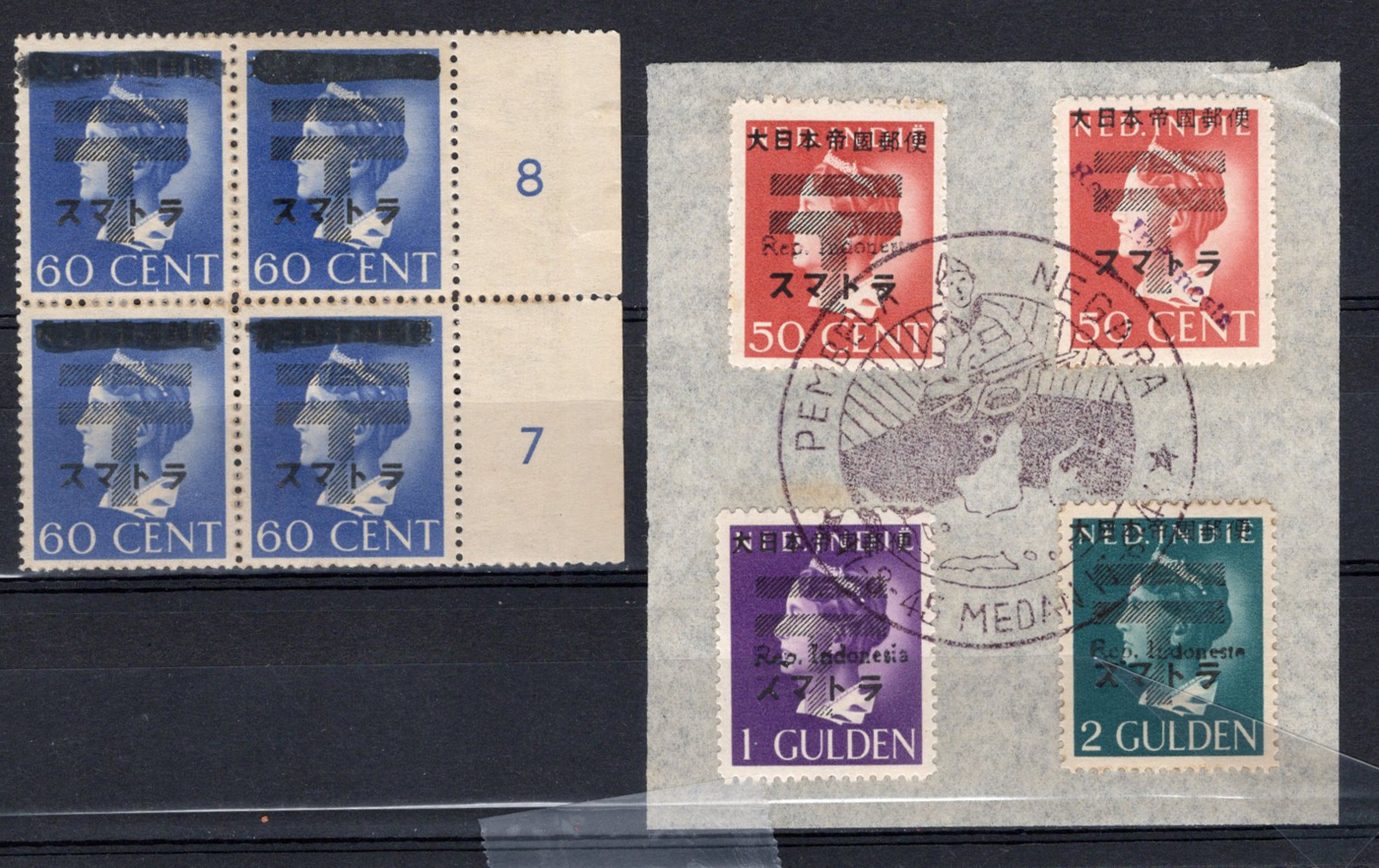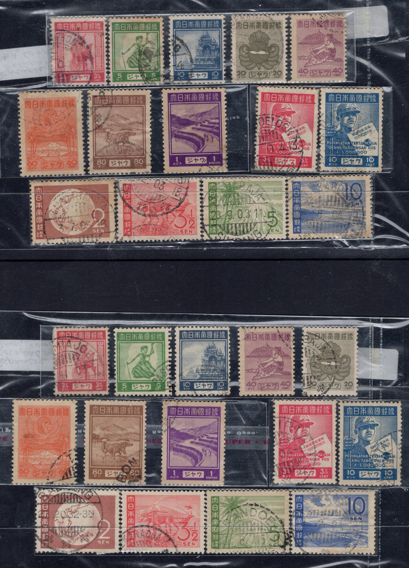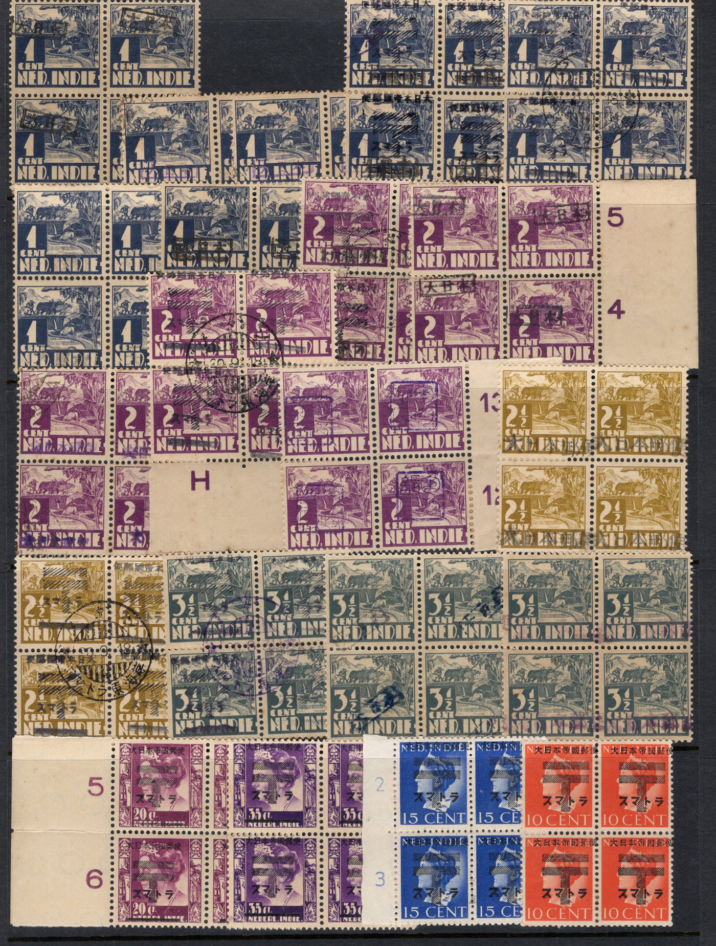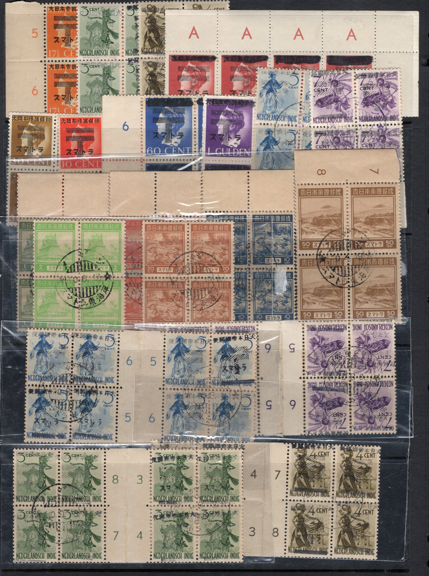 1637 O/nh N1-26, etc. imageGroup of Japanese-Occupied Netherlands Indies Overprints, 1942-1945, a selection of Japanese overprints on Netherlands Indies stamps, as well as Japanese occupation of Java (Dutch East Indies) issues (Scott N1-26), all in singles or blocks of four, both mint and cancelled. We counted 84 different items in all (blocks and multiples counted as one). The overprinted stamps are listed under a footnote only in Scott, the Javanese stamps catalogue over U$137. Overall fine to very fine, all stamps scanned online. (Scan 1) (Scan 2) (Scan 3) (Scan 4) (Scan 5) (All Scans)