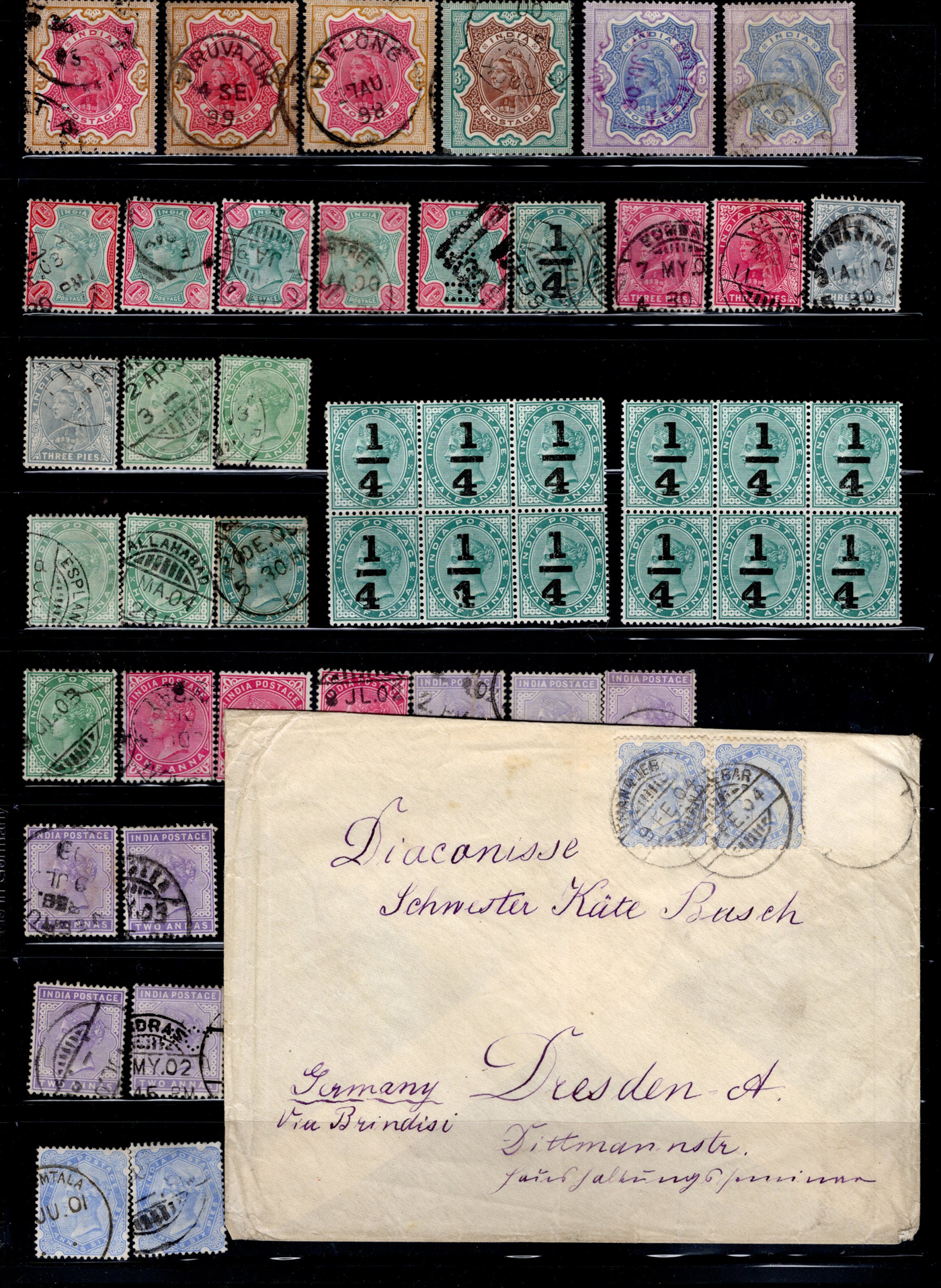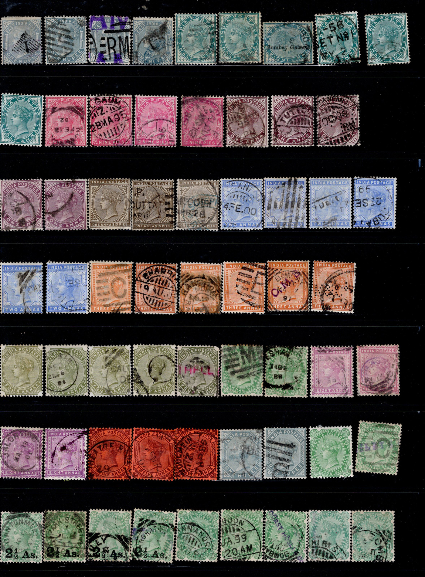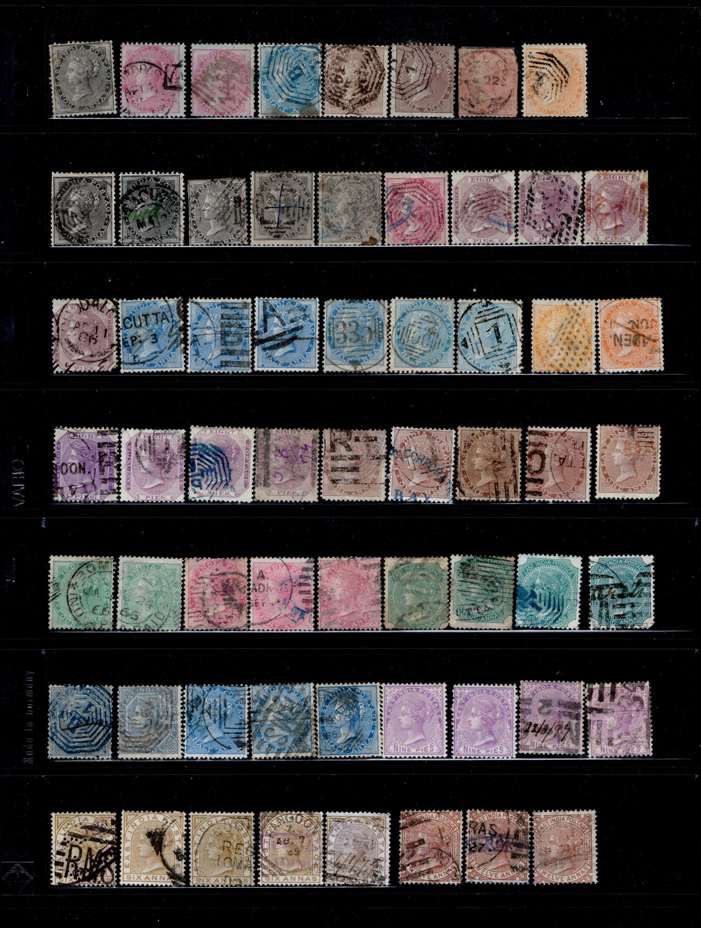 1621 O/og/nh   imageCollection of Mostly Used India on Three Stock Pages, all from the queen Victoria era, with 168 stamps, includes useful duplication for postmarks, shades, etc. Generally fine or better with a 2014 owner's catalogue value of £1,475 in Stanley Gibbons. (Scan 1) (Scan 2) (Scan 3) (All Scans)