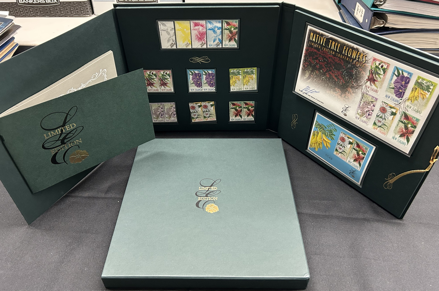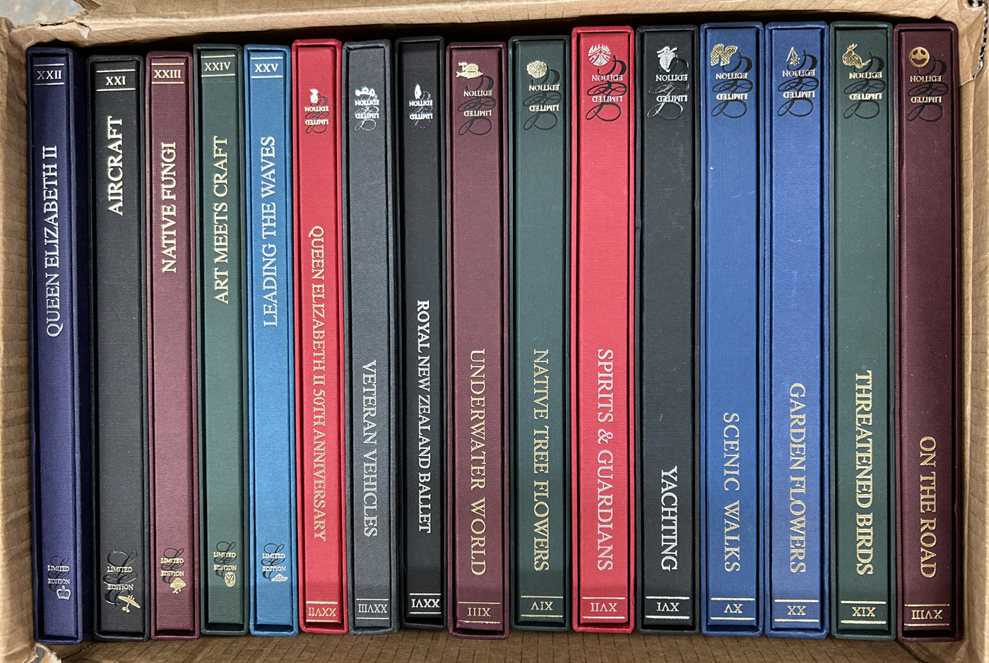 1638 nh   imageCollection of Special "Limited Edition Collector's Packs" Books, with 16 different (volumes 13 to 28), each containing MNH New Zealand stamps on various subjects, for example "Queen Elizabeth II's 50th Anniversary", "Native Tree Flowers", "Royal New Zealand Ballet", etc. The contents vary, but typically include stamps in pairs, souvenir sheets, a FDC, and an information booklet (with production number) and several corner plate blocks. A very well produced group, not often seen or offered. (Scan 1) (Scan 2) (Scan 3) (Scan 4) (All Scans)