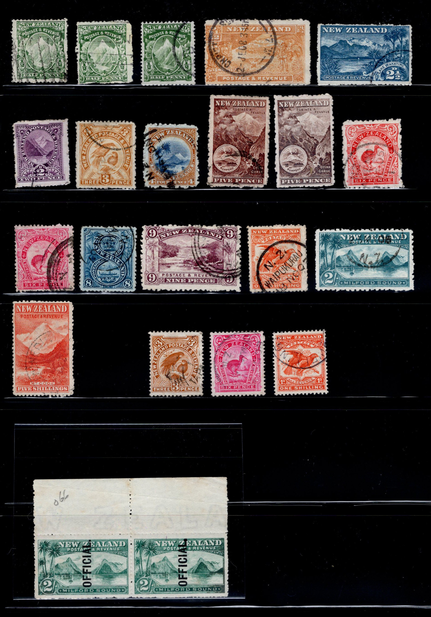 1640 O/og/nh   imageGroup of Mint and Used New Zealand Issues, 1902-1907, with used #s 102, 104, 107-120 (missing 108), plus mint 114a, used 126, 128 and mint upper margin pair of O28 with clear "W ZEALA" of the watermark in the margin (this with toning spots and crease in margin, but NH). Overall fine.