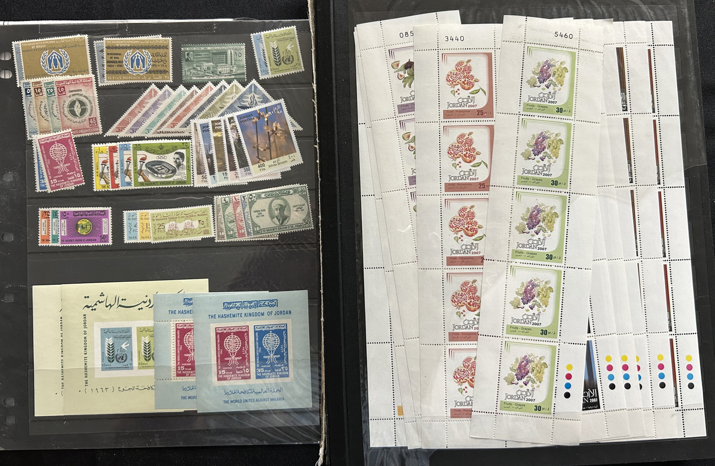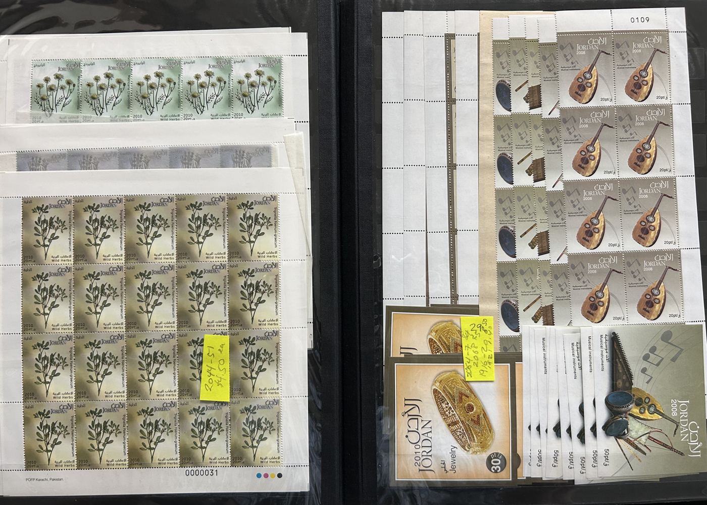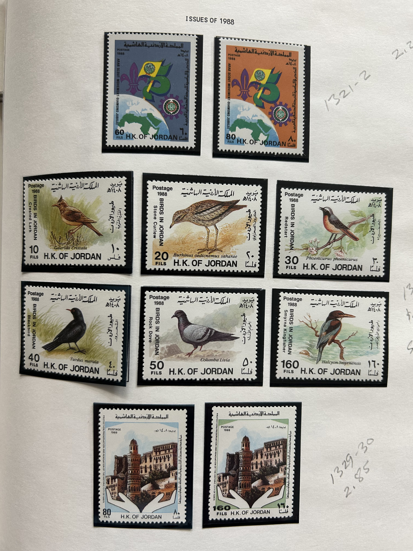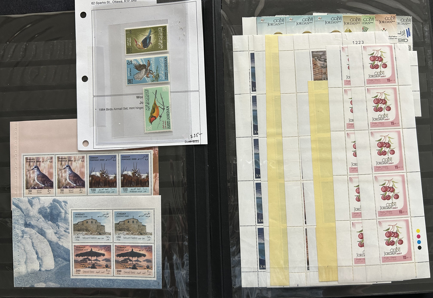 1631 O/og/nh   imageCollections of Mint and Used Jordan, a thick Minkus album contains a collection of 1976-1992 mint and used (and CTO) with a 2013 Scott value (for the NH sets only, of which there are many) of $737 (so likely a lot higher). Also a stockbook with 18 pages crammed full of mint never hinged Jordan new issues from 2007 to 2012, mainly in complete sets and in sheetlets, with souvenir sheets, part sheets, etc, with duplication often of up to 10. Also includes a hinged set of C26-28 ($235) and a stock page with various issues (sets, souvenir sheets, etc.). Overall very fine. (Scan 1) (Scan 2) (Scan 3) (Scan 4) (Scan 5) (Scan 6) (Scan 7) (Scan 8) (Scan 9) (Scan 10) (Scan 11) (Scan 12) (Scan 13) (Scan 14) (Scan 15) (All Scans)
