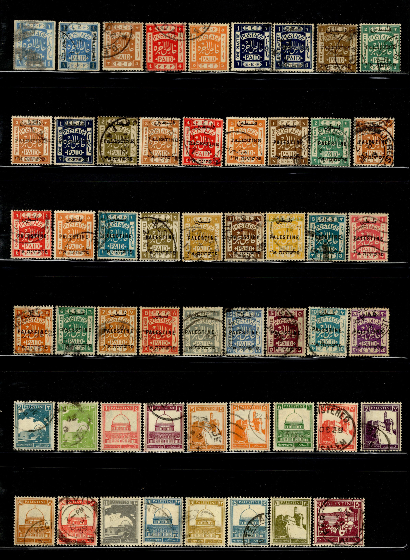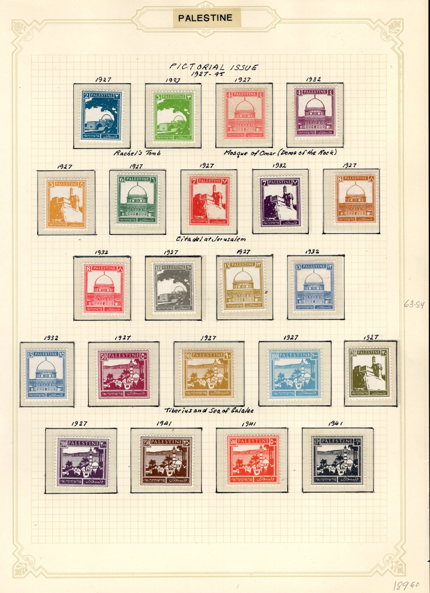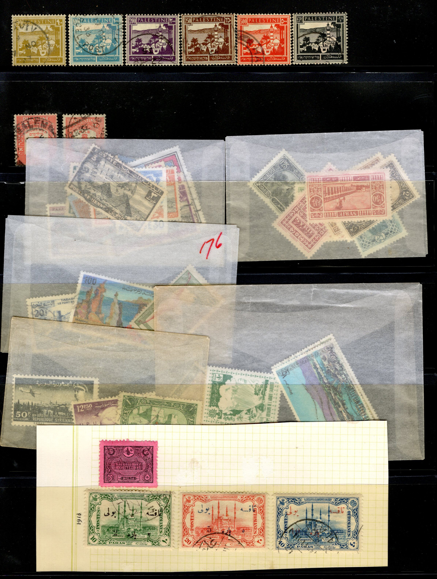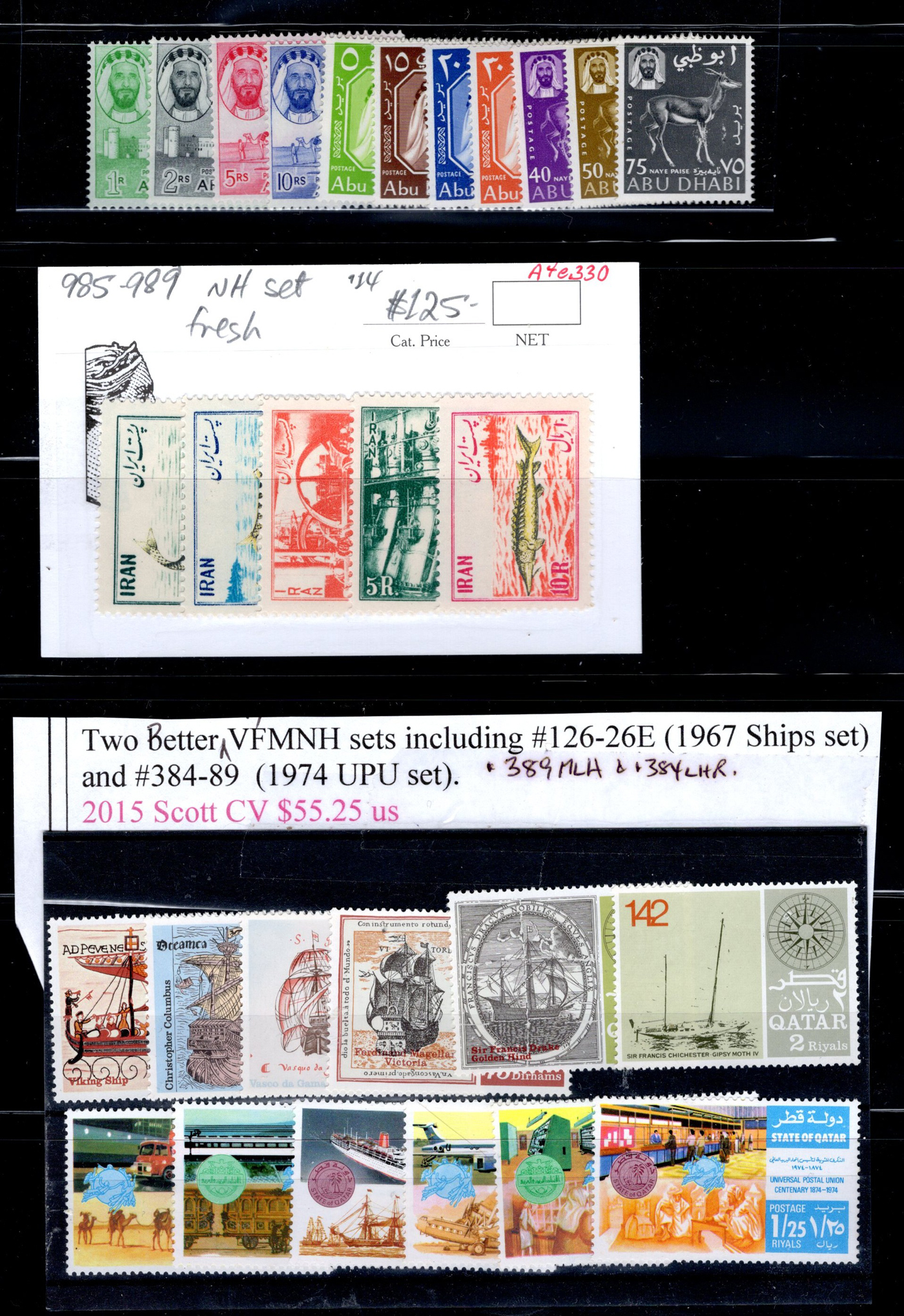 1635 O/og/nh   imageSmall Group of Various Middle East County Sets, Oman #1-15 (mint, $19), 16-24 (mint, $56), 35-41 (mint, $67), Palestine #63-84 (mint, $219), Abu Dhabi #1-11 (NH, $95), Iran #985-989 (NH, $175), Qatar #126-126E, 384-89 (H/NH, $54) also a double-sided stock page, with one side filled with Palestine issues and the other with various countries in glassines. (Scan 1) (Scan 2) (Scan 3) (Scan 4) (Scan 5) (Scan 6) (All Scans)