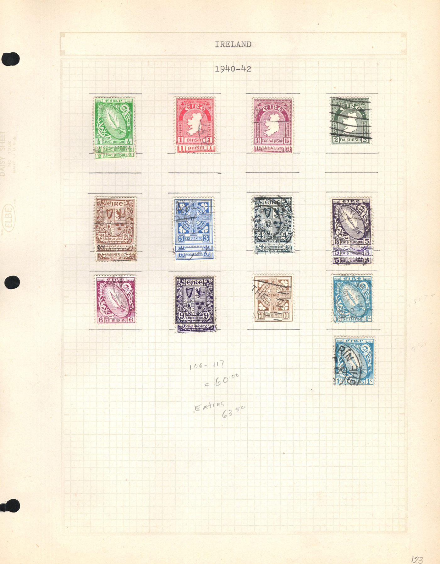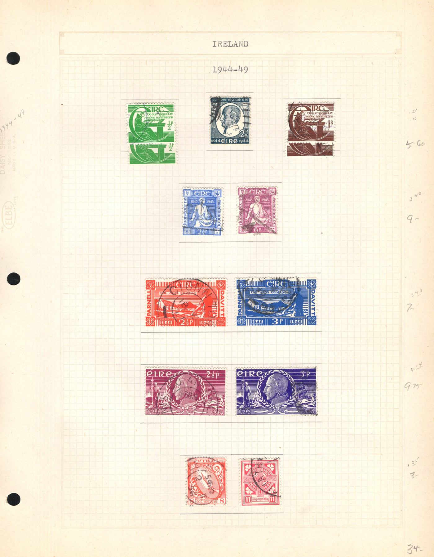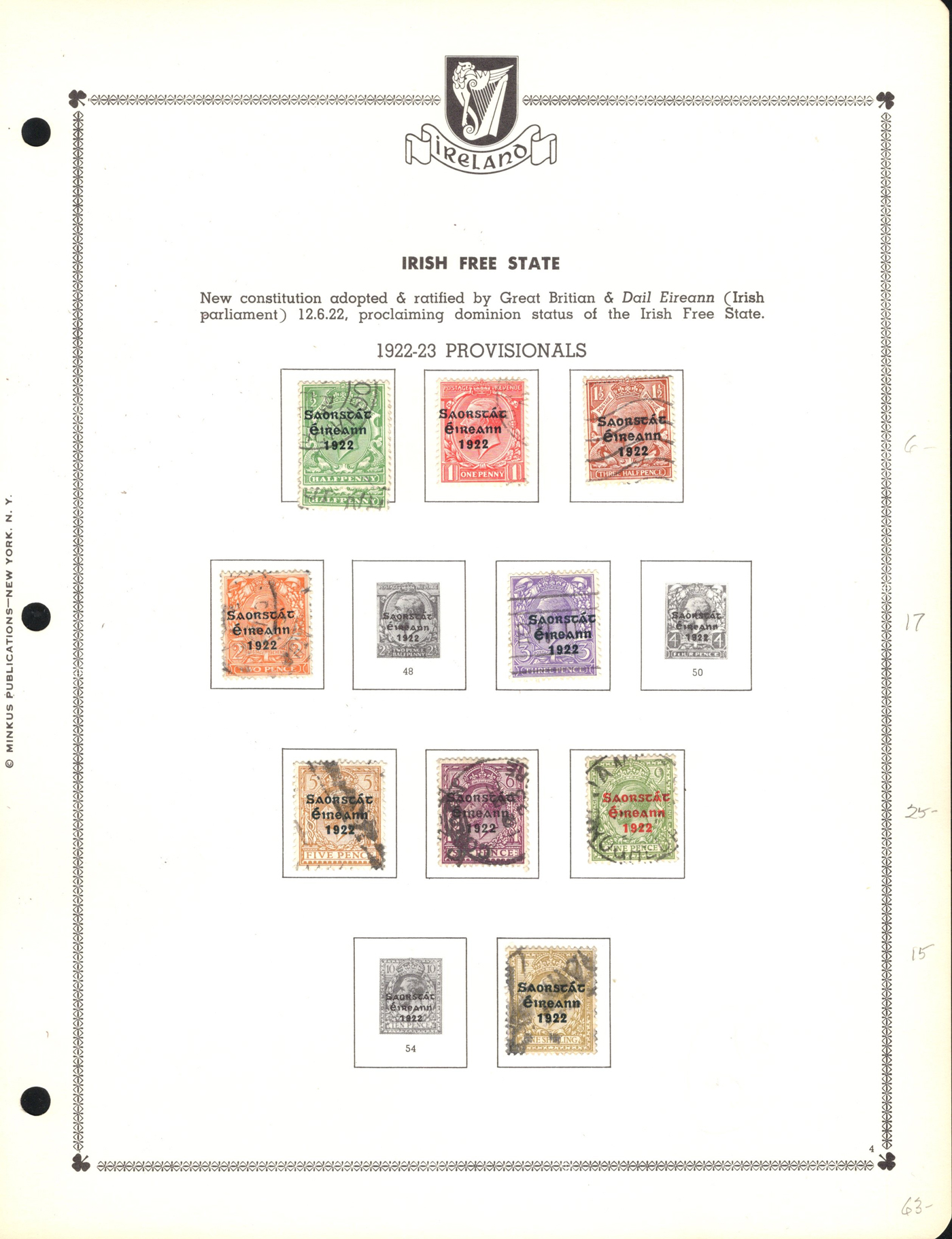 1625 O   imageTwo Collections of Used Ireland in a Binder, both with slight duplication, the first is on quadrille pages (1922-1980, c.v. U$780), and the second is on Minkus pages (1922-1946, c.v. U$415). Also includes two stock pages with various issues, noting a used #77, etc. Overall fine or better, catalogue values are from 2014. (Scan 1) (Scan 2) (Scan 3) (Scan 4) (Scan 5) (Scan 6) (Scan 7) (Scan 8) (Scan 9) (All Scans)
