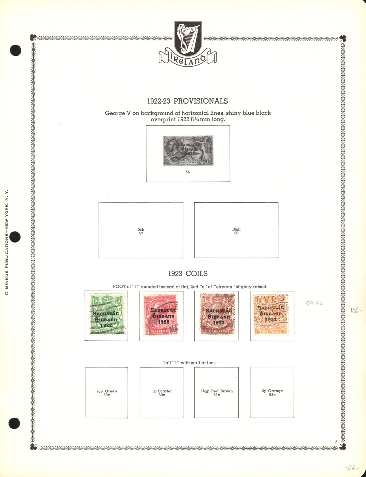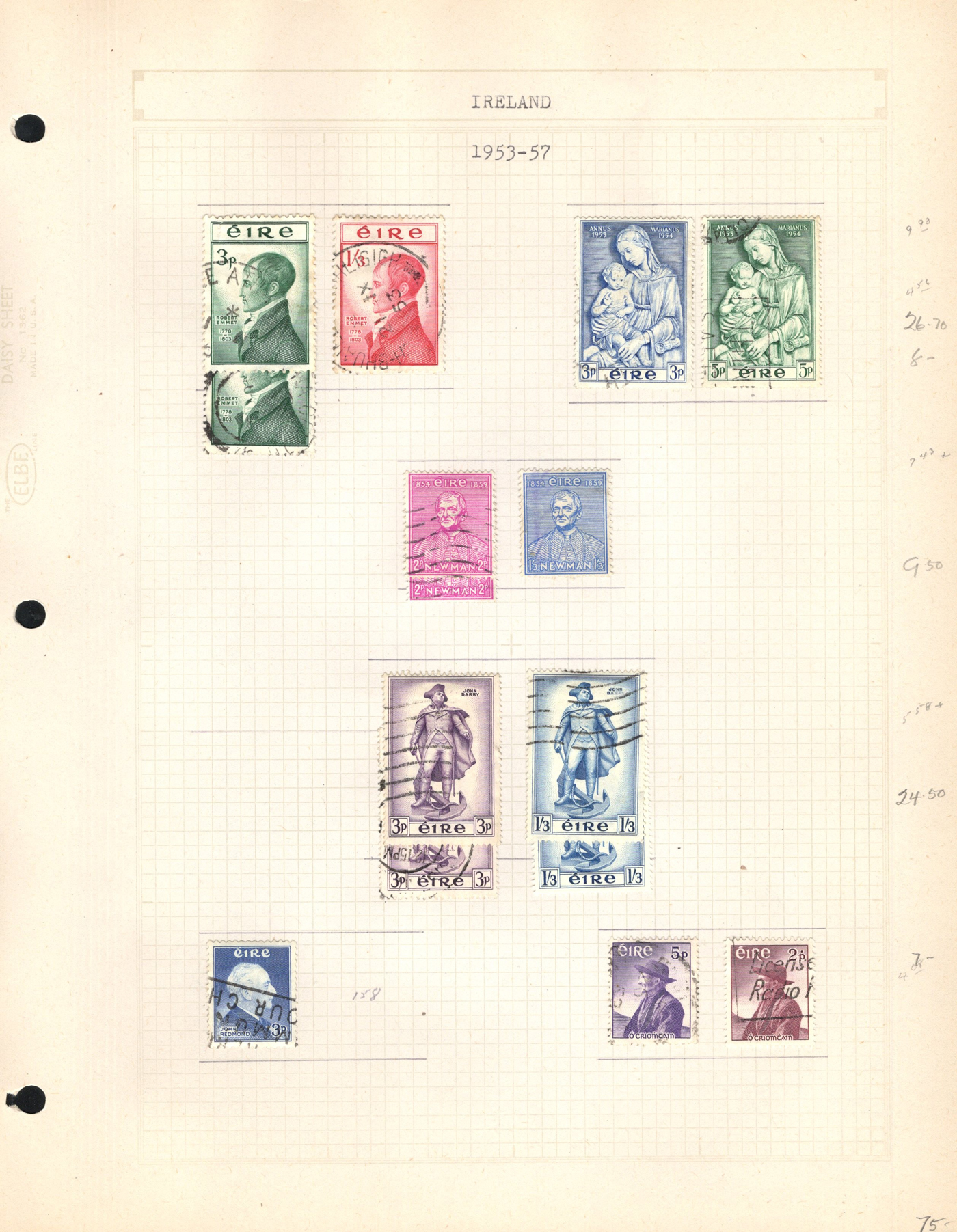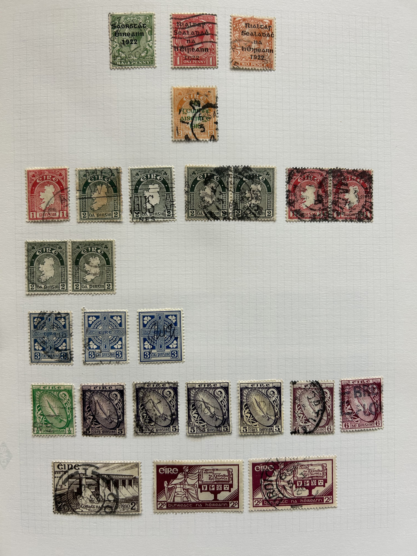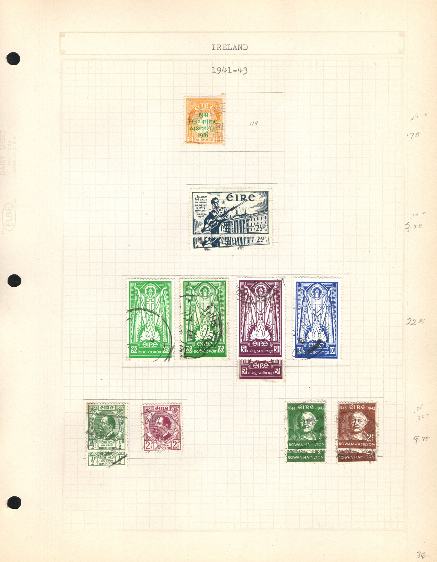 1625 O   imageTwo Collections of Used Ireland in a Binder, both with slight duplication, the first is on quadrille pages (1922-1980, c.v. U$780), and the second is on Minkus pages (1922-1946, c.v. U$415). Also includes two stock pages with various issues, noting a used #77, etc. Overall fine or better, catalogue values are from 2014. (Scan 1) (Scan 2) (Scan 3) (Scan 4) (Scan 5) (Scan 6) (Scan 7) (Scan 8) (Scan 9) (All Scans)