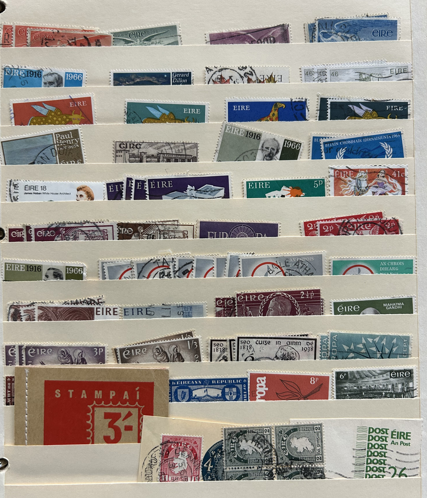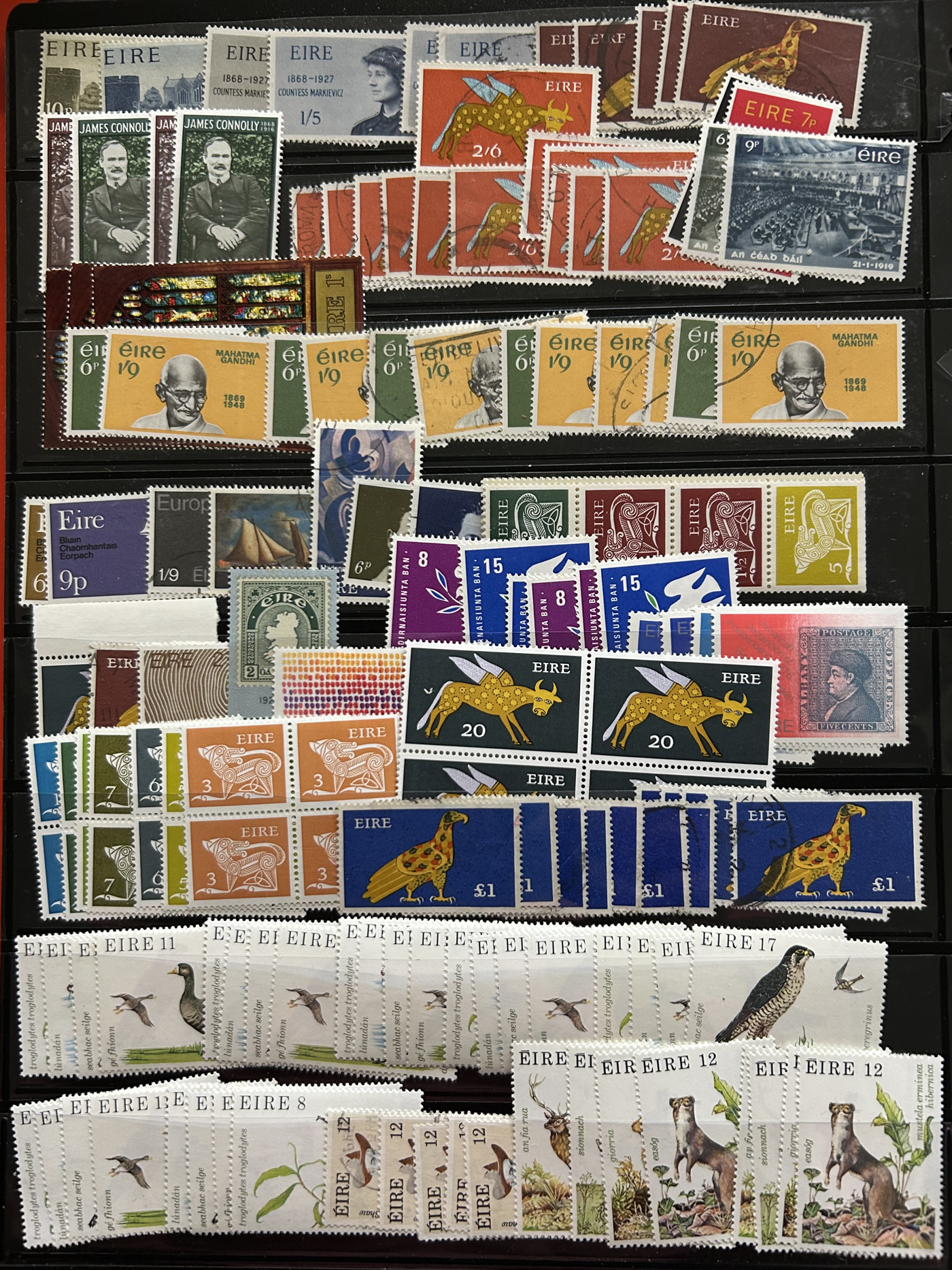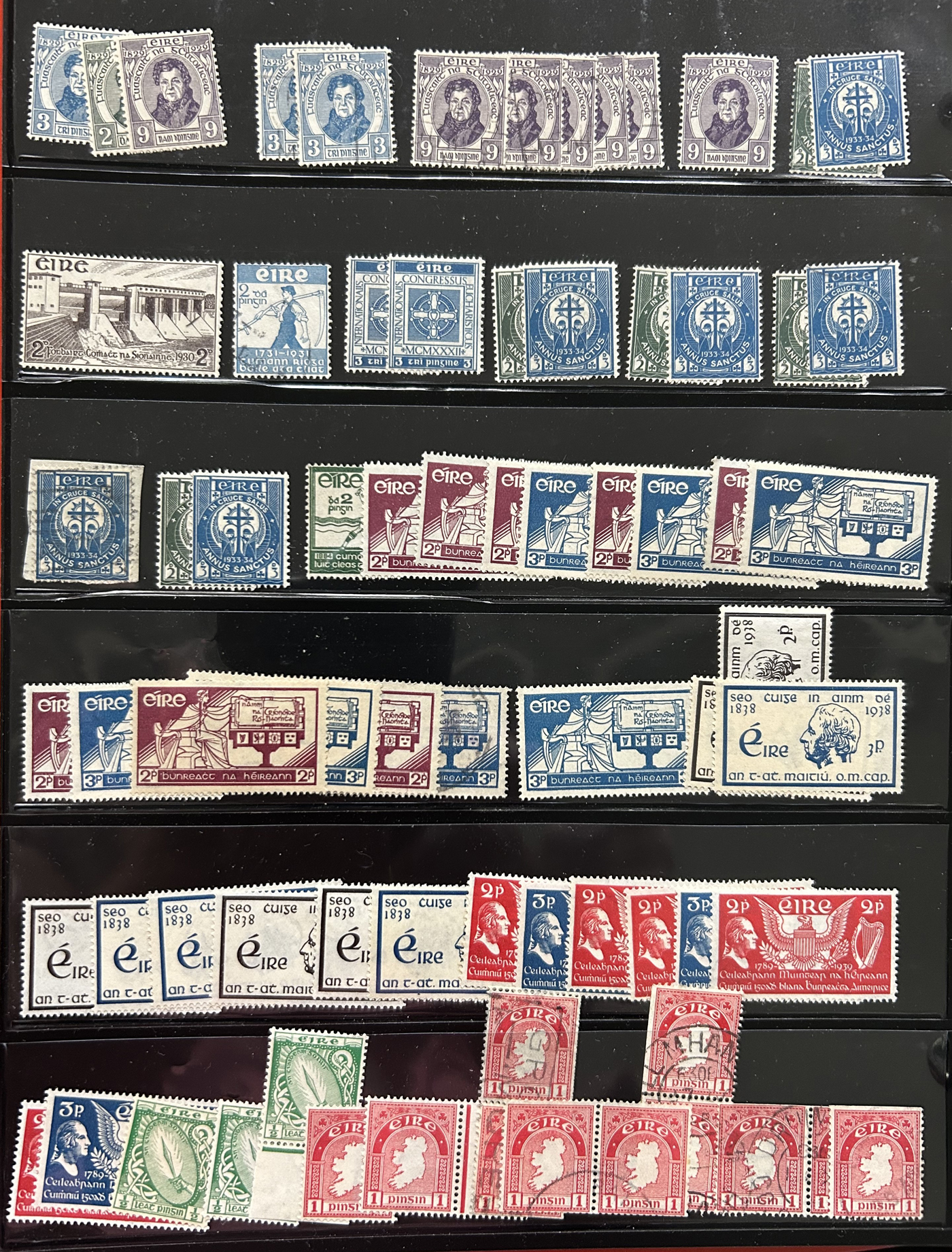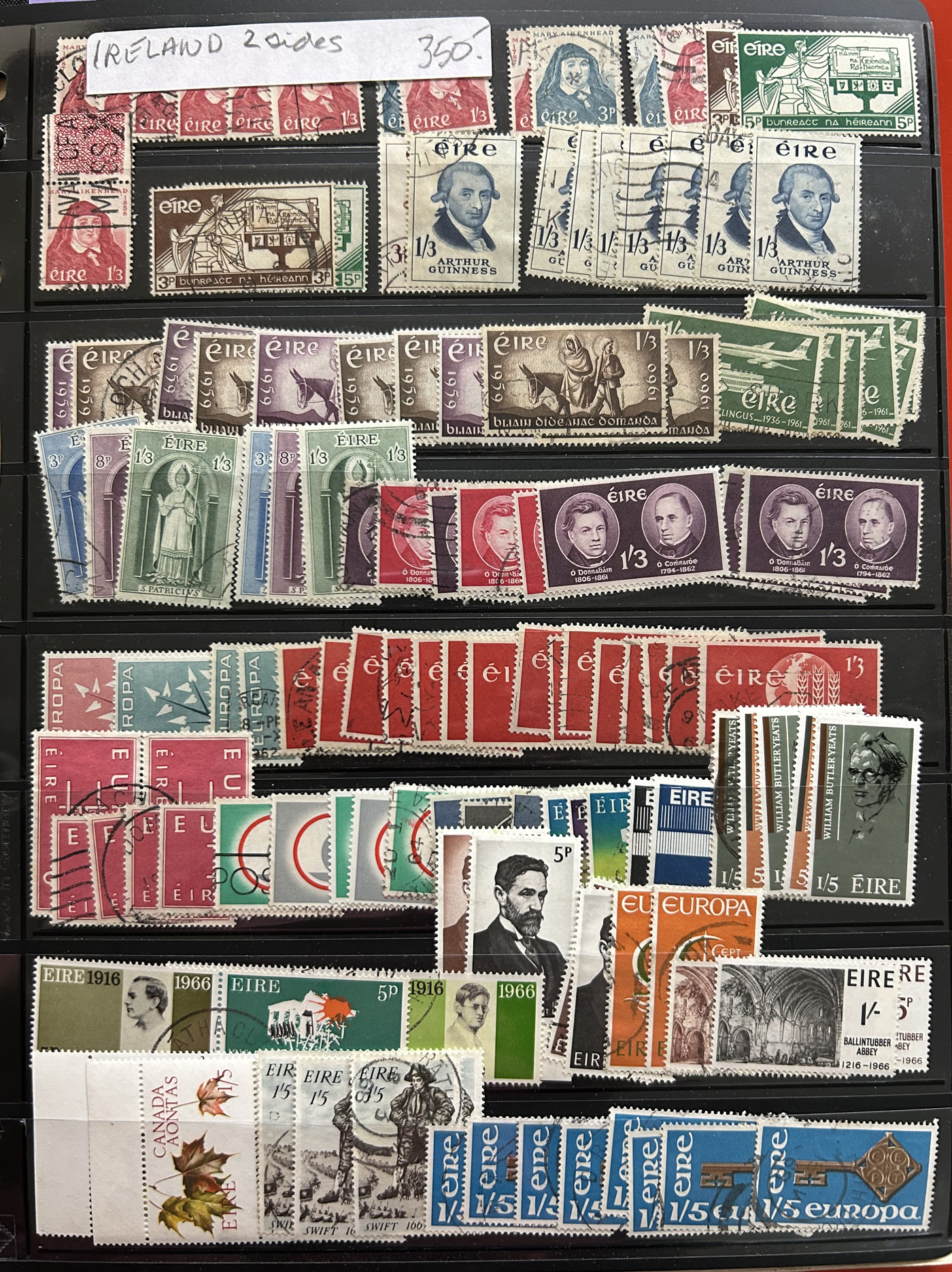 1628 O/og   imageGroup of Mint and Used Ireland Collections / Stock, a stockbook contains 5 pages of mint NH from from the 1960s and 1970s (228 diff. stamps). A binder contains 35 approval pages full of mainly used Ireland appearing to be all different. Two stockbooks contain a mint and used collection from 1922 to 1996 (hundreds of stamps) plus three collections / stock of early used on 8 stock pages with a high catalogue value and a dealer asking price of $1,040 ($365, $350 and $325). Generally fine or better. (Scan 1) (Scan 2) (Scan 3) (Scan 4) (Scan 5) (Scan 6) (Scan 7) (Scan 8) (Scan 9) (Scan 10) (Scan 11) (Scan 12) (Scan 13) (All Scans)