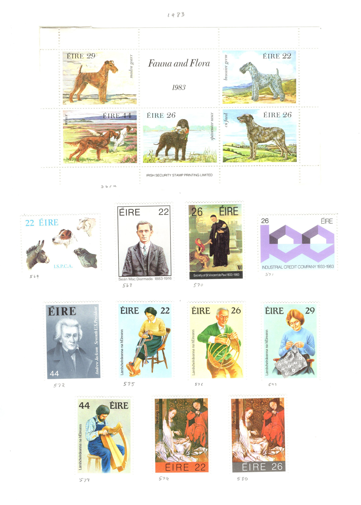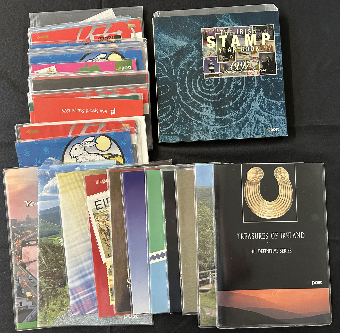 1629 O/og/nh   imageHundreds of Mint and Used Ireland, in two binders, a stockbook and 38 Annual / Special collection presentation folders. The stockbook contains several hundreds of identified duplicated used issues (1922-2009) the presentation folders range from the 1970s to 1998, and the two binders contain a used collection on Minkus pages, a used collection on Scott pages, followed by a clean stock of many hundreds of duplicated issues to 1991. Overall fine or better. (Scan 1) (Scan 2) (Scan 3) (Scan 4) (Scan 5) (Scan 6) (Scan 7) (Scan 8) (Scan 9) (Scan 10) (All Scans)