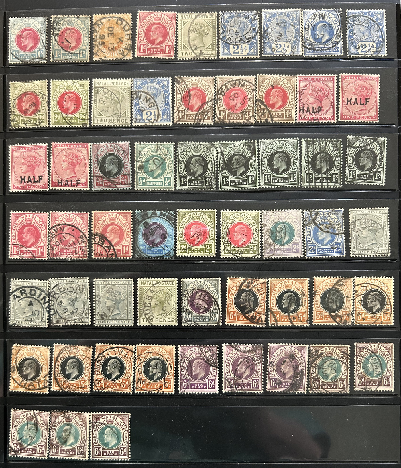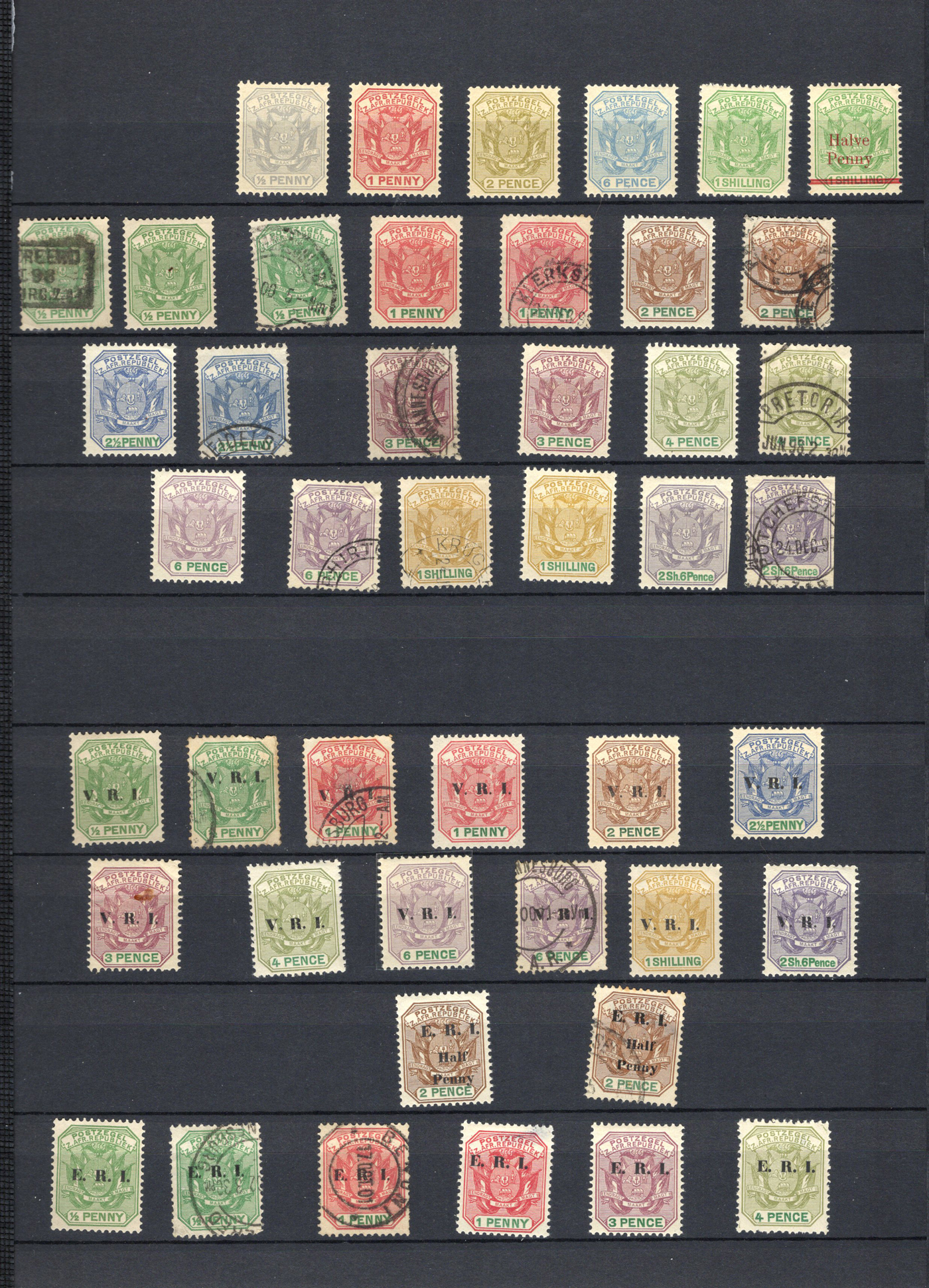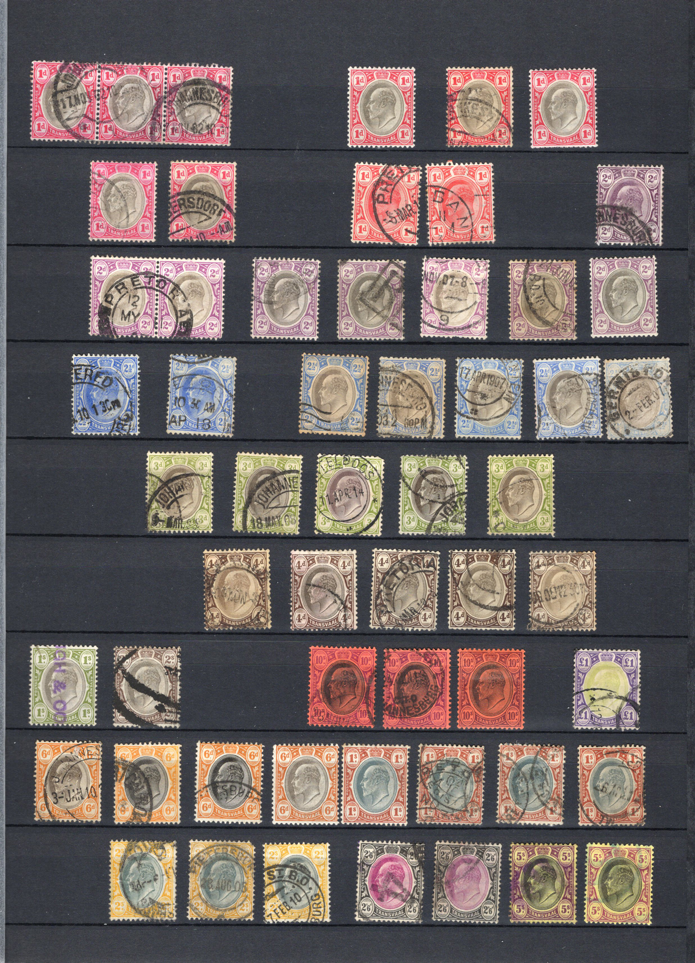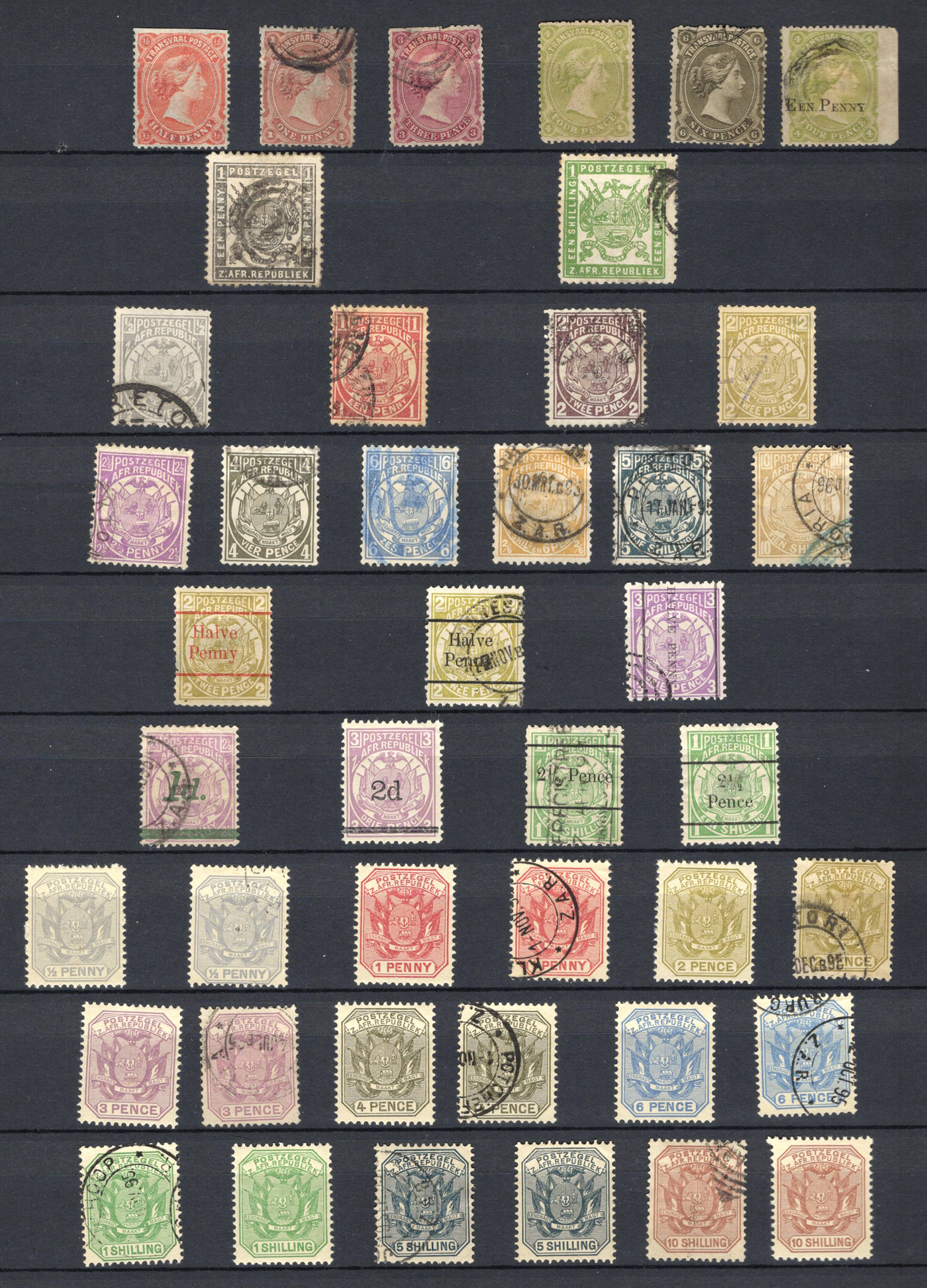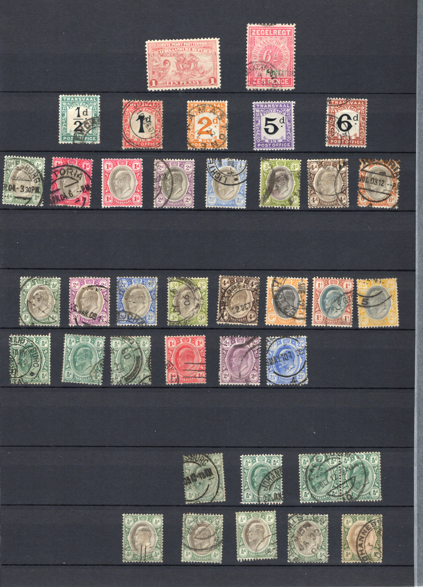 1660 O   imageCollection of Used Transvaal, 1878-1910, displayed on 4 stockbook pages, starting with the Queen Victoria issues (mostly used), followed by a good showing of the Coat of Arms issues (often with a mint and a used example), including surcharges and overprints, ending with two pages of used King Edward VII issues (from all printings), and a short set of used Postage Dues. Good lot for the specialist, with good postmark interest, etc. Overall fine to very fine. (Scan 1) (Scan 2) (Scan 3) (Scan 4) (All Scans)