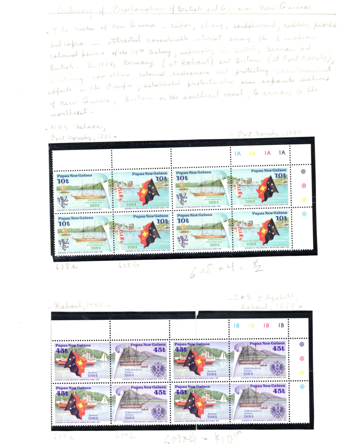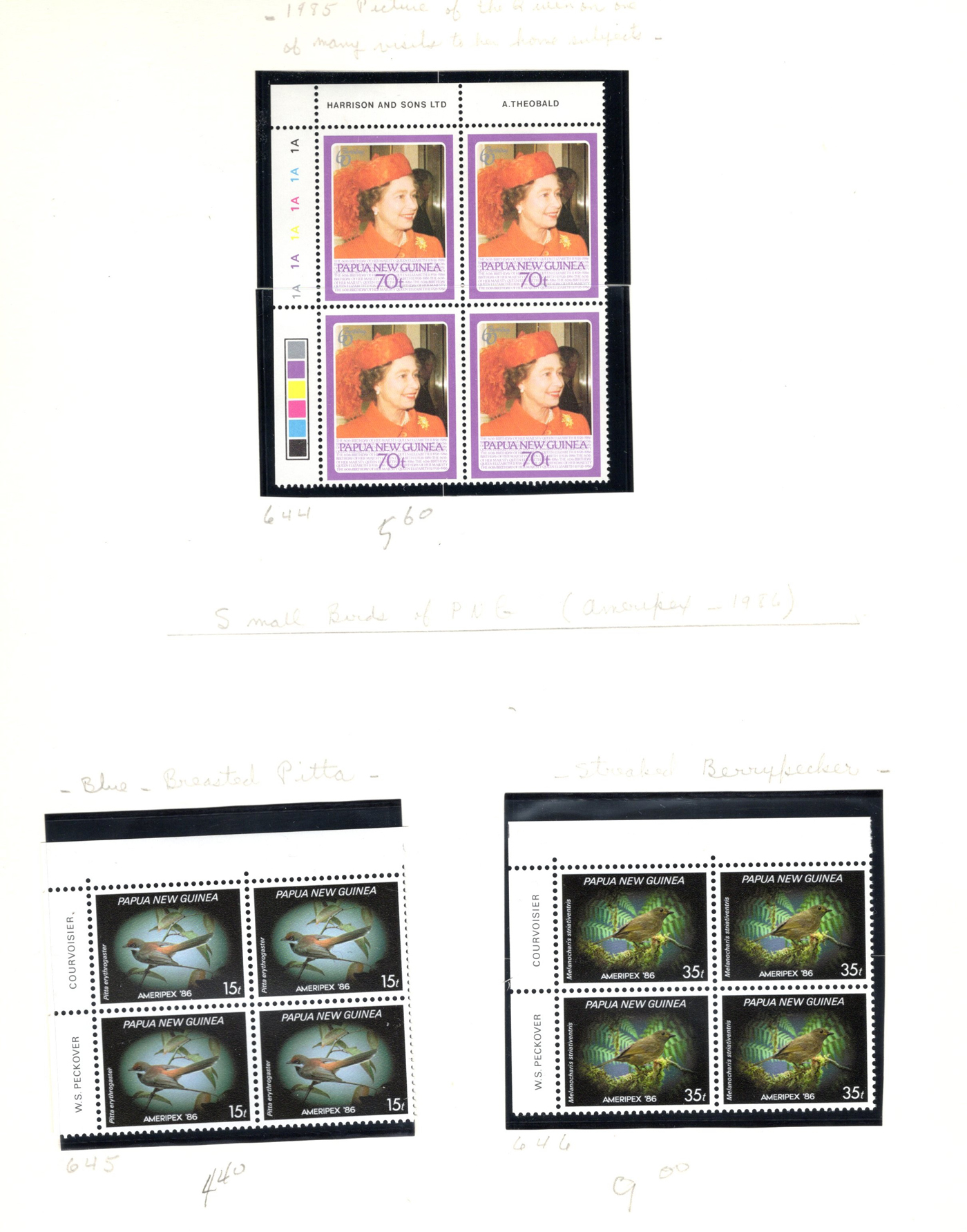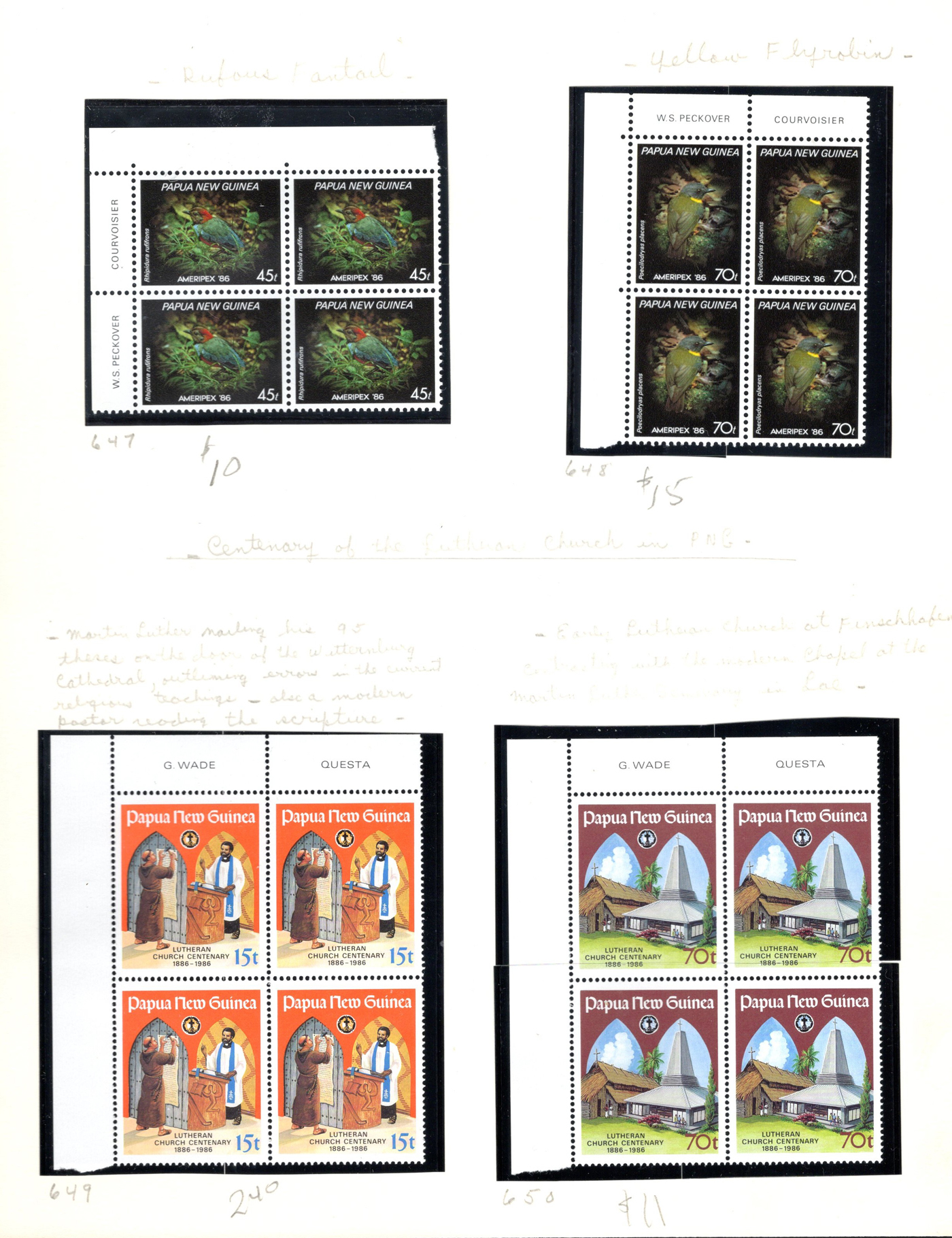 1648 nh   imageCollection of Mint Never Hinged Papua New Guinea, 1973 to 1989, displayed in black mounts on home made pages filling a thick binder. These were purchased as new issues from the PNG Philatelic Bureau (includes 11 envelopes from there with stamps not yet mounted in collection). Appears very close to complete in period, mainly in blocks of four (or larger) or corner plate blocks of four. A fresh and very fine collection, with a 2013 owner's catalogue value of just over U$1,100. Photos are representative. (Scan 1) (Scan 2) (Scan 3) (Scan 4) (Scan 5) (Scan 6) (Scan 7) (All Scans)
