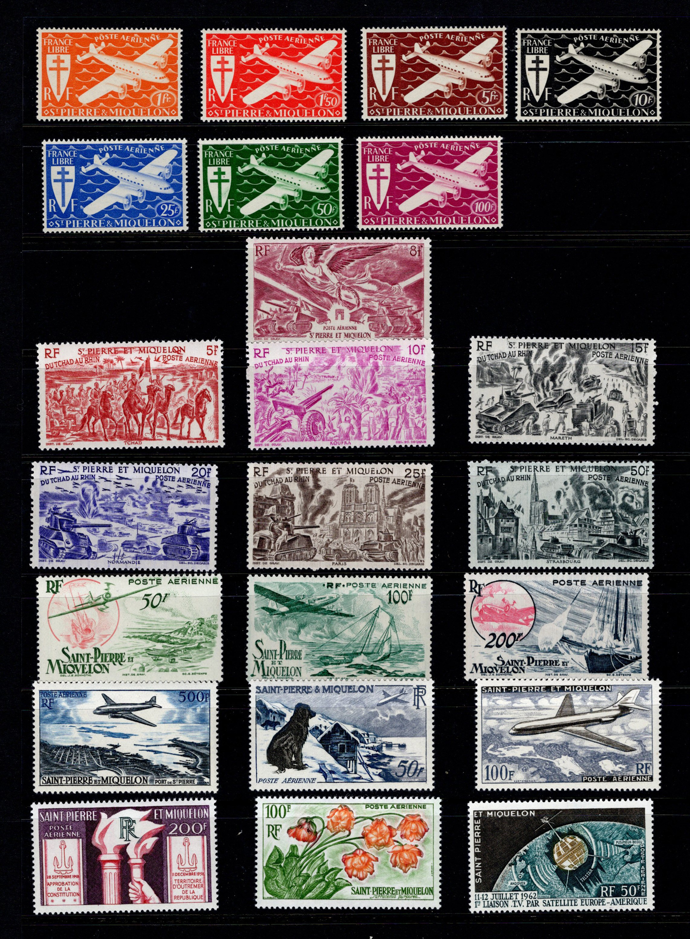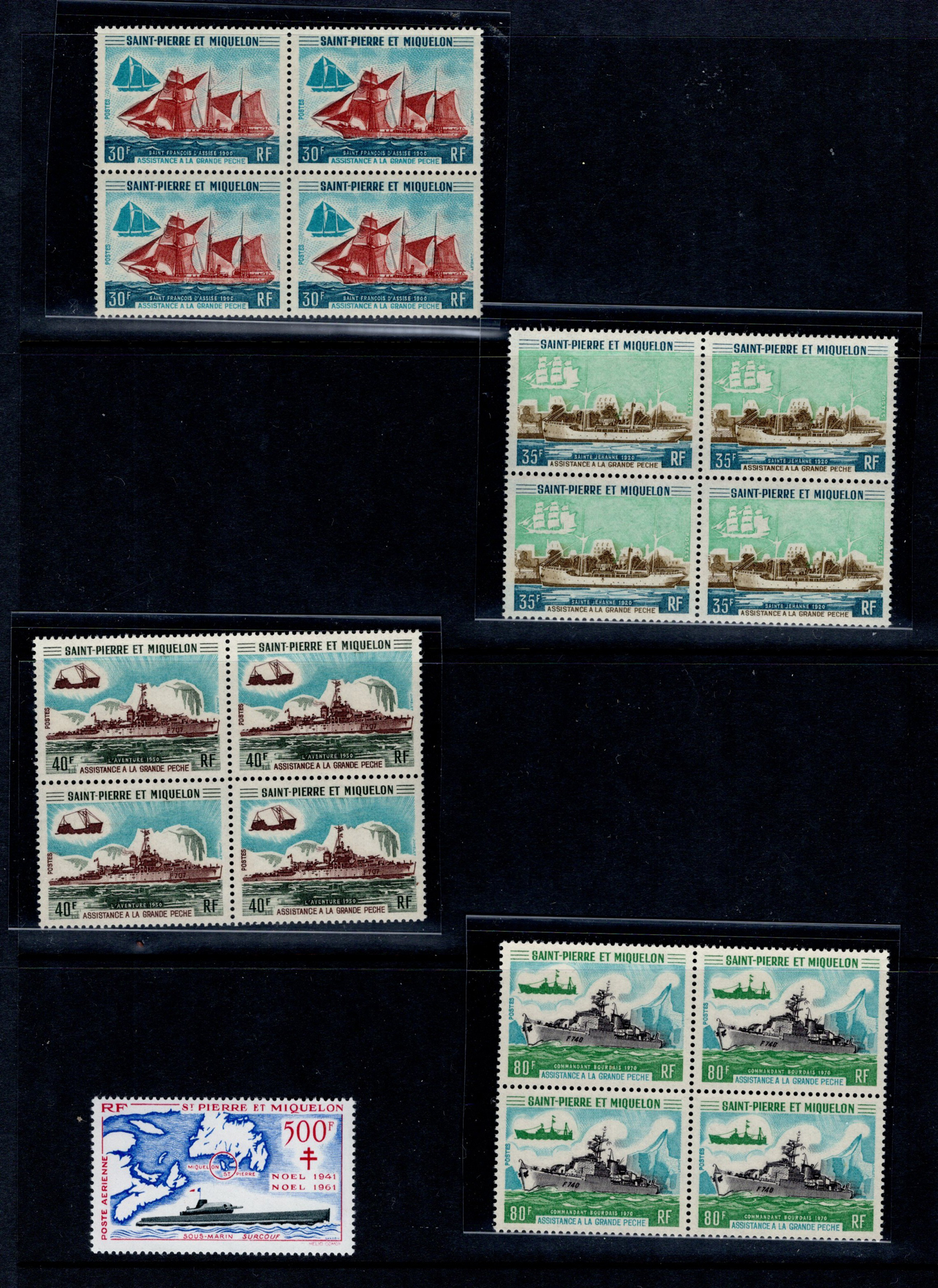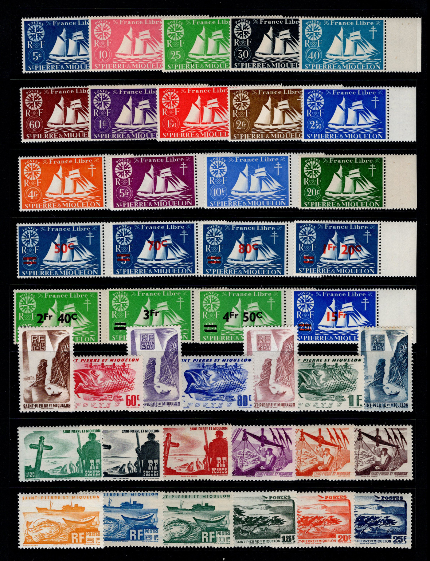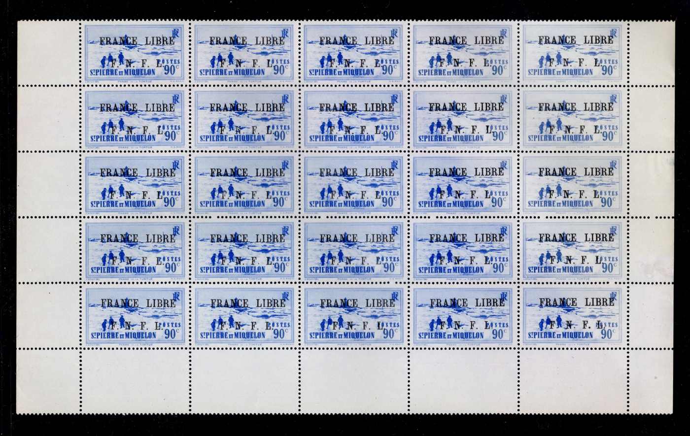 1651 og/nh   imageGroup of Mint St Pierre & Miquelon Issues, very lightly hinged unless noted, with Scott #s 238 (NH pane of 25, c.v. $525), 300-13, 324-42, 324-42, 408-11 (in NH blocks of four, $800), C1-17, C20-26. Fresh and generally very fine. (Scan 1) (Scan 2) (Scan 3) (Scan 4) (All Scans)
