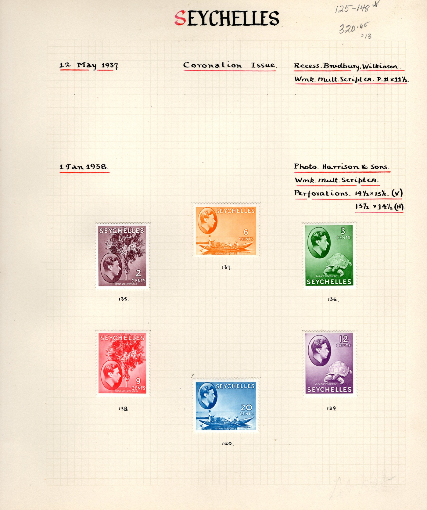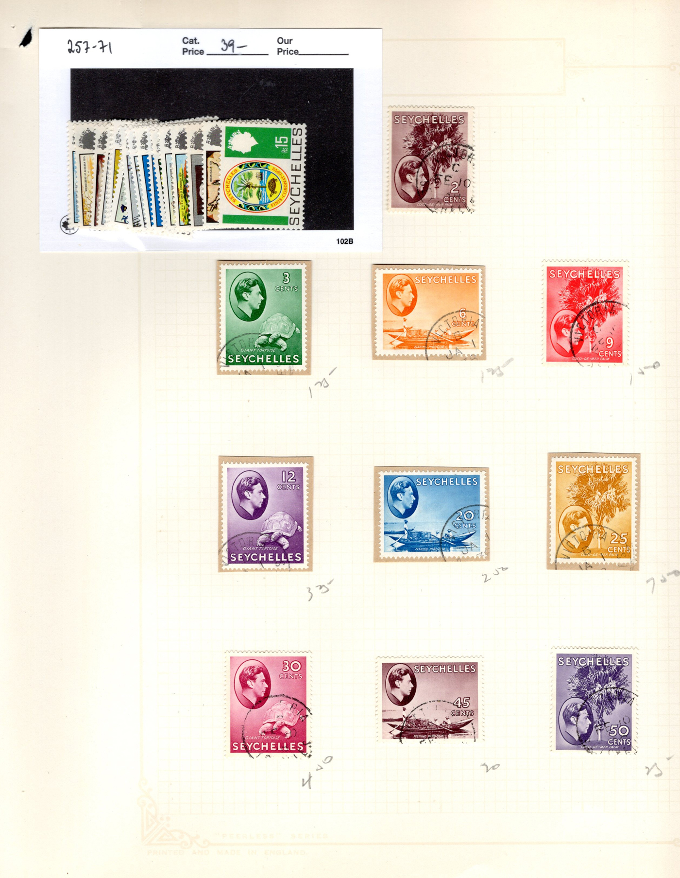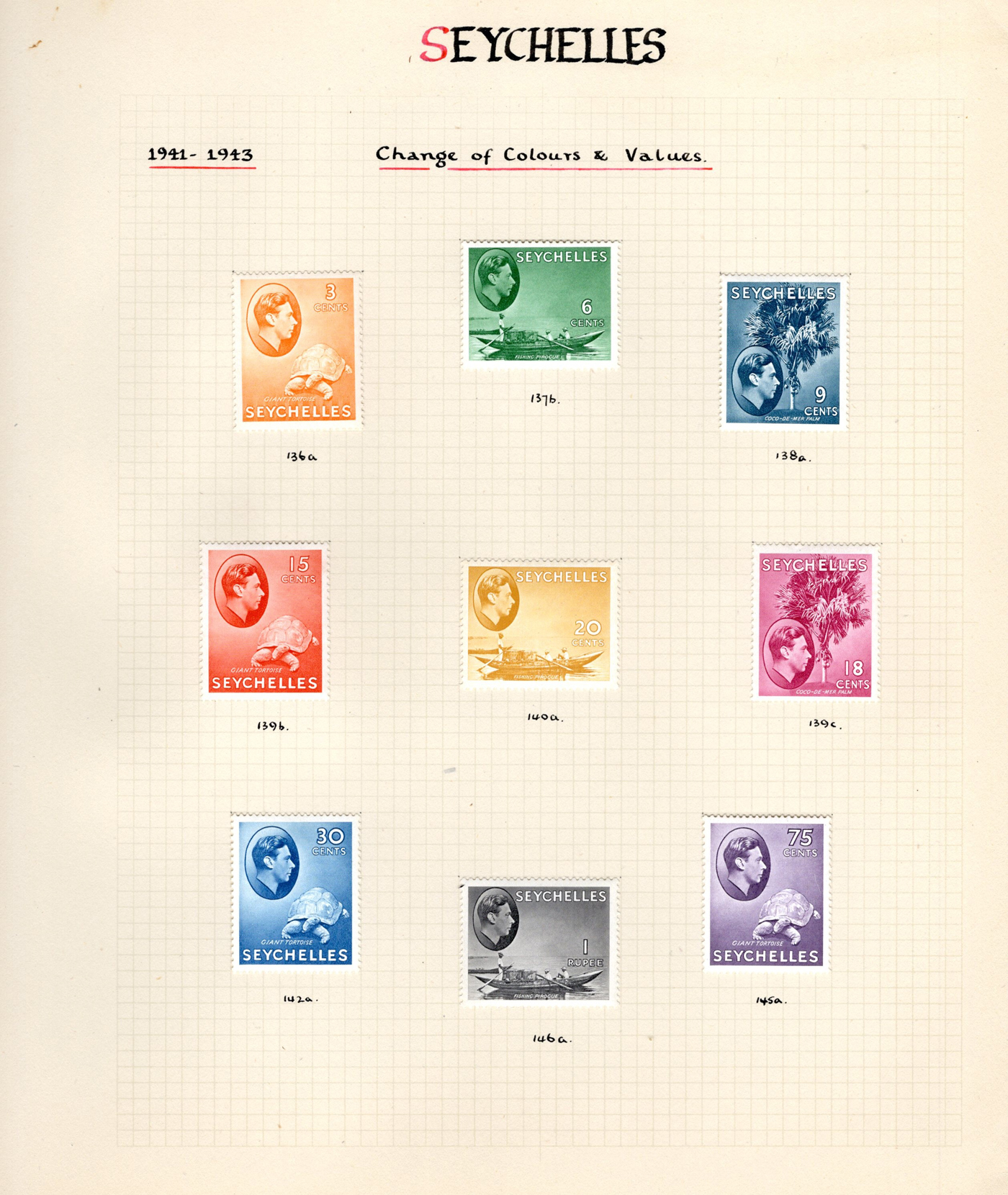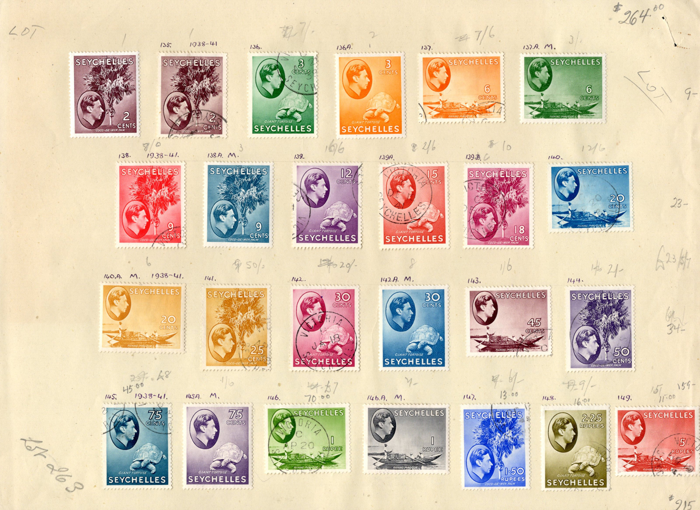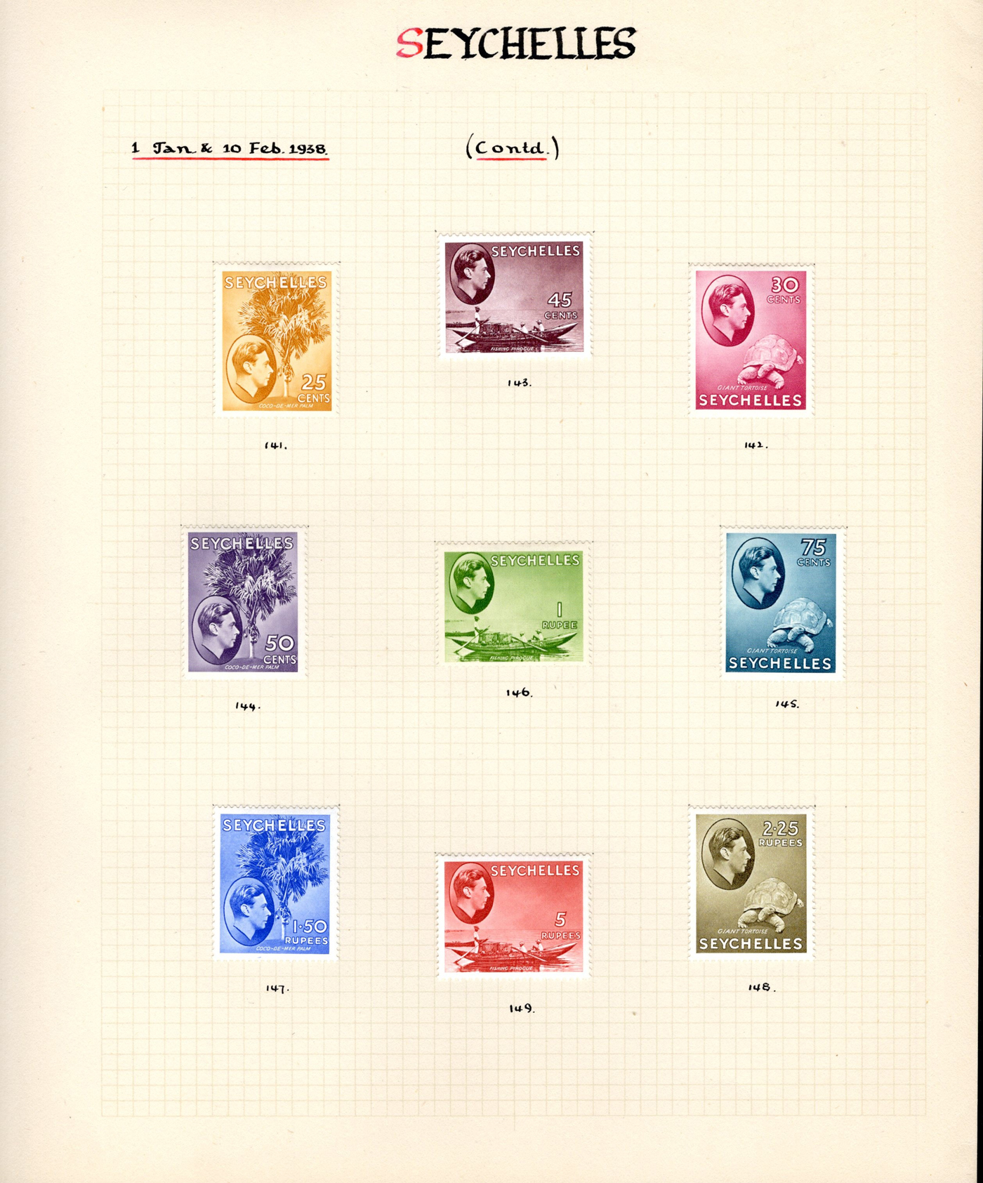 1655 O/og/nh 125-148a, 257-271 imageGroup of KGVI and Early QEII Seychelles Definitives, an old time collection on 5 pages containing the 2c to 5r King George VI issues, with colour changes, etc. including # 145-148 mint, plus extra copies in used condition for a total of 59 stamps. Also includes #s 257-271 in mint never hinged condition. An overall fine-very fine collection. (Scan 1) (Scan 2) (Scan 3) (Scan 4) (Scan 5) (All Scans)