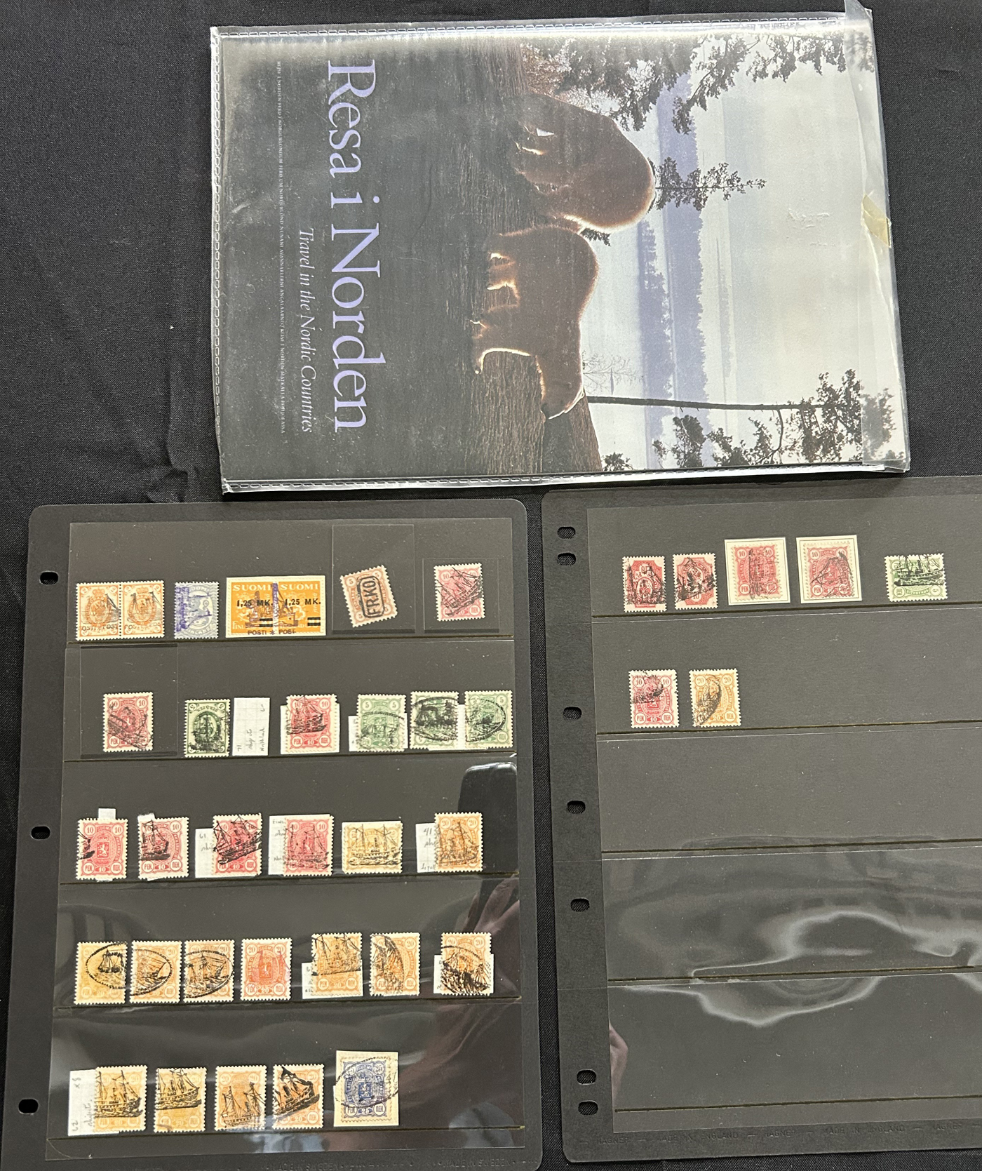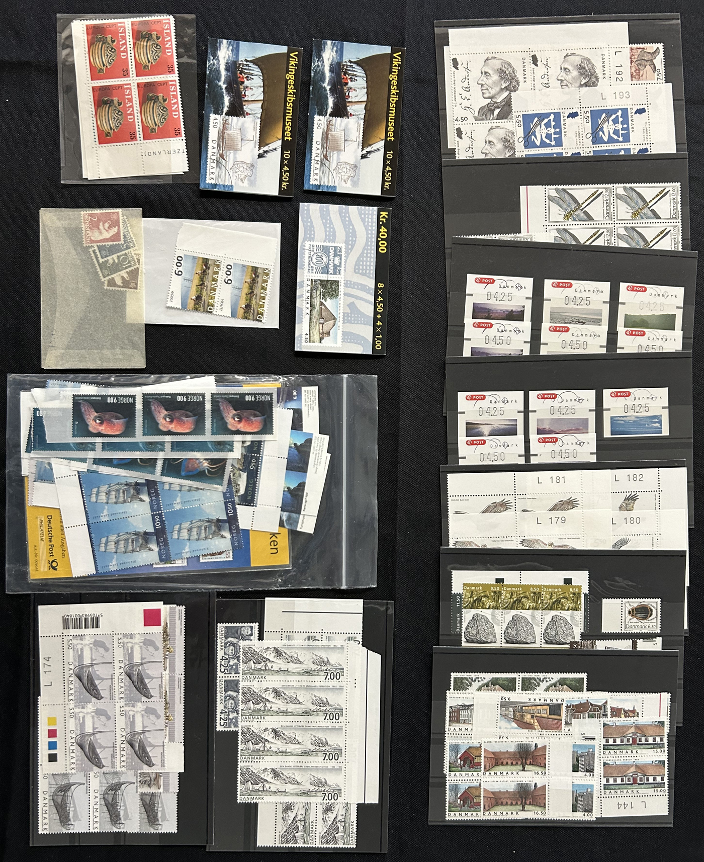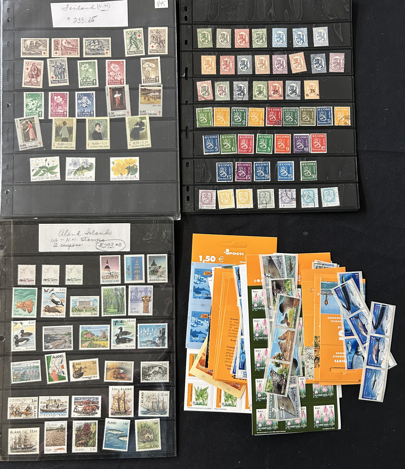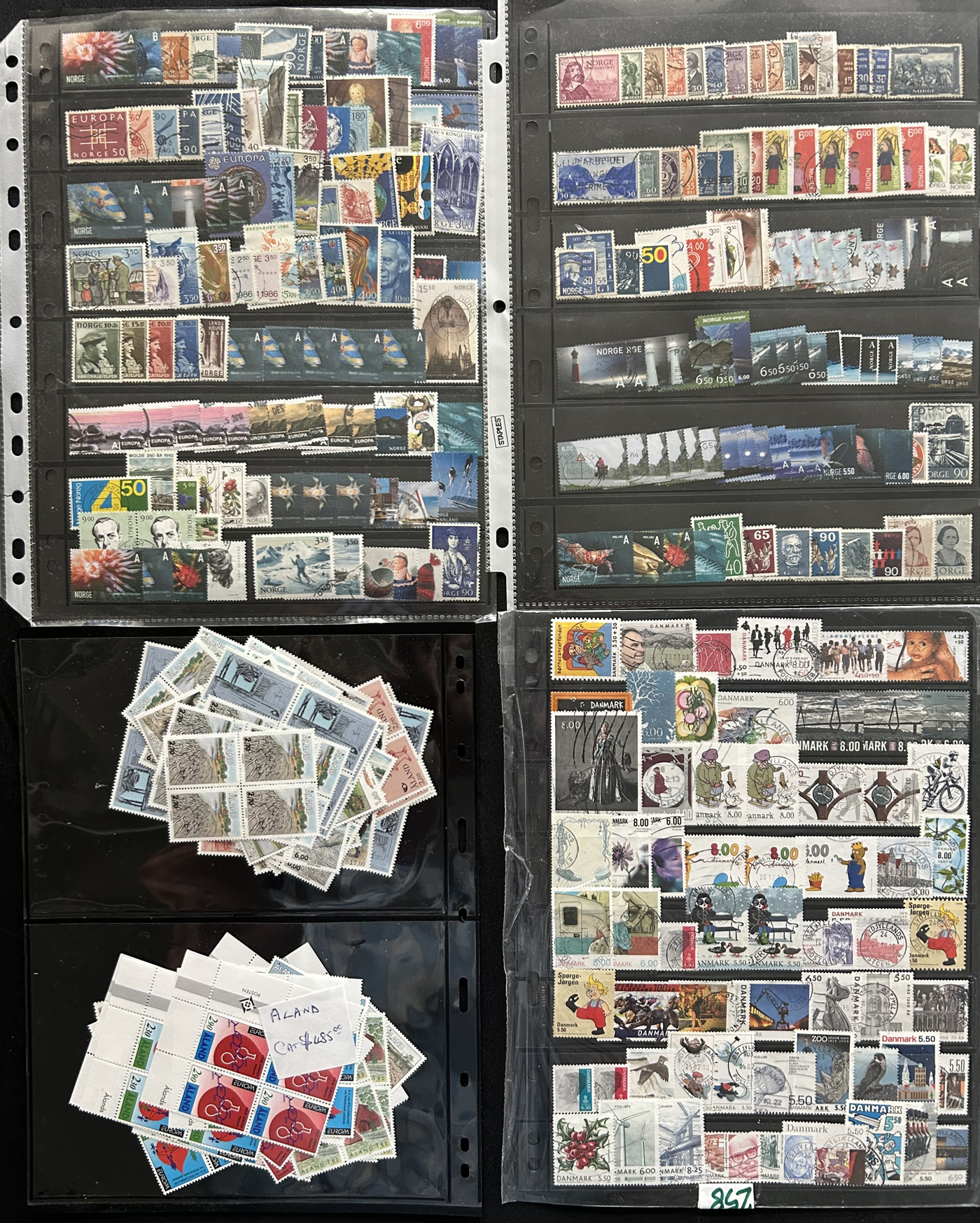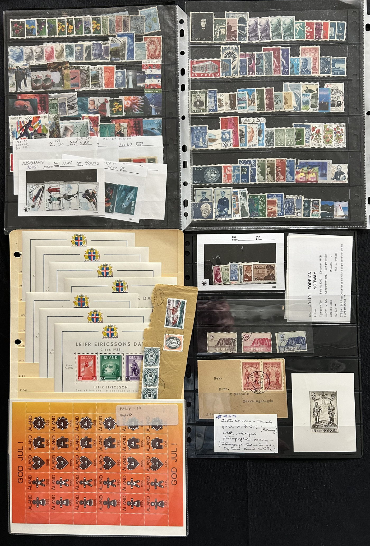 1653 O/og/nh   imageGroup of Scandinavian Country Sets and Collections, with Iceland (group of 7 Leifr Eiricsson souvenir sheets), Denmark (stock page of used 2006-13 with a 2015 c.v. of $116), Norway (photographic proof of #274, glassine with NH #279-89, used B1-B3, 4 stock pages with a nice used run, 6 page stockbook with a mint and used collection), Finland (36 stamps with sail ship cancels), Sweden (binder with 150 mint and used stamp collection, mostly comprising of mint booklets and booklet panes) and Aland (group of NH blocks from 1989-1994 with a 2013 owner's c.v. of $485). Overall fine to very fine. (Scan 1) (Scan 2) (Scan 3) (Scan 4) (Scan 5) (Scan 6) (Scan 7) (Scan 8) (Scan 9) (Scan 10) (All Scans)