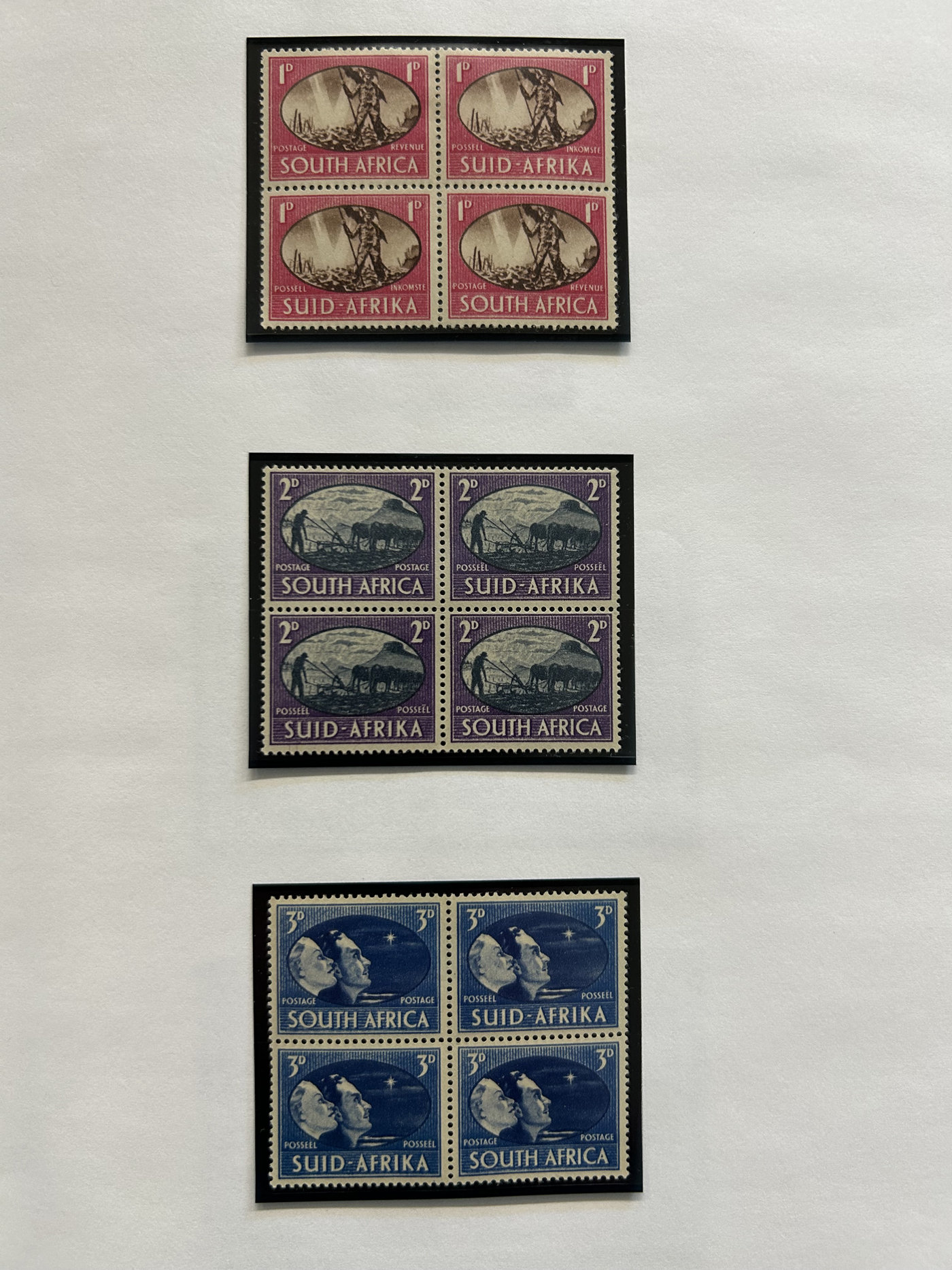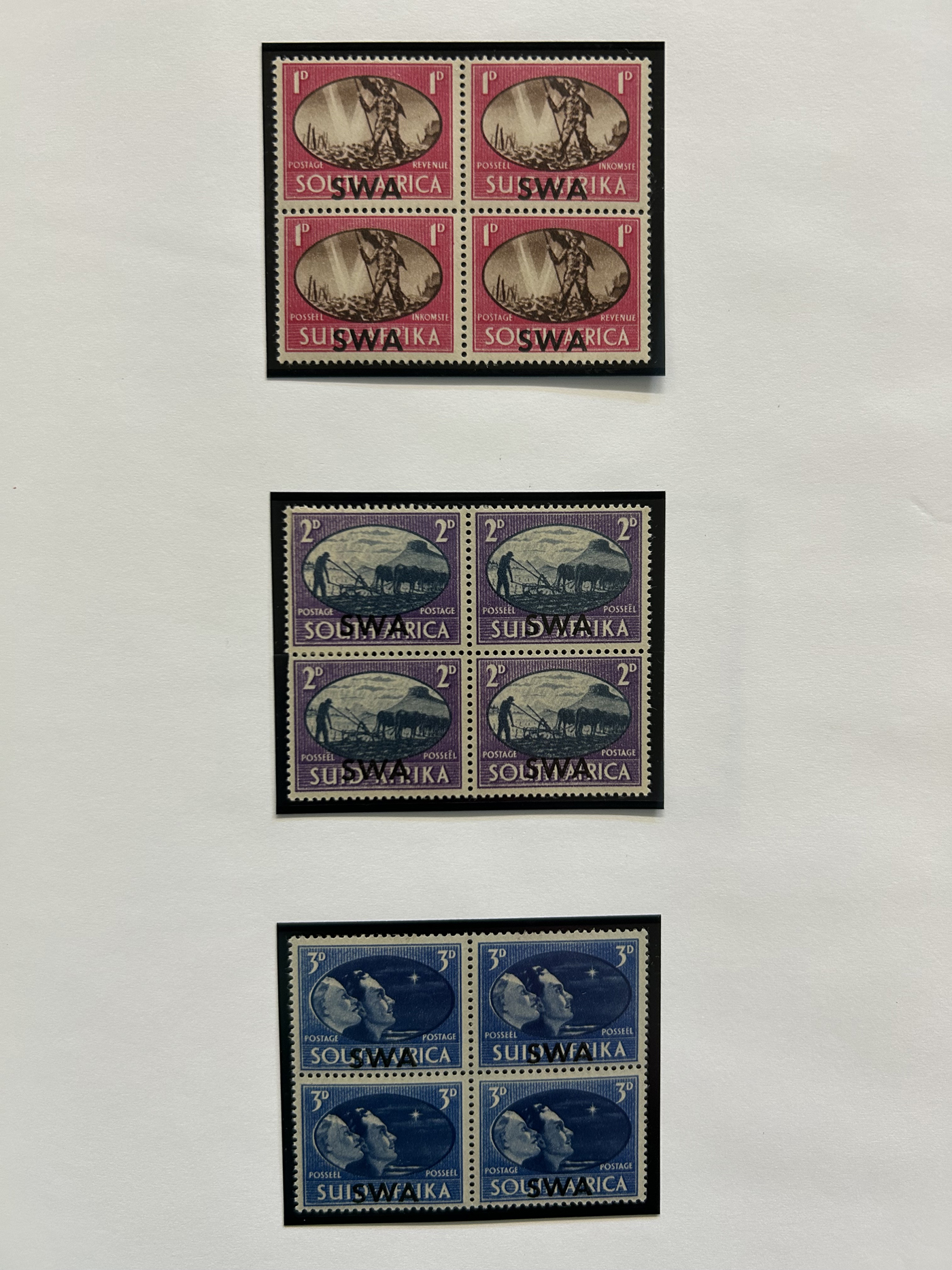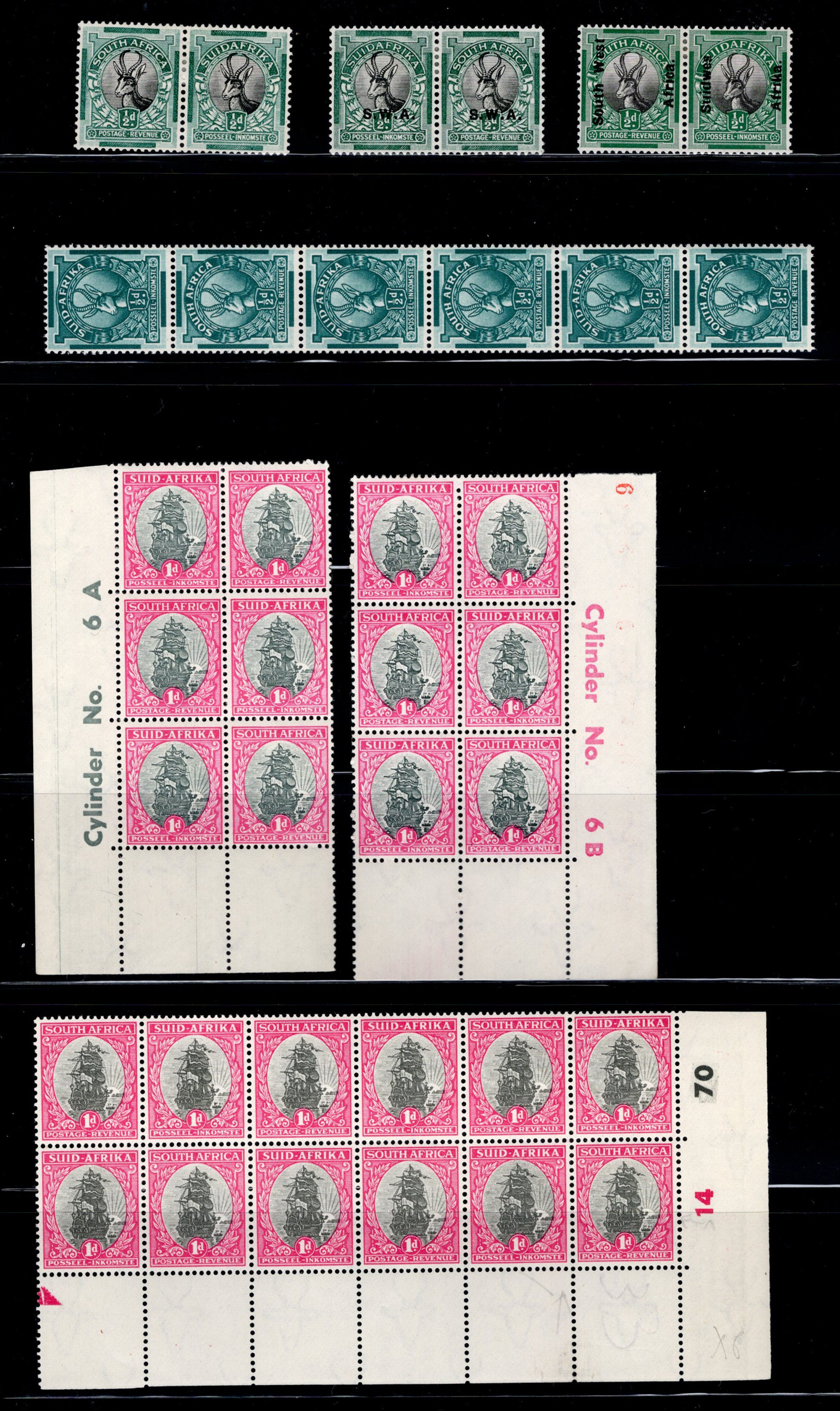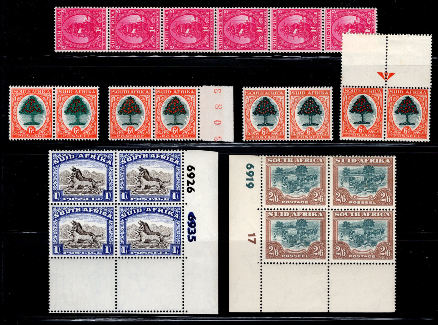 1657 og/nh   imageSmall Group of Early Mint South African Items, starting with four different mint never hinged 6d Orange Tree bilingual pairs, including shades, a pair with center arrow and one with plate inscription, followed by three different blocks of the 1d van Riebeek's Ship issue, including two plate number blocks of six (cylinder 6A and 6B, one stamp is hinged) and a plate number block of 12 (two stamps are lightly hinged). Then we have a mint coil strip of 6 each of the ½d and the 1d (Scott 98, 99, both never hinged), and a lightly hinged mint corner plate inscription block of Scott #s 62 and 63. Also includes three different mint hinged ½d Springbock pairs, one without overprint (South Africa), one overprinted S.W.A. and one overprinted South West Africa in two sideways lines. An overall fresh and fine to very fine group. (Scan 1) (Scan 2) (All Scans)
